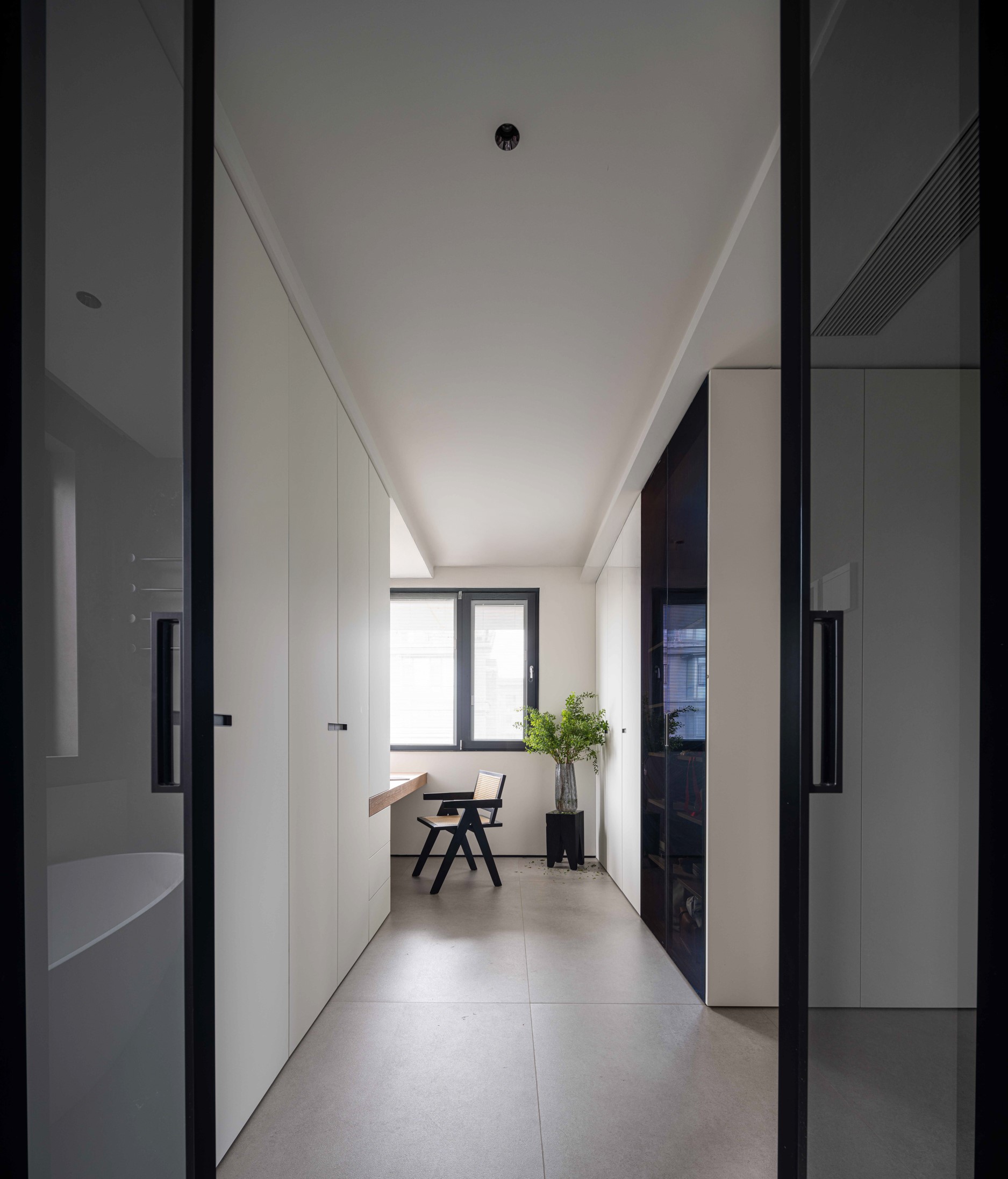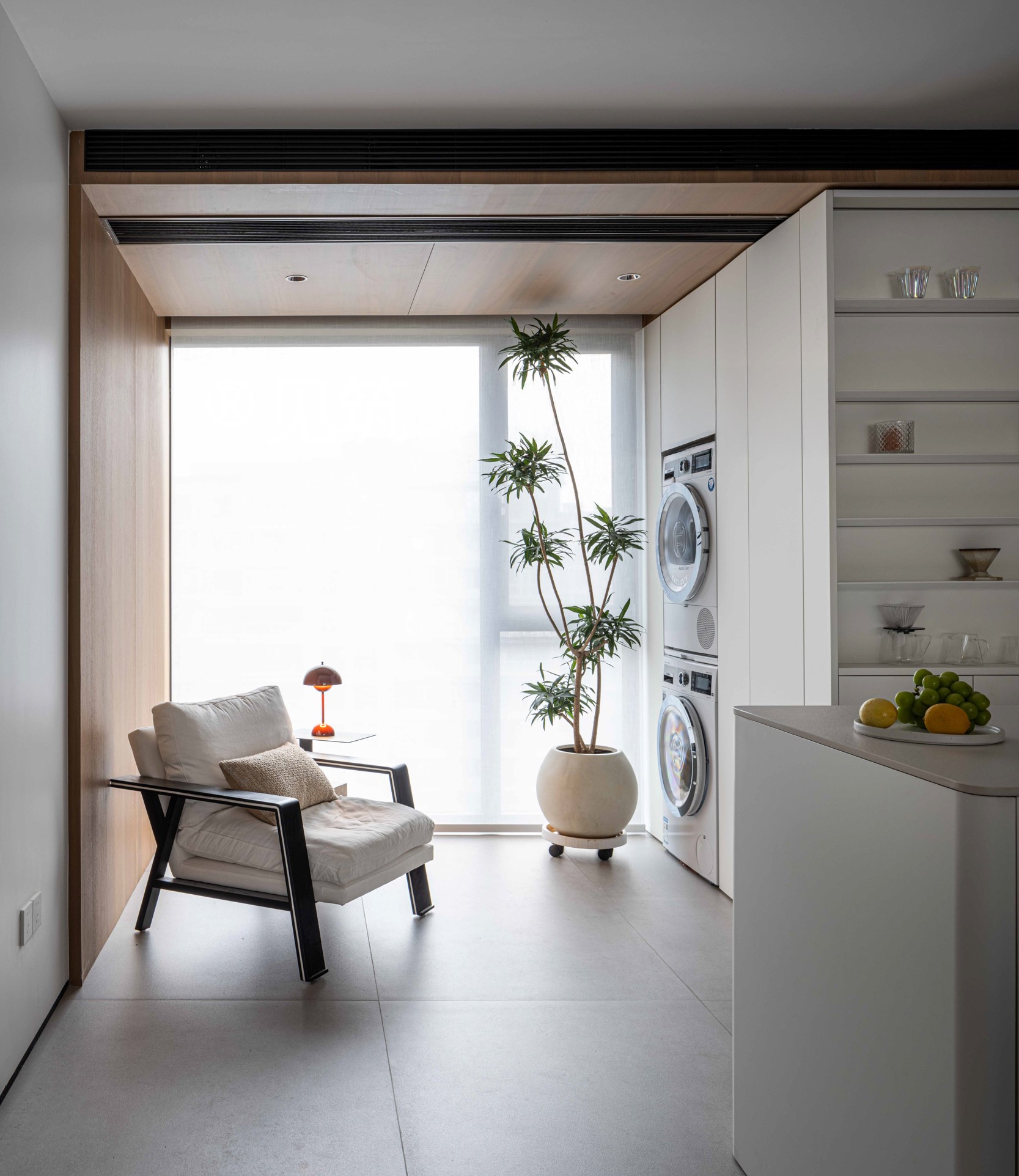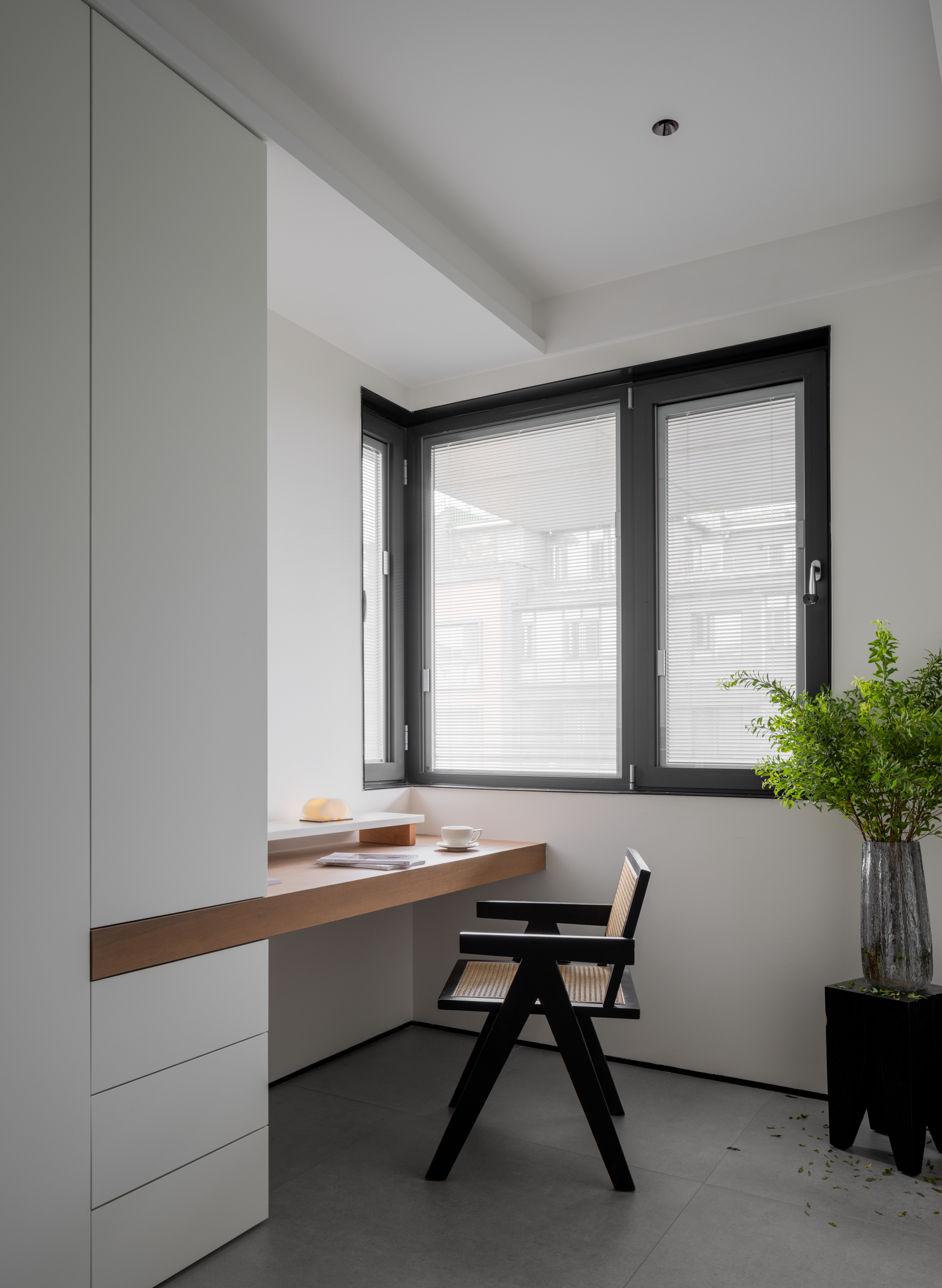 面对不可动的靠窗墙体,设计以独立的“盒体结构”另辟一方天地。它落定于视觉末端,标志着空间停顿,但又不止于此。设计师借助统一色调以一道精准的“斜向”视觉连接,完成空间的呼应和动线引导。再绕至阳台一侧,极简结构在储物与展示、封闭与开放间,建立起精妙的平衡,功能性与美学合二为一。