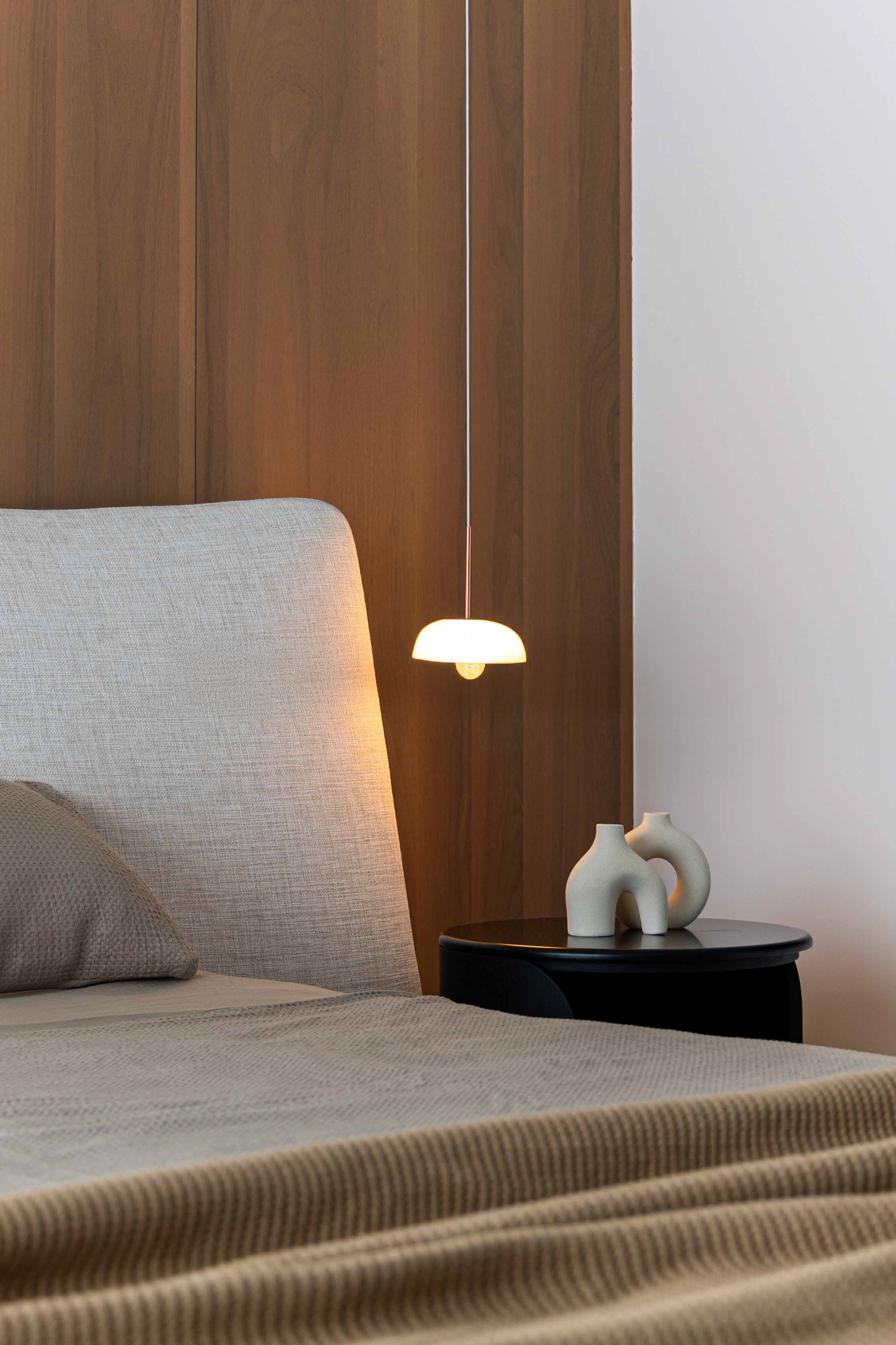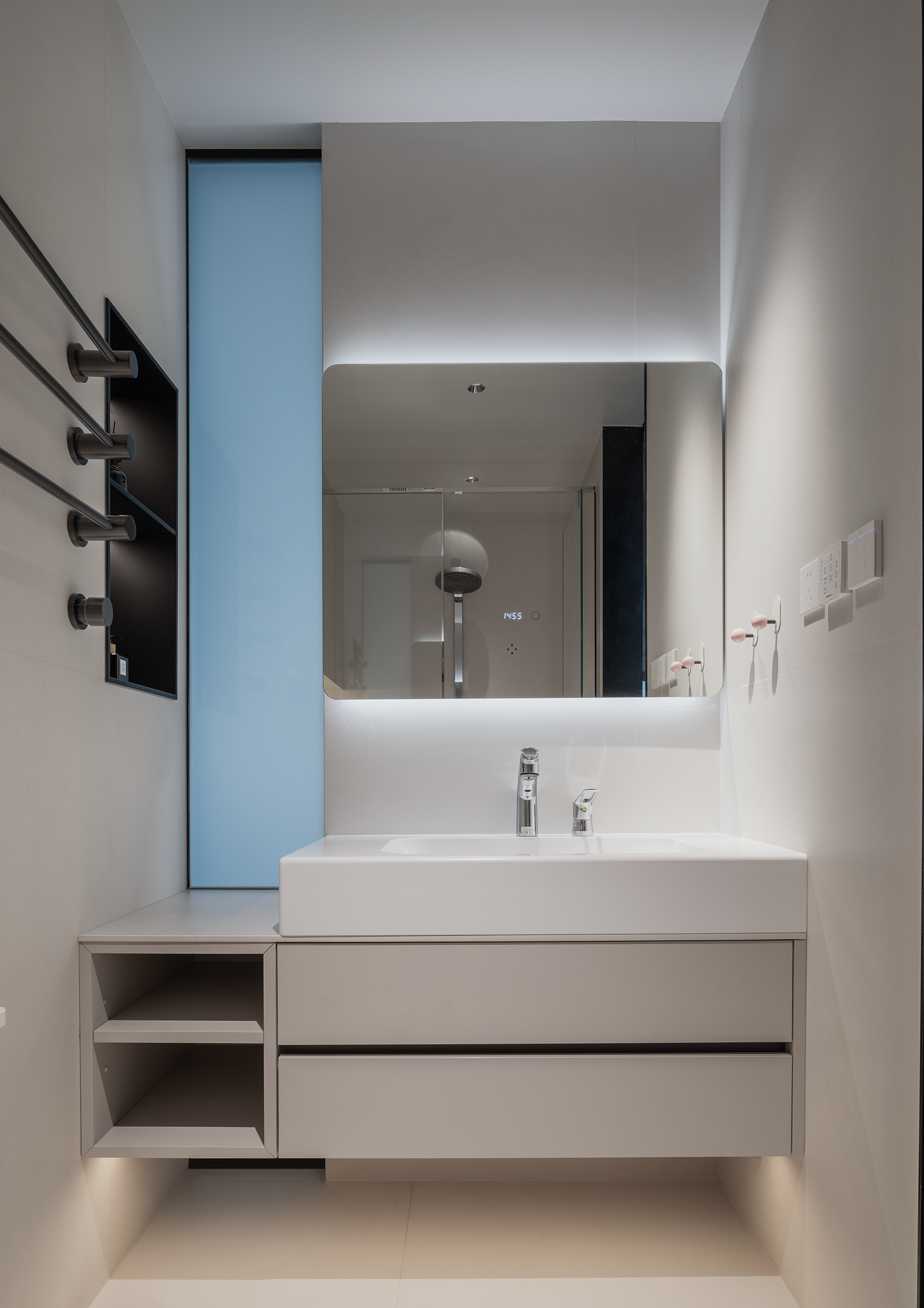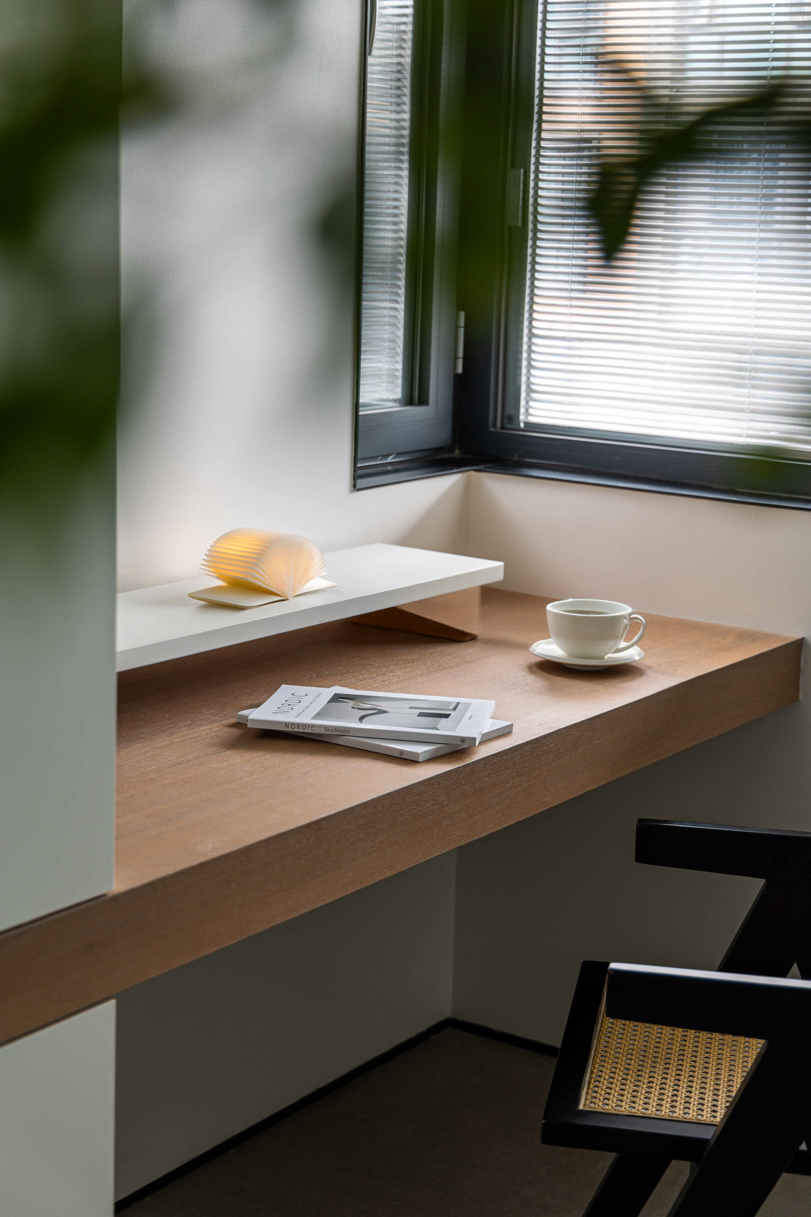 面对不可动的靠窗墙体,设计以独立的“盒体结构”另辟一方天地。它落定于视觉末端,标志着空间停顿,但又不止于此。设计师借助统一色调以一道精准的“斜向”视觉连接,完成空间的呼应和动线引导。再绕至阳台一侧,极简结构在储物与展示、封闭与开放间,建立起精妙的平衡,功能性与美学合二为一。