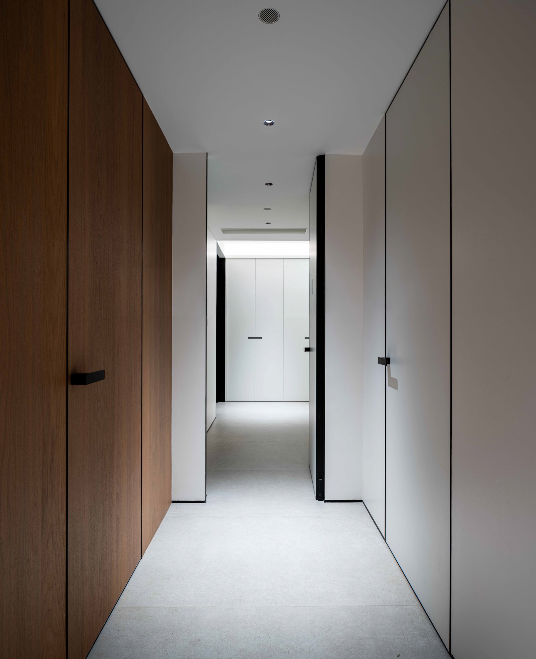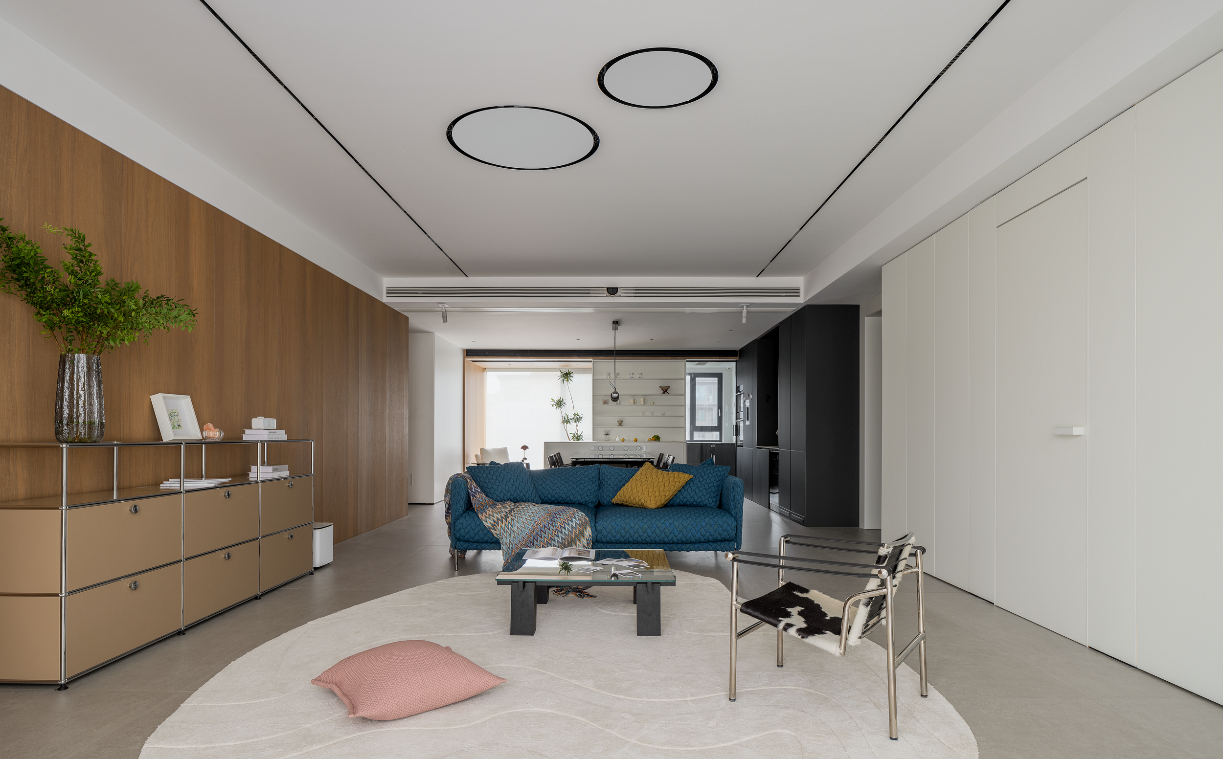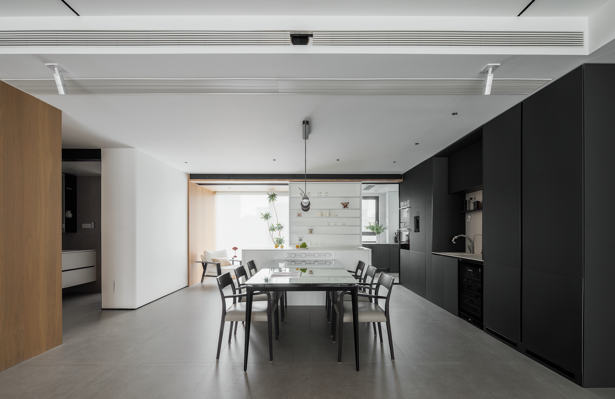 因此,设计师首要考量的是:将孩童成长与家庭互动预设空间内部,呈现一处亲子共度的生活场域。去除隔阂、将玄关、过道、客厅、餐厨串联;消弥边界,让场景与场景之间相互渗透。以家庭行为为脉络,带来一处承载一家四口日常的理想之居。