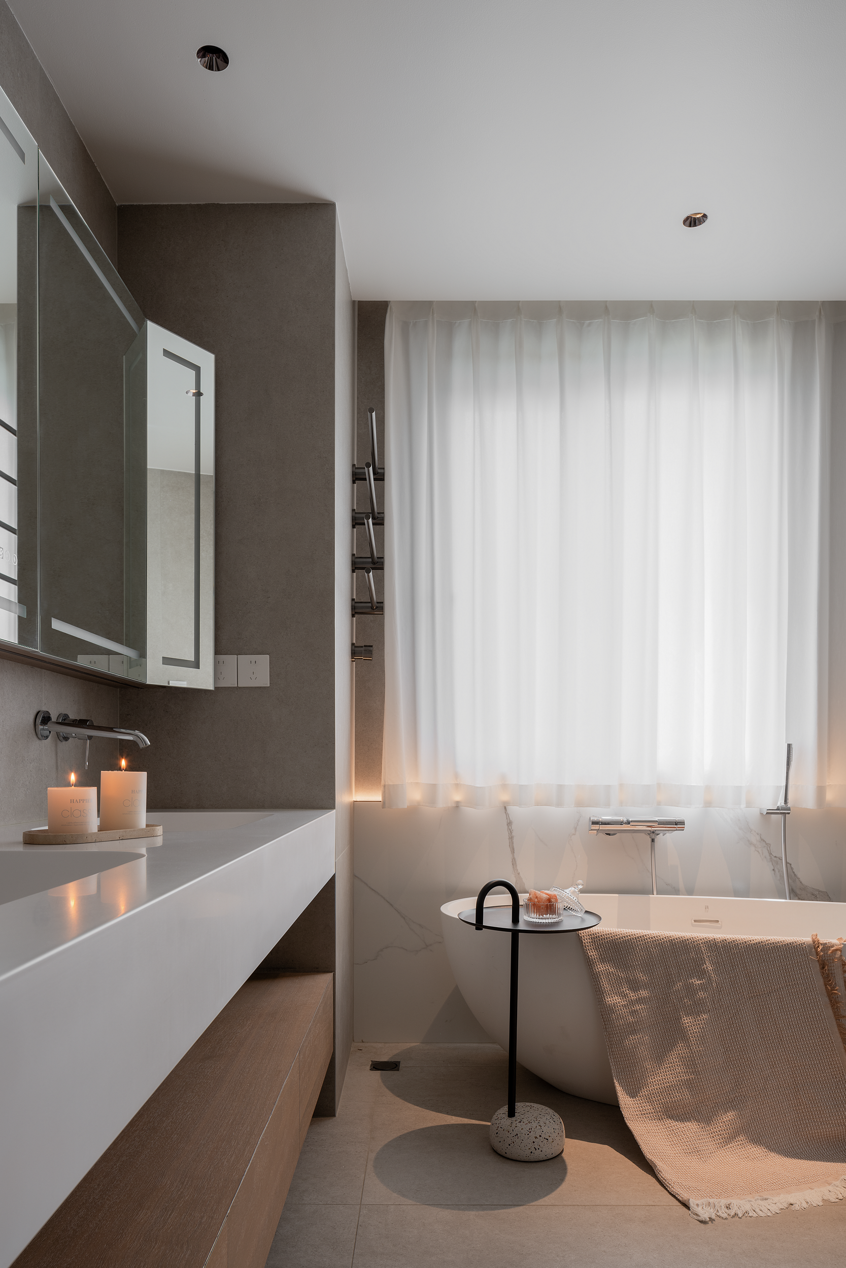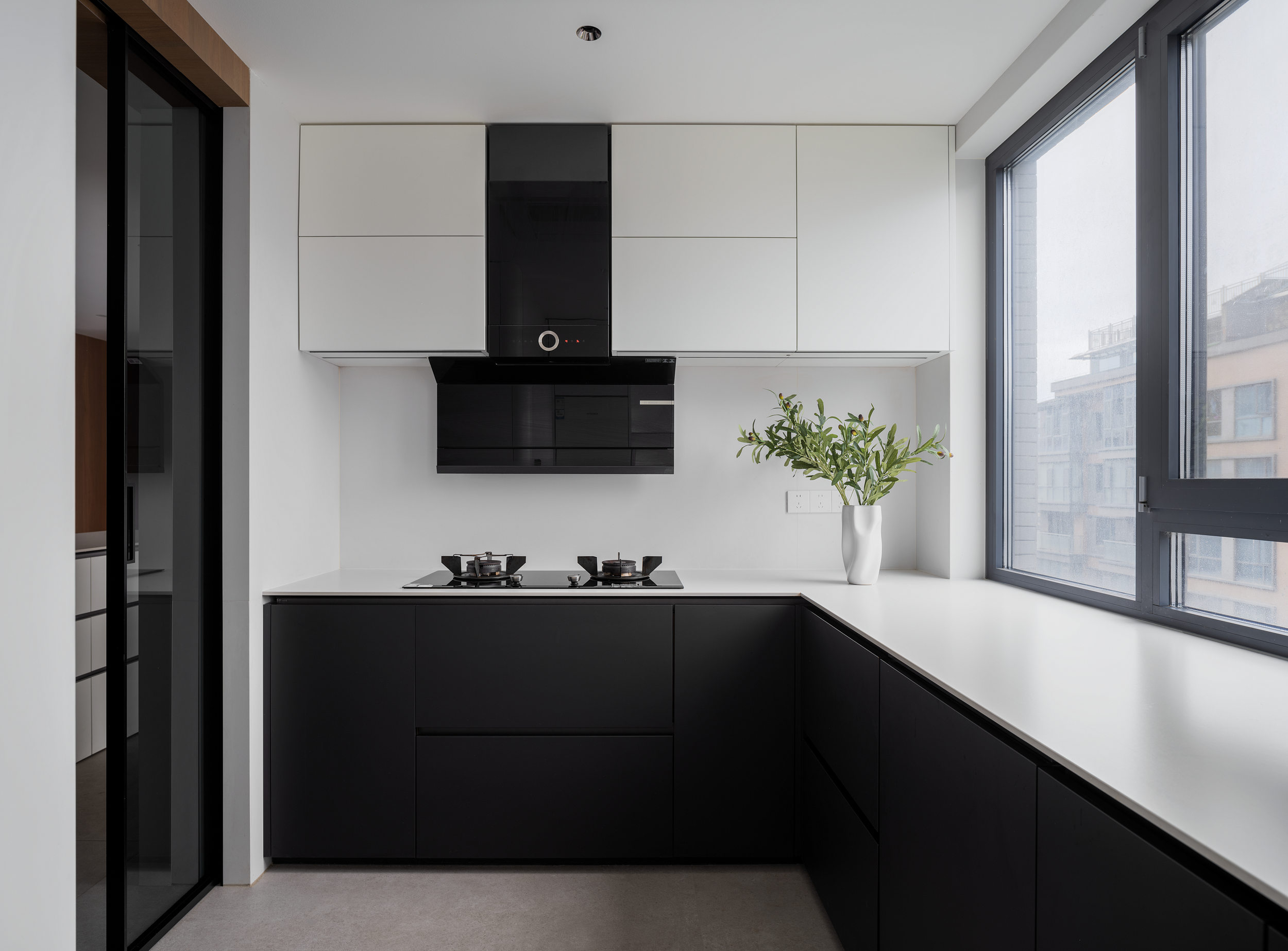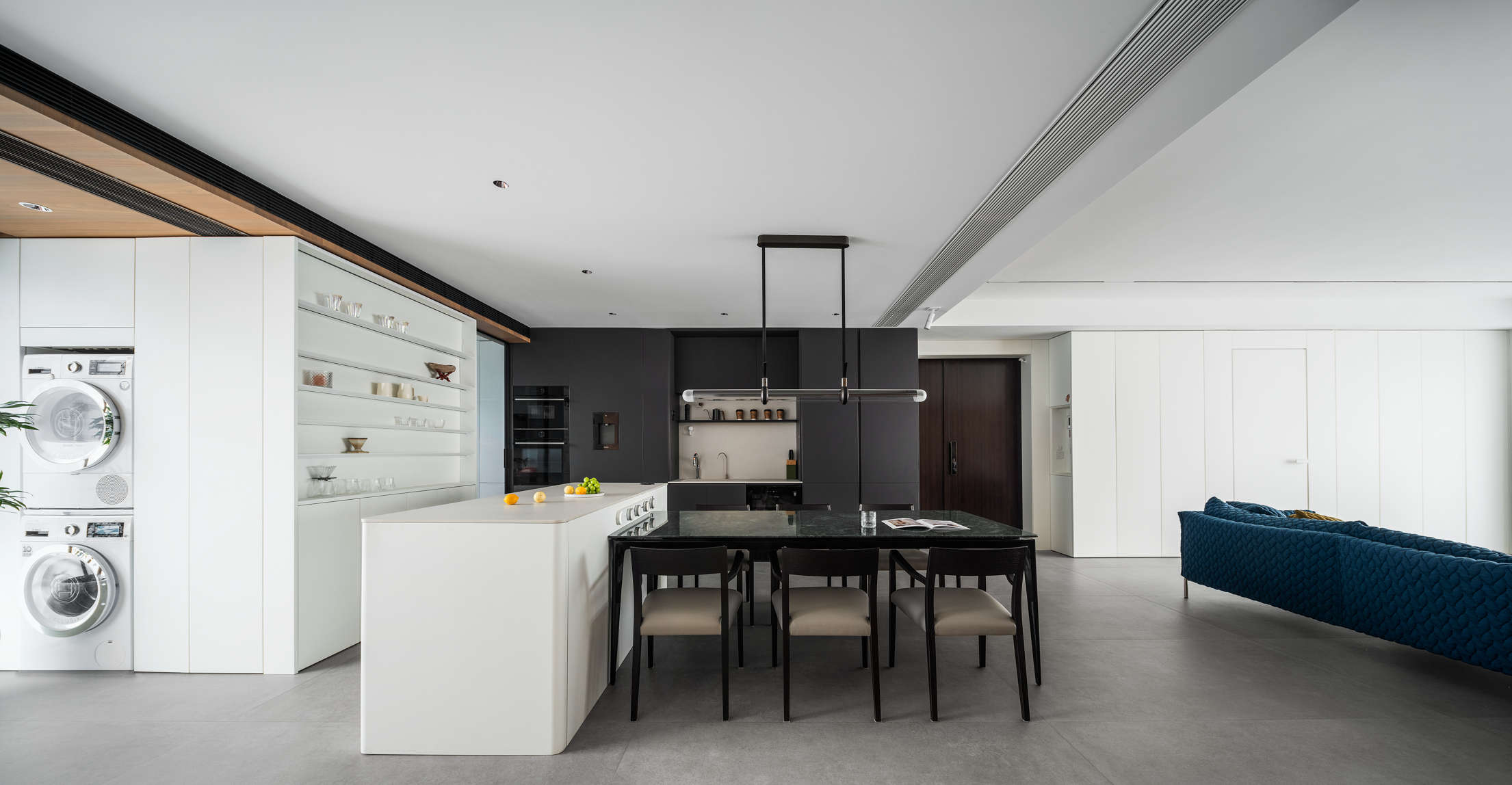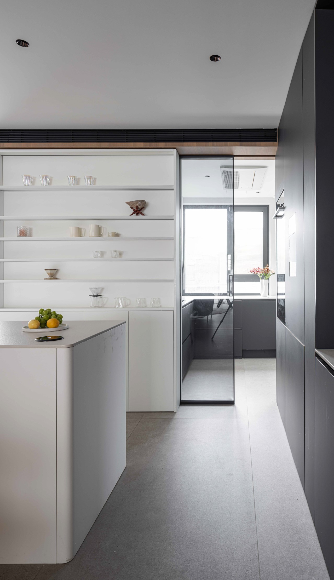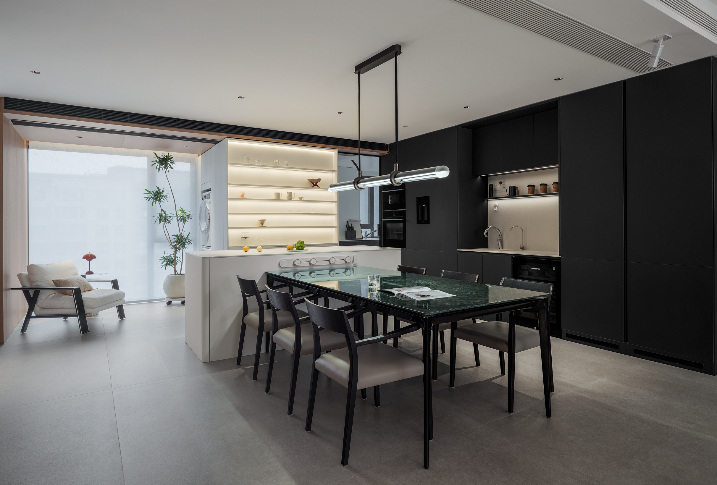 烹饪、用餐、品茶、喝咖啡…追随居者过往生活痕迹,餐厨区域以行为来引导设计。将原本封闭墙体拆除,打开空间的桎梏,餐岛一体化设计模糊固有边界与功能分区,开阔之余自带呼吸感。黑与白在此处静静对峙,无声处沉淀空间的底色,高级且克制。