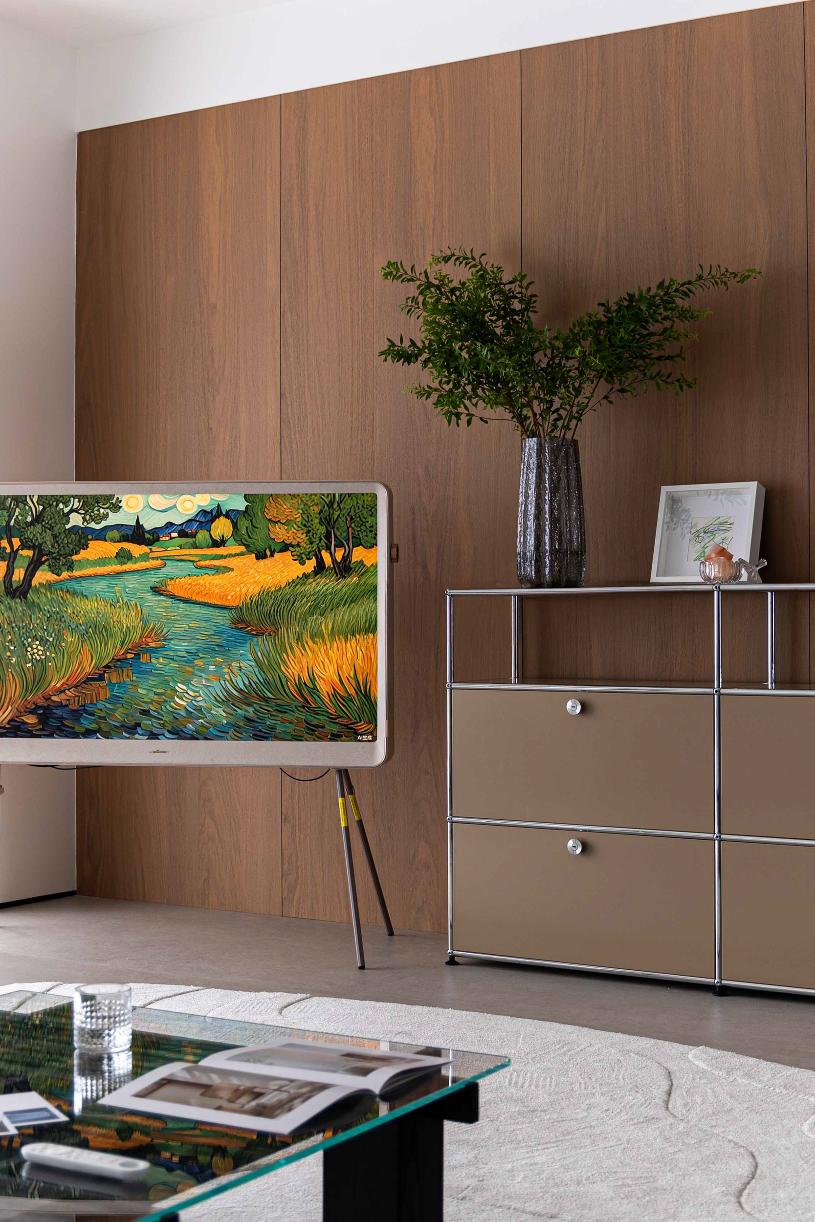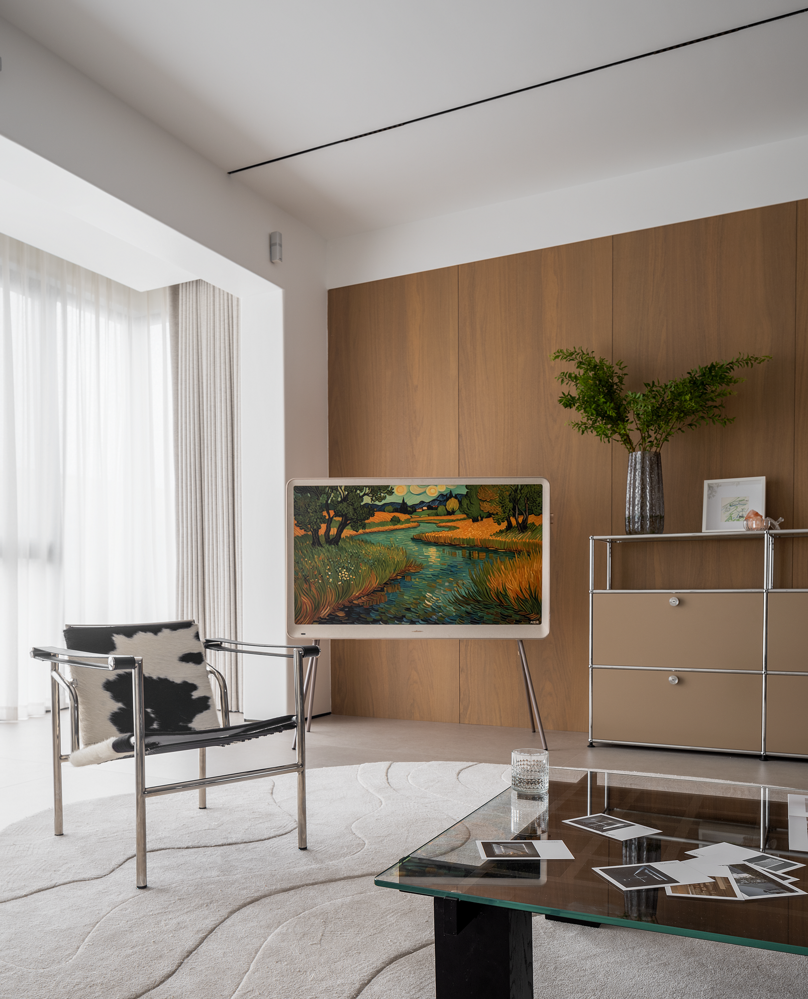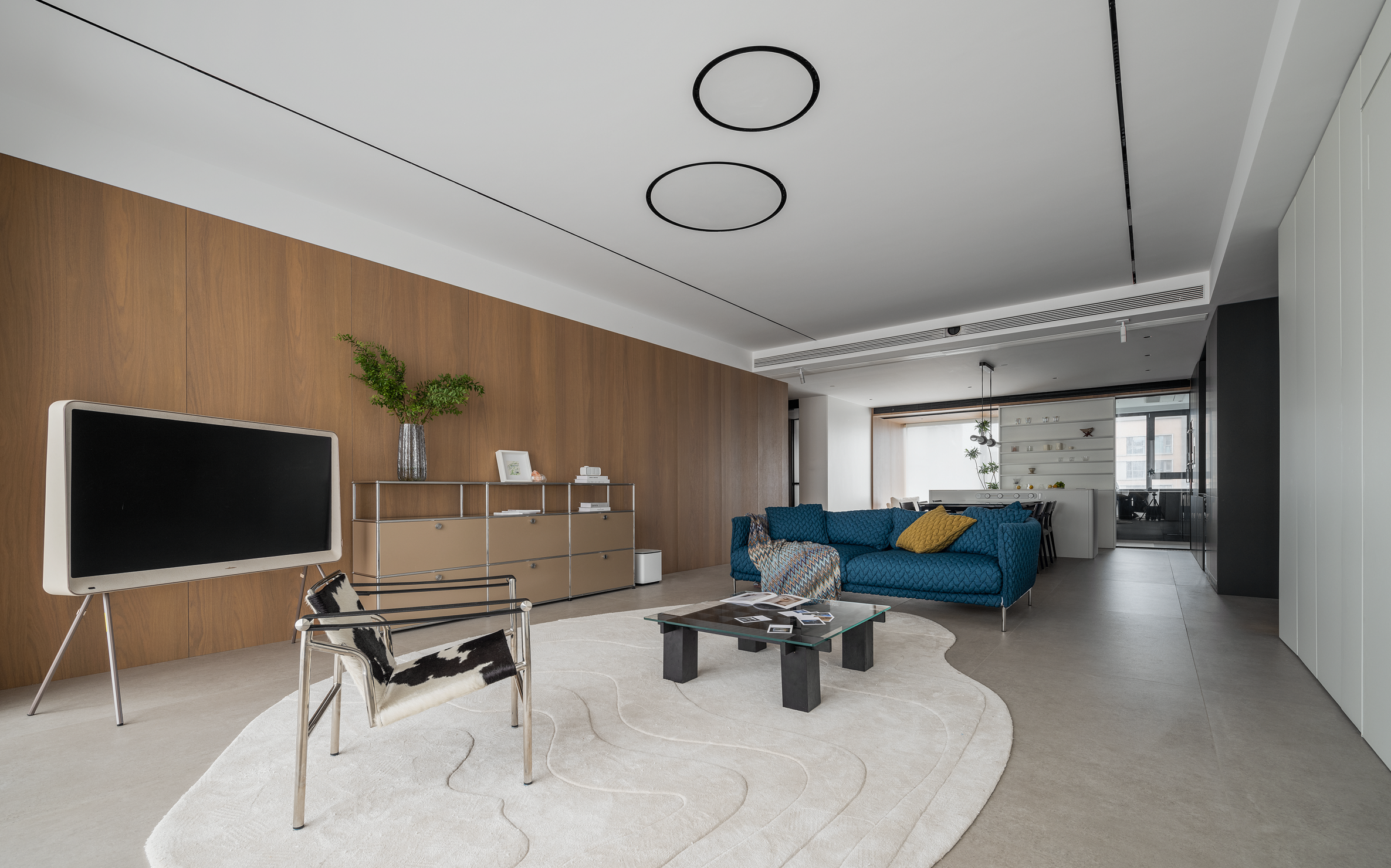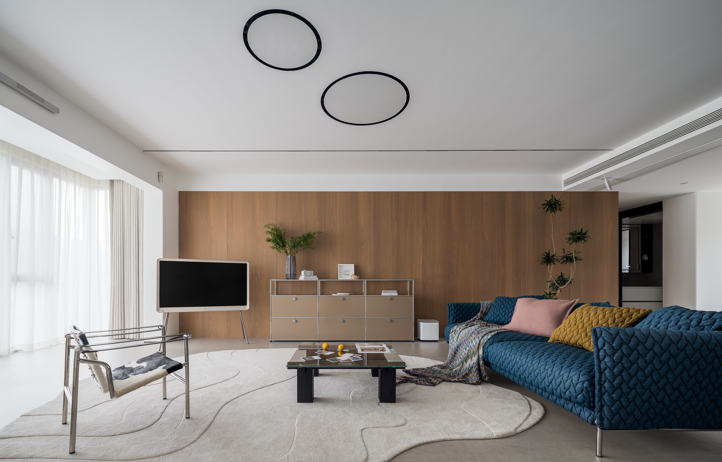 墙面白色漆面和木色饰面对碰,强烈的视觉效果巧妙破除空间方正呆板的氛围。考虑到横厅本身具备的开阔优势,将蓝色皮质沙发置于客厅中央,借助单椅、电视、收纳柜等体块自由重组,以独立又围合的布局形式,在现有格局内重塑秩序。或交谈、或游戏,专属区域内的交互无限延展。