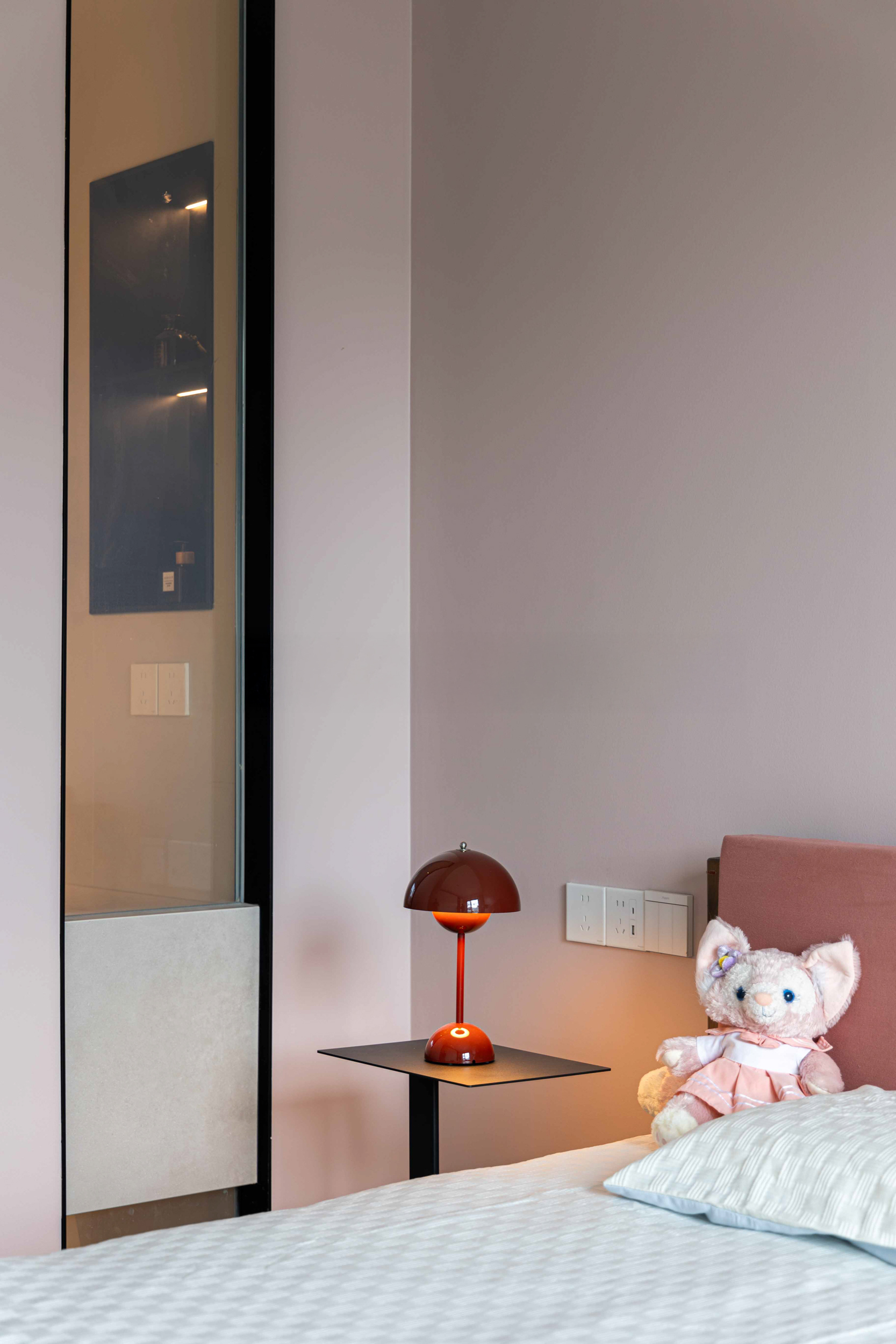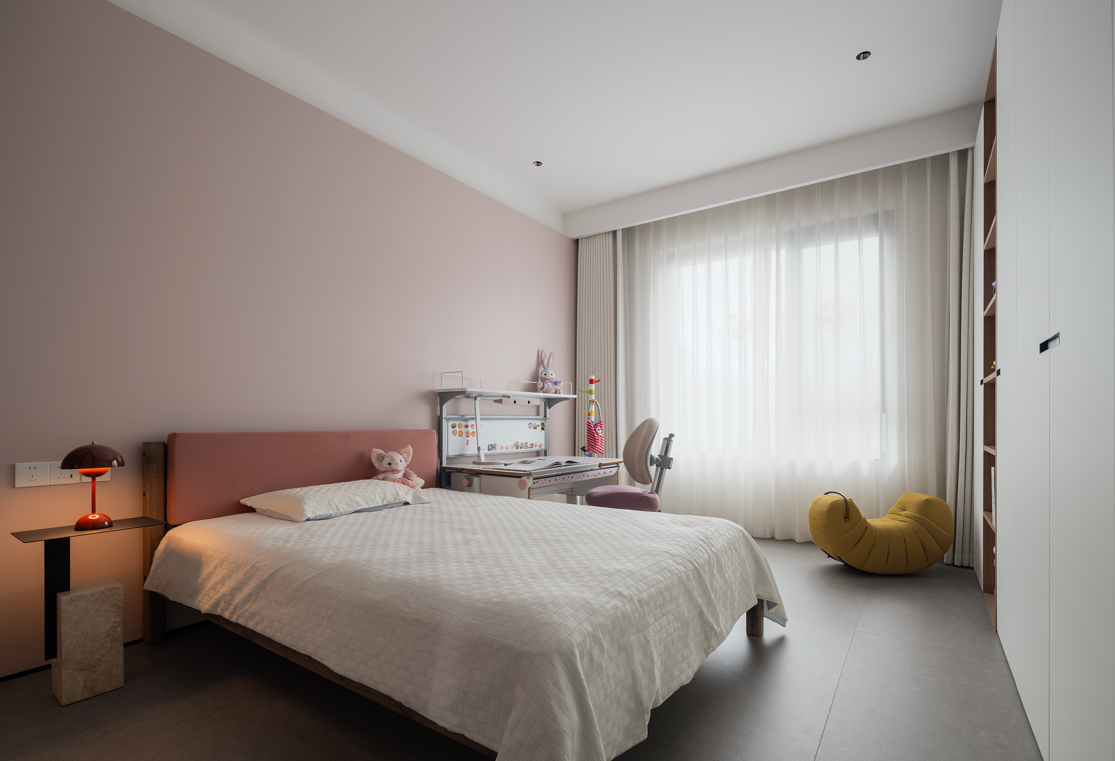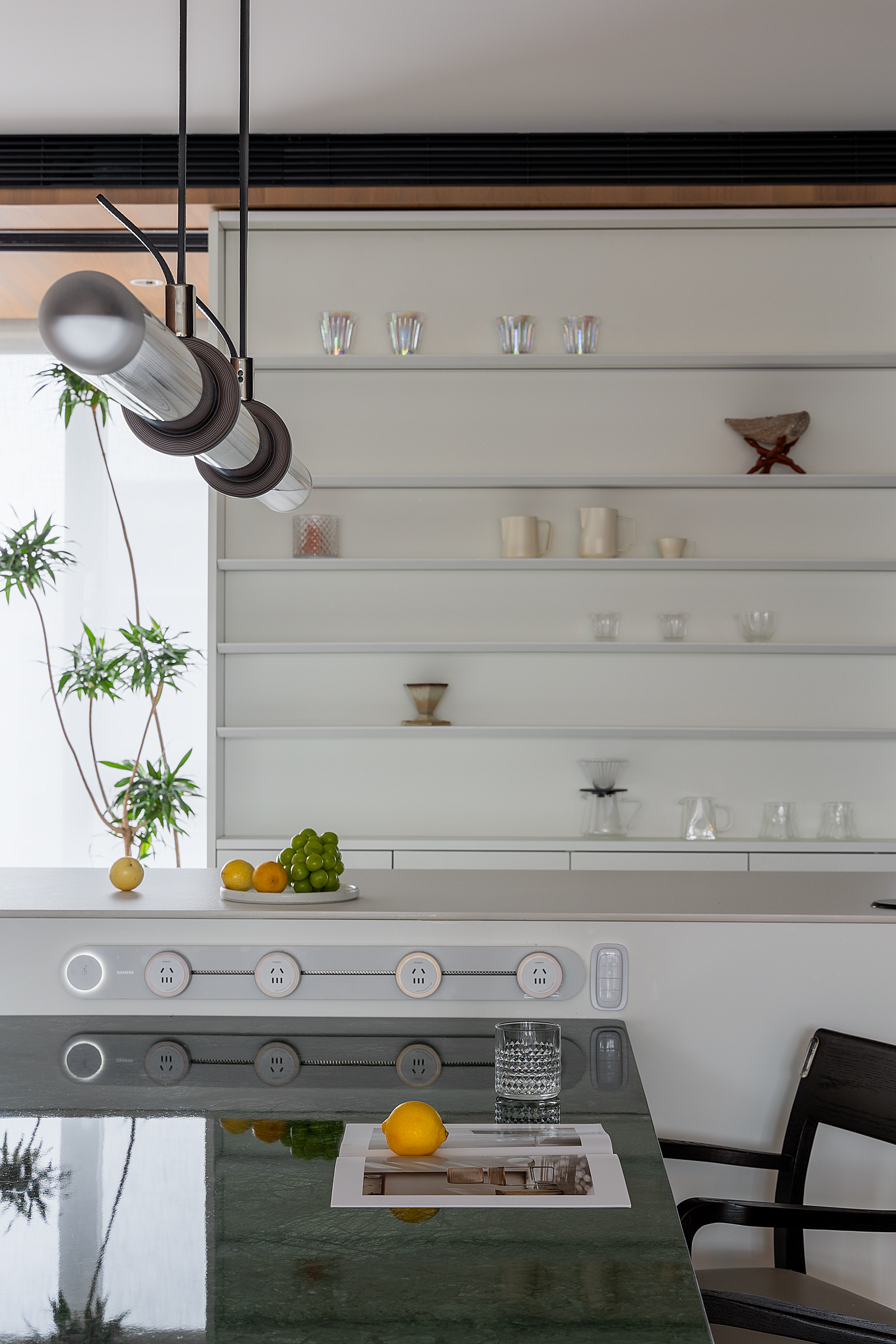 空间回归到生活应有的节奏,设计师还埋下无数温柔的伏笔:落座餐厅的父母,抬眼间便可照看客厅玩耍的孩子;高低错落的餐岛,无声承载一家四口的晨昏絮语;拐角处的独立角落,变身可随时认领的精神自留地。秩序分明、从容松弛。
