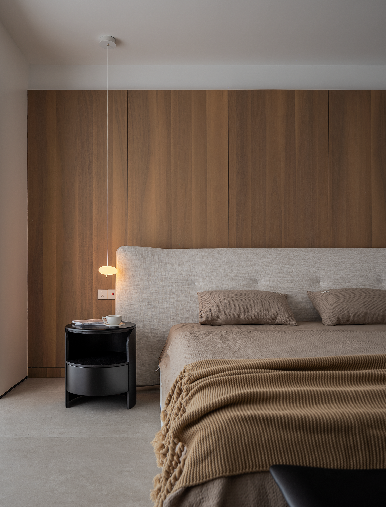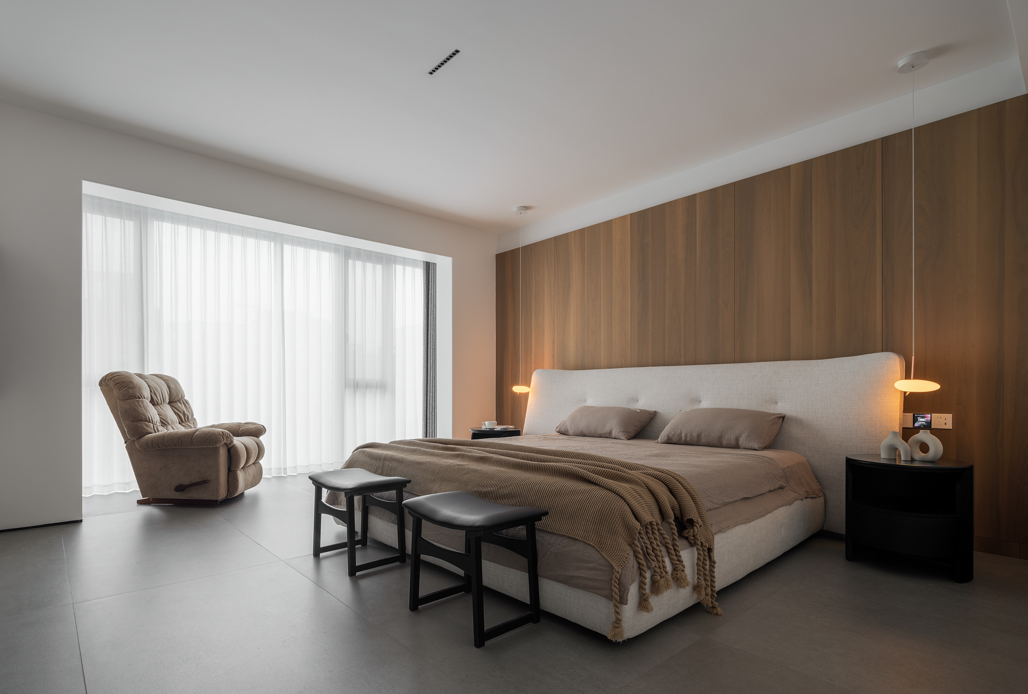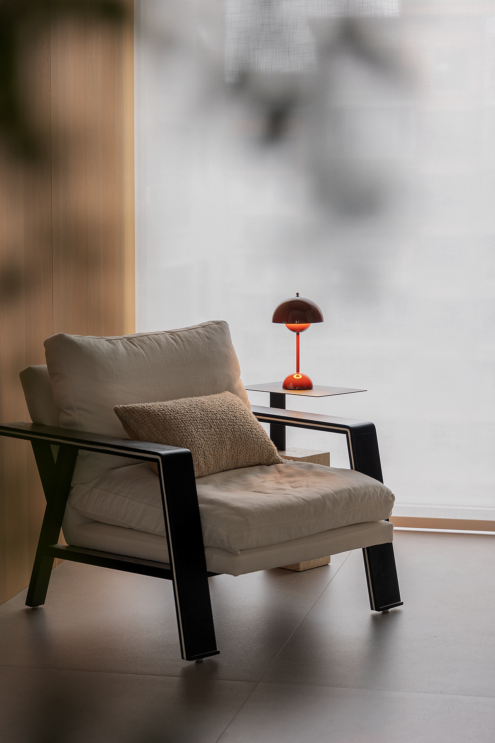 空间回归到生活应有的节奏,设计师还埋下无数温柔的伏笔:落座餐厅的父母,抬眼间便可照看客厅玩耍的孩子;高低错落的餐岛,无声承载一家四口的晨昏絮语;拐角处的独立角落,变身可随时认领的精神自留地。秩序分明、从容松弛。