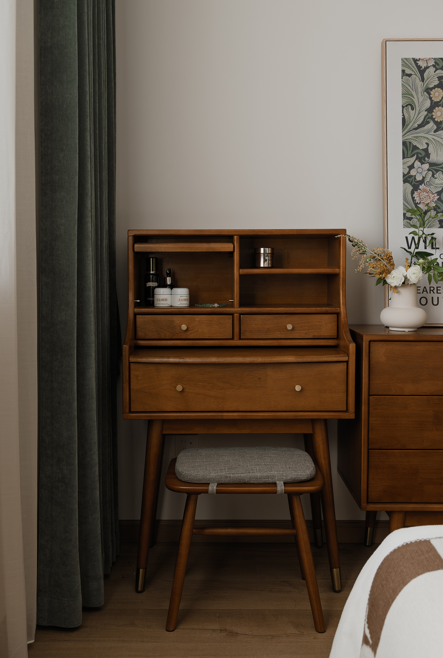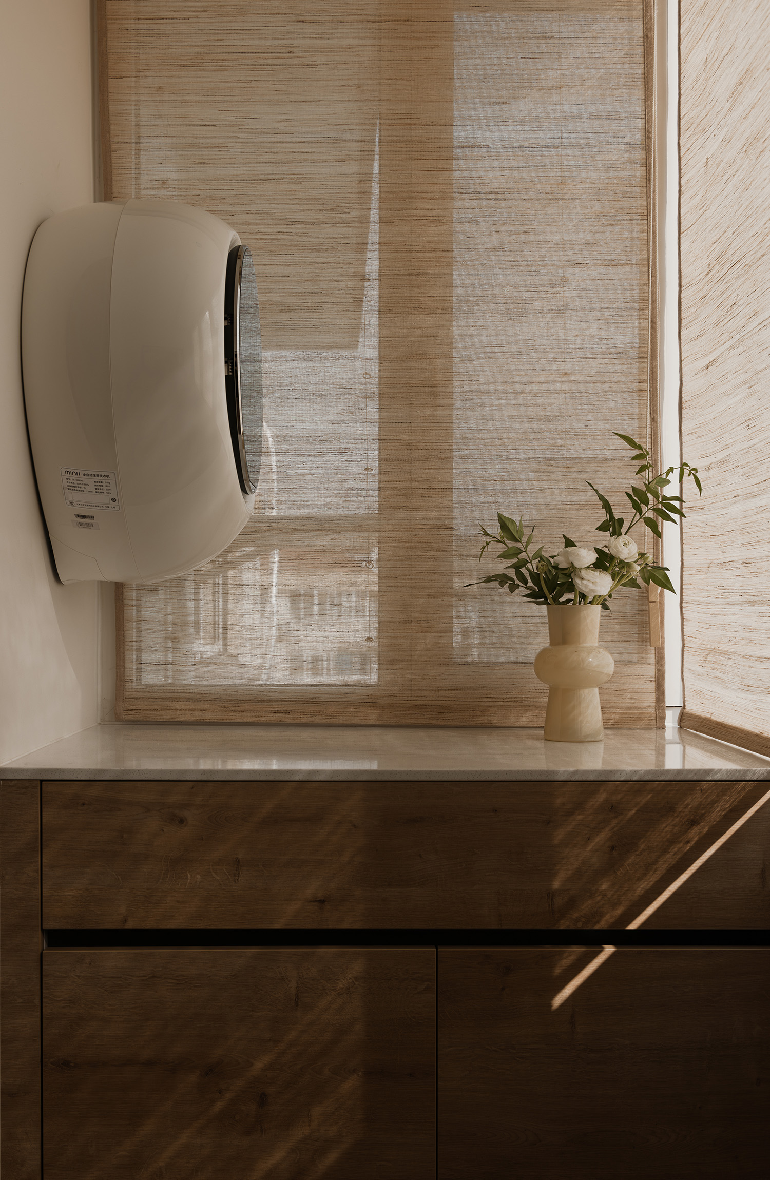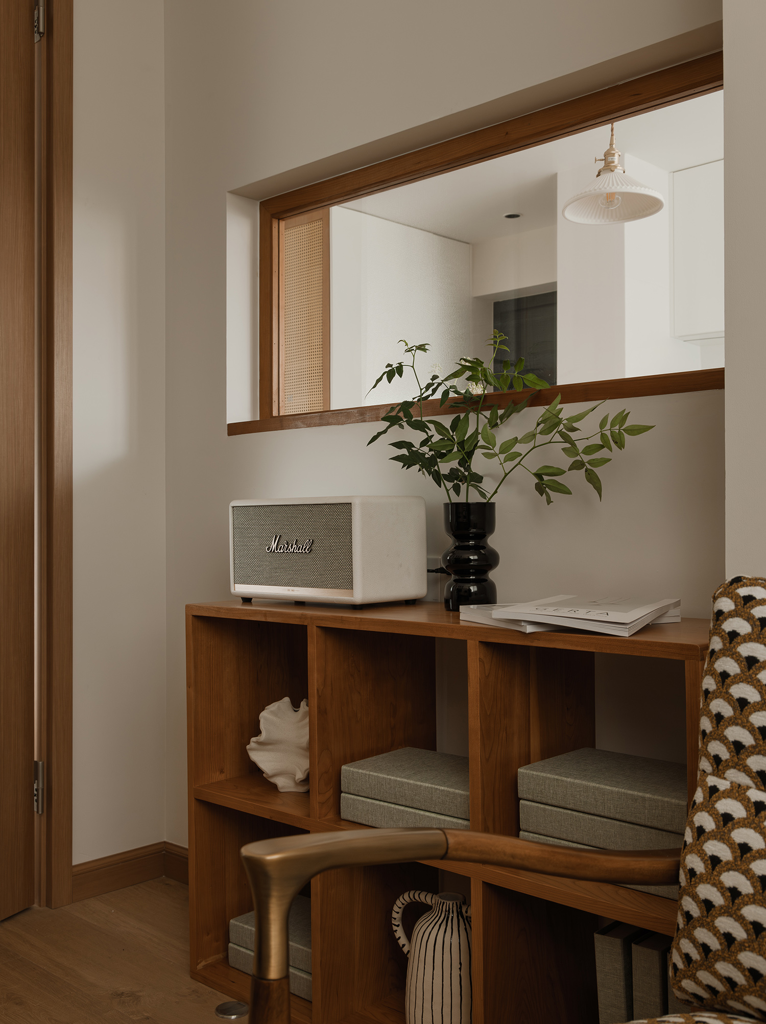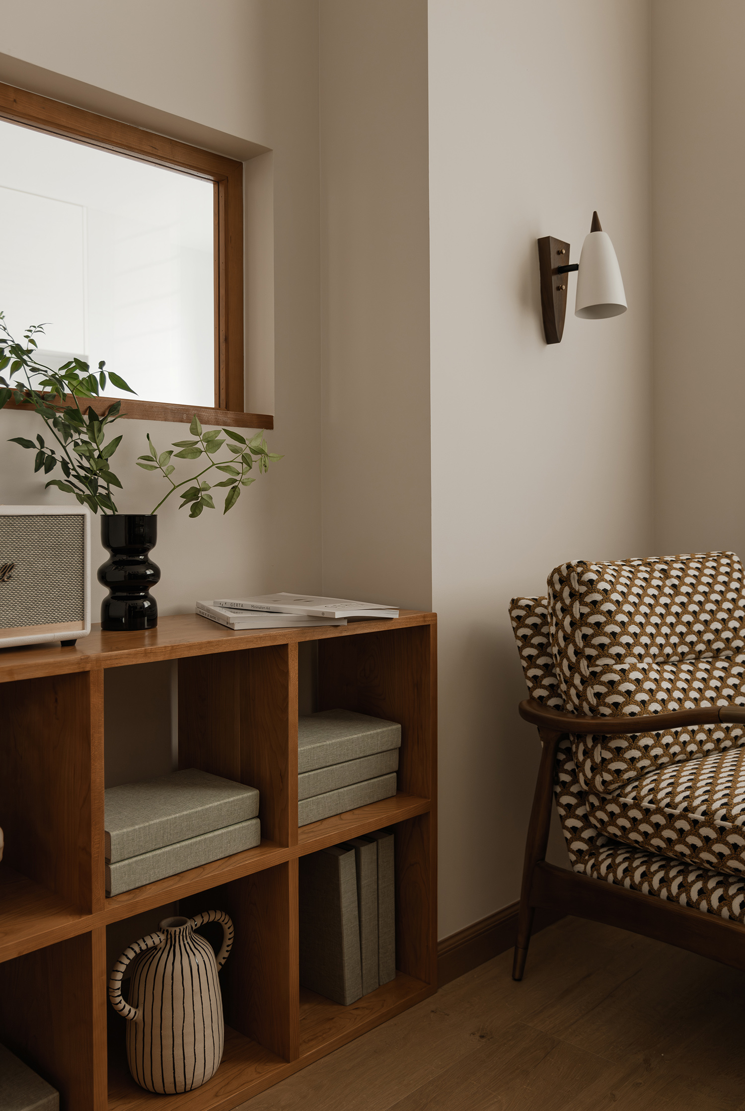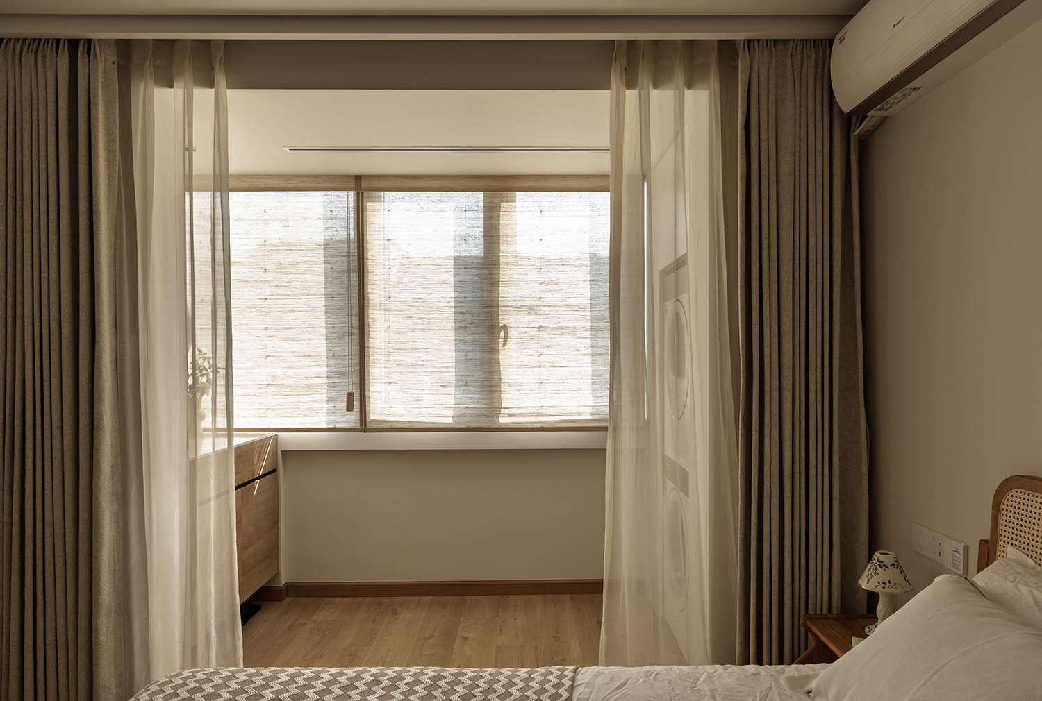 空间意境:将女主人喜爱的日式风与中古风巧妙融合,在卧室、卫生间等空间营造出独特的绿色中古韵味。大量运用自然材质,如客厅储物柜采用樱桃木和藤编材质,增添复古与自然韵味;次卧木质床头柜的藤编纹理带来质朴自然美感;阳台使用亚麻色日夜风情帘,引入柔和自然光,营造自然舒适氛围。