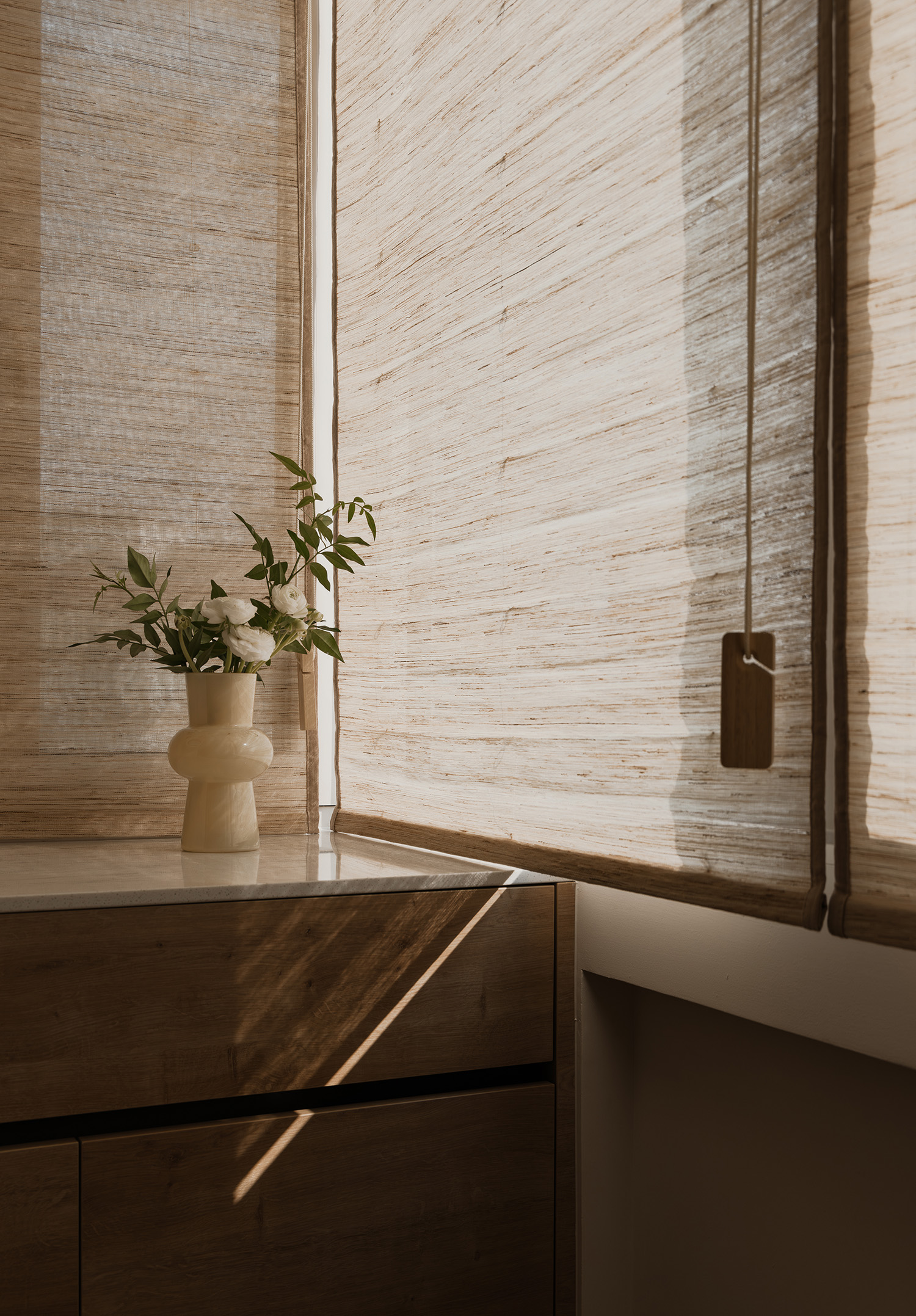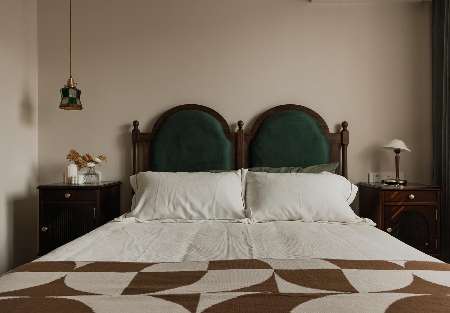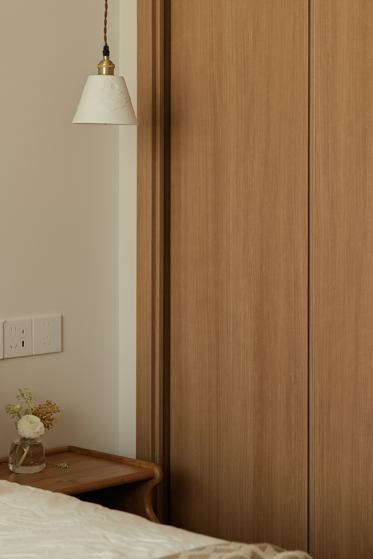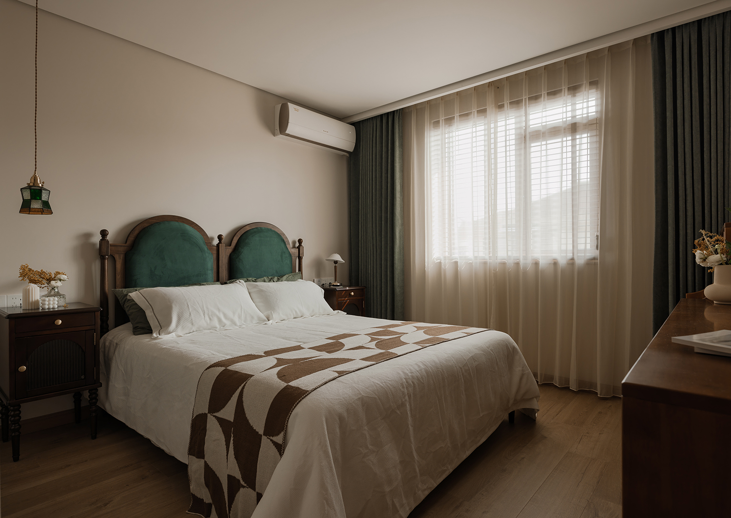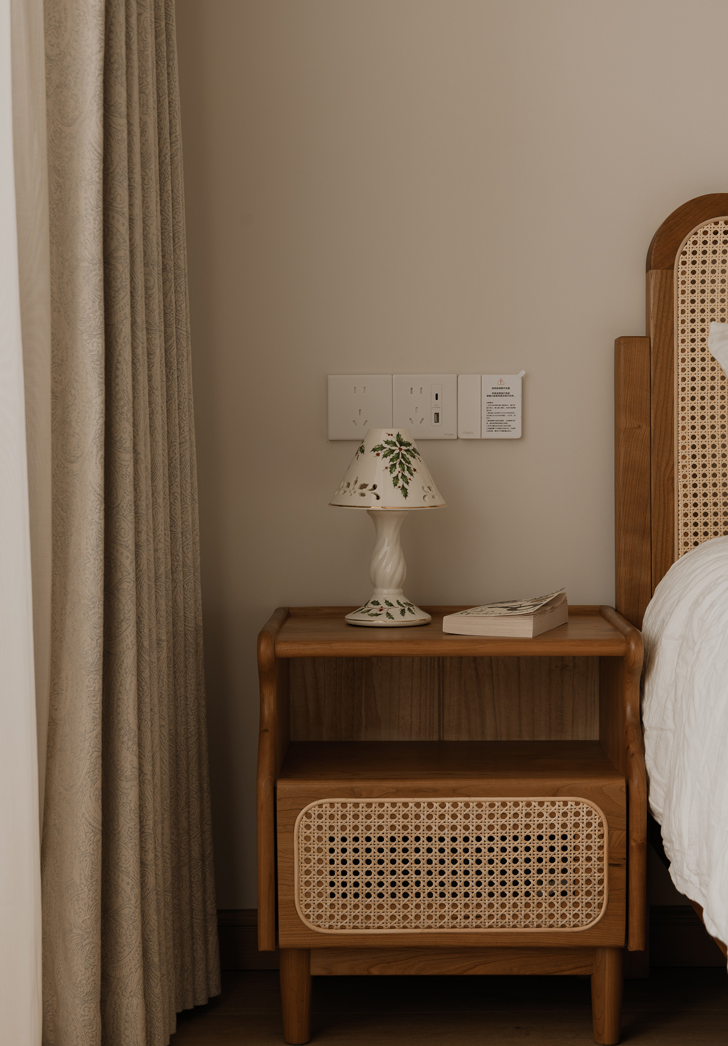 空间意境:将女主人喜爱的日式风与中古风巧妙融合,在卧室、卫生间等空间营造出独特的绿色中古韵味。大量运用自然材质,如客厅储物柜采用樱桃木和藤编材质,增添复古与自然韵味;次卧木质床头柜的藤编纹理带来质朴自然美感;阳台使用亚麻色日夜风情帘,引入柔和自然光,营造自然舒适氛围。