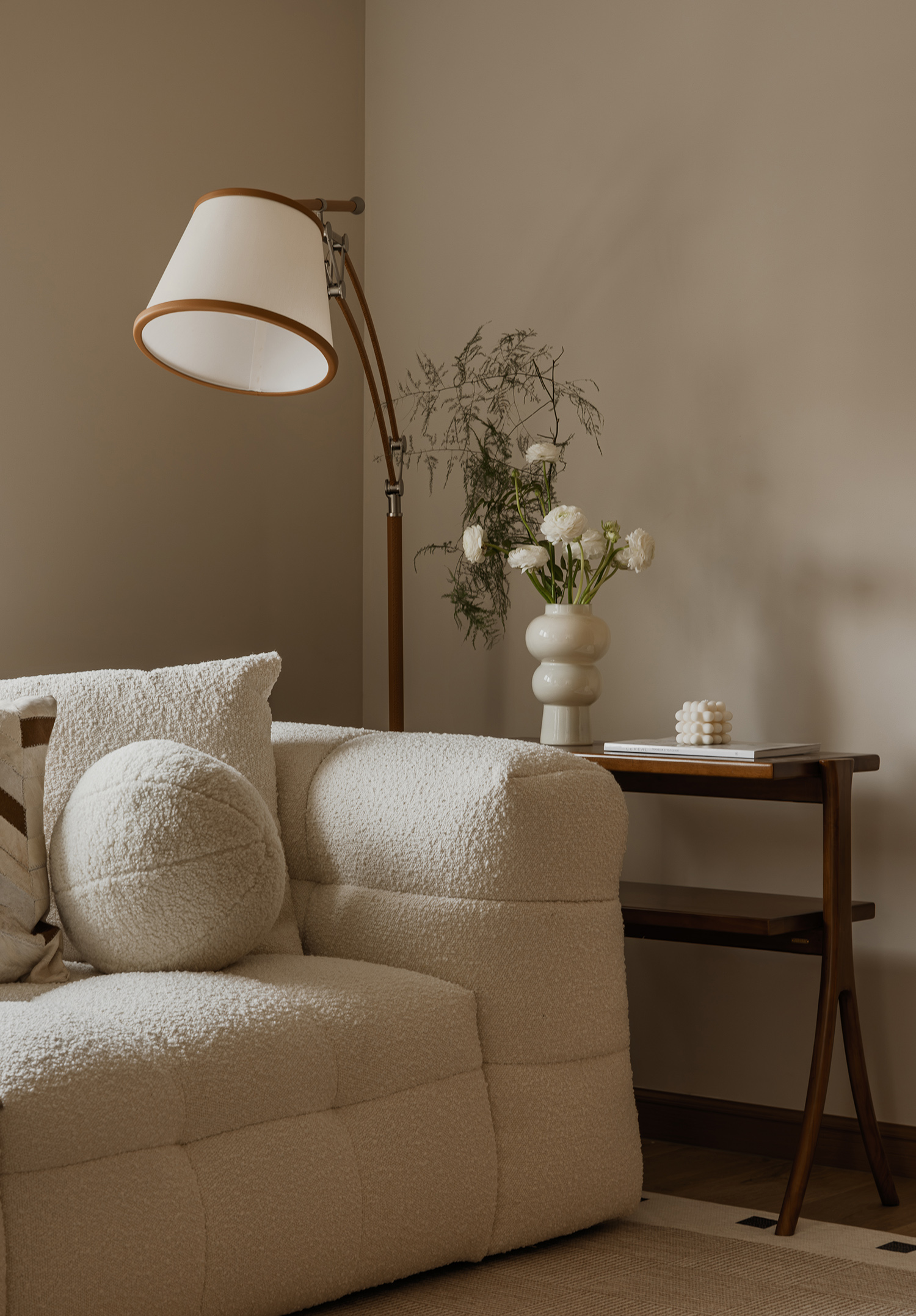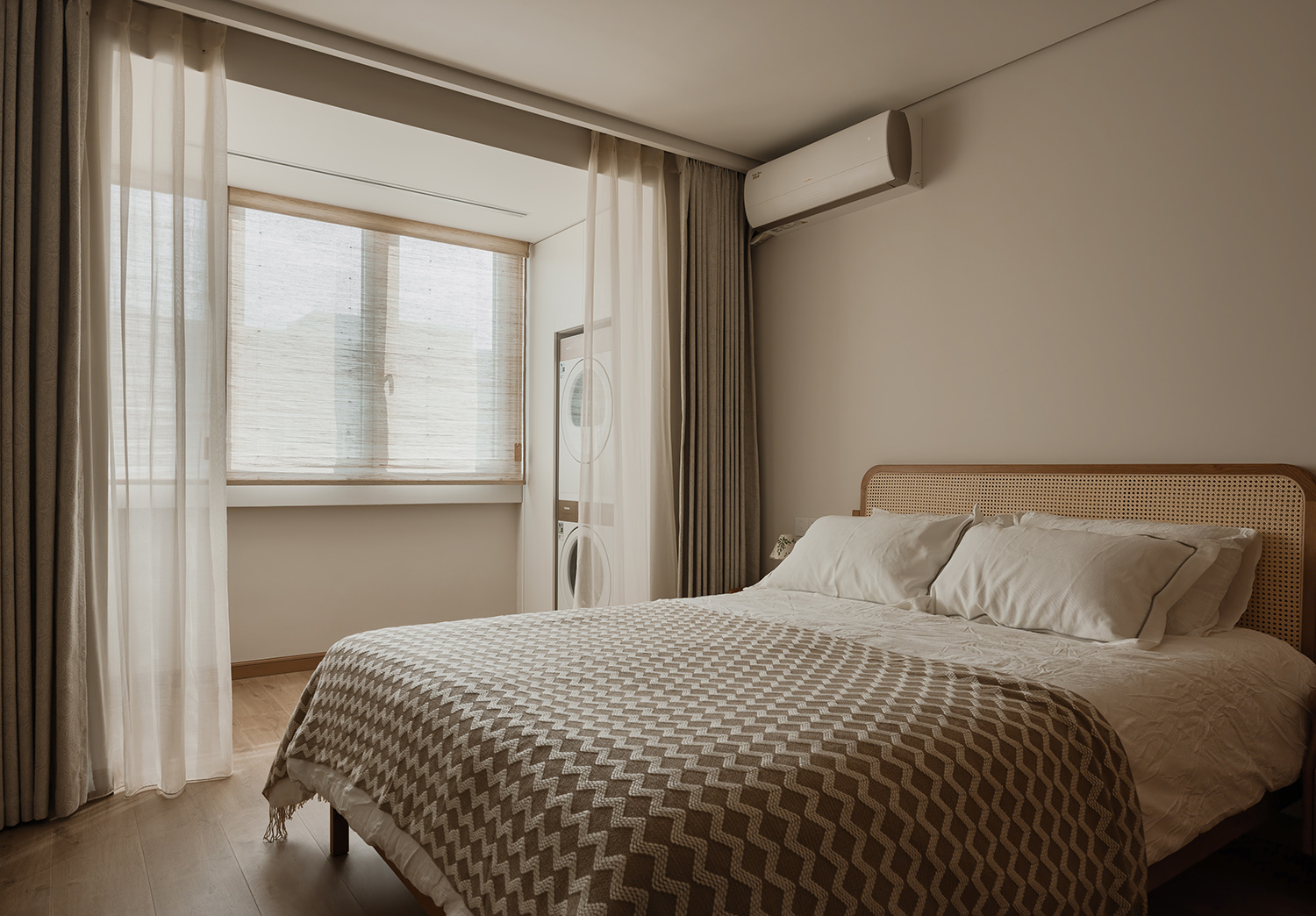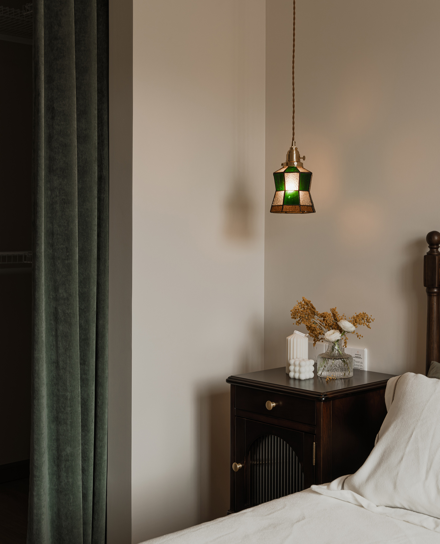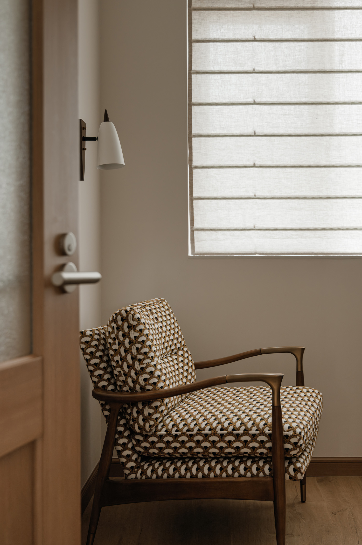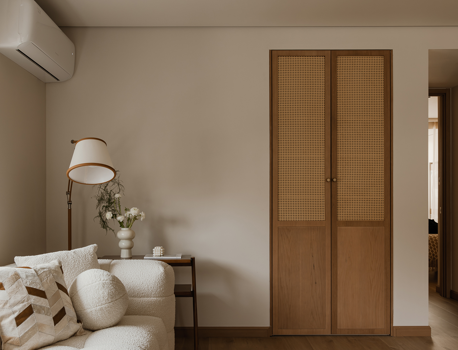 空间意境:将女主人喜爱的日式风与中古风巧妙融合,在卧室、卫生间等空间营造出独特的绿色中古韵味。大量运用自然材质,如客厅储物柜采用樱桃木和藤编材质,增添复古与自然韵味;次卧木质床头柜的藤编纹理带来质朴自然美感;阳台使用亚麻色日夜风情帘,引入柔和自然光,营造自然舒适氛围。