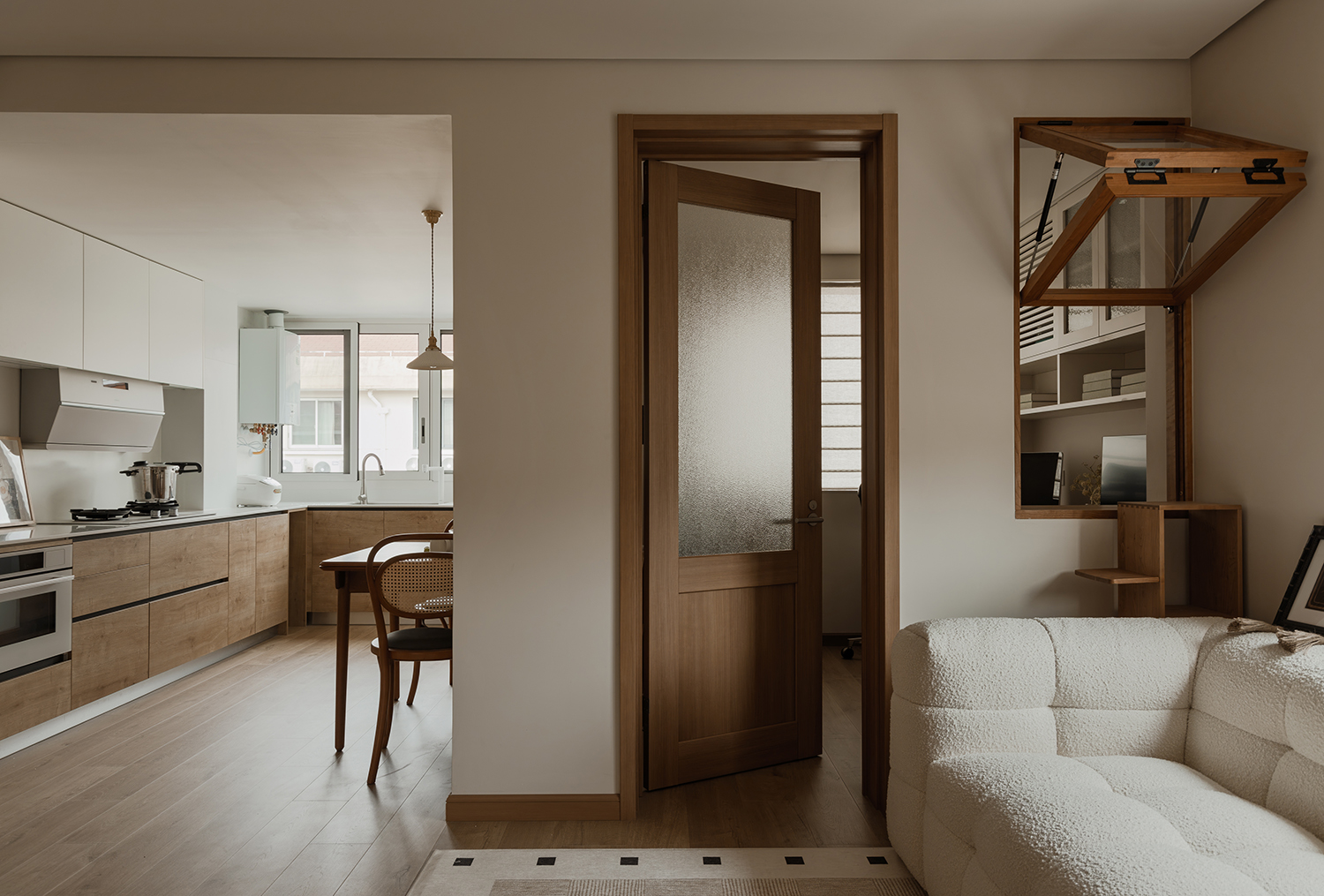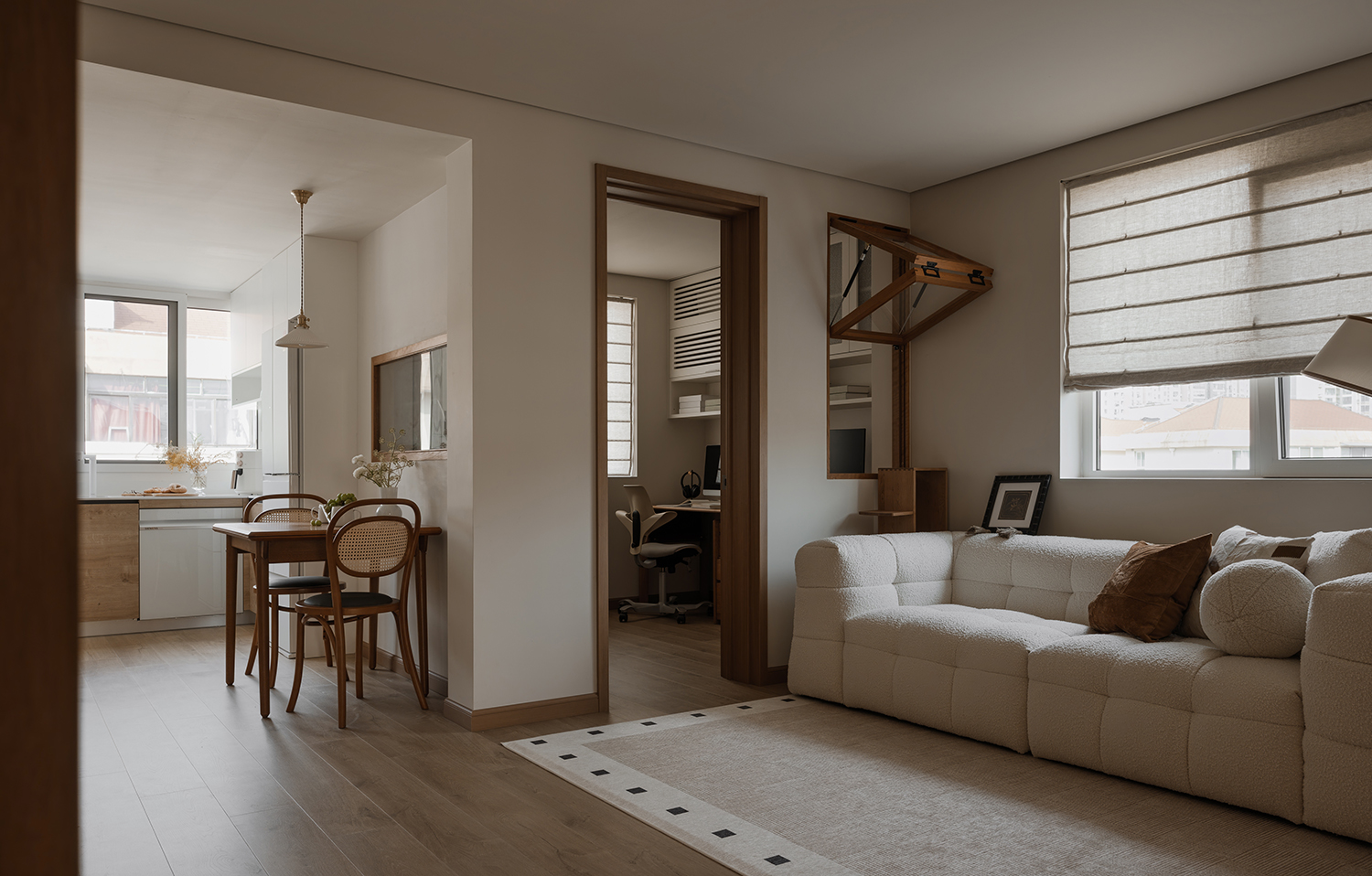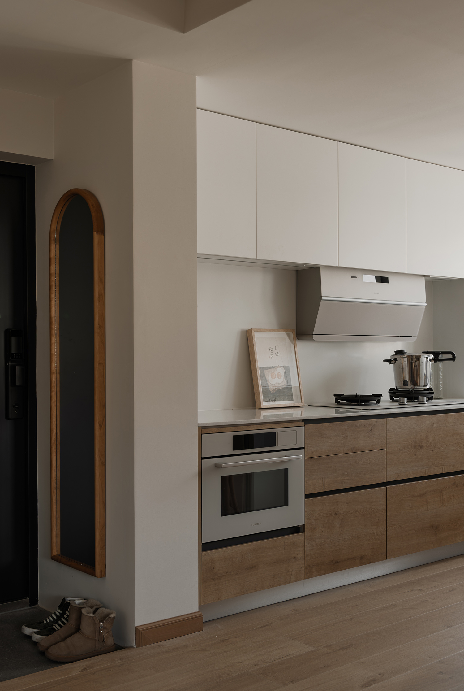 书房改造:将书房门改至由客厅进出,与厨房之间开封闭式窗洞,与客厅设窗,既隔绝油烟又保证通透性,增强空间互动,避免压抑闭塞,同时为猫咪提供专属路径。