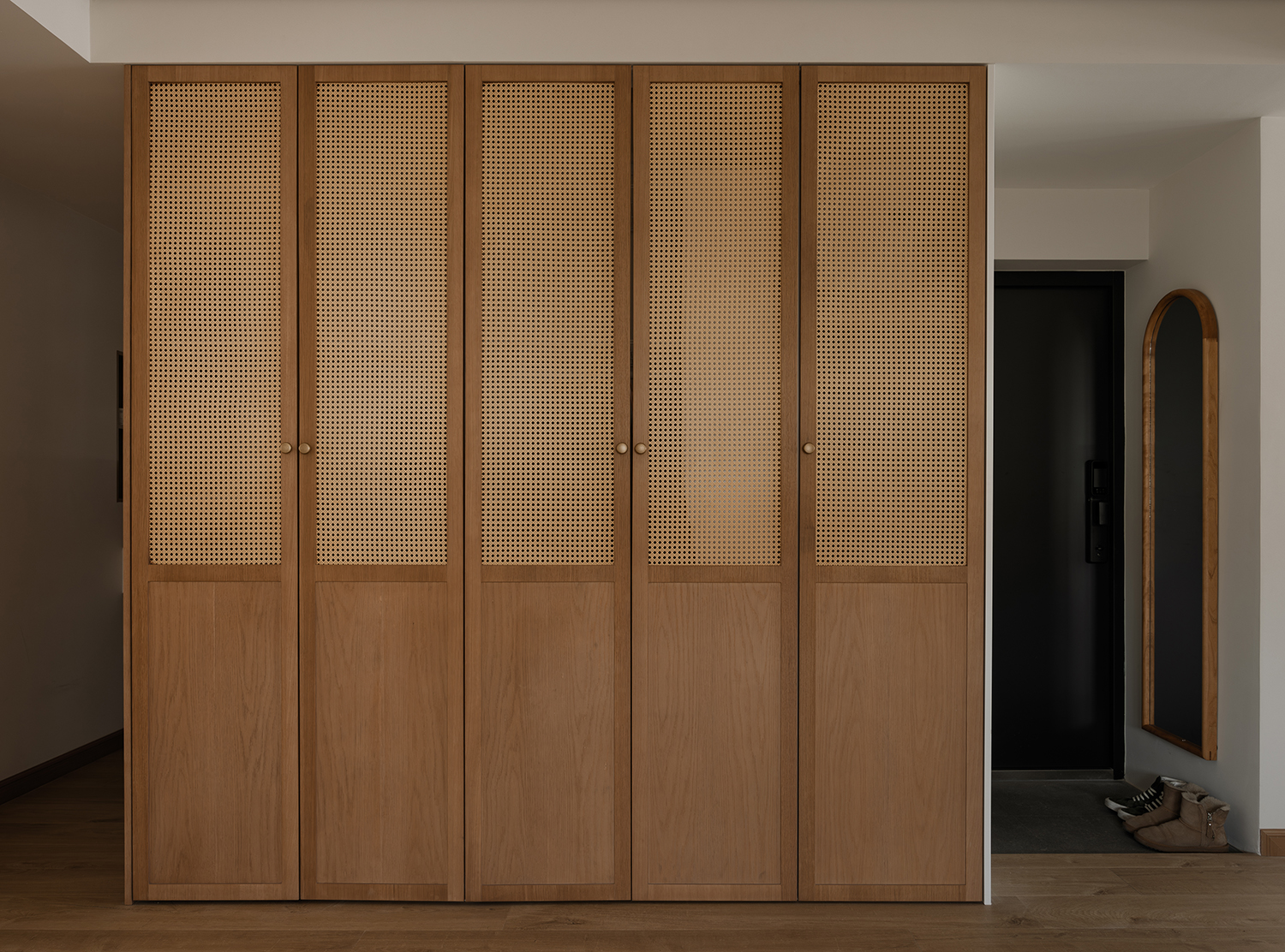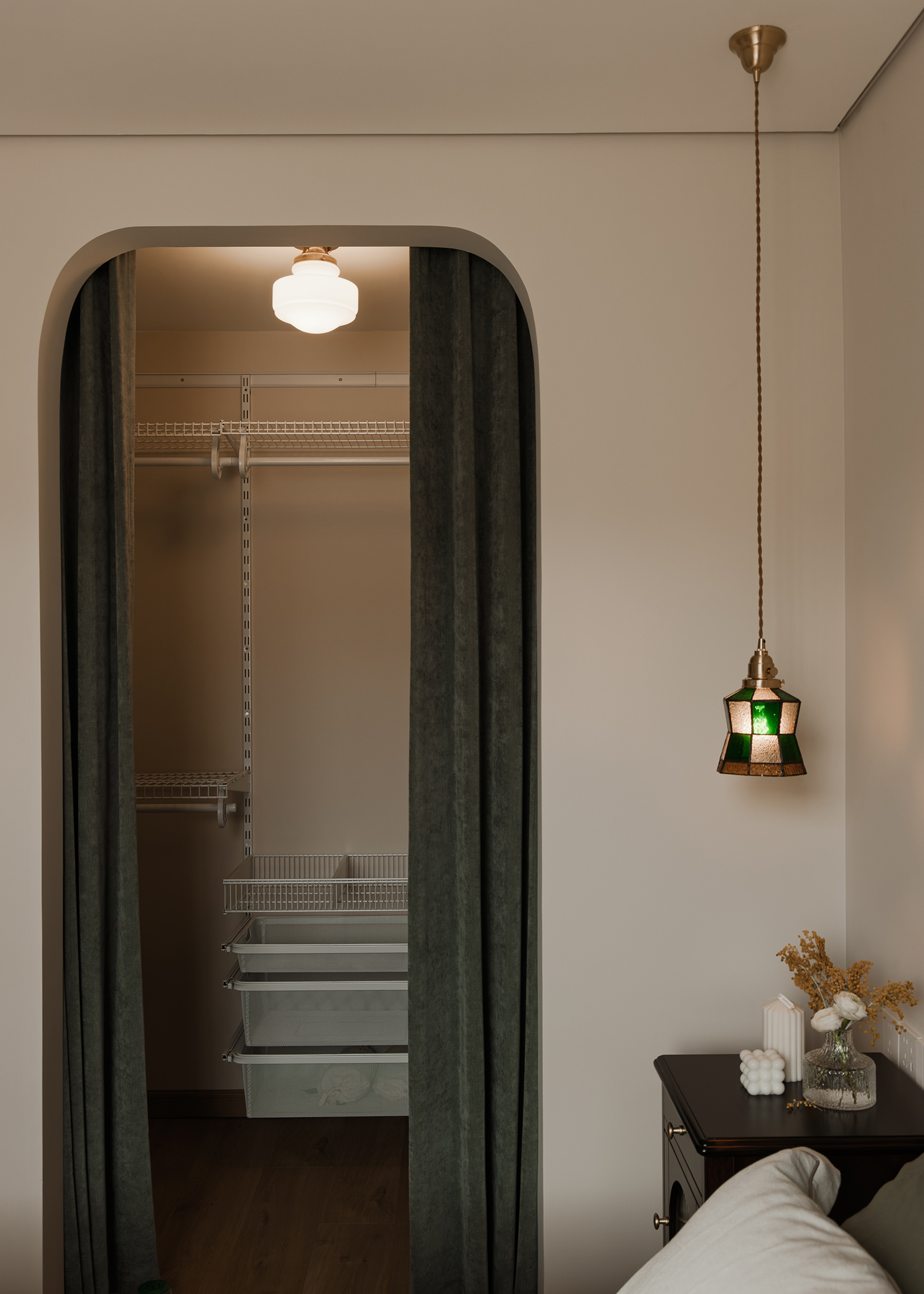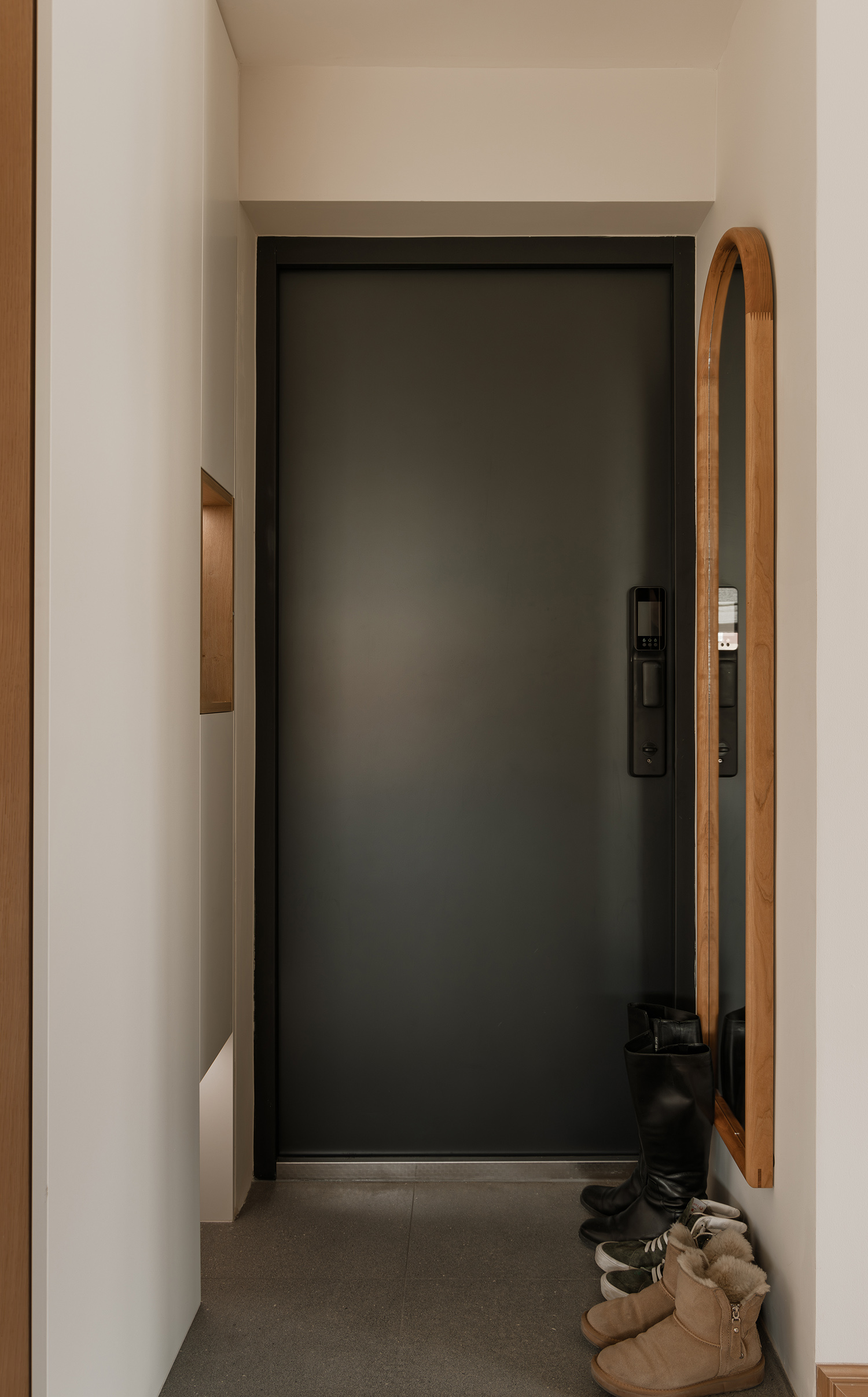 卧室调整:调换主次卧空间,大空间作主卧布置步入式衣帽间;改变主卧进门方向,原门位置砌薄墙做鞋柜并放置分水器,保证客厅方正完整。