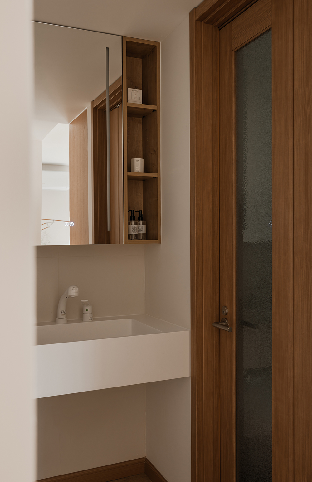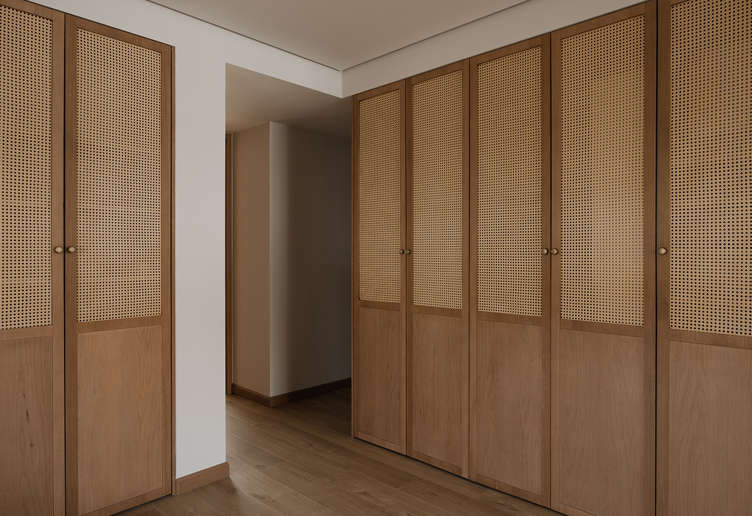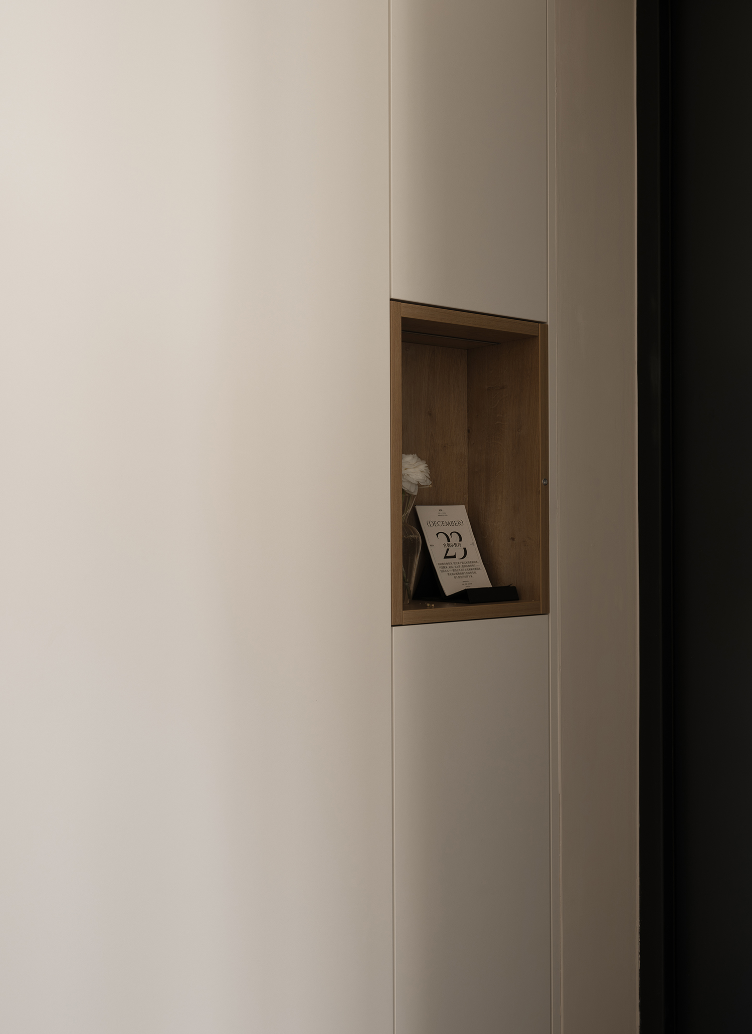 卧室调整:调换主次卧空间,大空间作主卧布置步入式衣帽间;改变主卧进门方向,原门位置砌薄墙做鞋柜并放置分水器,保证客厅方正完整。