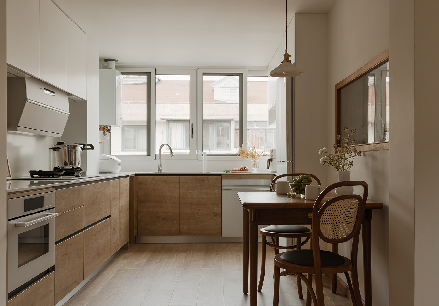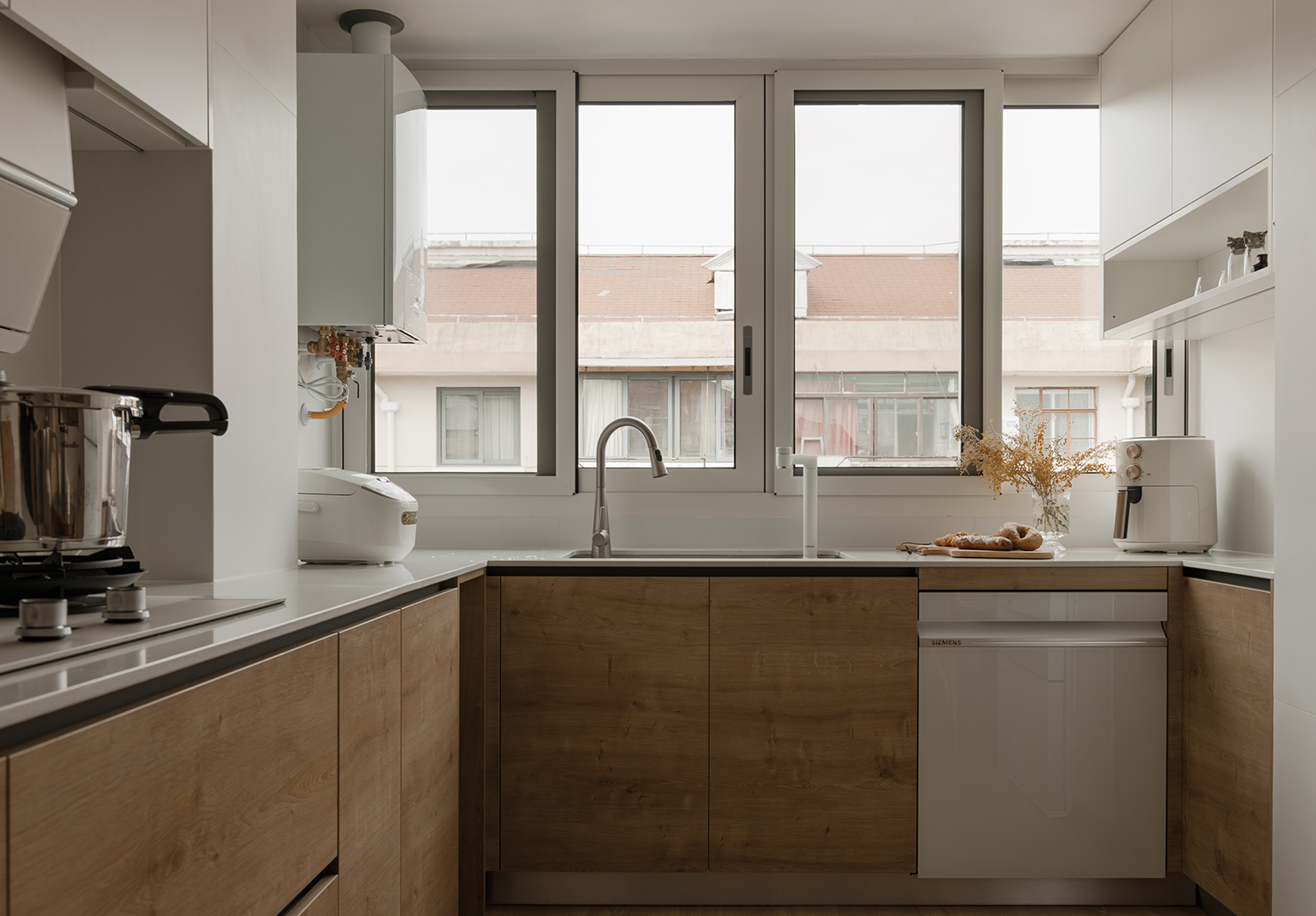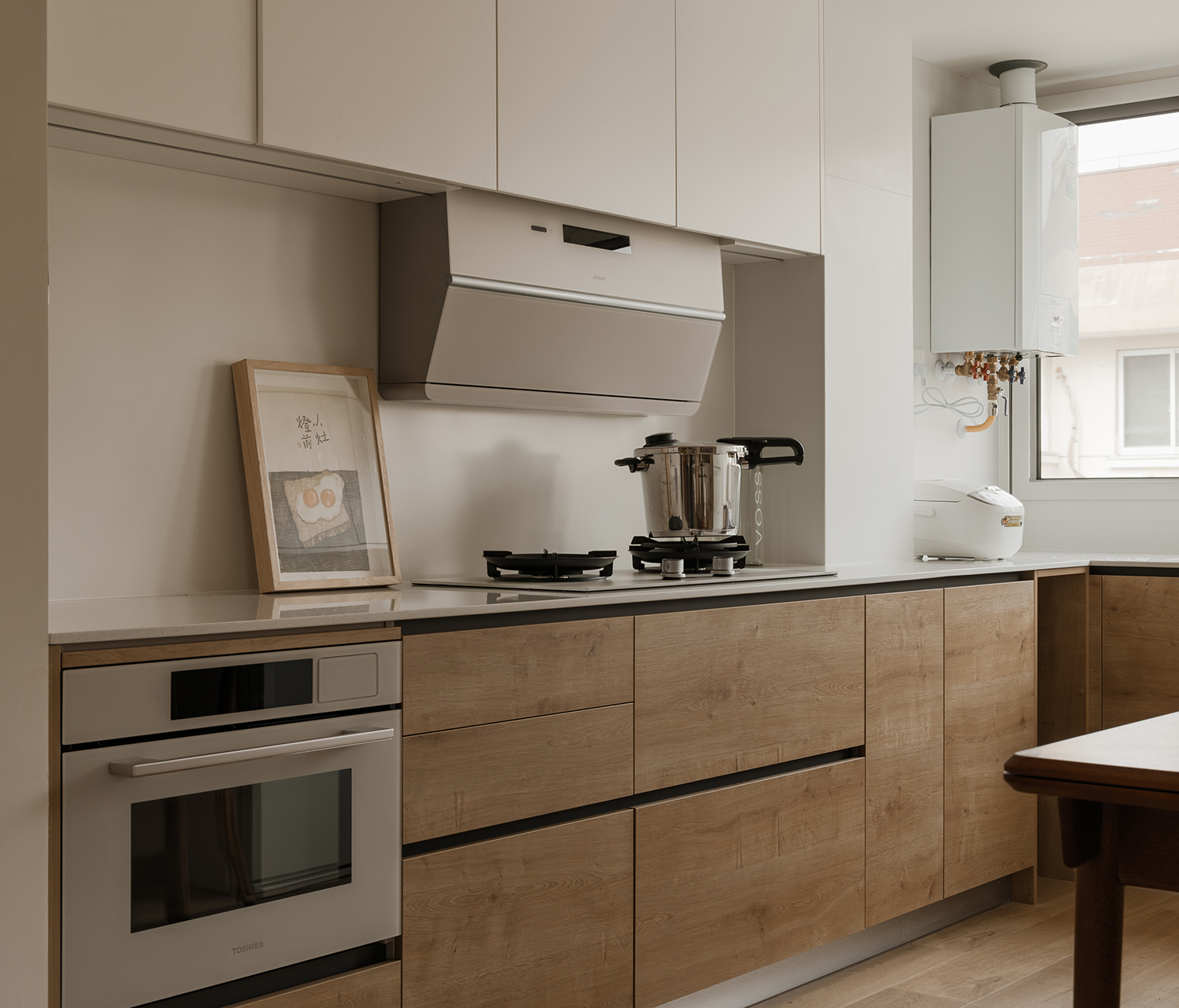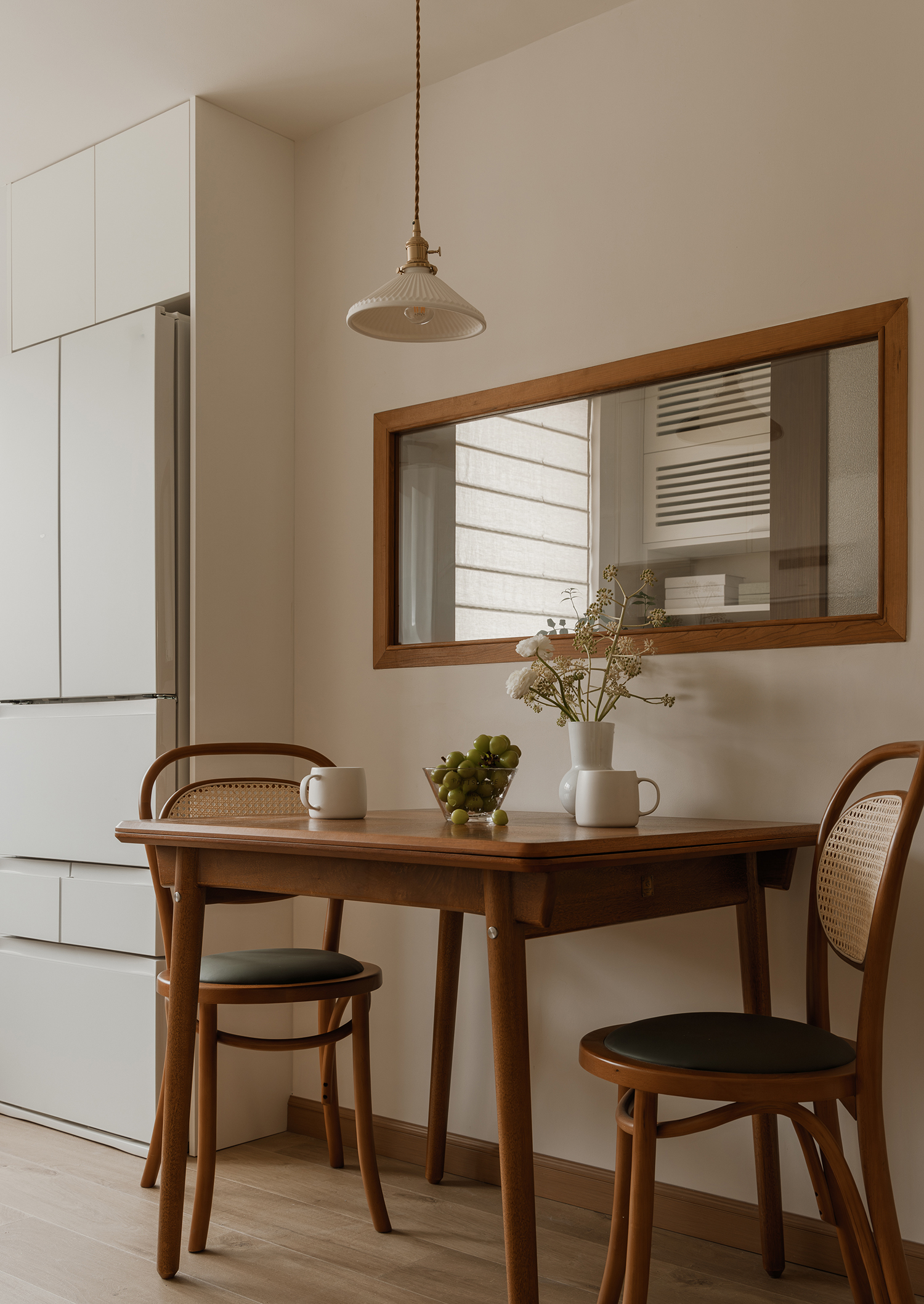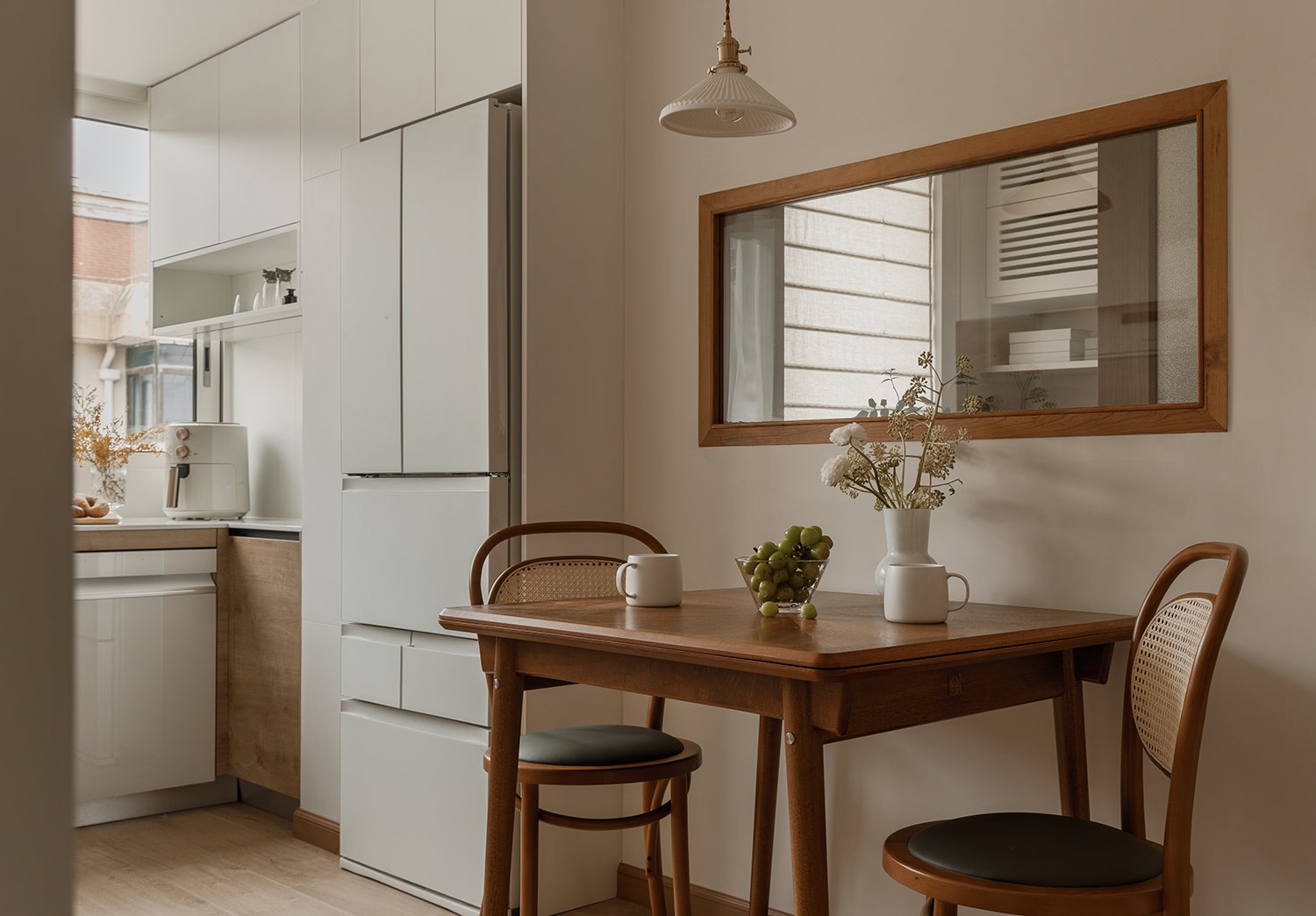 空间布局:餐厨一体:打破传统布局,将生活阳台纳入厨房,规划合理操作空间,实现拿、洗、切、炒动线流畅;采用折叠餐桌,满足不同用餐人数需求,最大化利用空间。