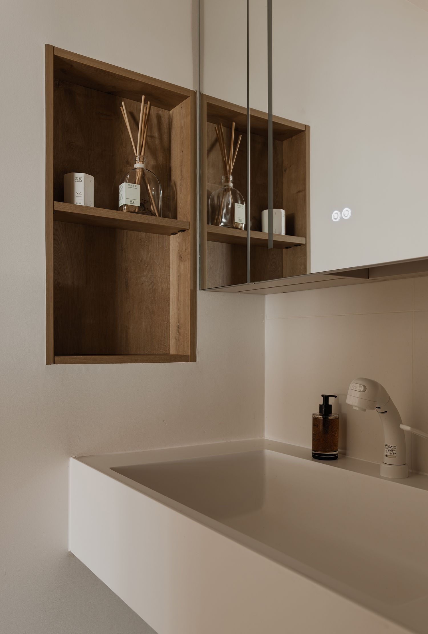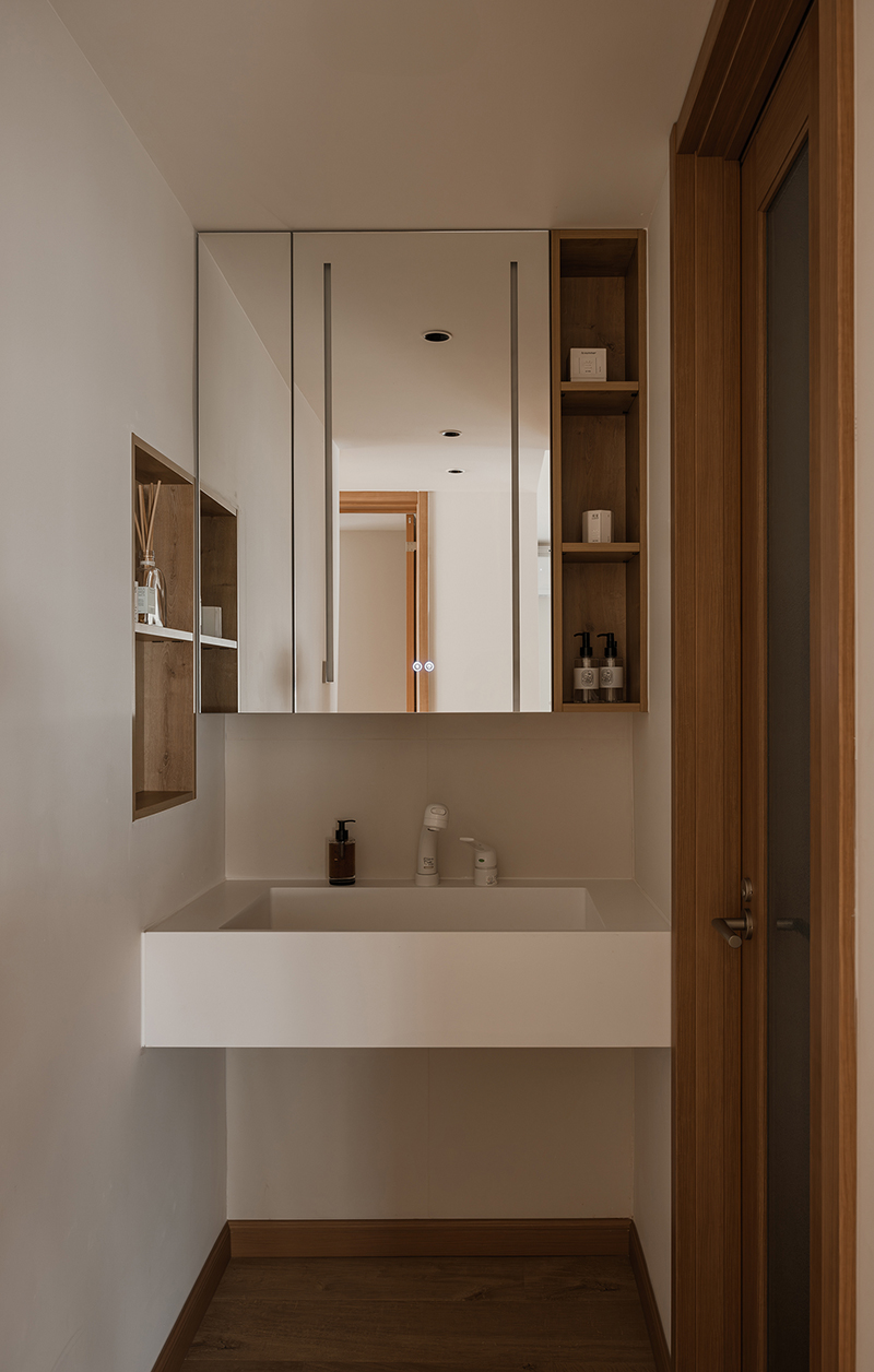 收纳优化:在客厅与卫生间之间墙内推做收纳柜;在原本次卧门位置内推墙做收纳空间放置宠物用品和分水器;次卧阳台布置洗烘机、家政柜、收纳柜和内衣洗衣机,增加收纳功能。 -