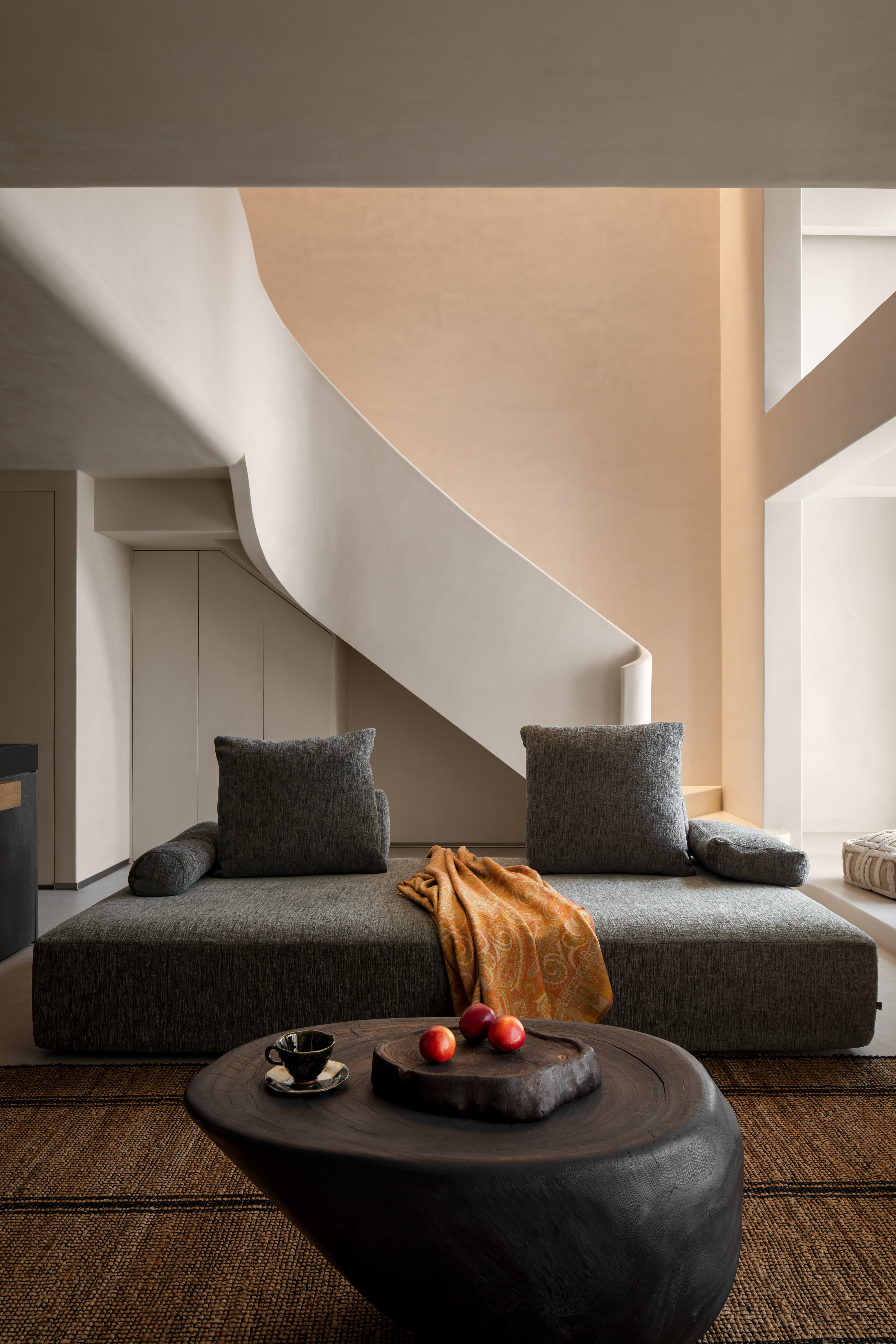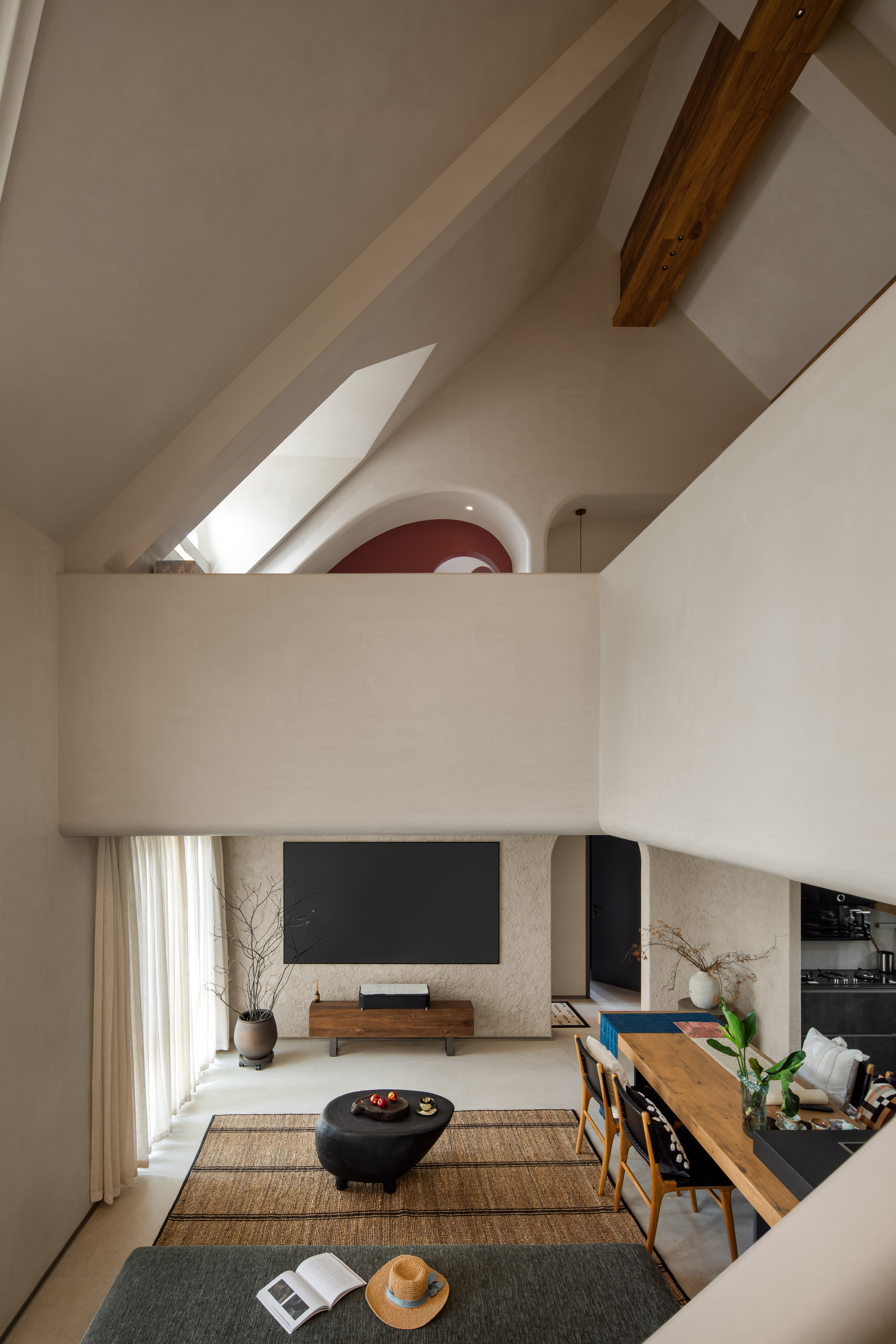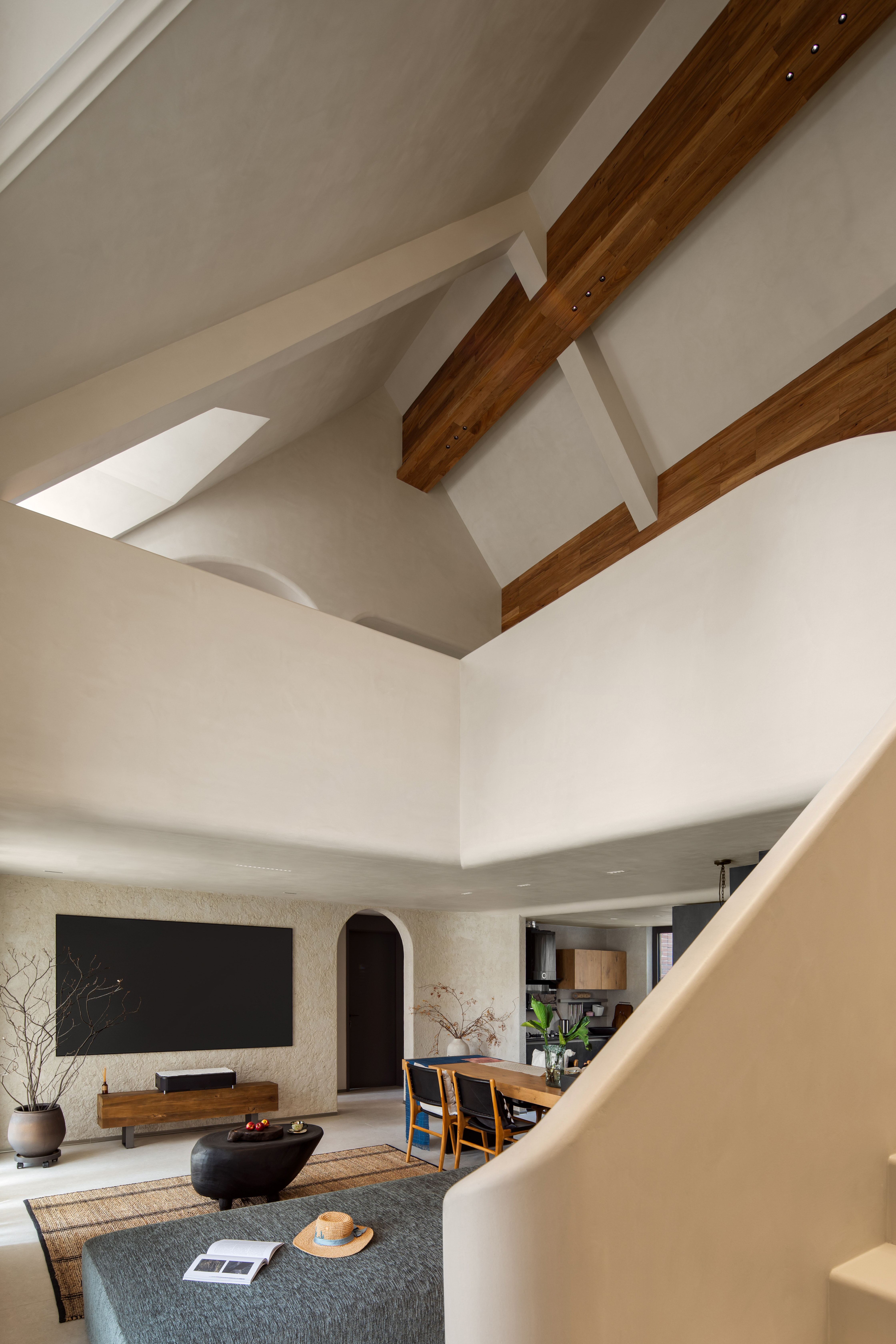 空间意境:摒弃繁复的色彩与装饰,借助简单拙诚的场域基底,对体积、比例、节奏进行运筹把控,呈现空间的建筑美感与体块关系,构筑安宁舒适的空间质感,展现居者笃定内敛、不随波逐流的态度与精神。丰富的收纳系统隐藏于简约的界面之后,功能与视觉美感的双重兼顾实现了美学与实用主义的和谐统一。弧形的设计散发出一种别致的韵味。它柔和了直线的硬朗,增添了一份优雅与温暖。木质的沉稳色调与光影的柔和对比,共同营造出一种穿越时空的高级感,呈现出一种动态的美感,仿佛时间在此静止,古韵悠然流淌。水泥梁体,展现出建筑的原生魅力,层次感愈发丰富,令空间更加开阔。