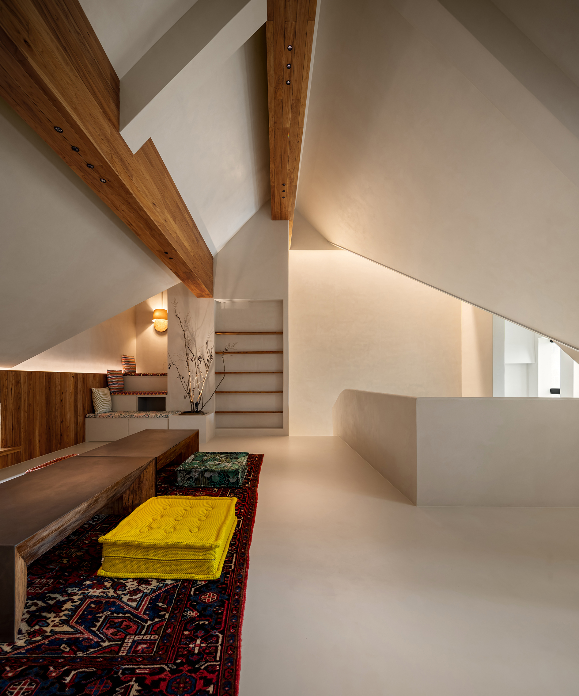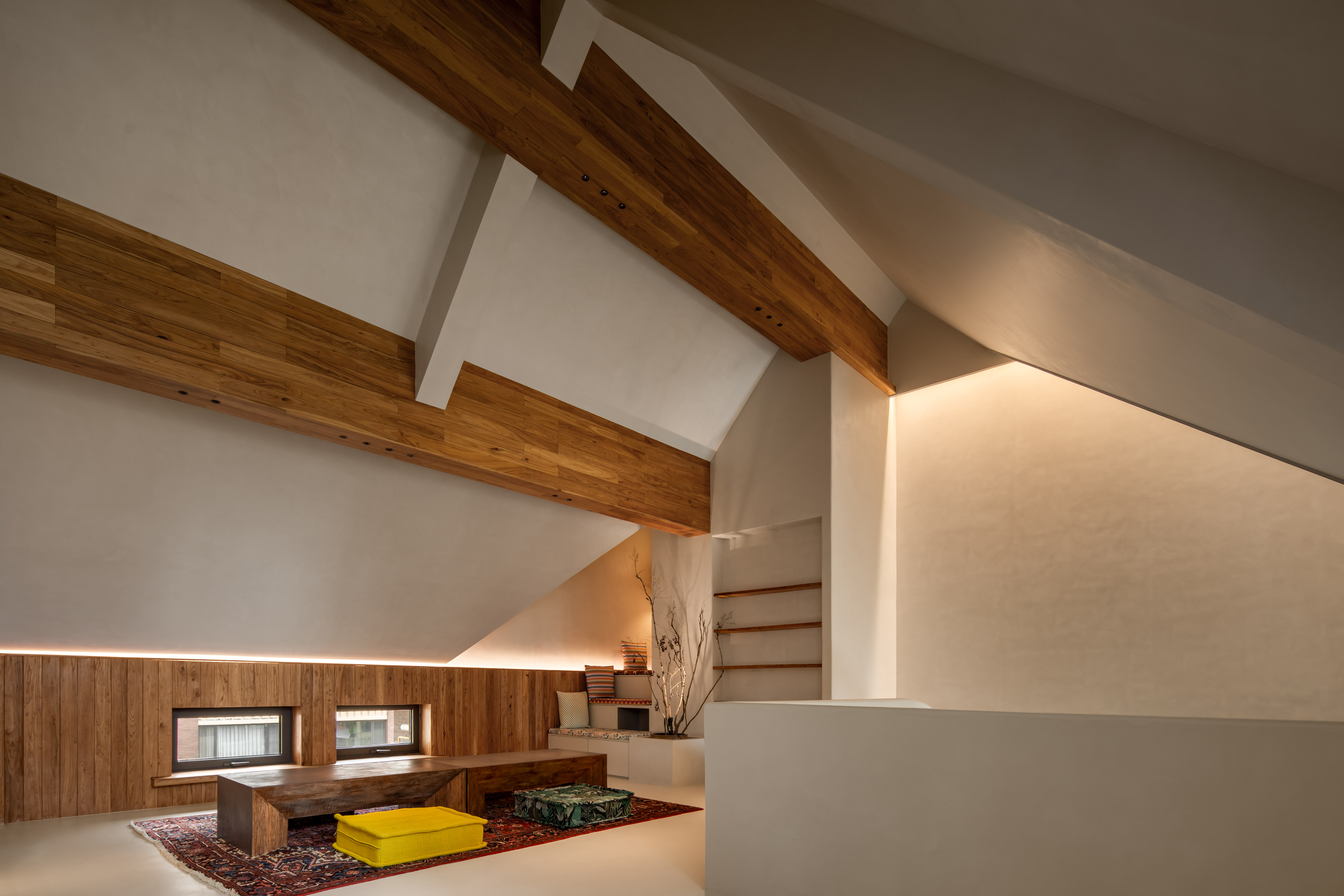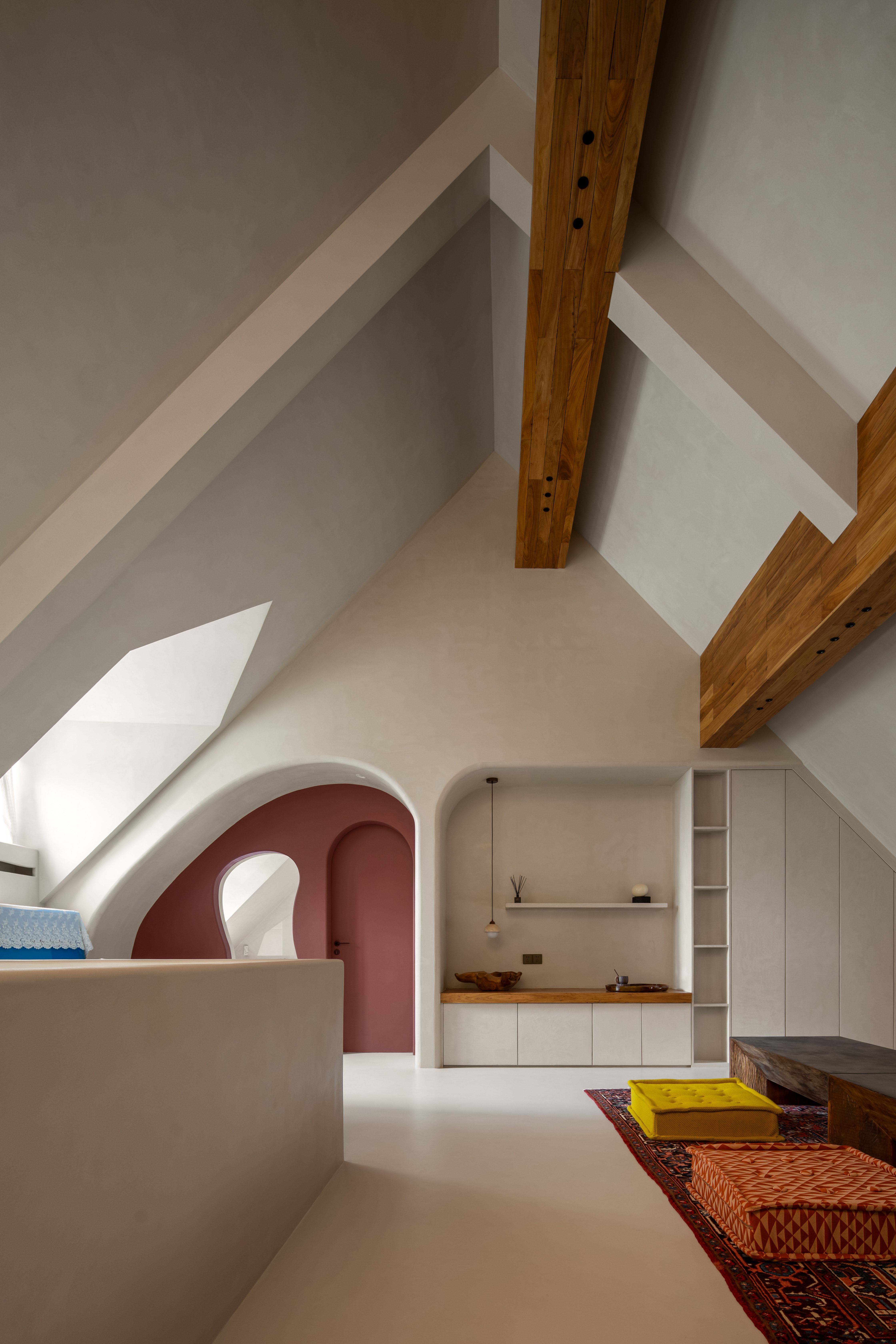 空间意境:摒弃繁复的色彩与装饰,借助简单拙诚的场域基底,对体积、比例、节奏进行运筹把控,呈现空间的建筑美感与体块关系,构筑安宁舒适的空间质感,展现居者笃定内敛、不随波逐流的态度与精神。丰富的收纳系统隐藏于简约的界面之后,功能与视觉美感的双重兼顾实现了美学与实用主义的和谐统一。弧形的设计散发出一种别致的韵味。它柔和了直线的硬朗,增添了一份优雅与温暖。木质的沉稳色调与光影的柔和对比,共同营造出一种穿越时空的高级感,呈现出一种动态的美感,仿佛时间在此静止,古韵悠然流淌。水泥梁体,展现出建筑的原生魅力,层次感愈发丰富,令空间更加开阔。