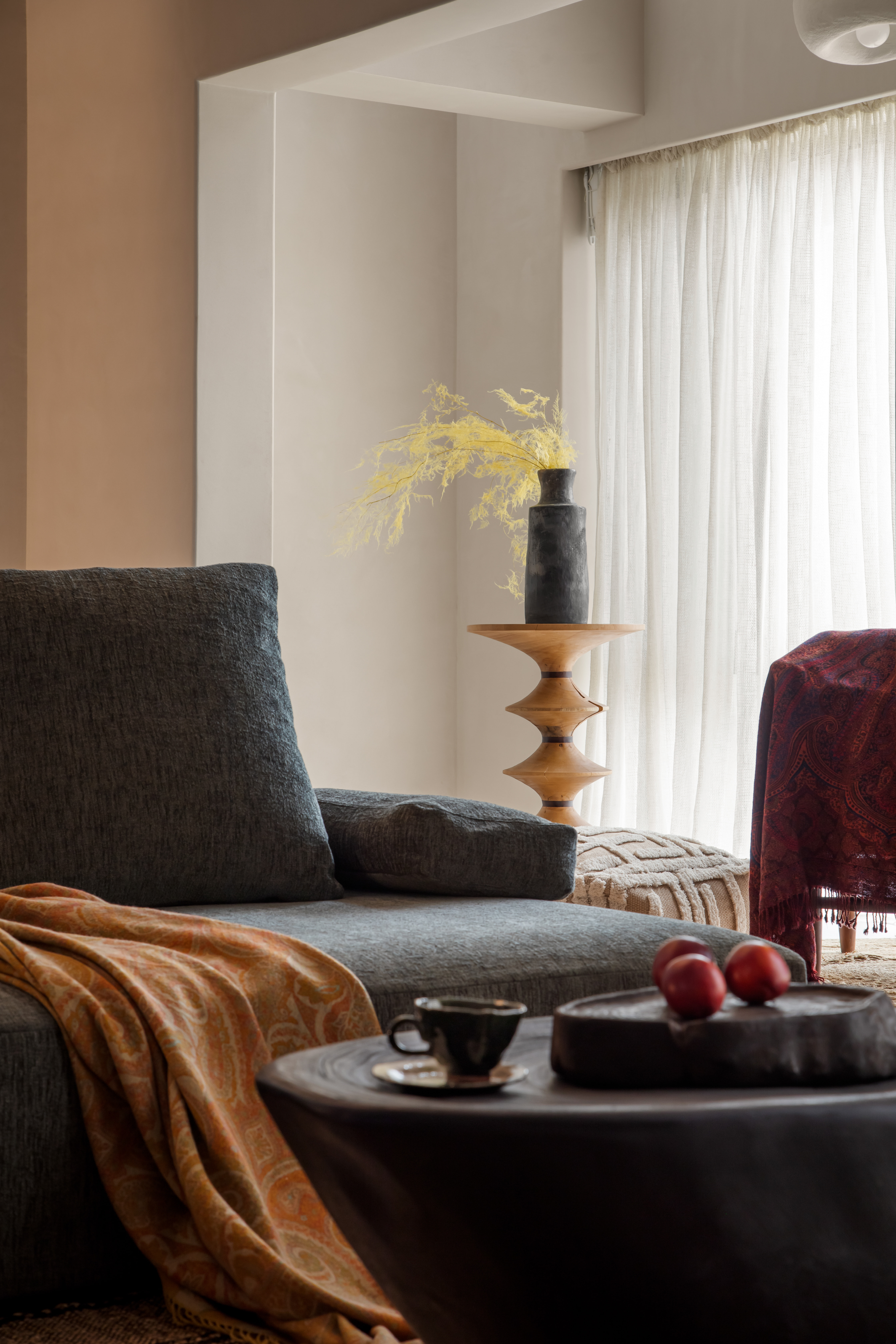 空间布局:空间不会被固化,去客厅化设计展现出生活的流动,以功能性为核心,突破了传统布局的束缚,纱帘柔软的材质与窗户的曲线相得益彰,地毯、茶几等大量弧线的运用让人在穿行时感受到一种温馨与安心,增强了空间的流畅感,宁静流淌。原空间存在公区利用率低、餐厨空间相对隔离、空间交互性差、室内采光不佳等问题,传统的空间格局使得公区局促且缺乏活力,功能场景亦不能满足当下生活方式。我们拆除建筑原有部分墙体,重塑功能布局,塑造兼具实用性、丰富性、流动性、交互性的生活场域,并于空间中探索滋养情感和灵魂的方式。起居室、餐厅、厨房一体化设计,空间视觉和动线相互融通,最大化开敞式布局,使得场域开阔、流动、有机;自由开放的形态承载生活的多种场景,居者虽身处各自空间依然能彼此关怀、互动,各个单元不是孤单的存在,公区成为情感连接的纽带。