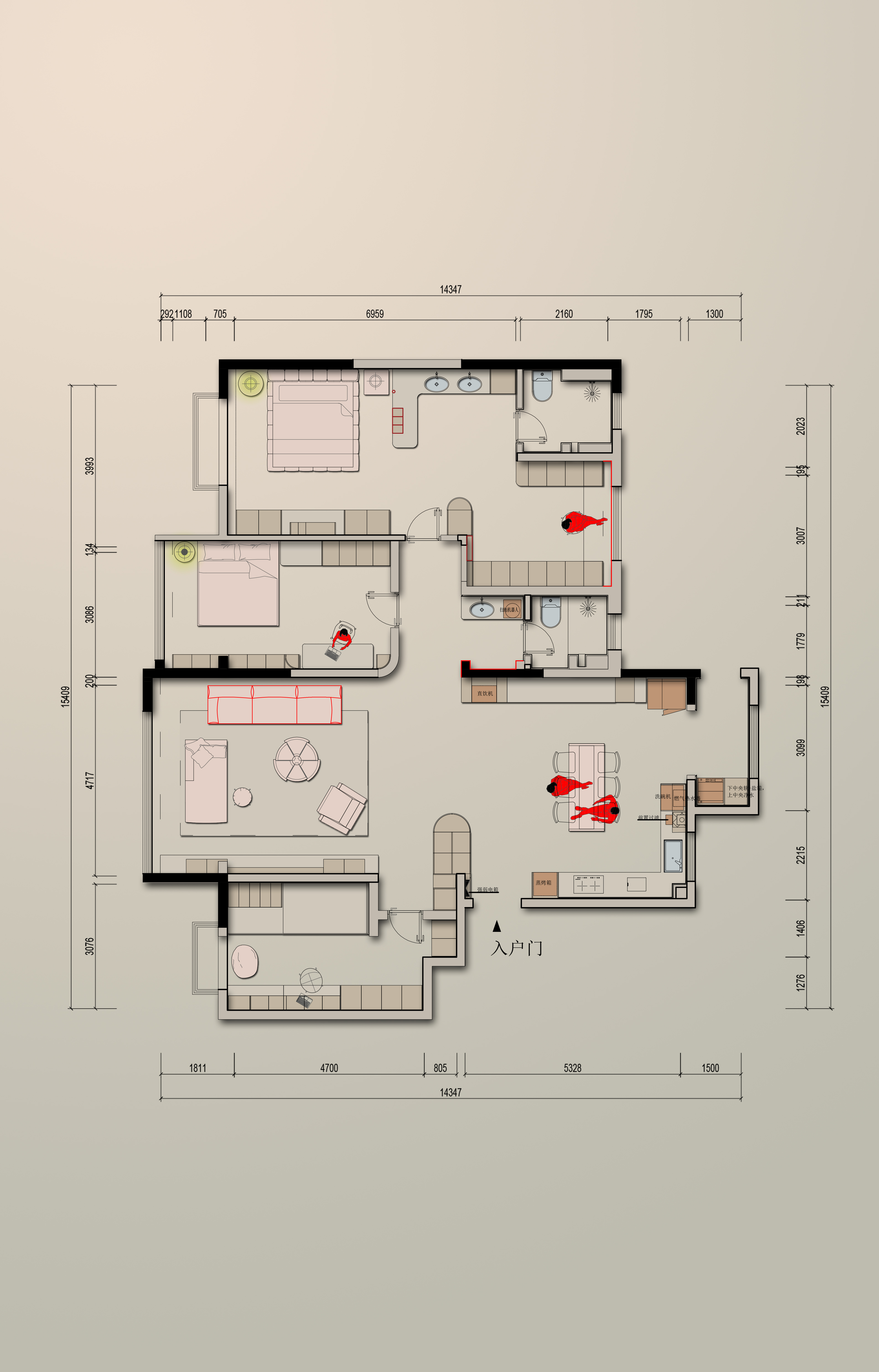 项目定位:这件作品的设计策划围绕“打破传统室内边界,打造艺术化沉浸式居住空间”展开,定位为高端定制的艺术居住空间。