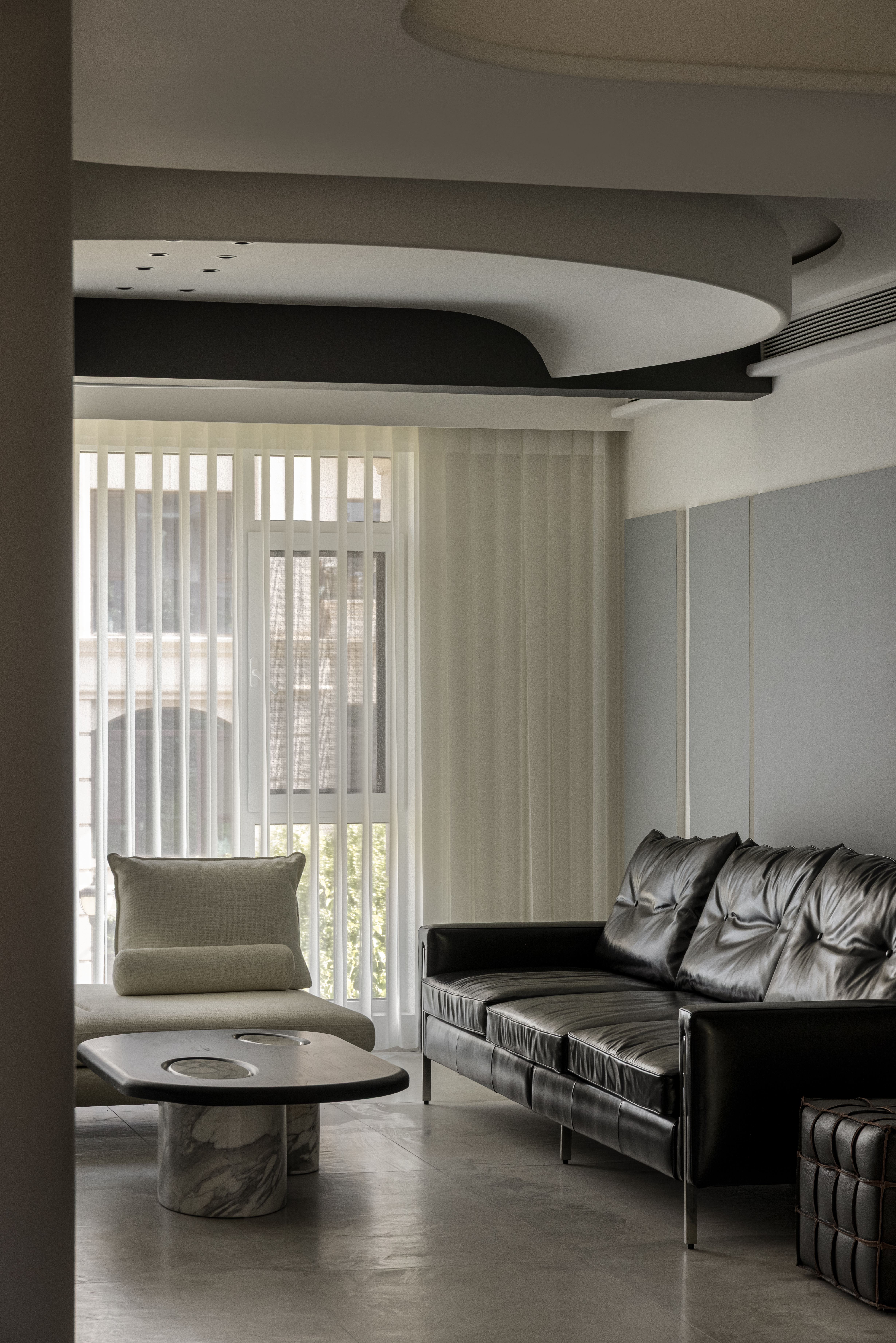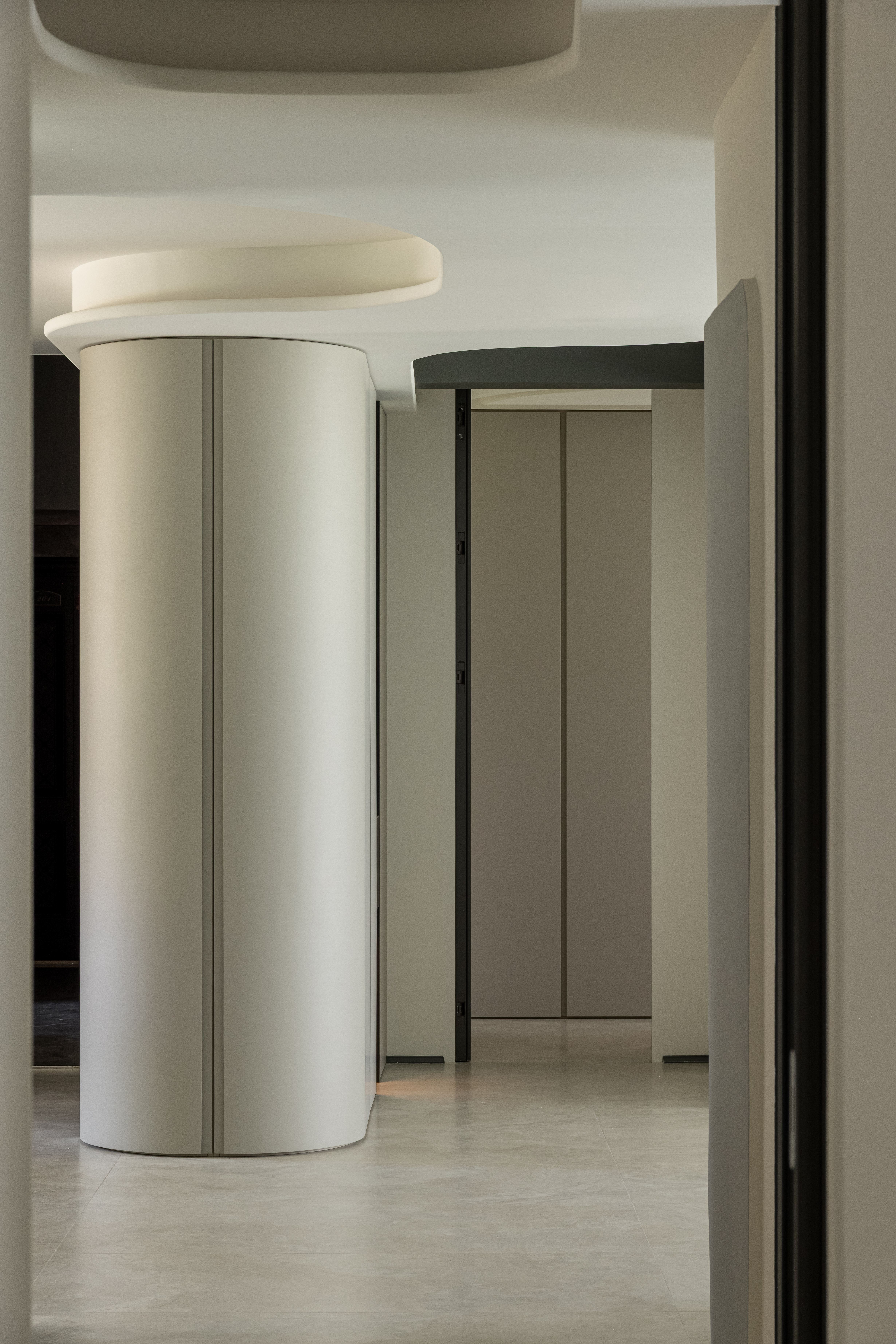 曲面天花板的起伏形态会让光线产生自然的漫反射与明暗渐变,替代了传统的主灯照明设计,利用空间形态本身塑造光影层次,让环境的光影效果随视角变化,增强了空间的沉浸式体验。 -