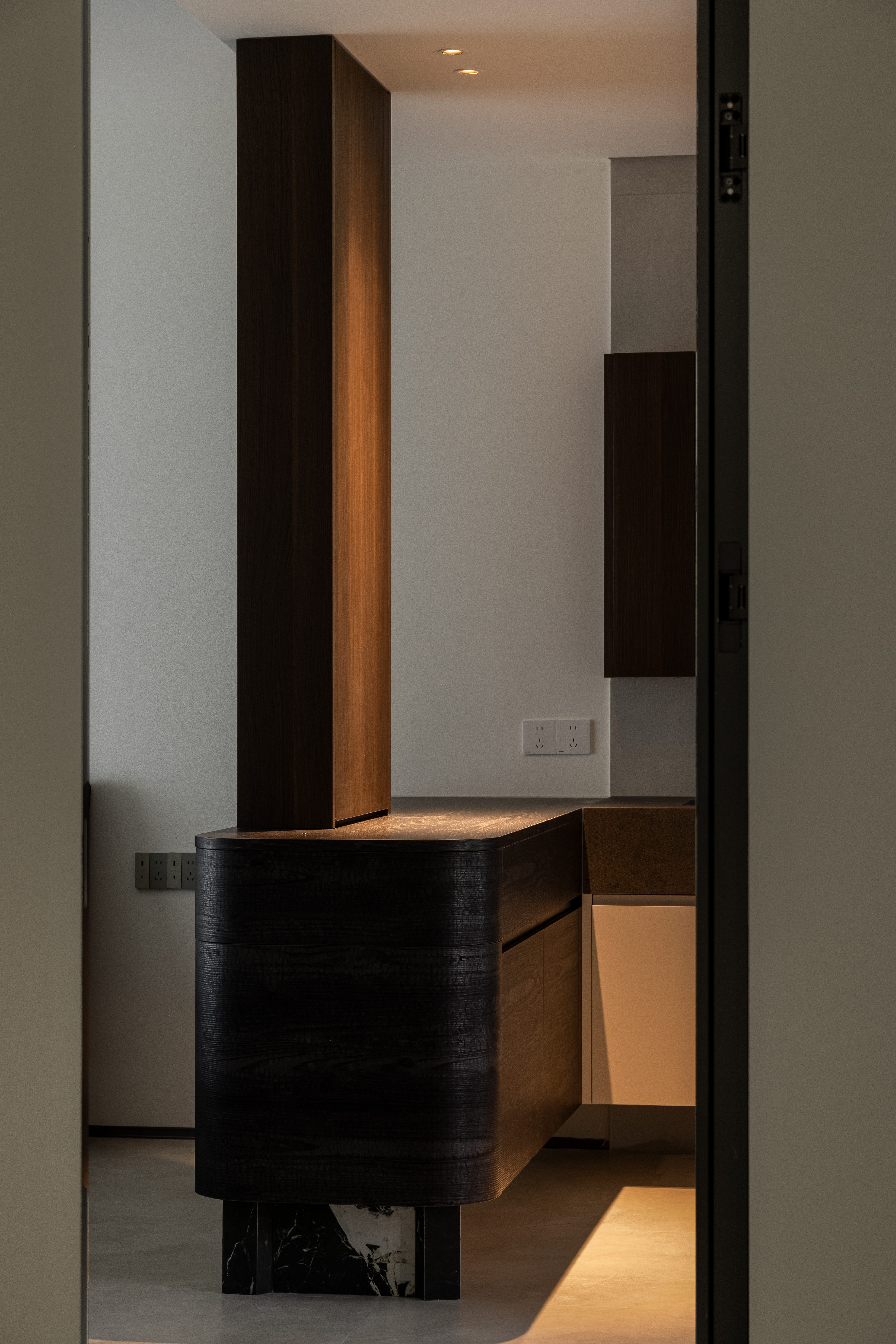 运用了黑色大理石纹理面板(视觉焦点、提升质感)、深色木饰面(增加温暖感)与浅色系哑光面板(保持简洁通透)的组合,材质对比强烈但协调,突出现代精致感。