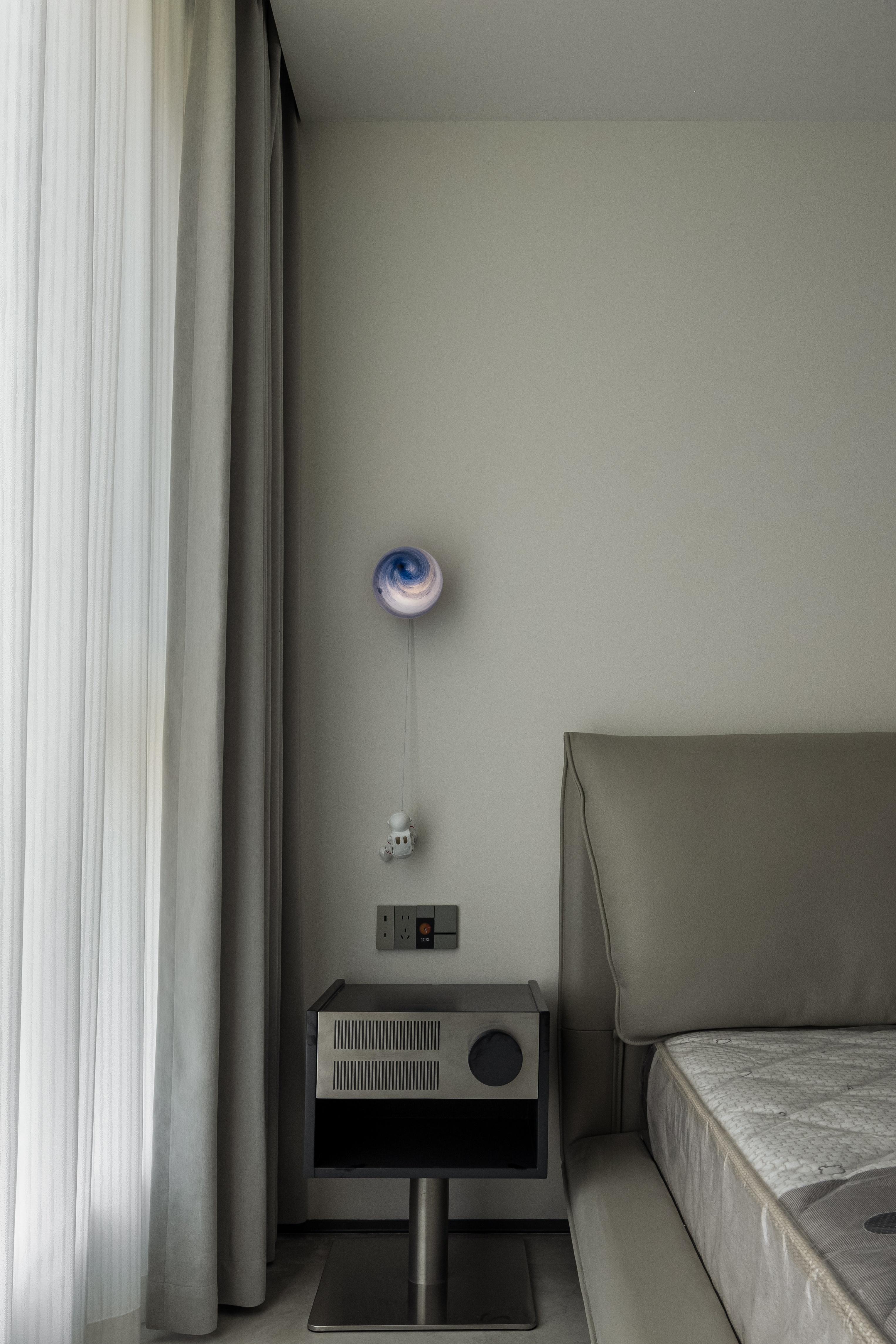 整体延续极简风格的留白、低饱和度色调(白+浅灰为主),但摒弃了极简常见的直线条刻板感,用有机曲线柔化空间边界。同时,纯色的哑光材质(墙面、地面)与曲面造型形成视觉对比,让极简风格更具温度与层次感。