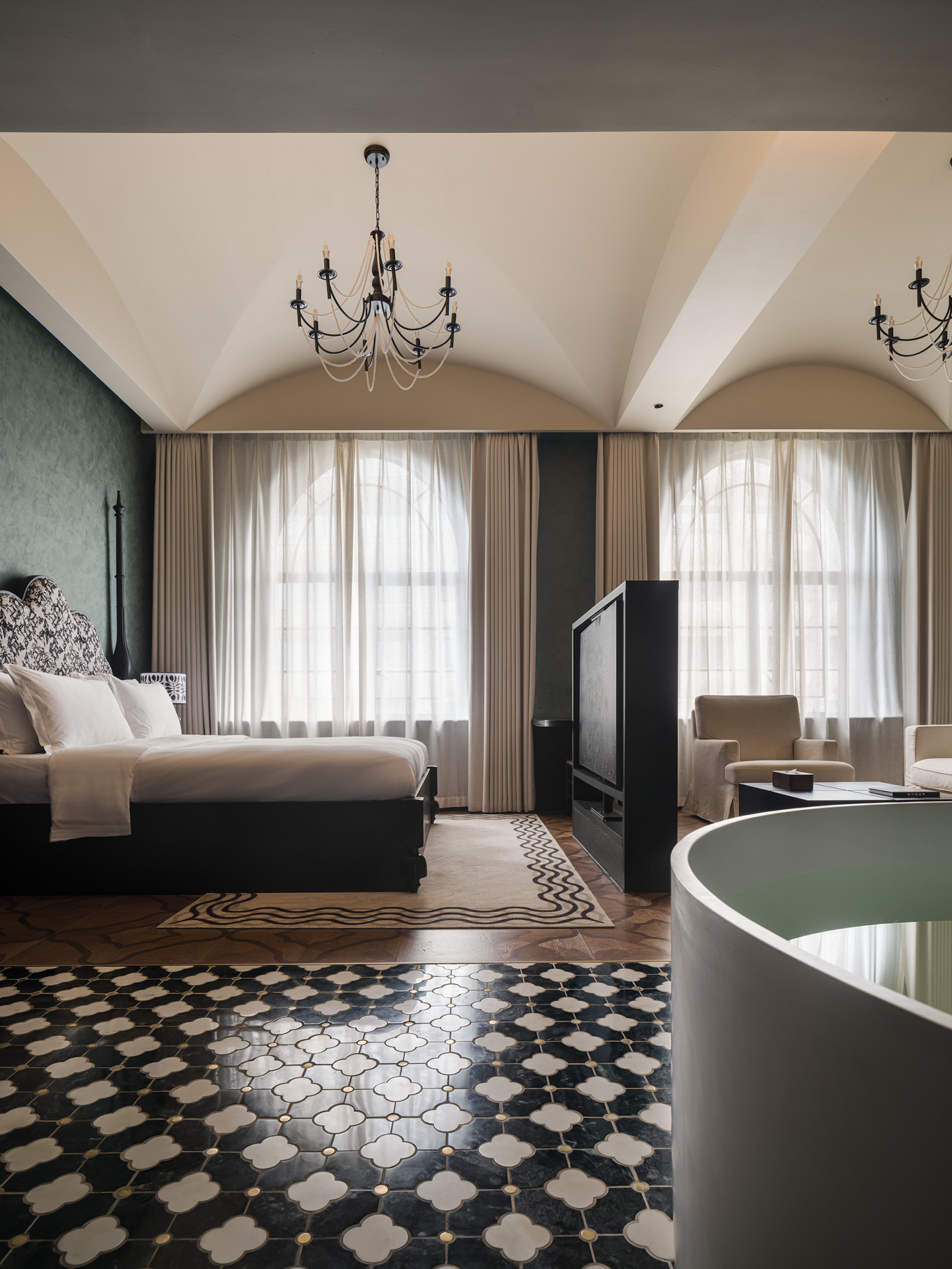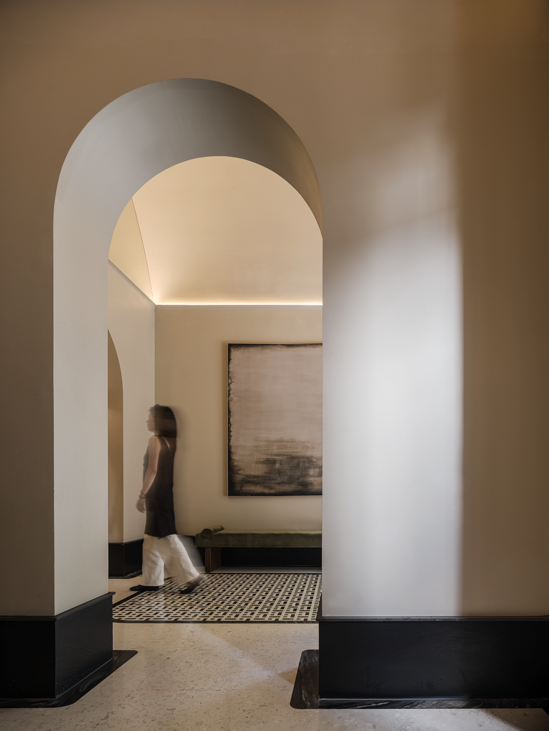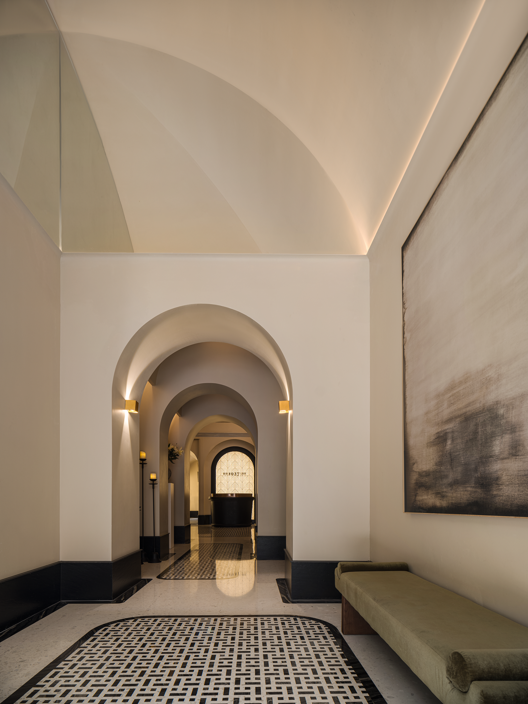 室内延续外部历史气质,采用温润木饰面、深色金属线条、石材与复古图案瓷砖,形成低调奢华的基调。