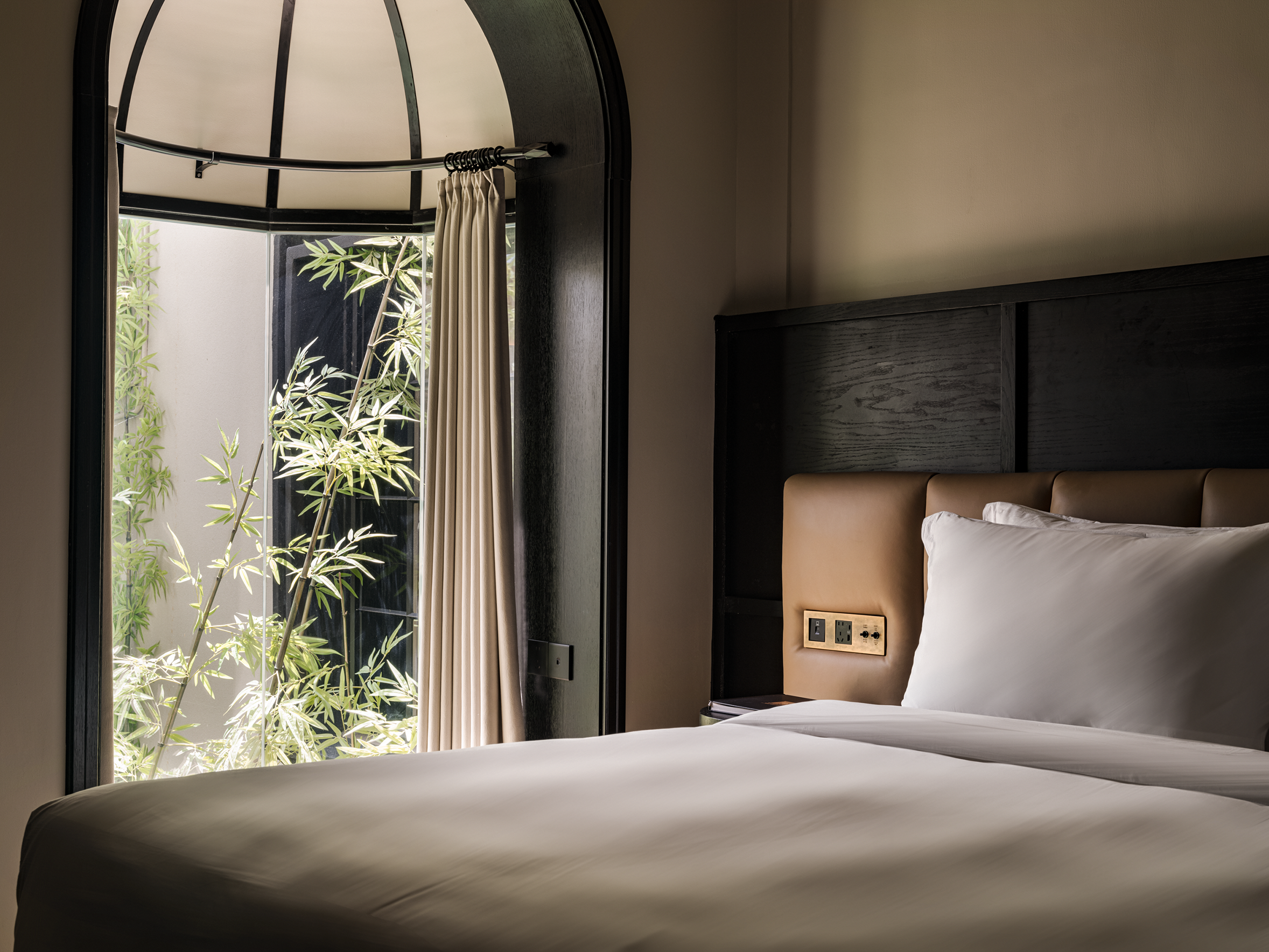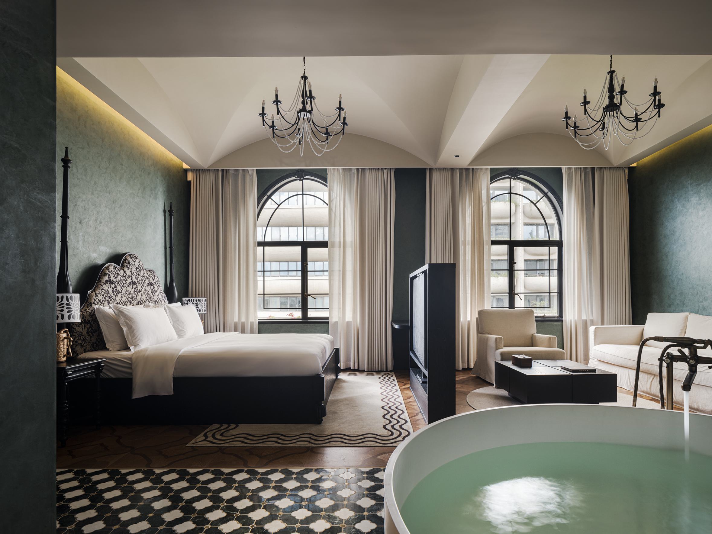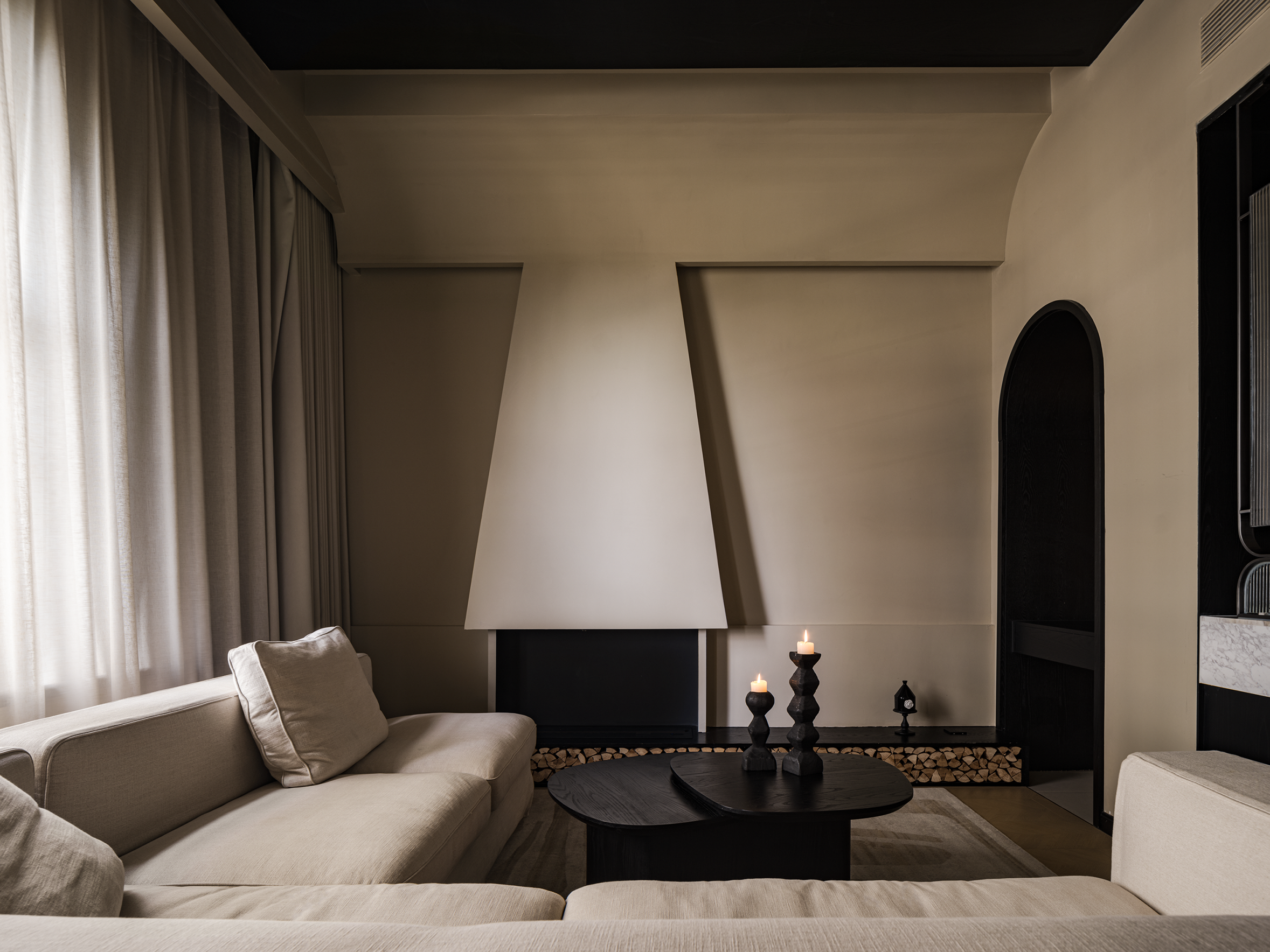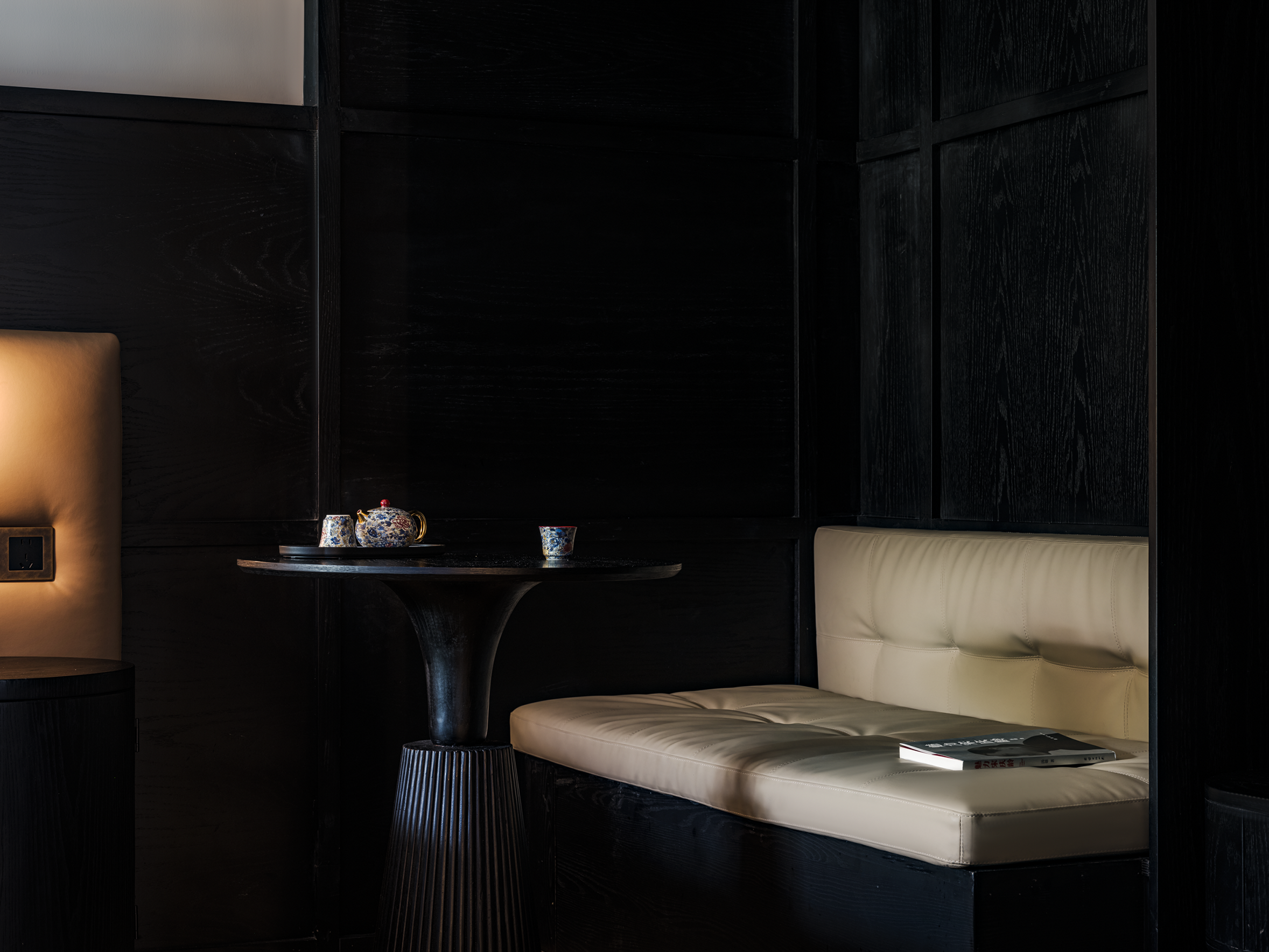 室内延续外部历史气质,采用温润木饰面、深色金属线条、石材与复古图案瓷砖,形成低调奢华的基调。
