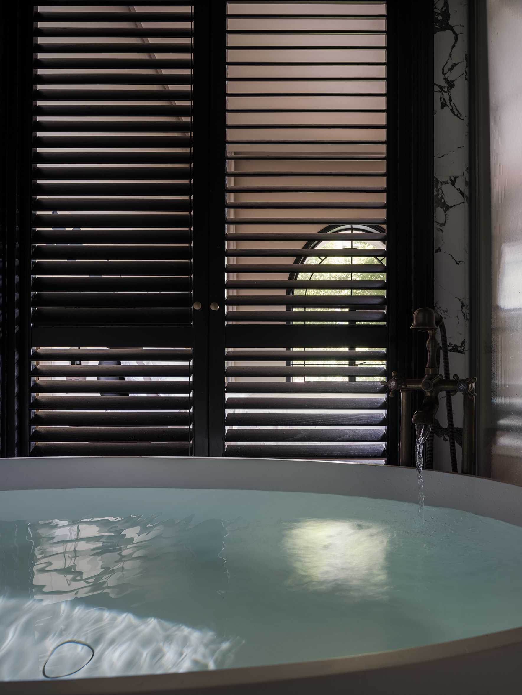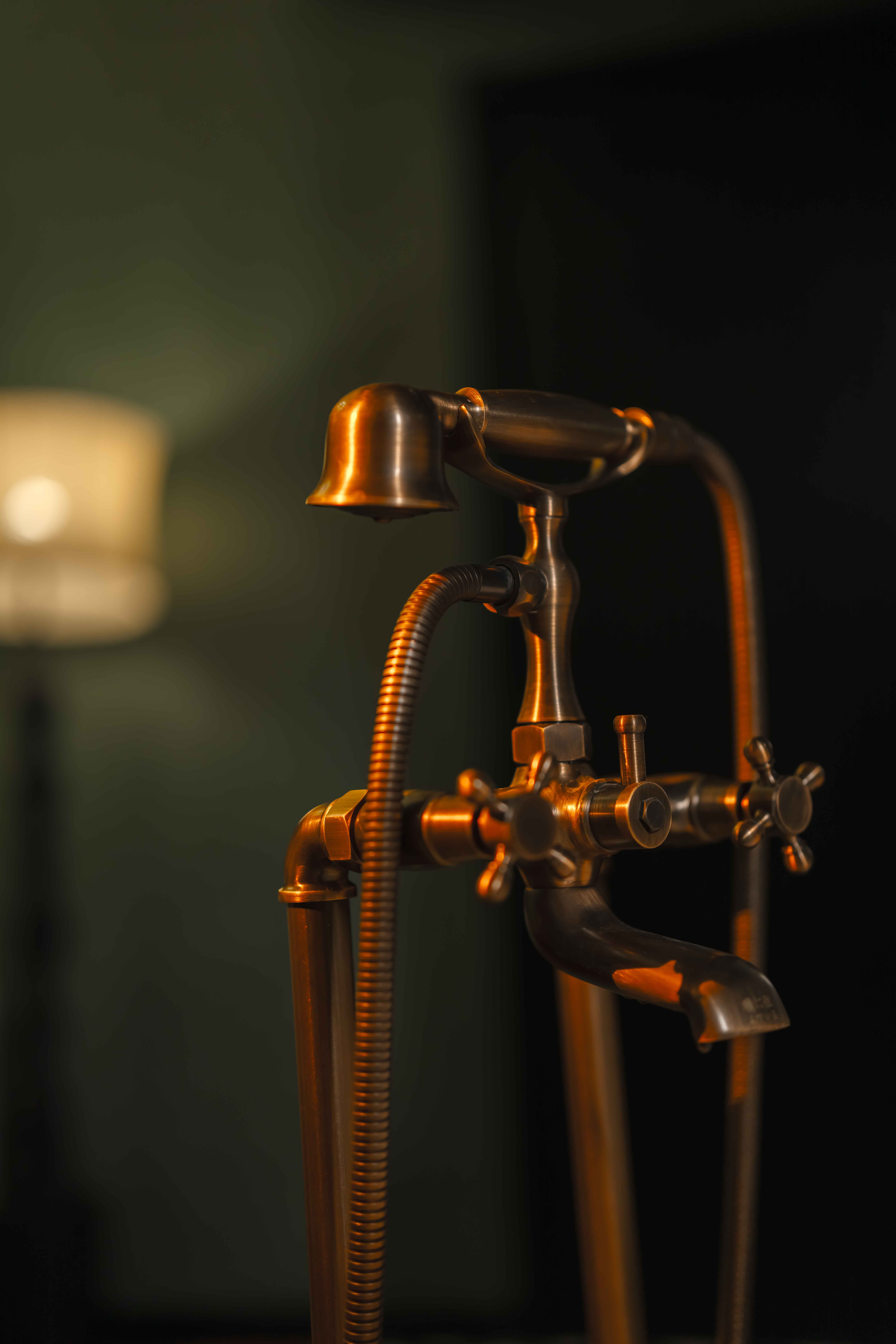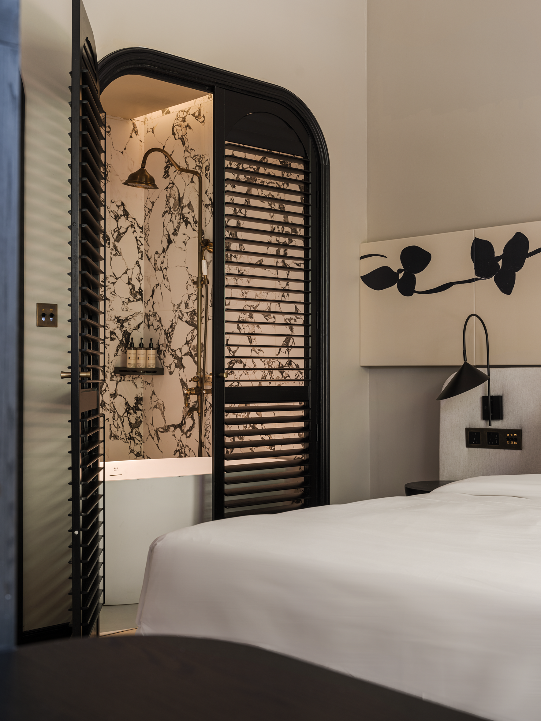 历史元素保留:2.2米厚的金库楼板、厚重砖石墙体、拱形窗洞等结构细节完整保存,并通过灯光与材质强化视觉感受。外立面的复古招牌、铜制开关面板、窗把手、浴缸龙头等细节延续金库时代的金属质感与精致工艺。