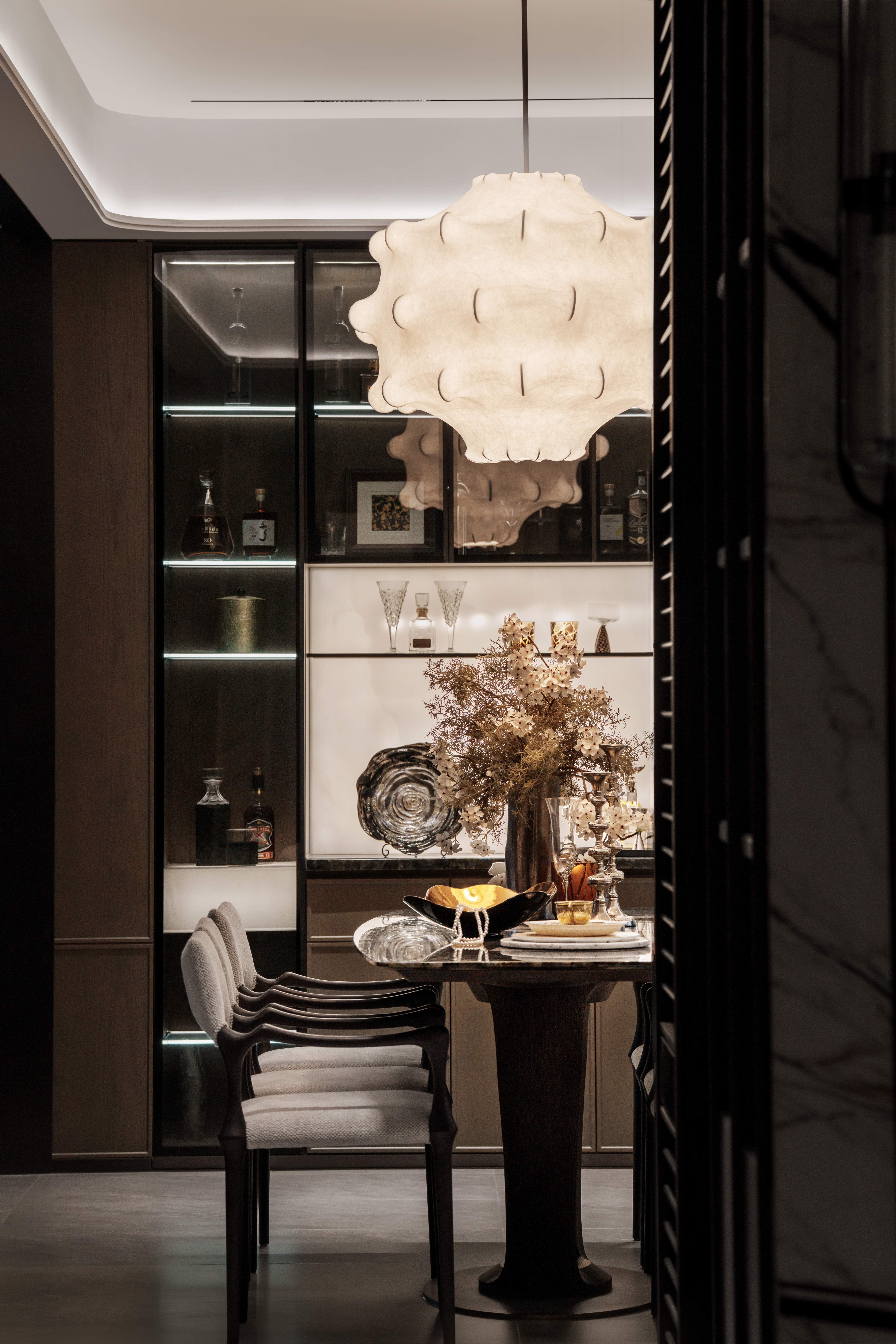 空间意境:整体采用低饱和中性基底(米白、浅灰、深棕),以墨黑大理石、香槟金软装作点睛,既保留空间的通透呼吸感,又通过材质对比强化高级质感。