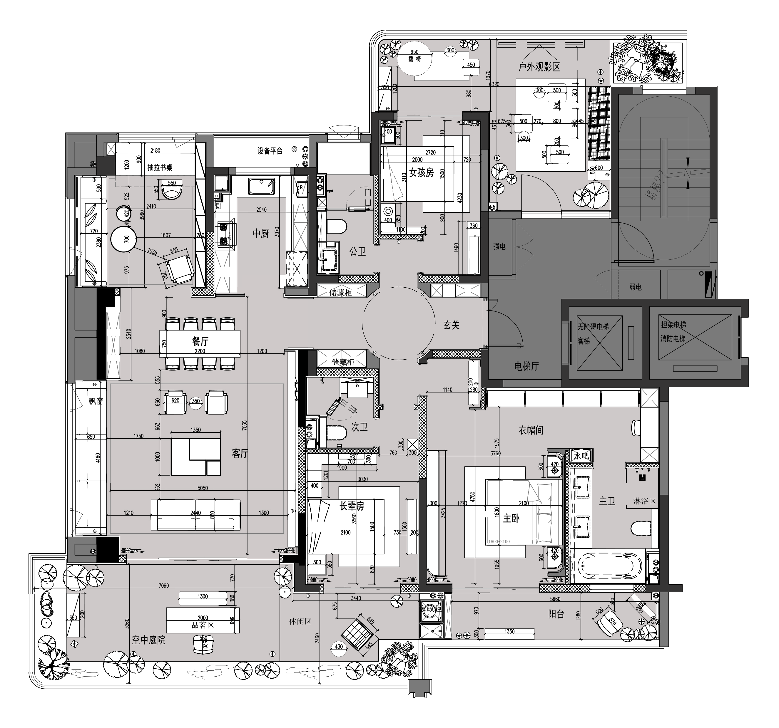 把“空中庭院+户外观影区+主卧阳台”串联成“室内外无界空间”,比如空中庭院可以做下午茶区,户外观影区能办小型聚会,业主反馈“像把公园搬进了家里”。