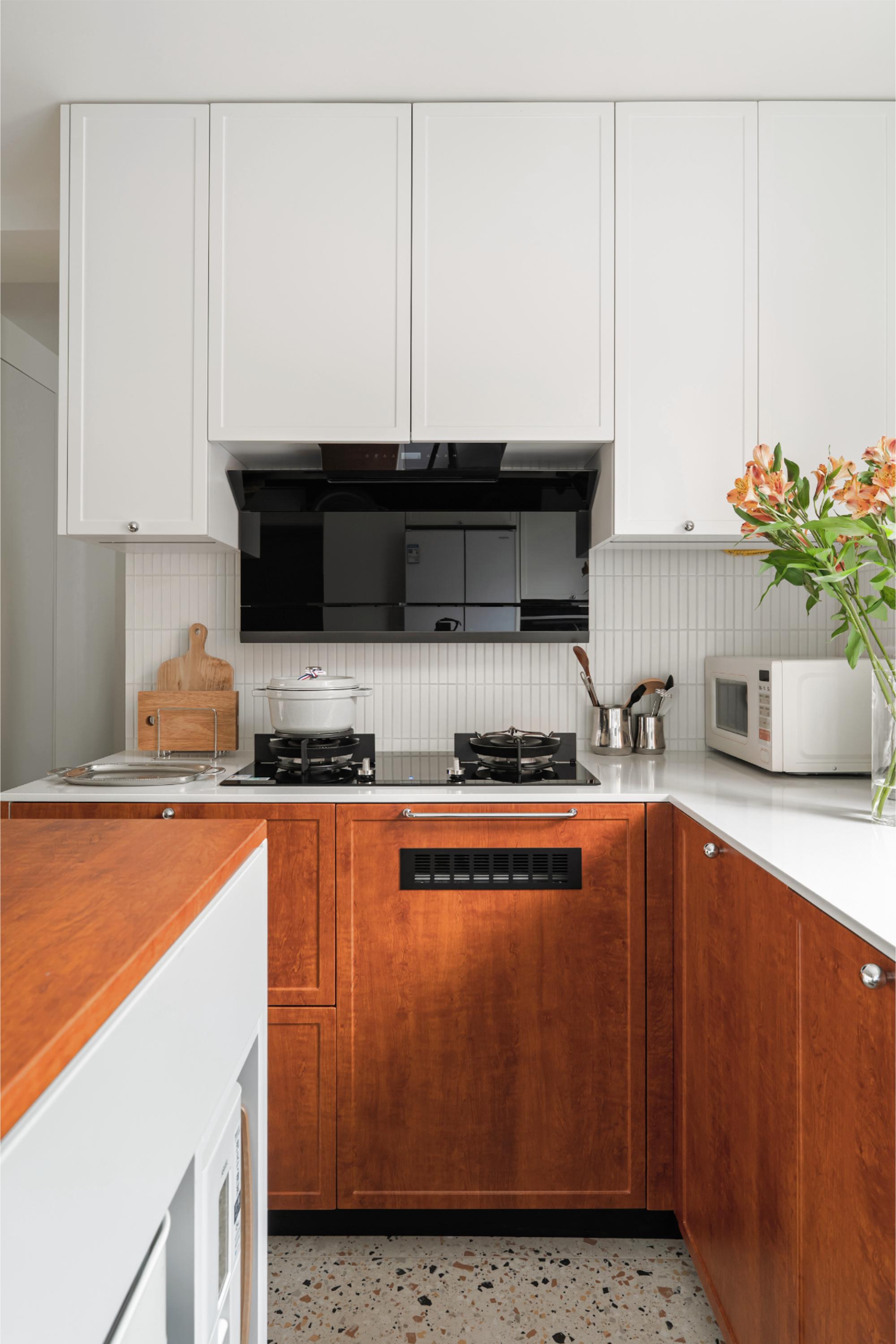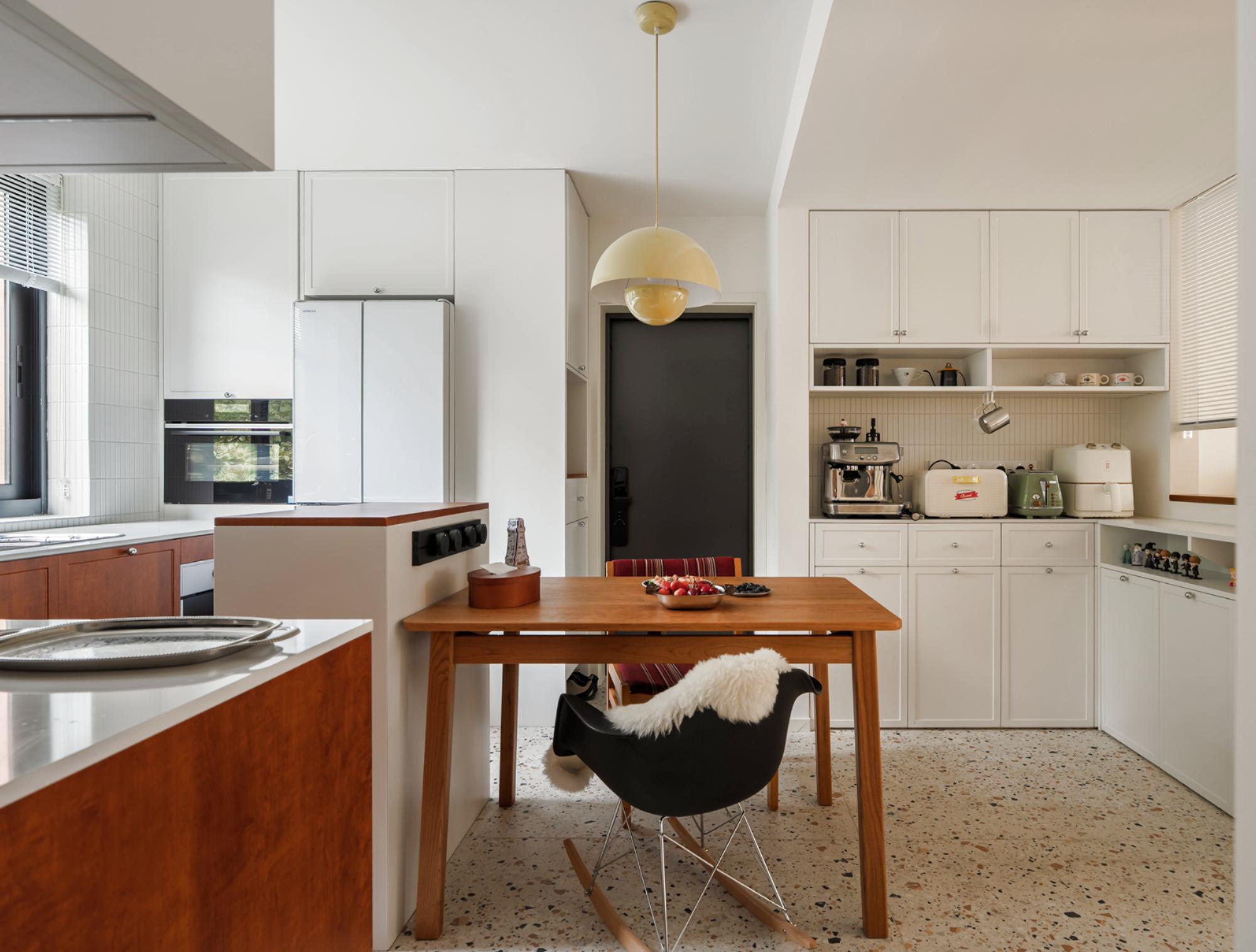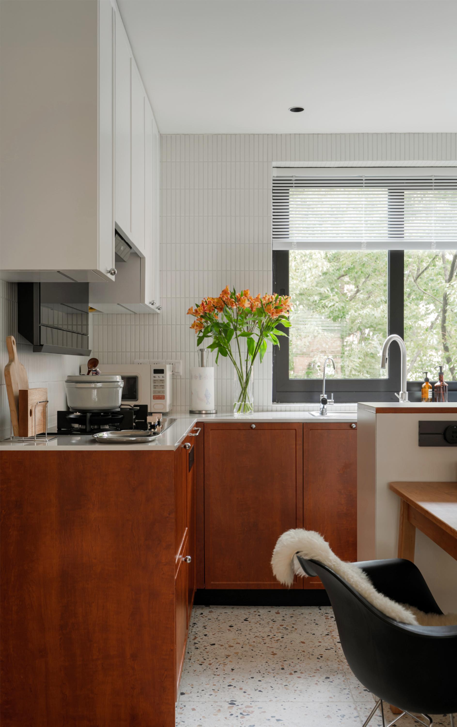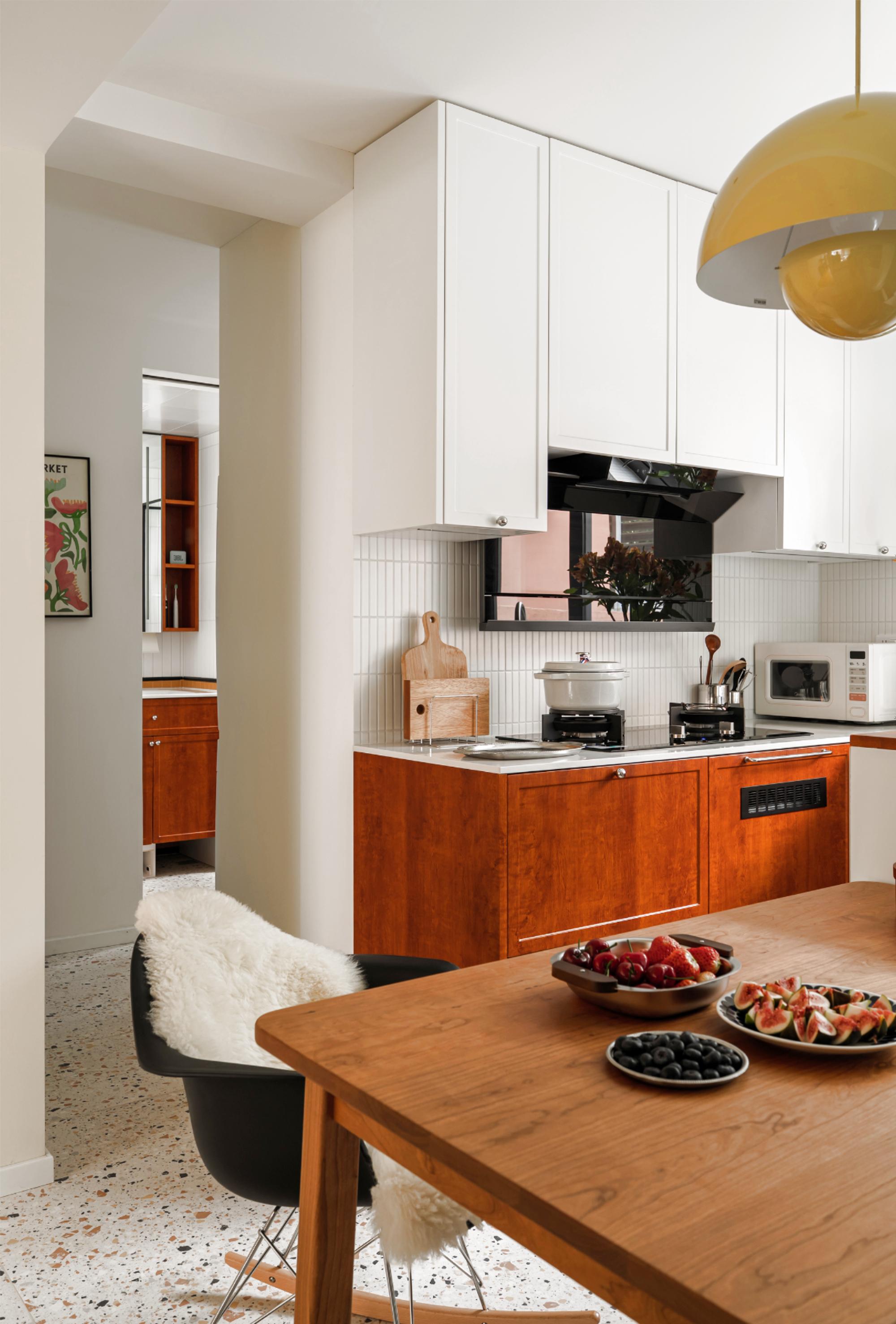 设计选材:在玄关柜开放格做严丝合缝的磁吸板,拓展冰箱贴使用场景;厨房采用胡桃木和白色搭配,白色吊柜构建视觉轻盈感,白色长条马赛克墙面呼应骨格线线条感,胡桃木下柜释放自然气息,地面水磨石地砖呼应中古氛围。