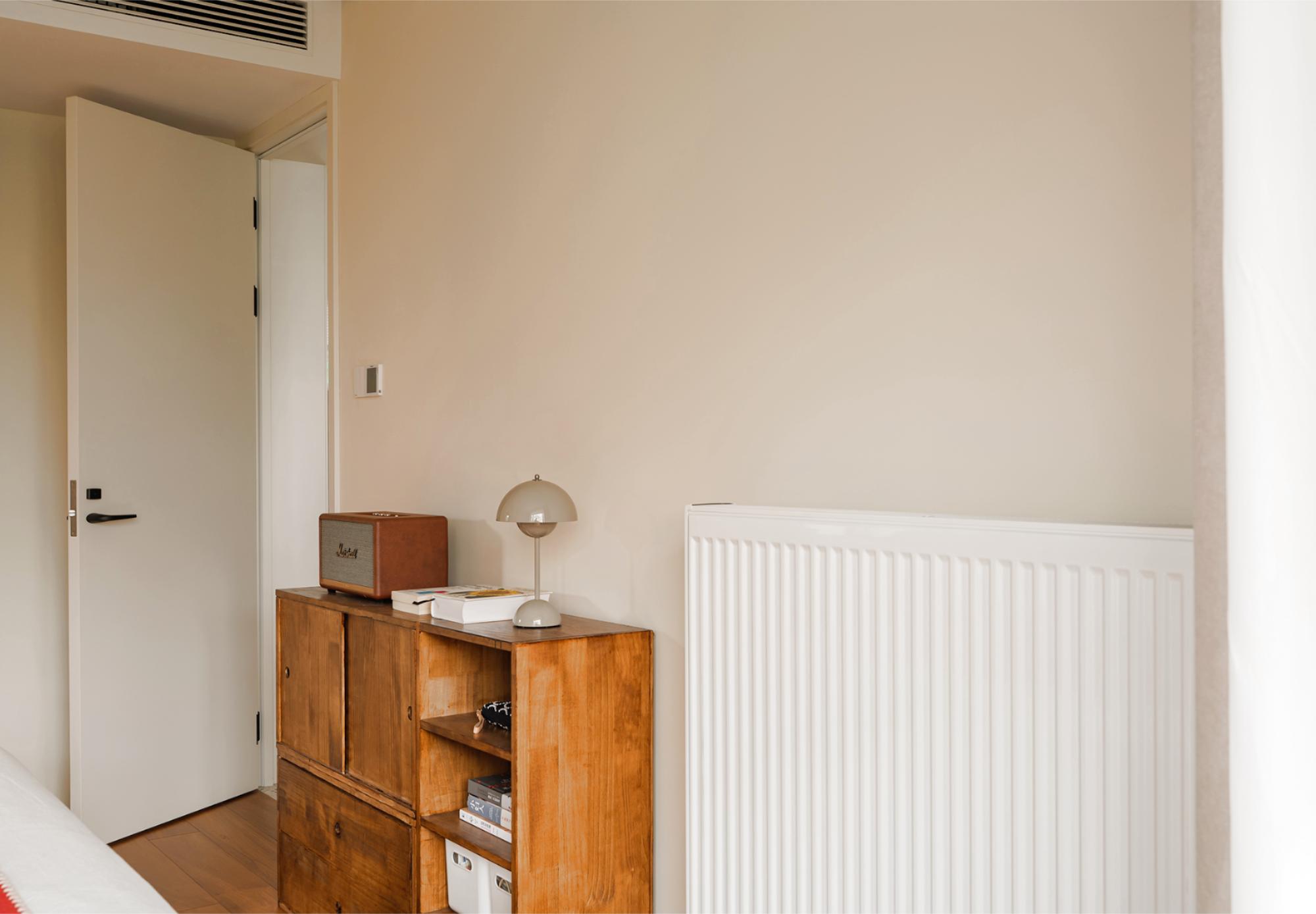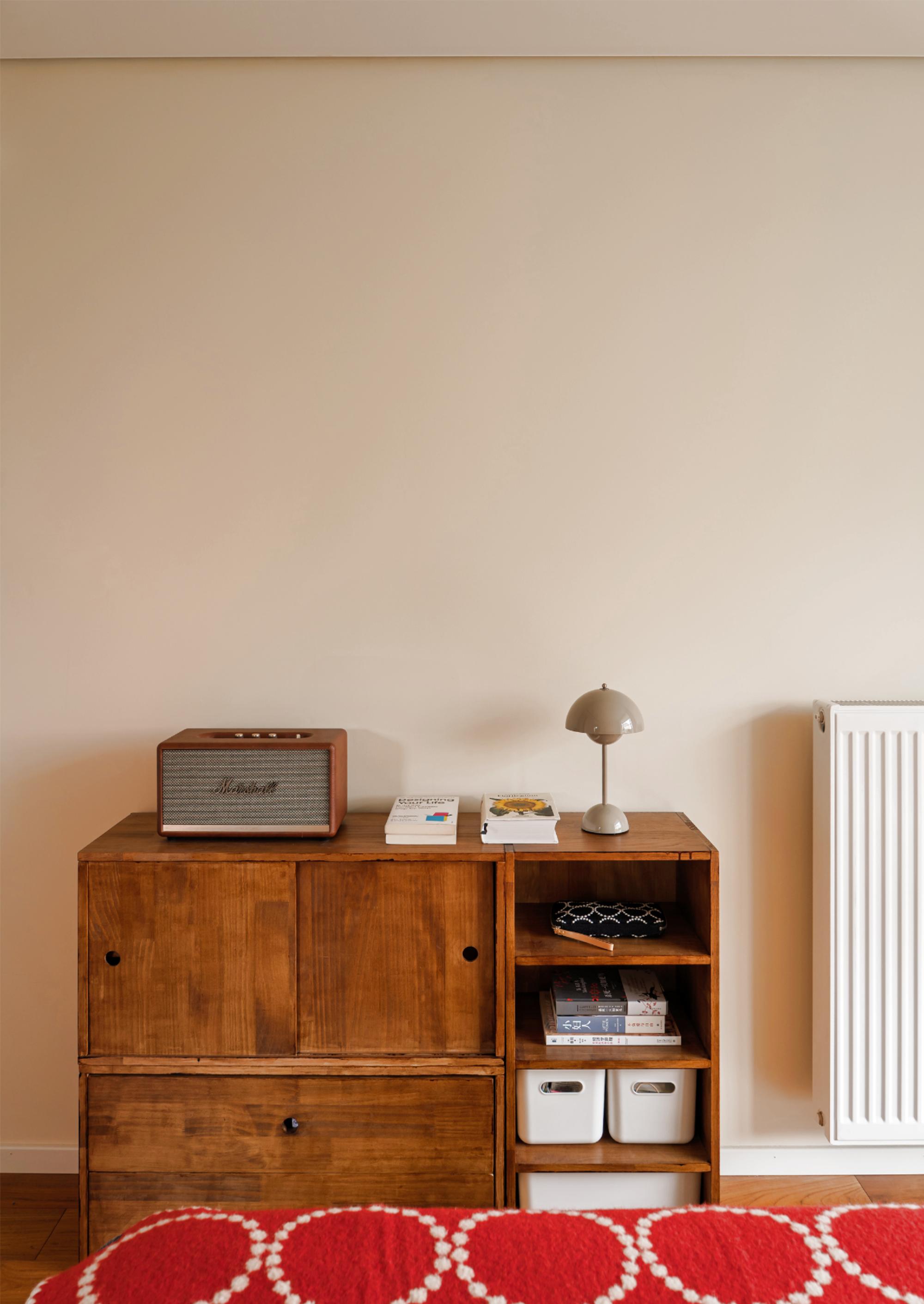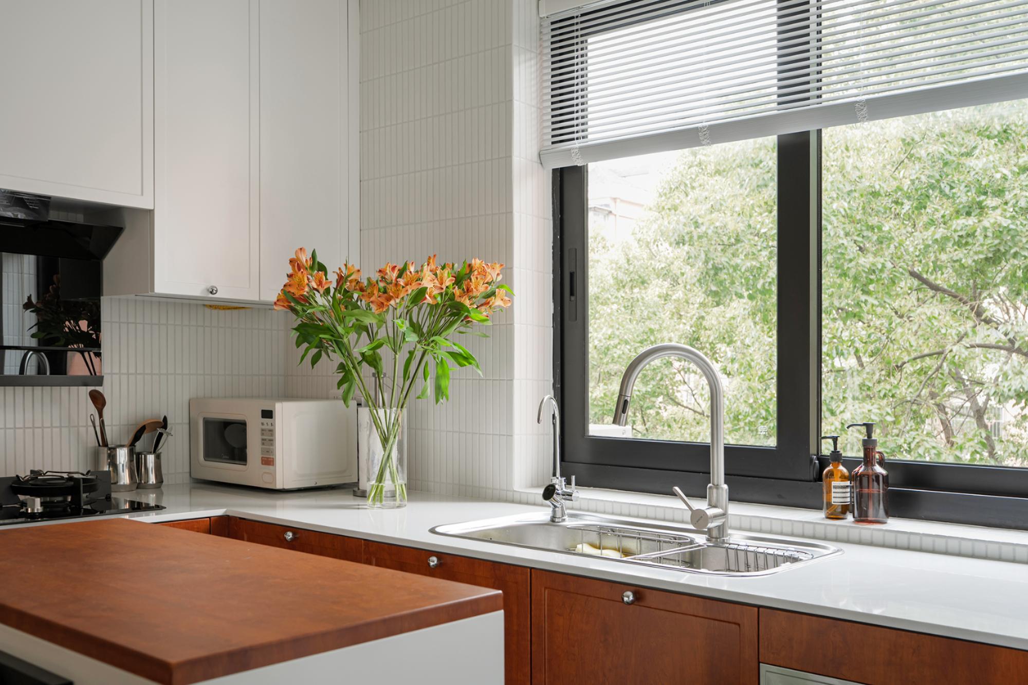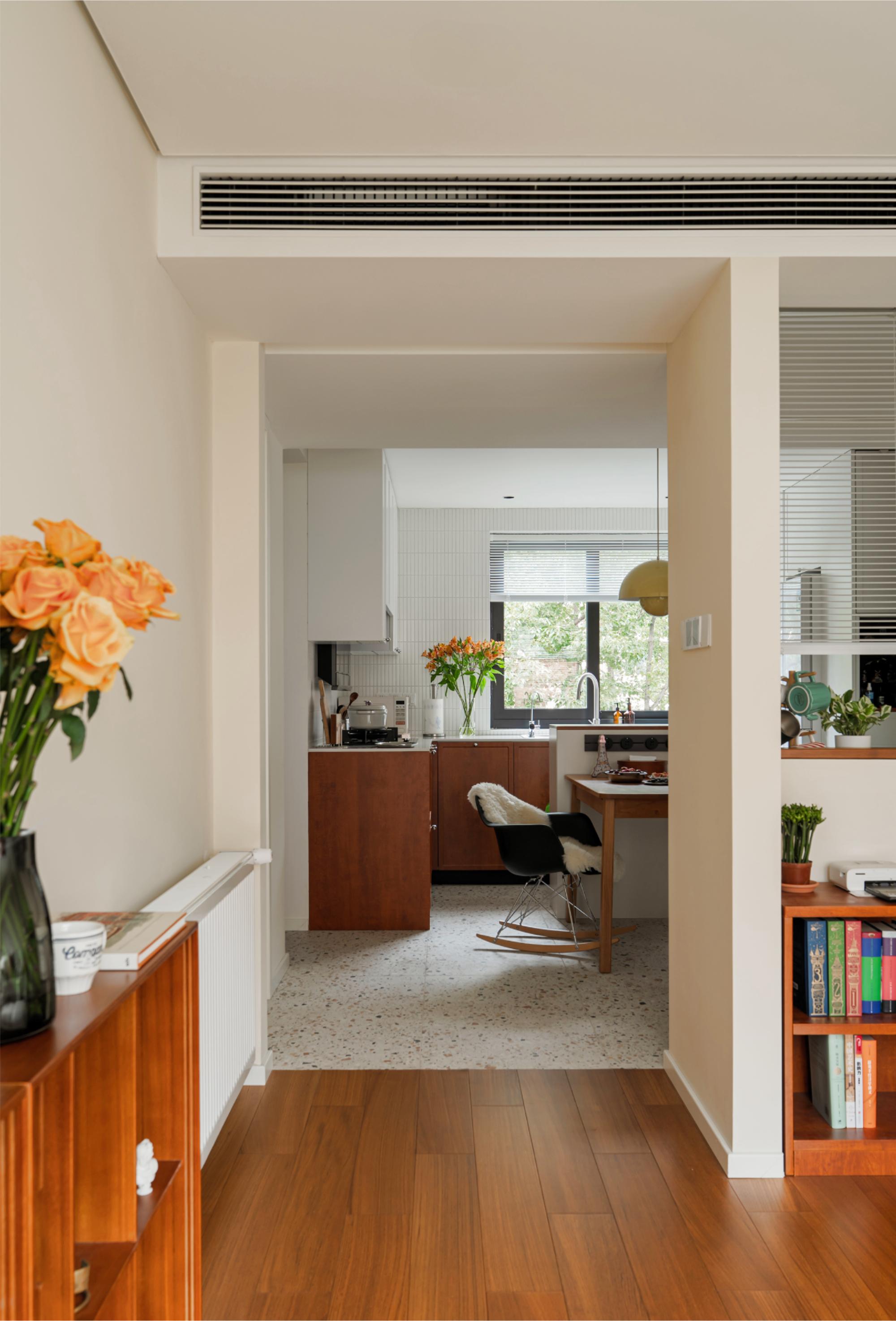 设计选材:在玄关柜开放格做严丝合缝的磁吸板,拓展冰箱贴使用场景;厨房采用胡桃木和白色搭配,白色吊柜构建视觉轻盈感,白色长条马赛克墙面呼应骨格线线条感,胡桃木下柜释放自然气息,地面水磨石地砖呼应中古氛围。