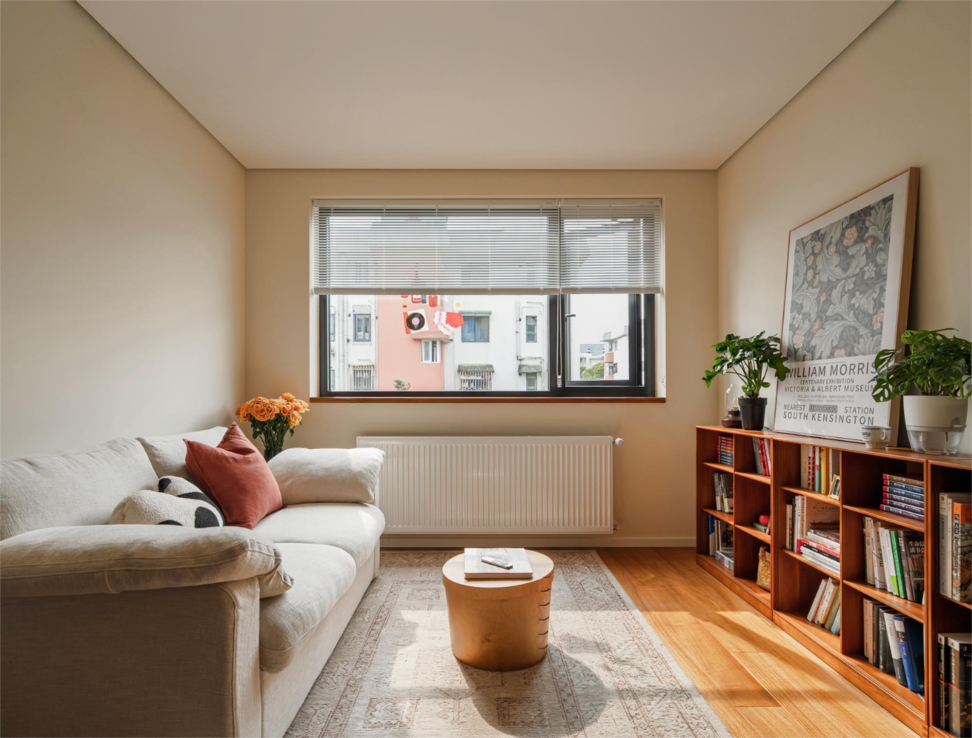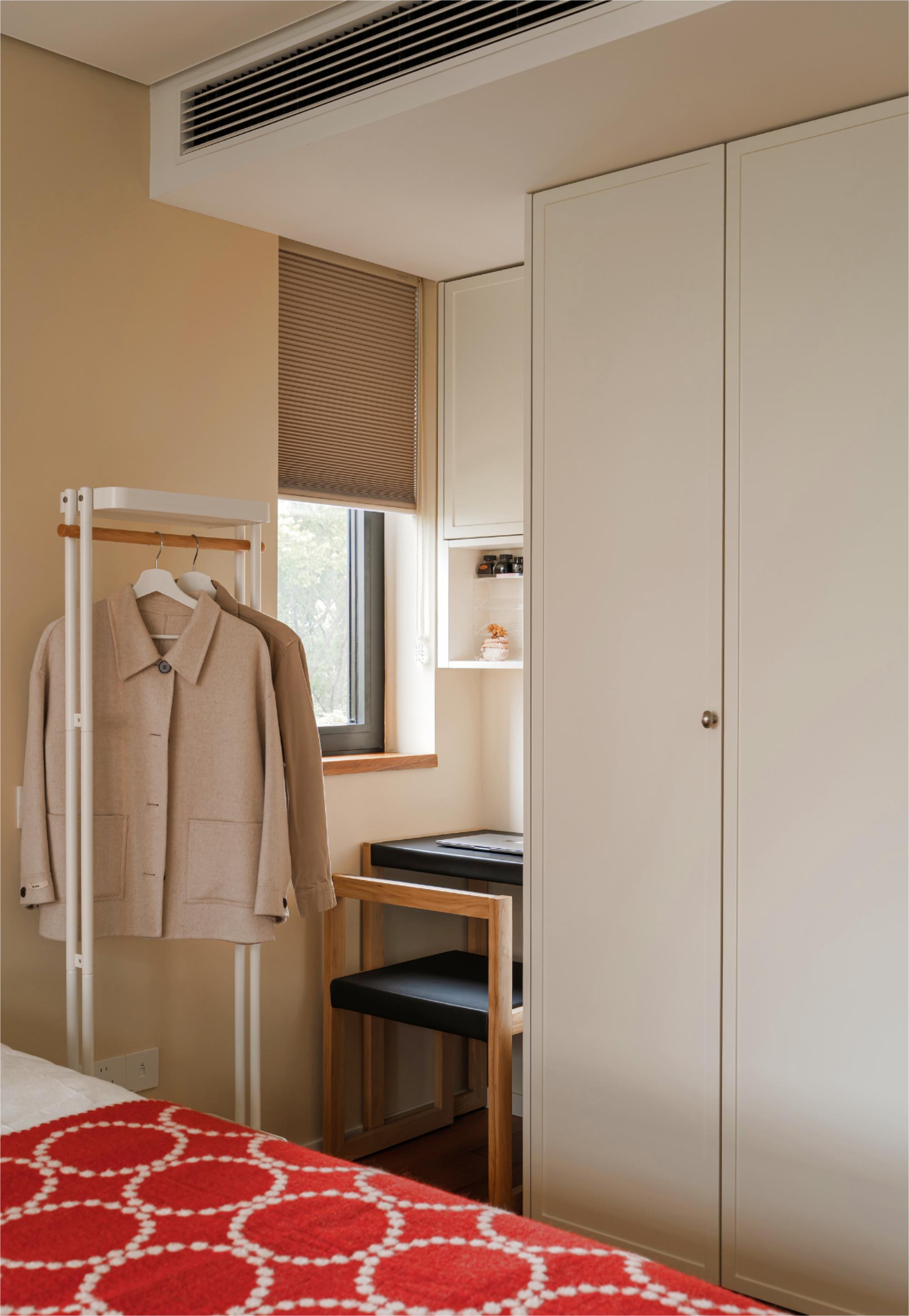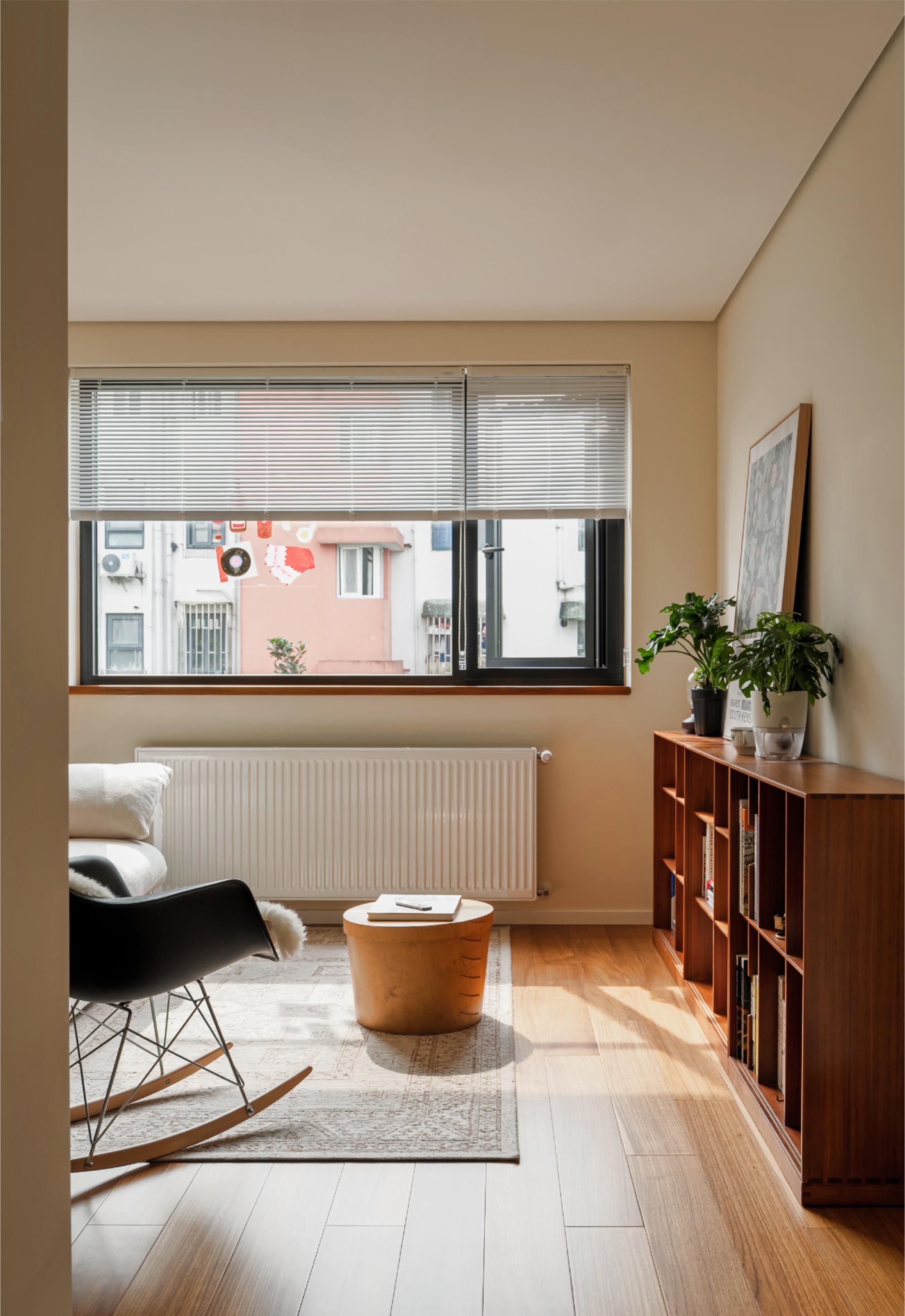 空间布局:客厅突破传统会客功能,成为多功能弹性空间,沙发床可转换卧室模式,拉下卷帘保证隐私,满足父母偶尔小住需求。