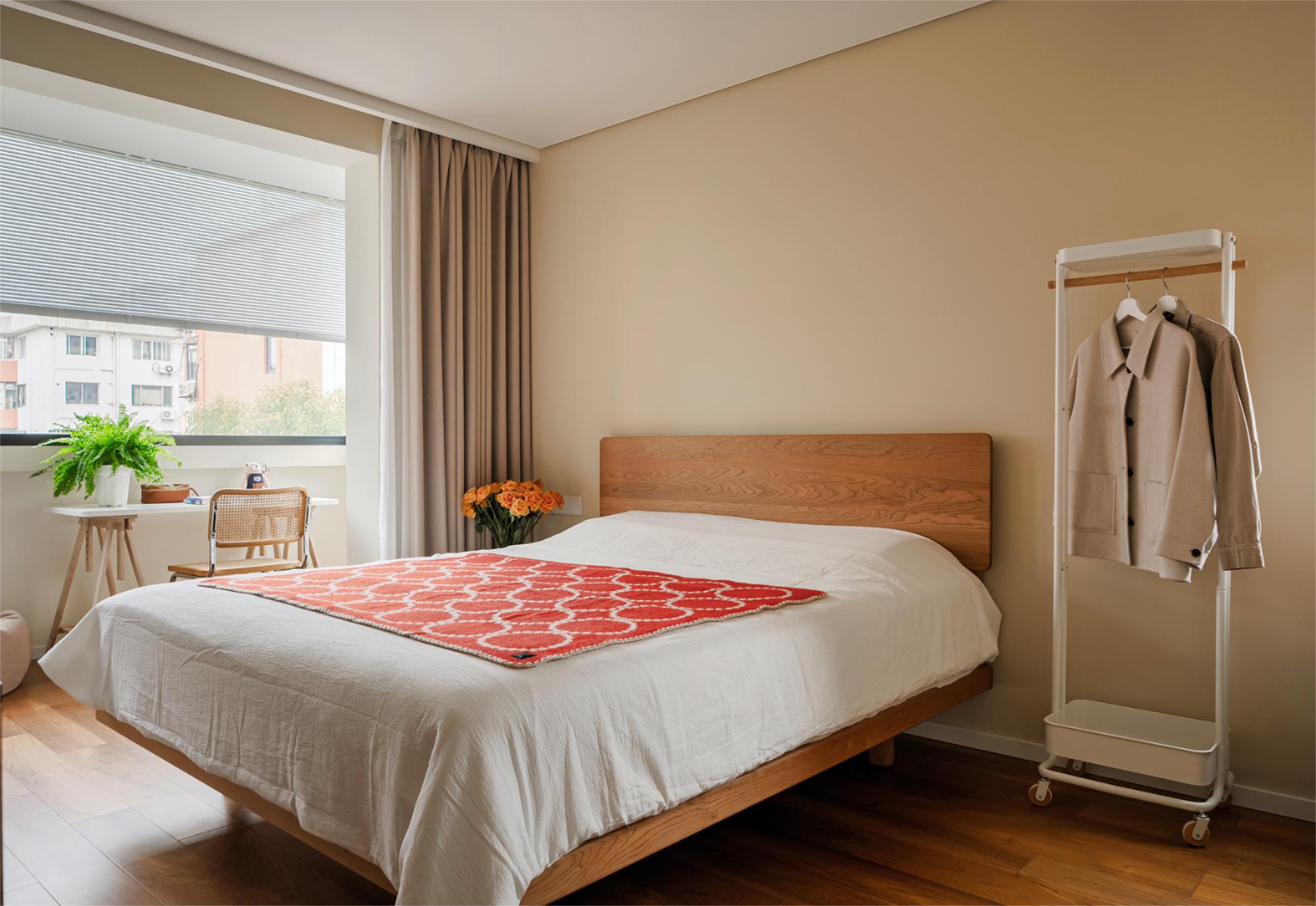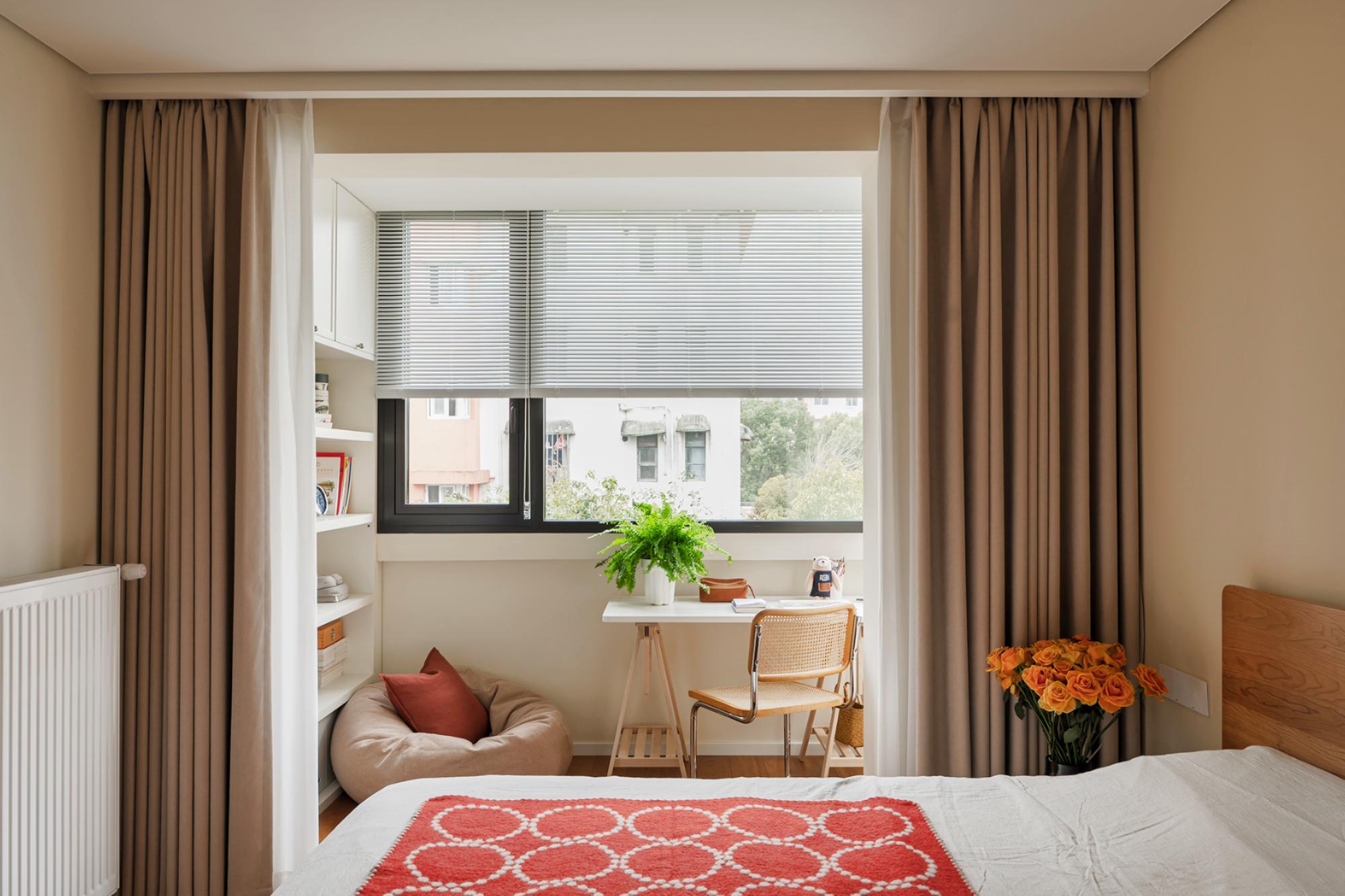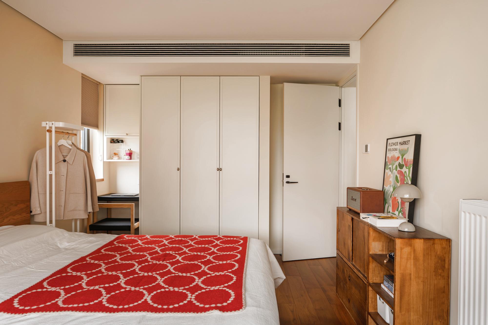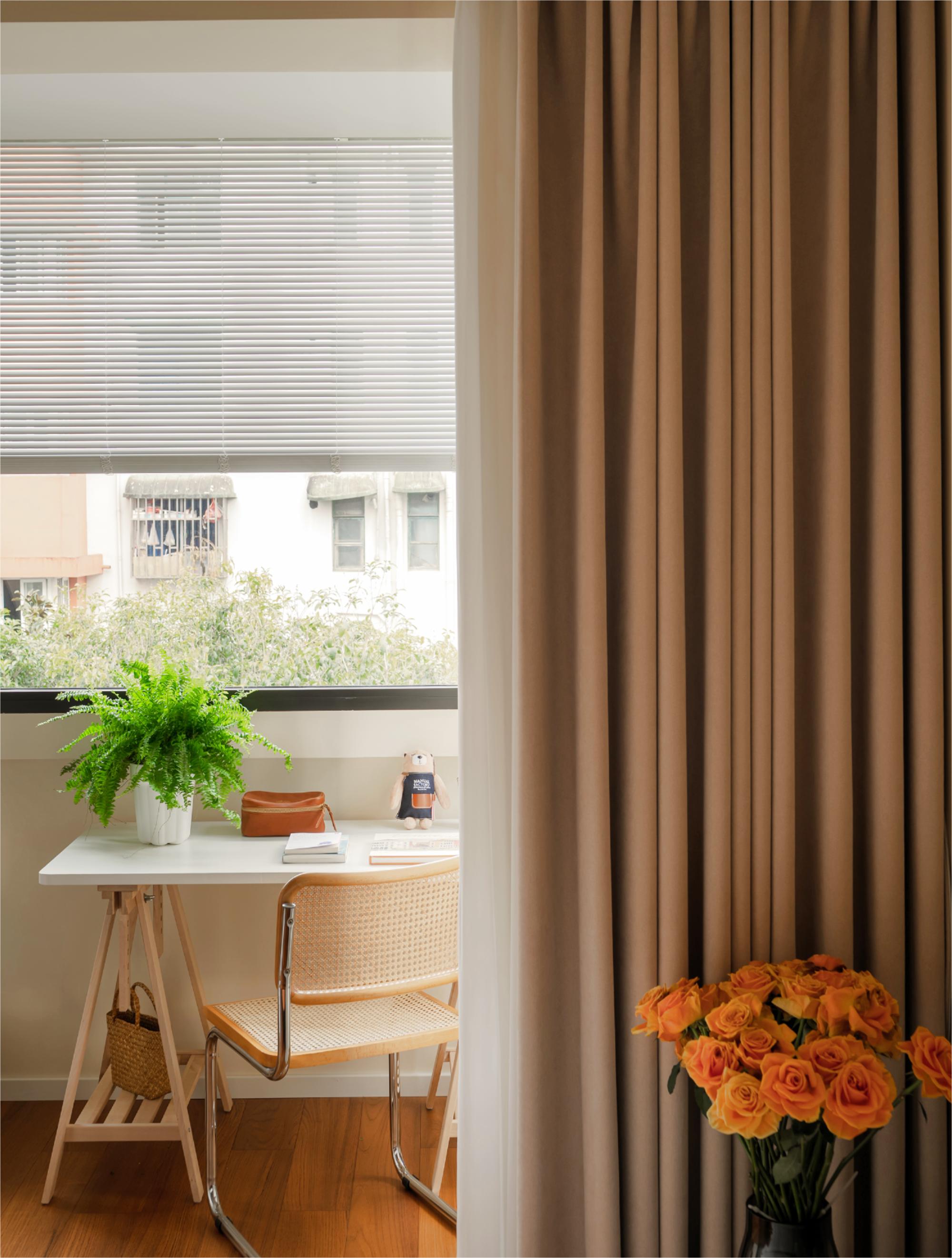 空间布局:客厅突破传统会客功能,成为多功能弹性空间,沙发床可转换卧室模式,拉下卷帘保证隐私,满足父母偶尔小住需求。