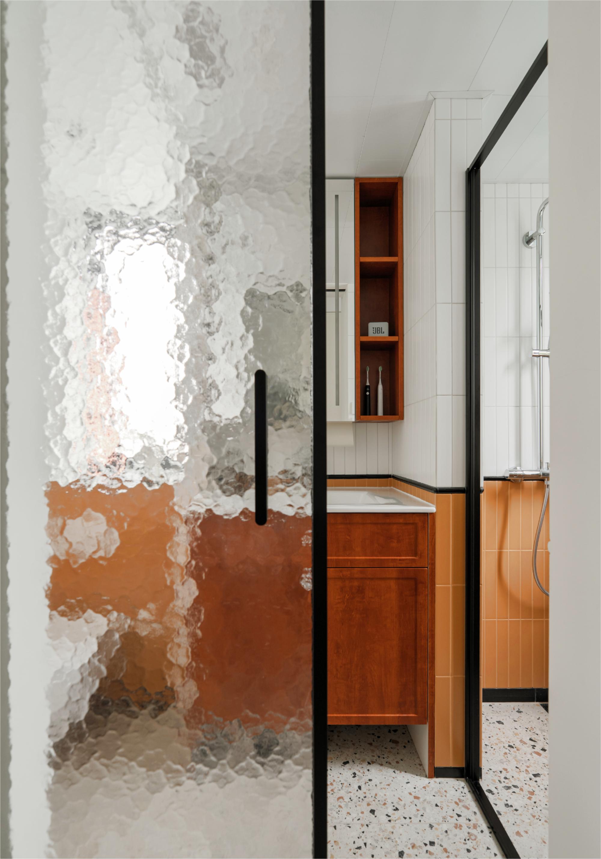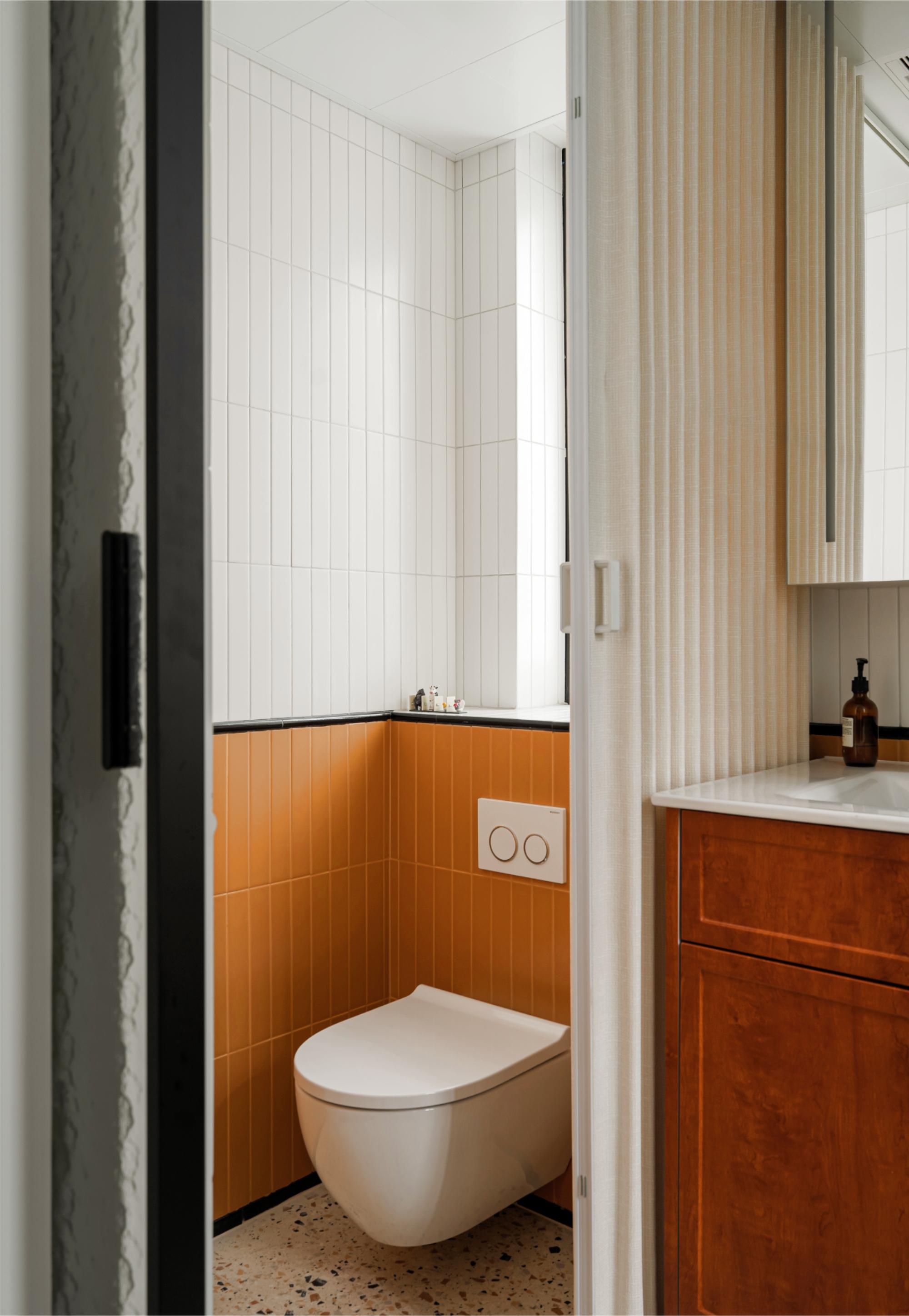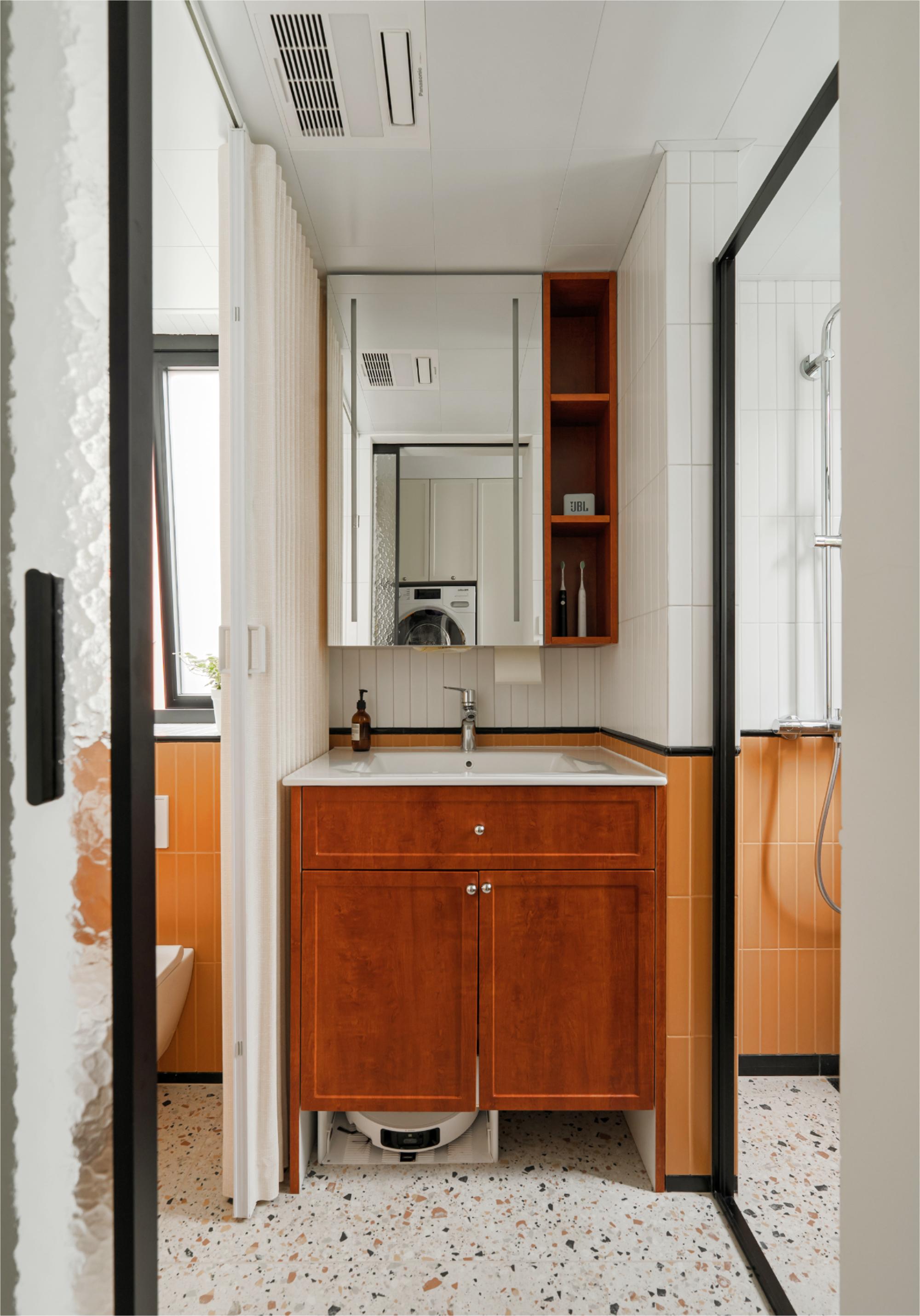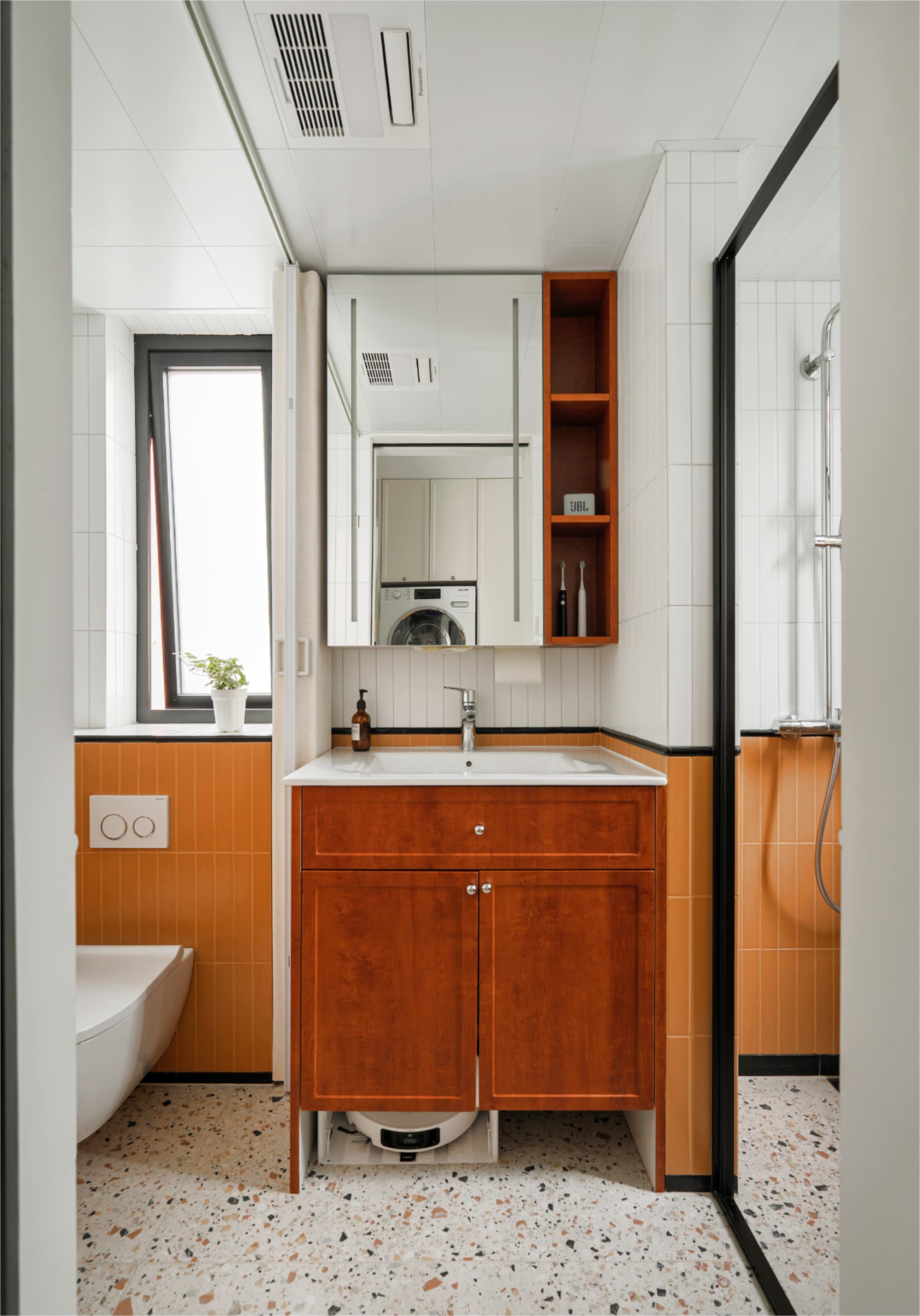 卫生间采用活泼俏皮的蜂蜜色多巴胺配色,定制小砖颜色与洗衣区成品漆色彩衔接,营造和谐温馨整体感,为空间注入温暖生机。