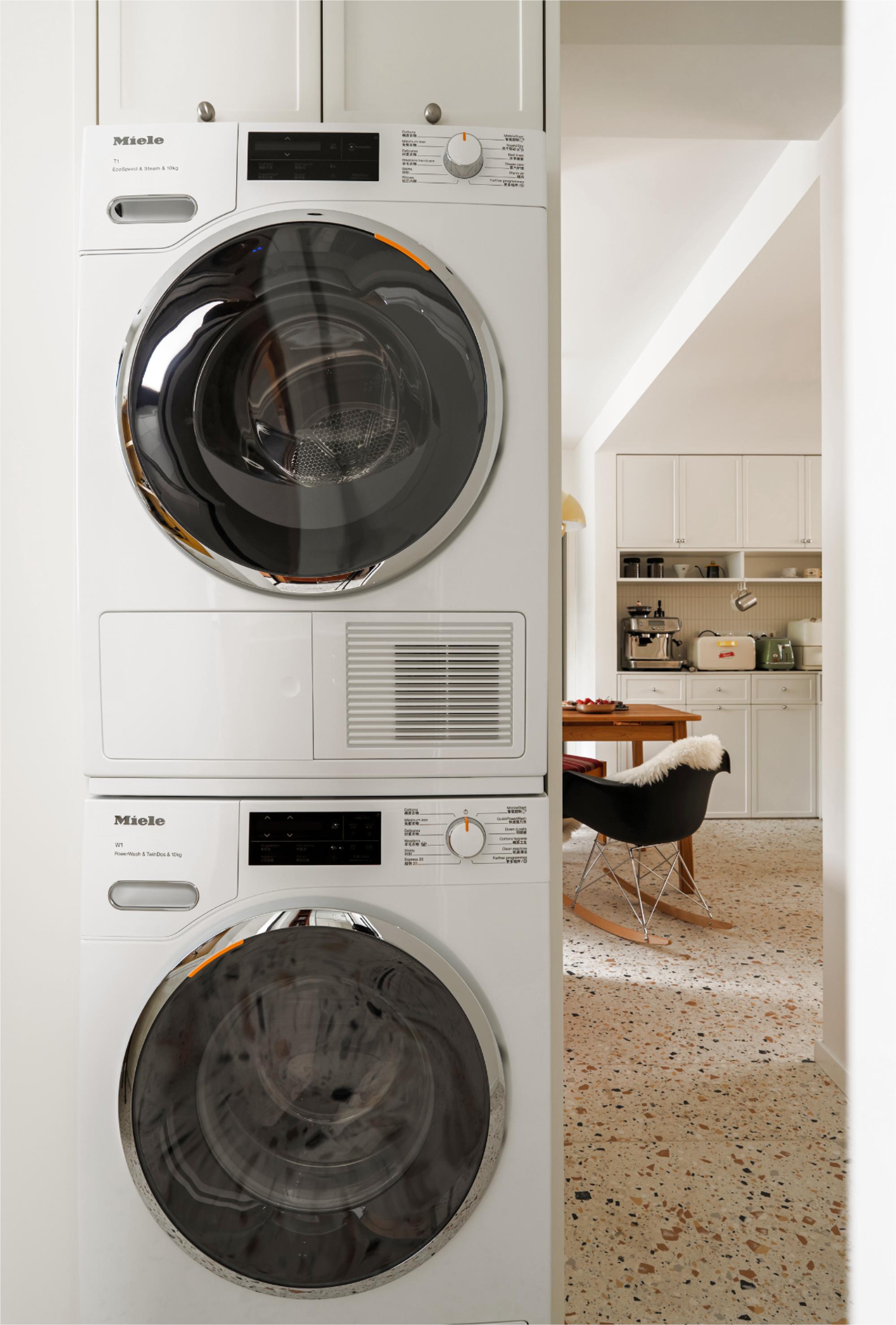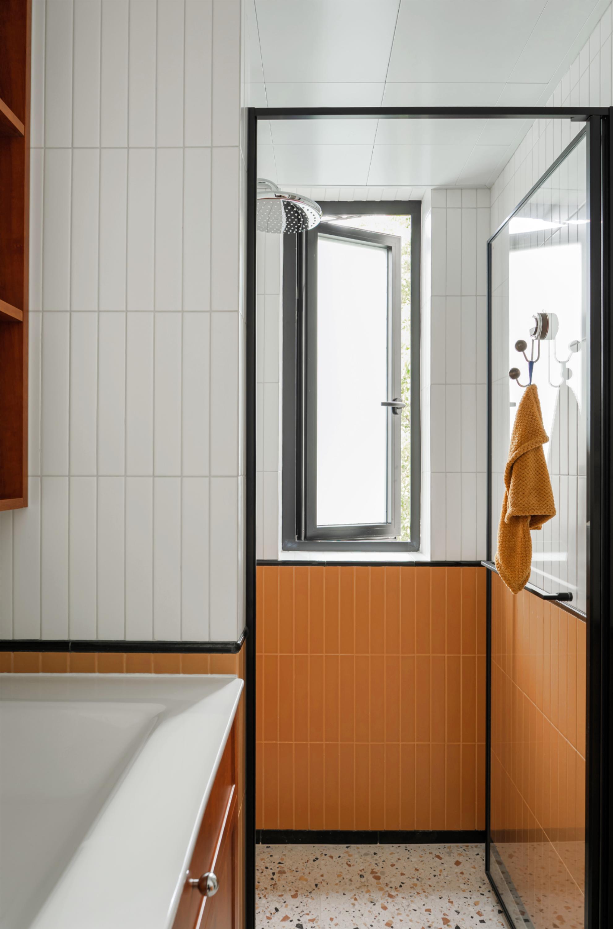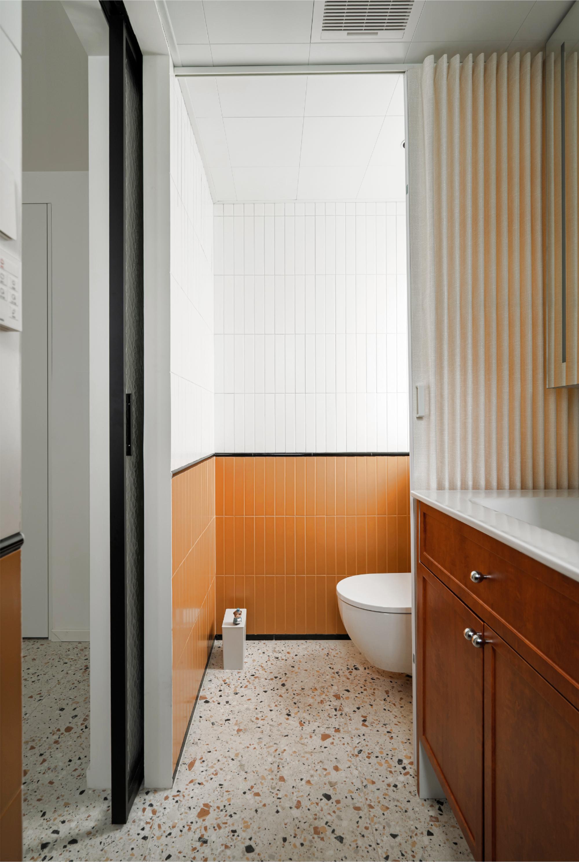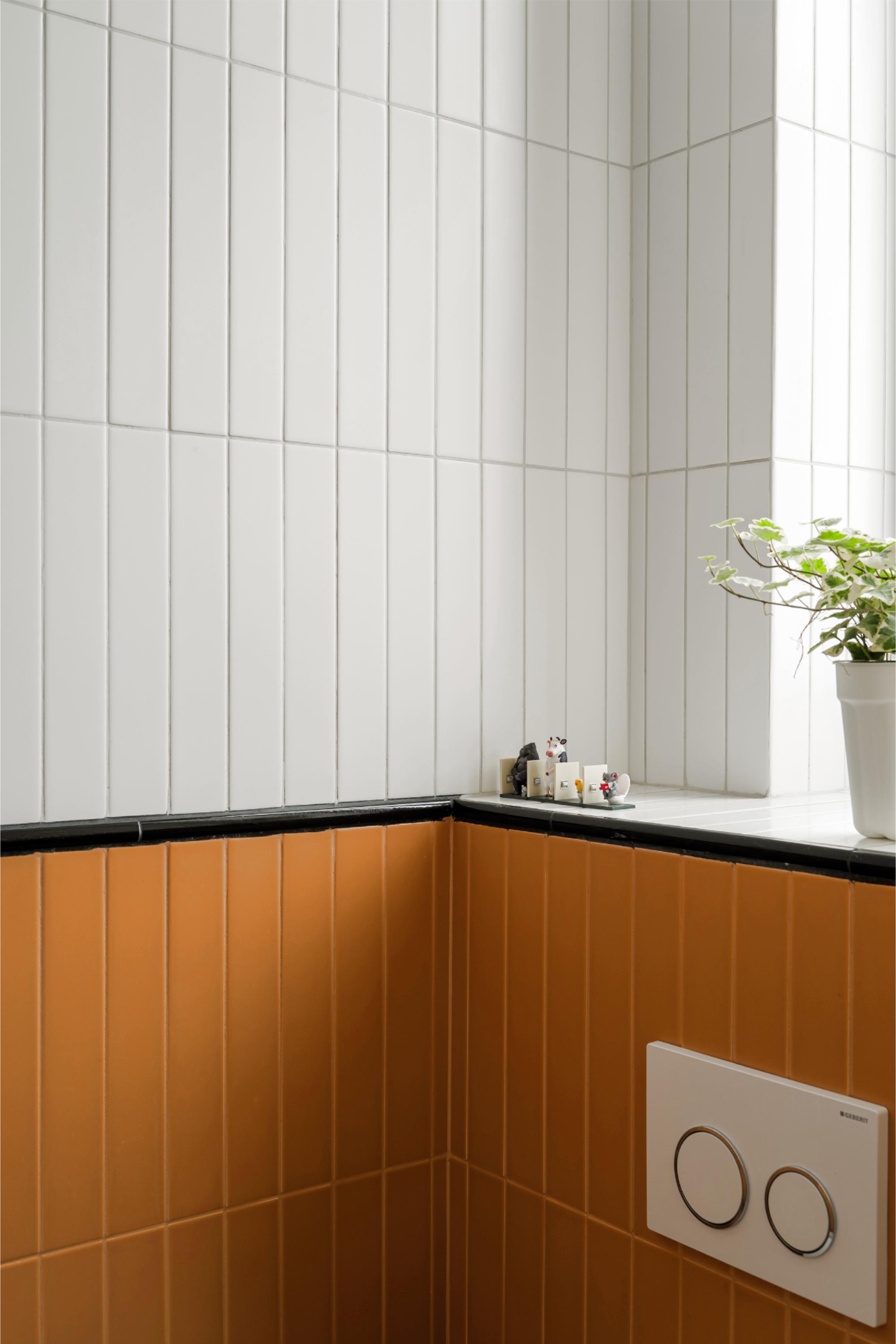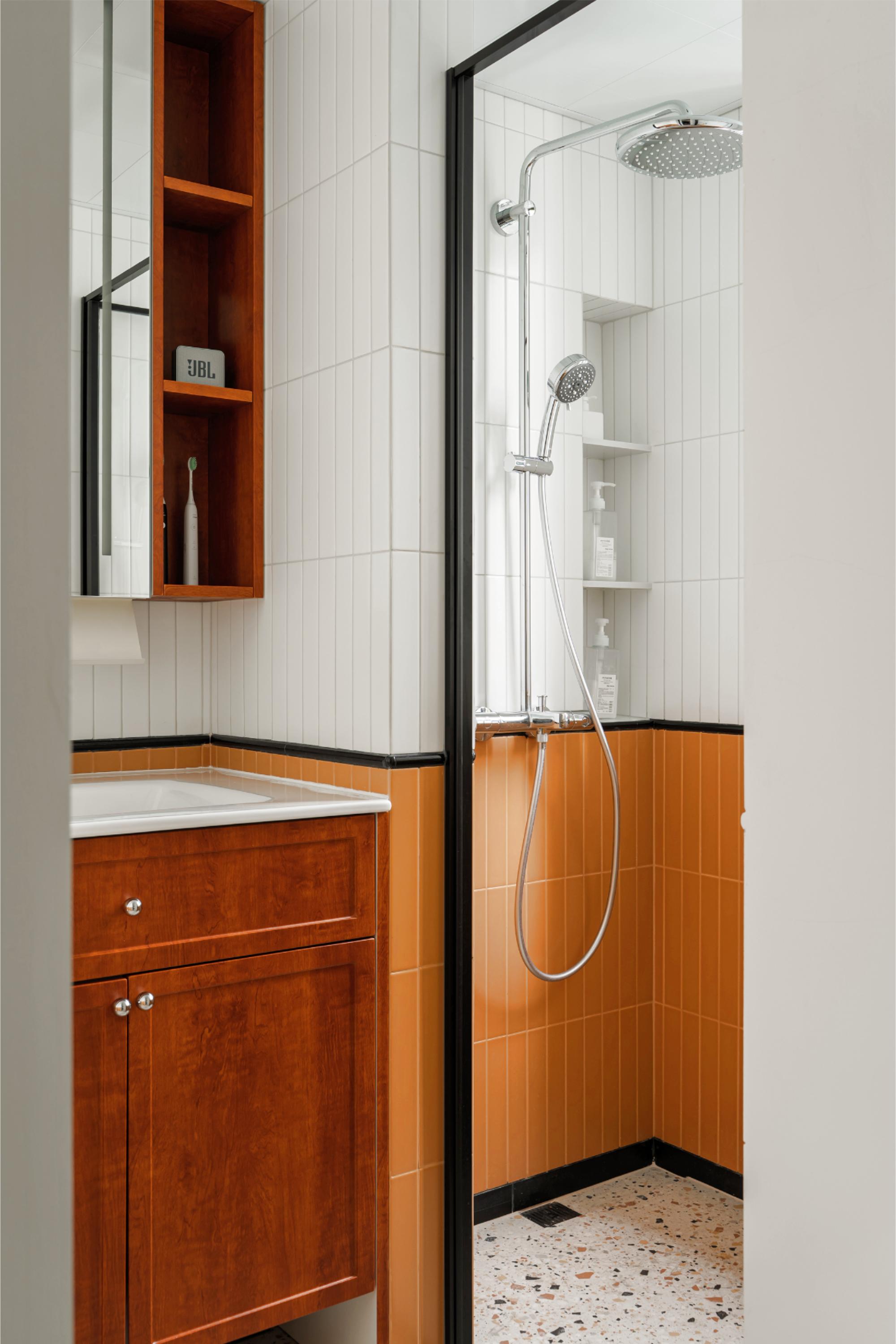 卫生间采用活泼俏皮的蜂蜜色多巴胺配色,定制小砖颜色与洗衣区成品漆色彩衔接,营造和谐温馨整体感,为空间注入温暖生机。