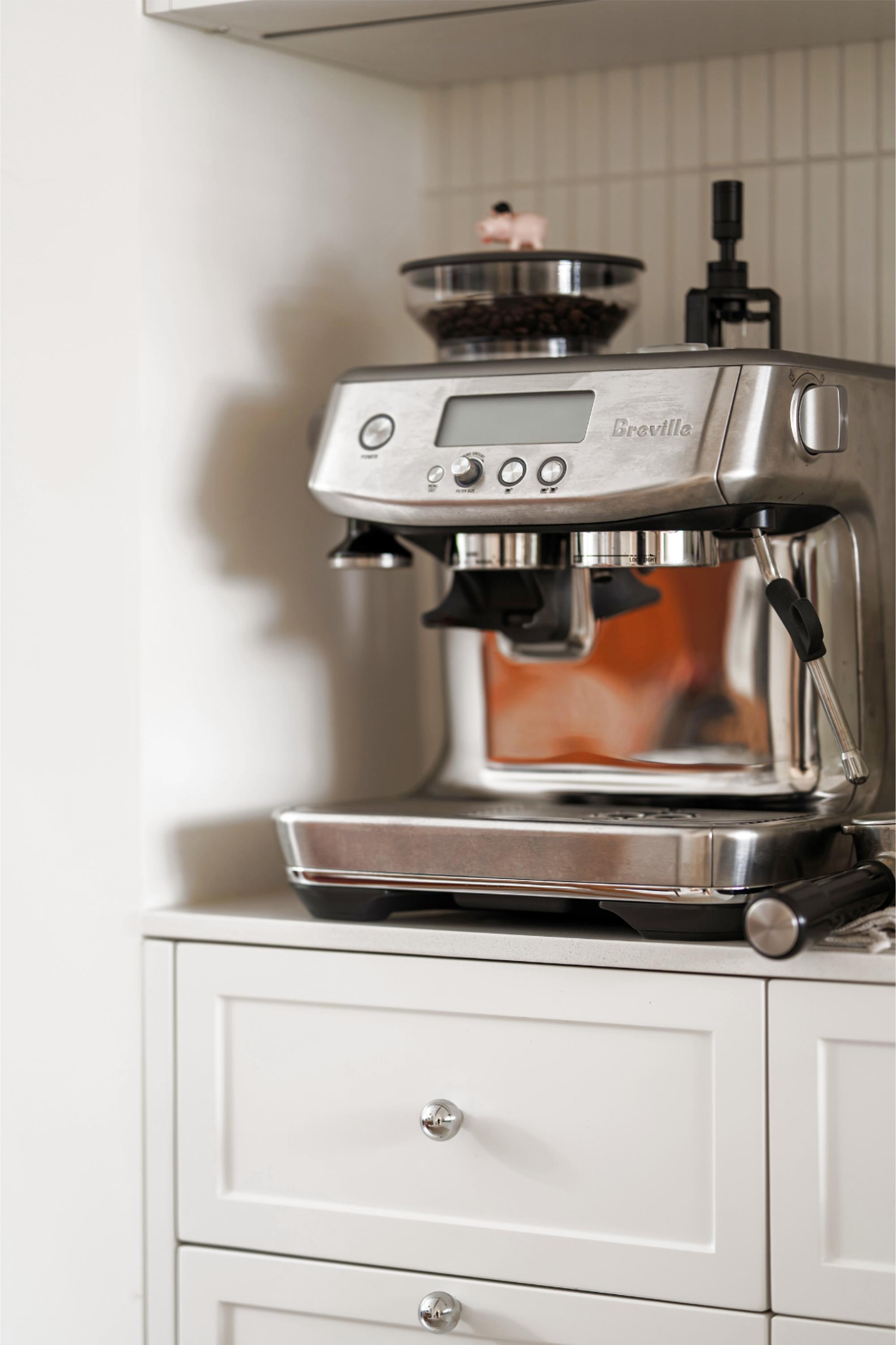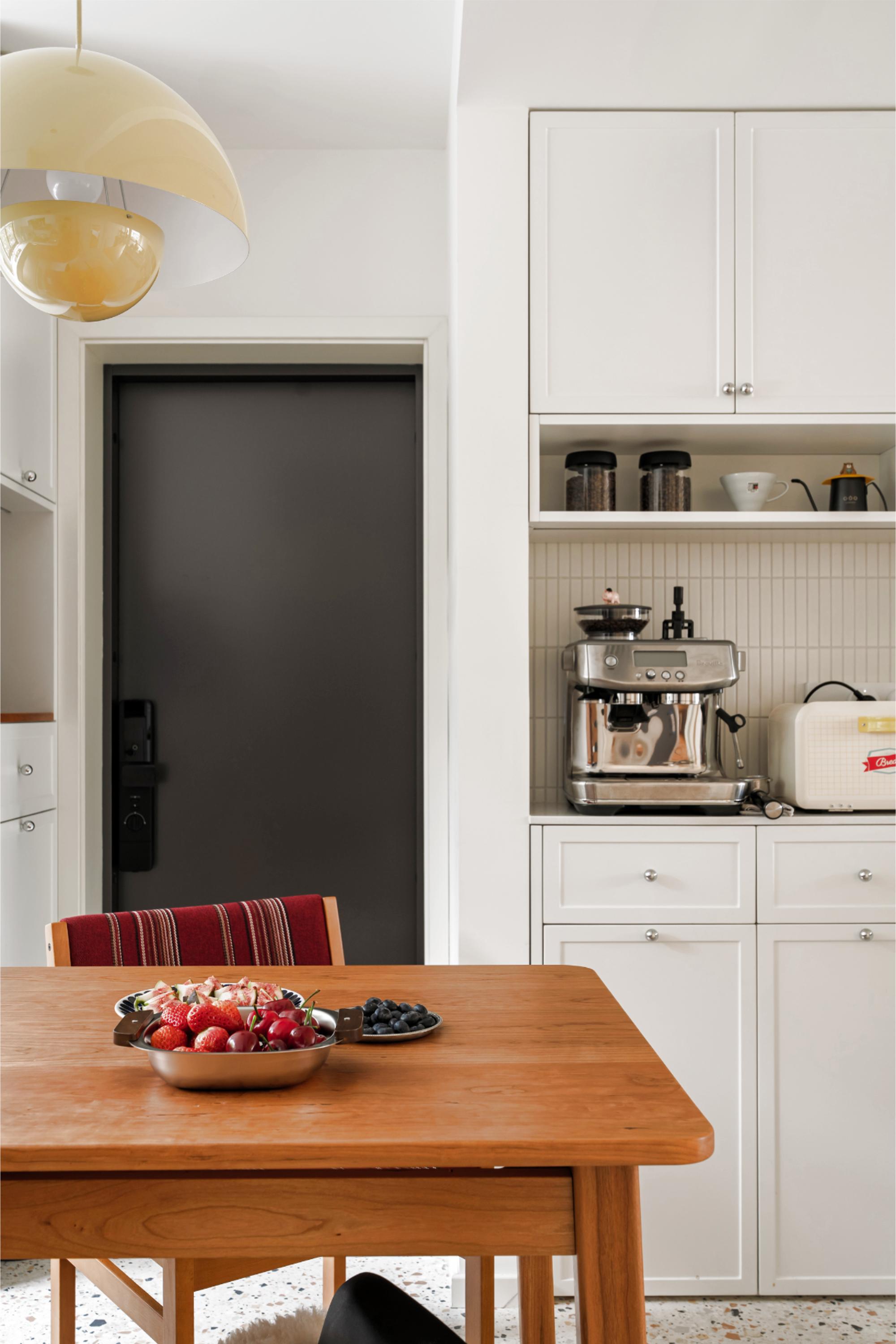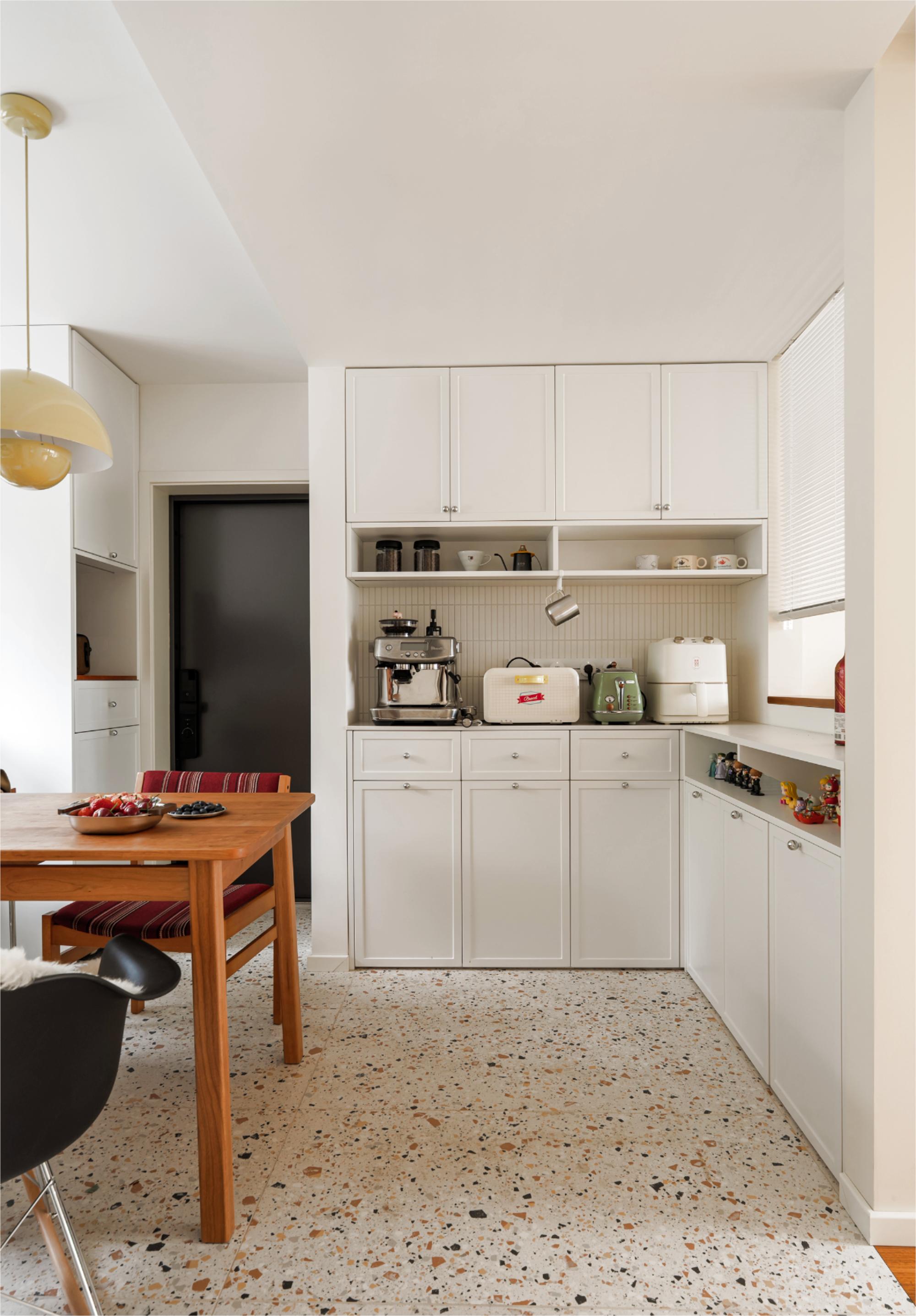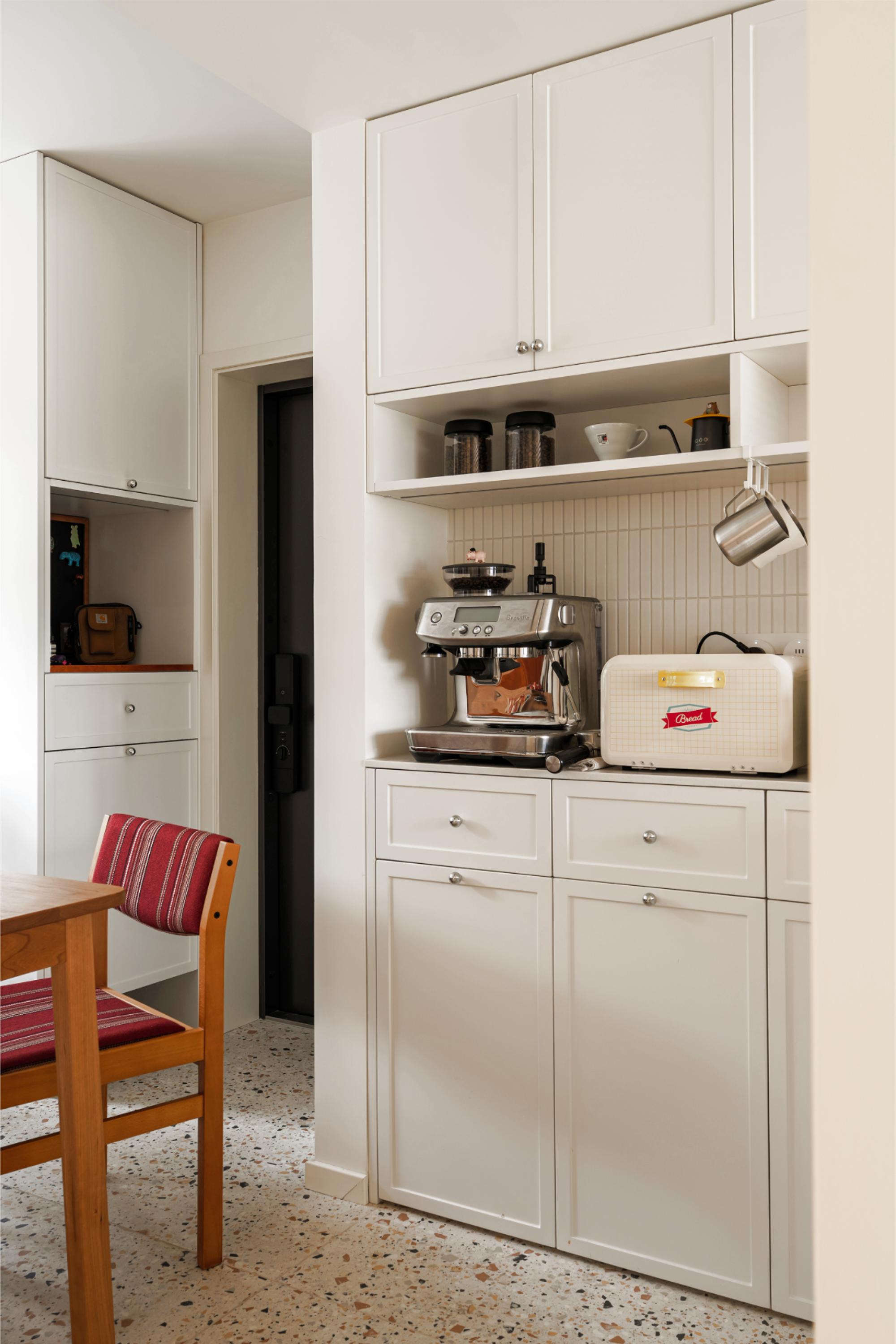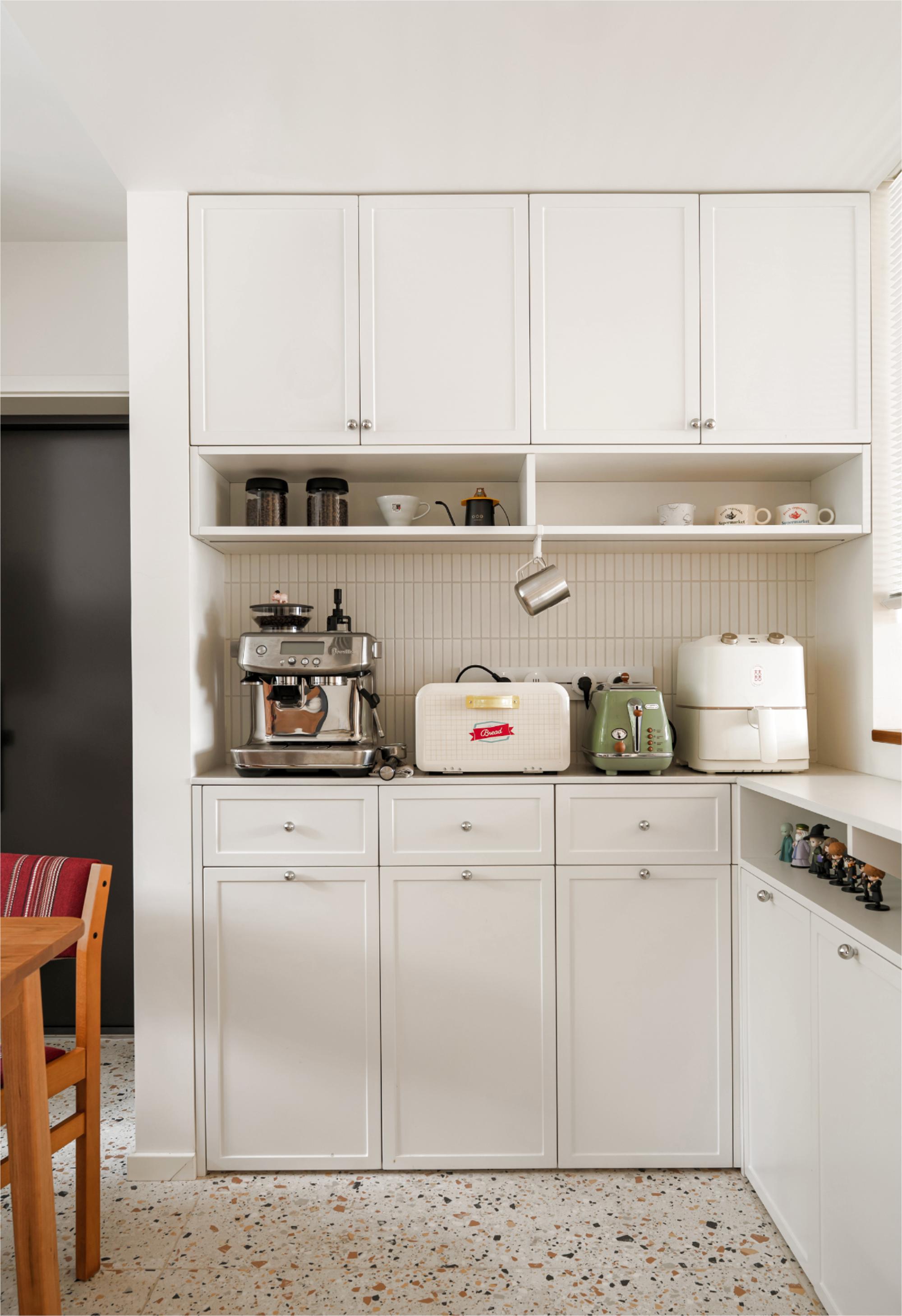 进门右侧将客厅墙内收,专门留出咖啡角区域,放置咖啡机、面包机、空气炸锅等小家电及收藏杯子和器物,方便早餐快速解决。