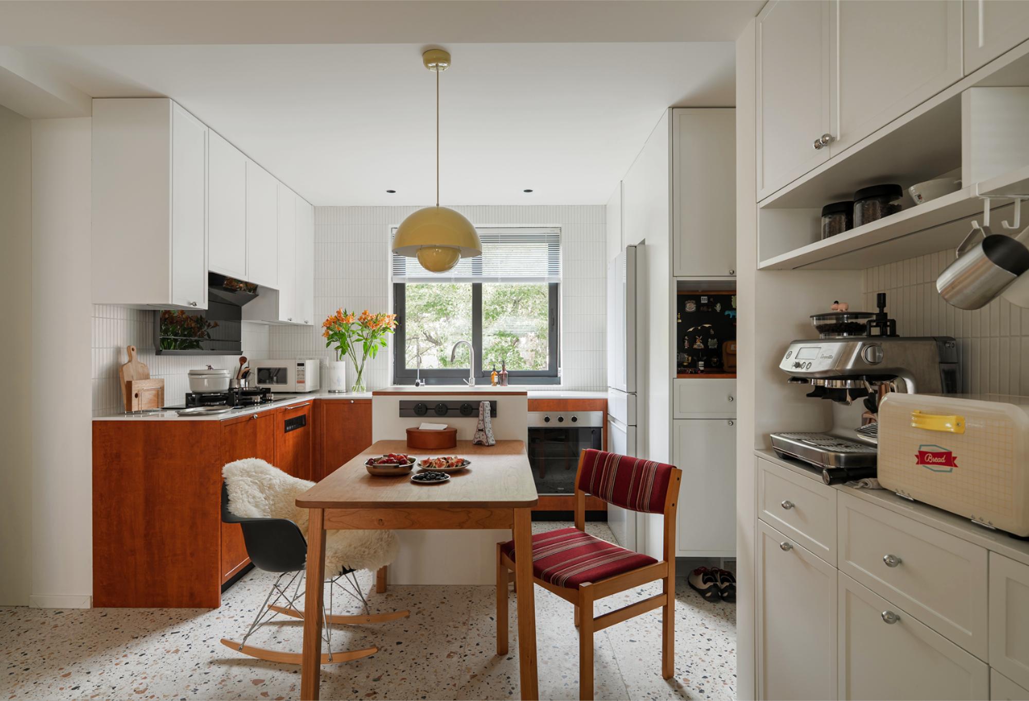 空间意境:餐厨空间打造活泼年轻的“中古厨房”,木色骨格线橱柜、小火柴水磨石地砖、Tradition 花苞灯等元素搭配,既有中古氛围又具活泼时尚感。