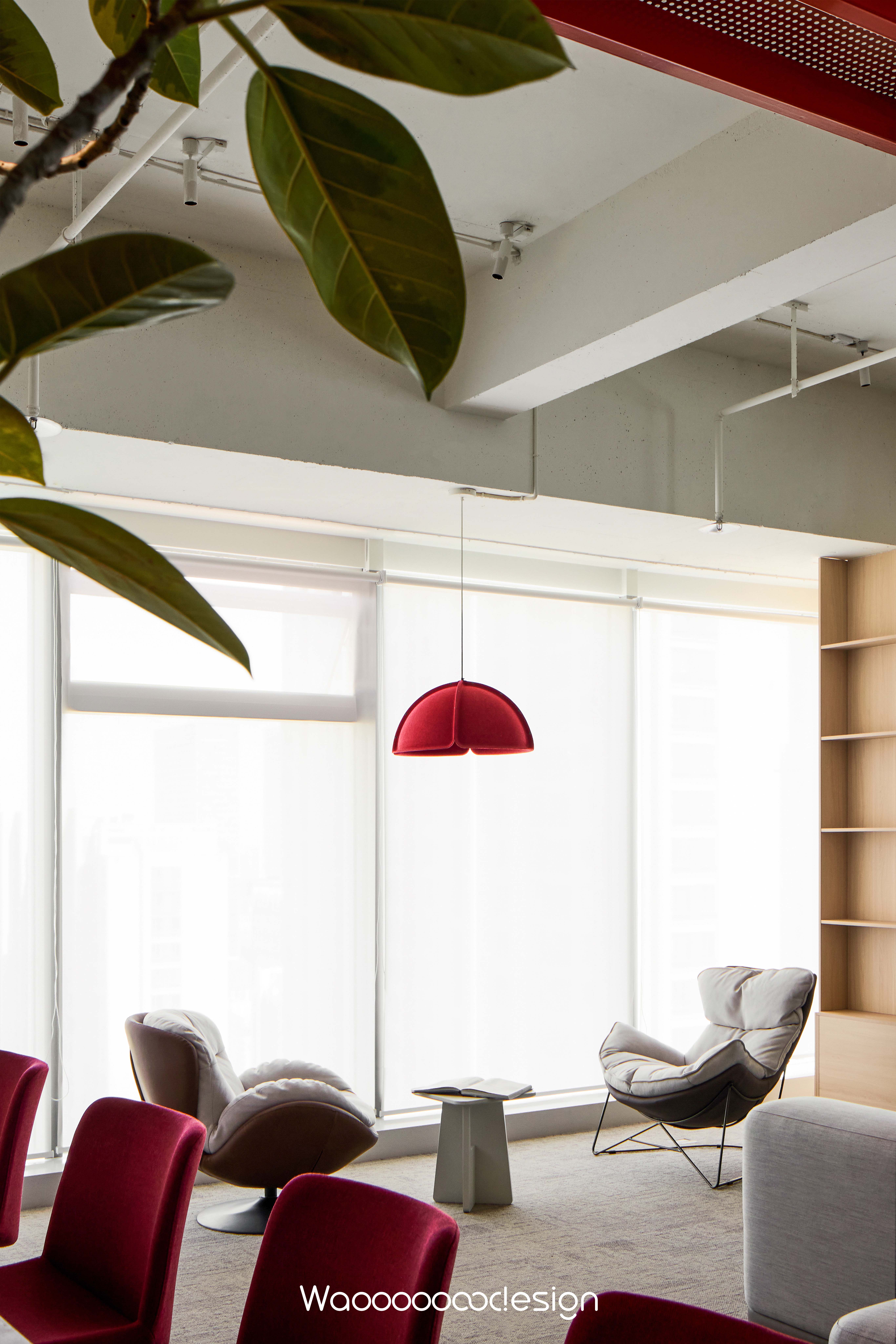 分区设置窗帘的不同透光度,休闲区优先视野,办公区则保证办公环境遮阳度 -