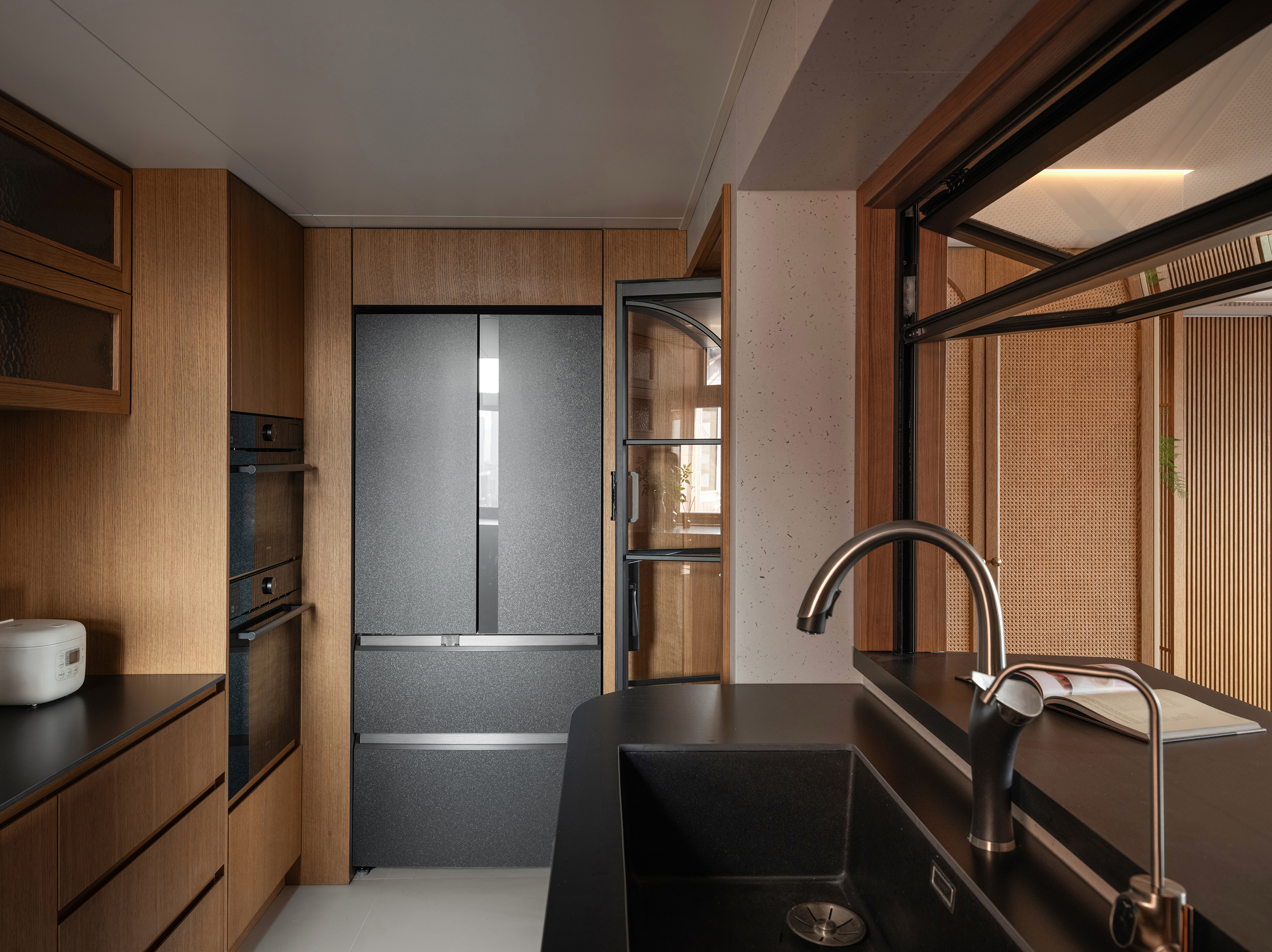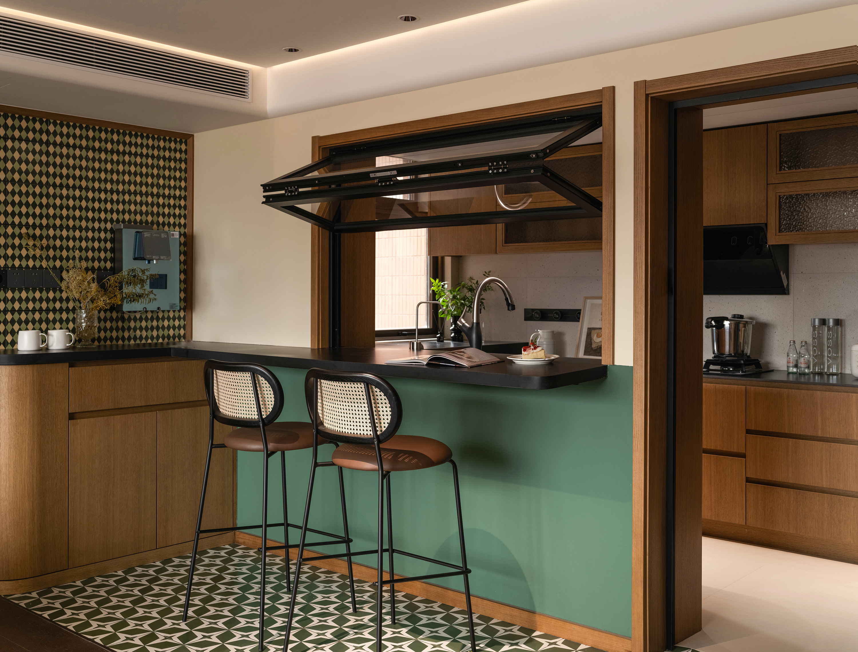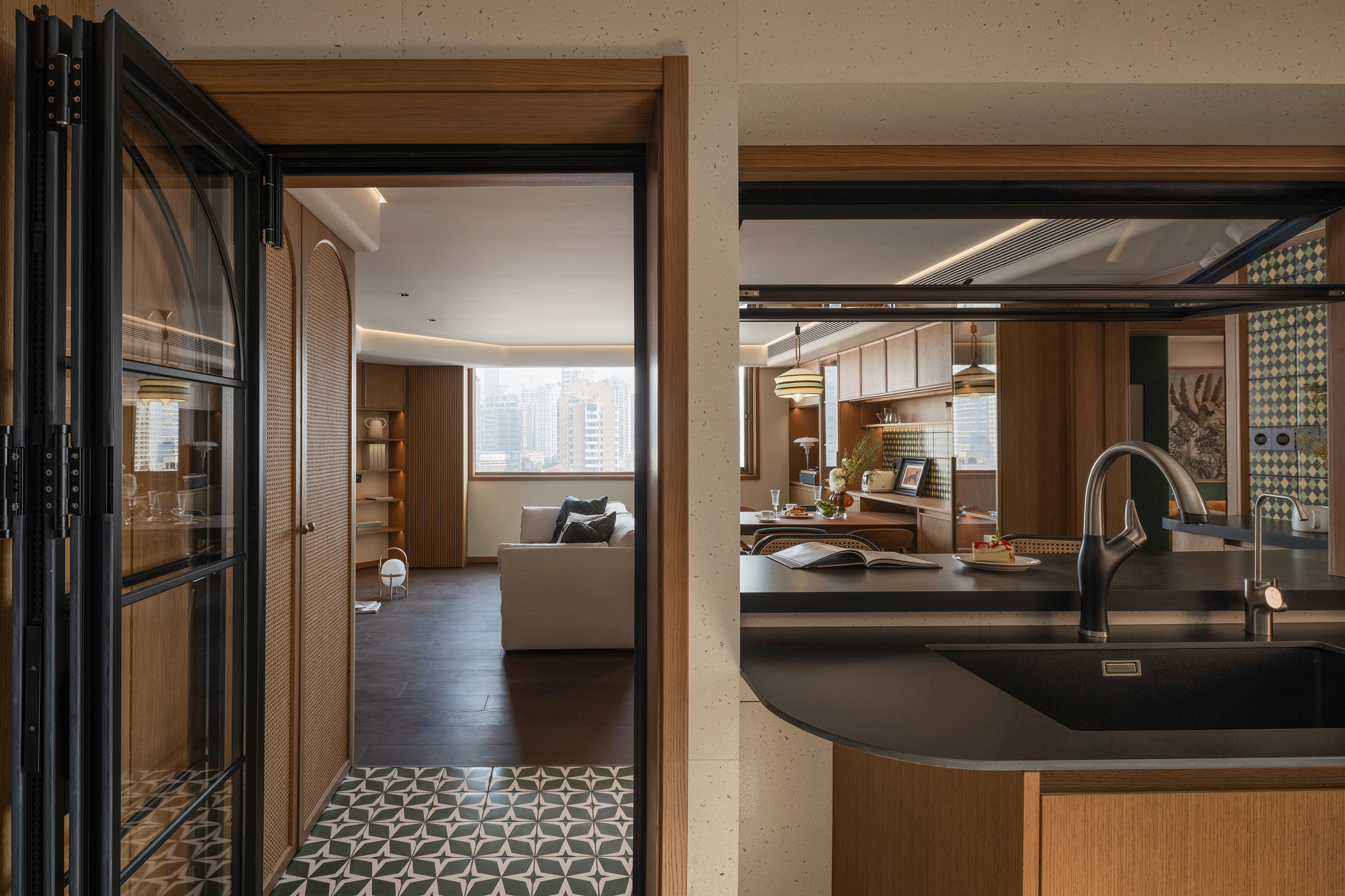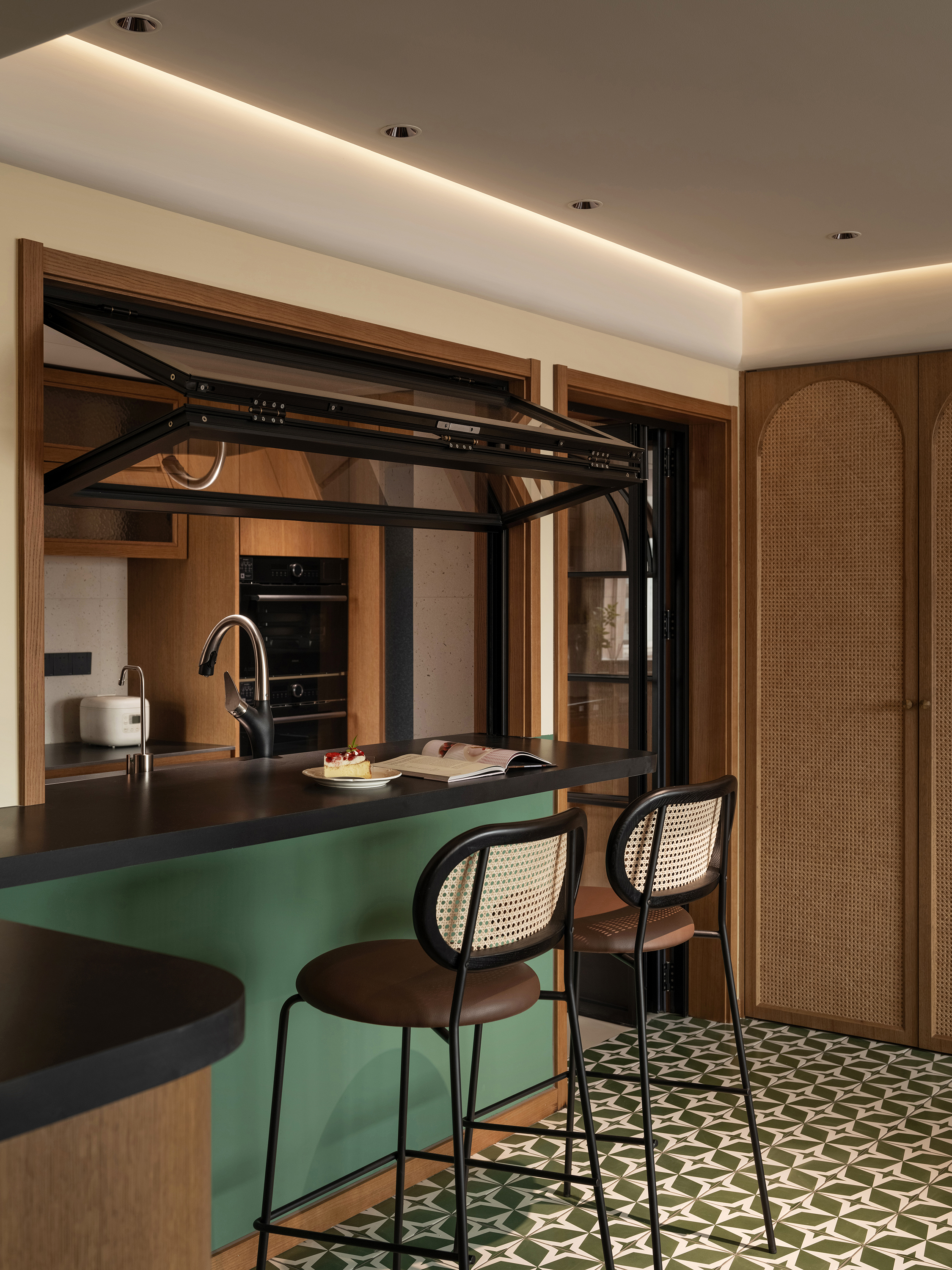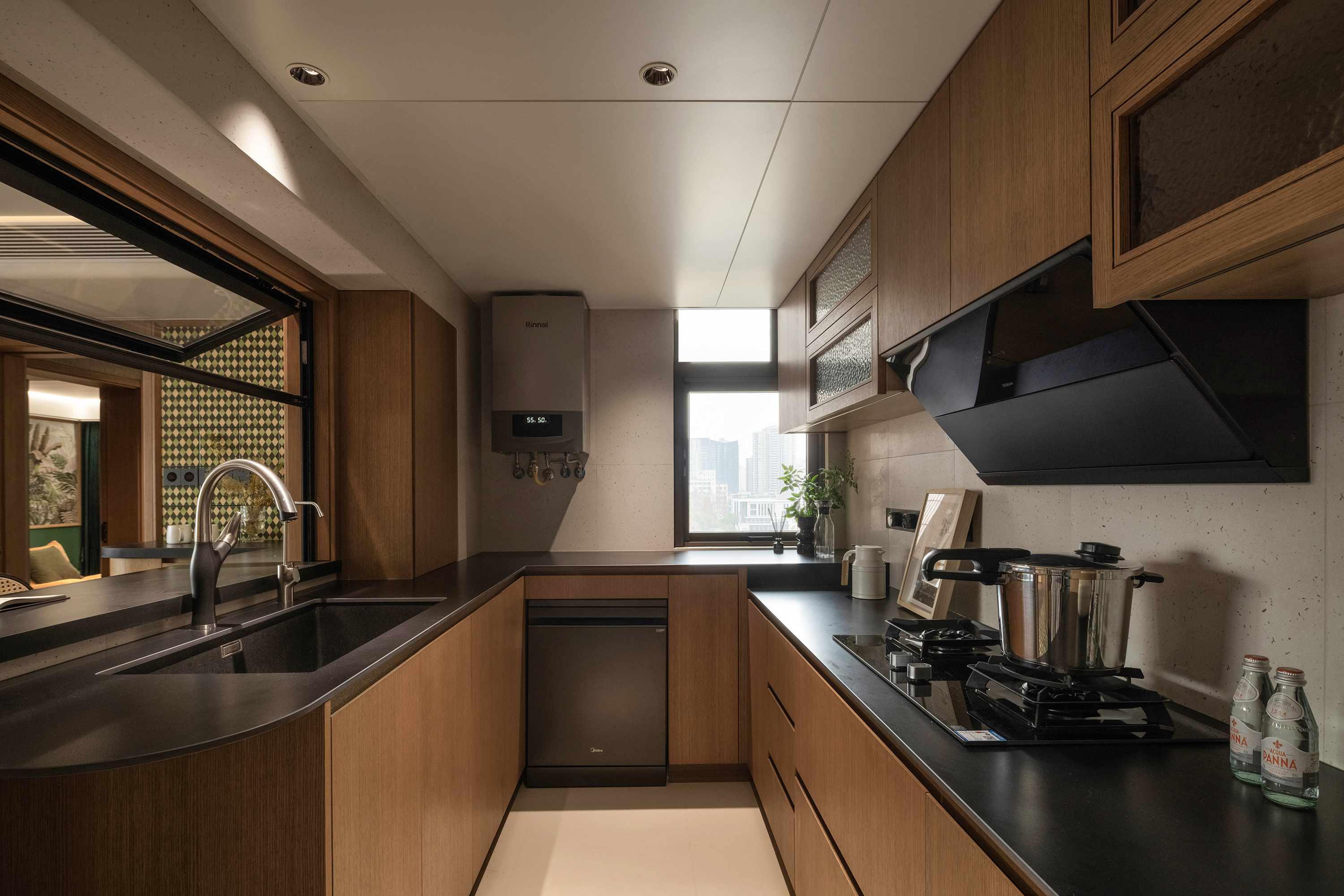 开放式与互动性布局:厨房设计为开放式或半开放式,采用上叠窗打破空间界限,增加与客厅交流,橱柜门板做玻璃材质提高柜内物品可视化。 -