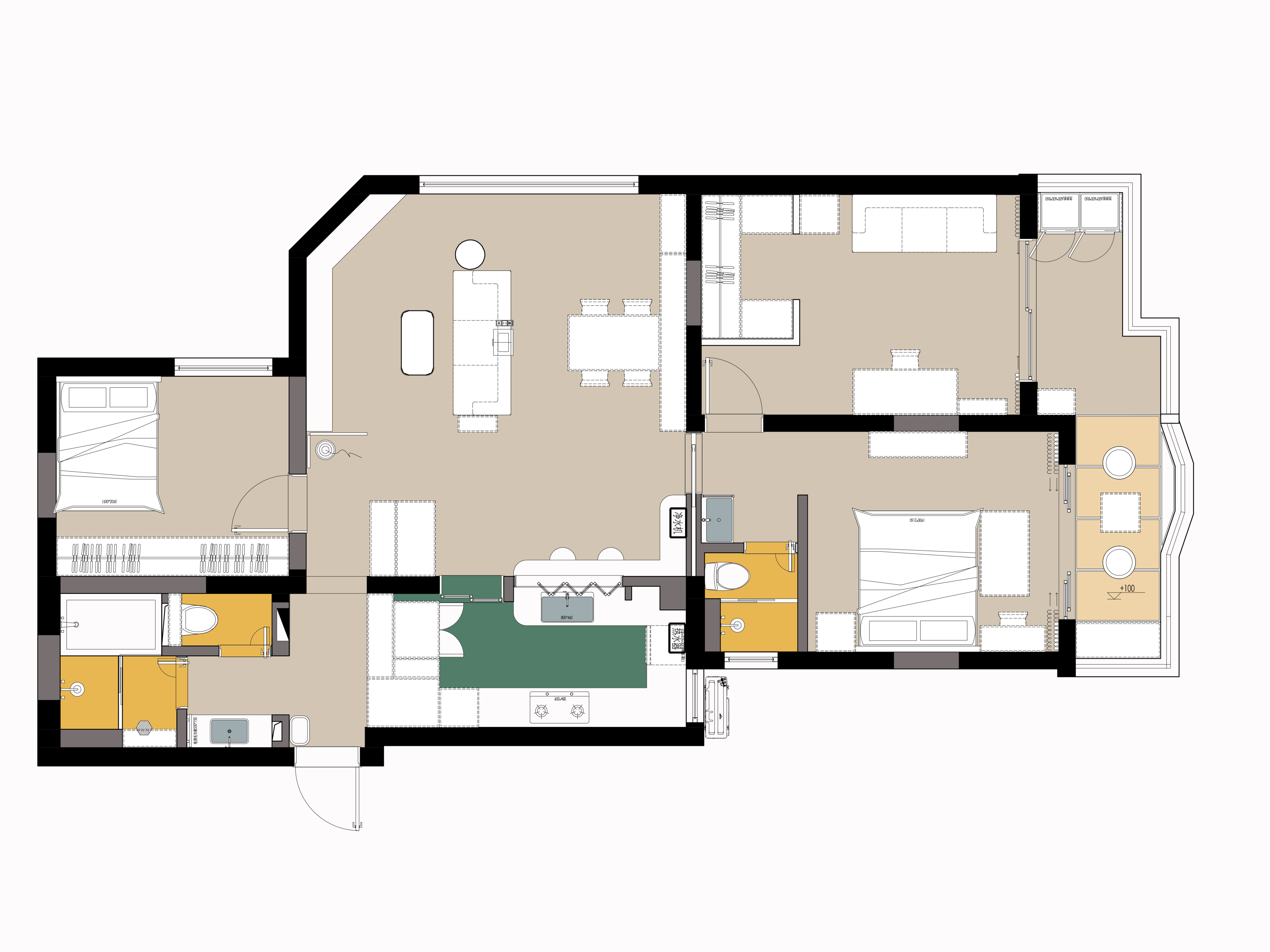 充分考虑夫妻二人及未来宝宝的生活需求,同时兼顾宠物鬃狮蜥的饲养要求,还针对男主人的职业特点(医生夜班多)进行特殊设计,如主卧的隔光、隔音功能。 -