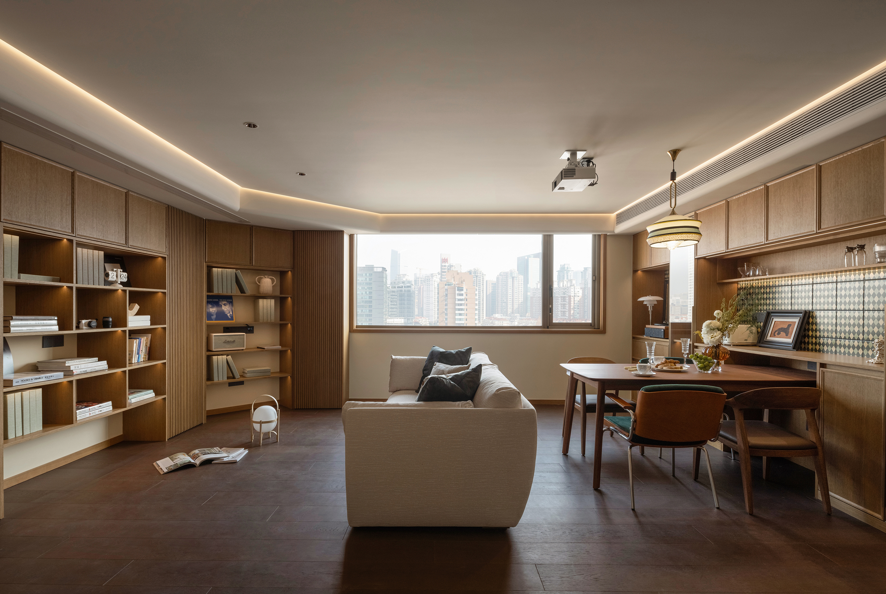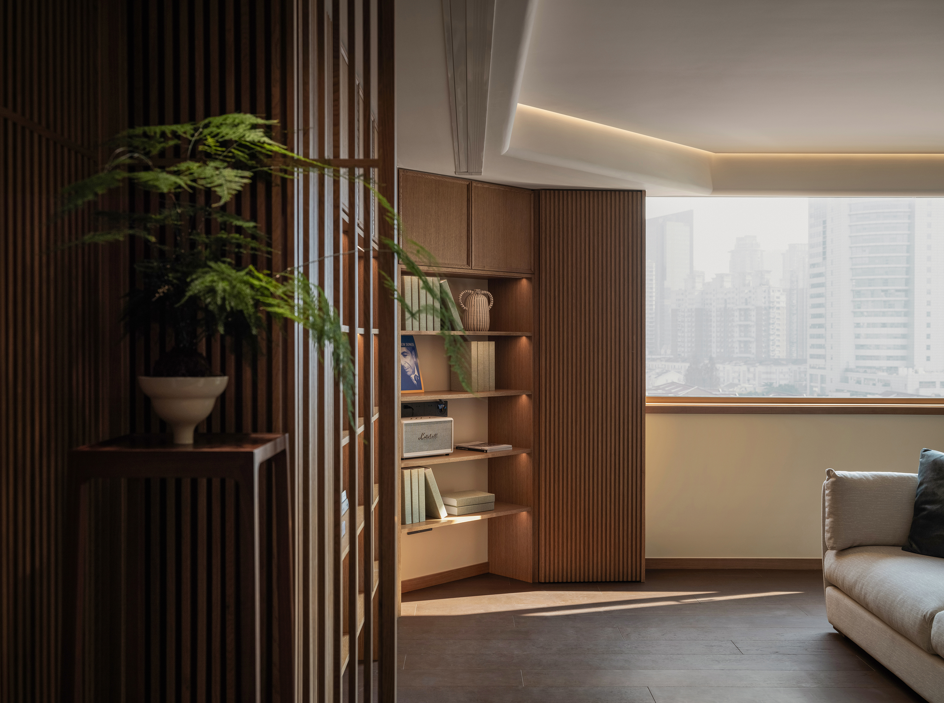 多功能空间设计:入户玄关设置 800 库,除常规收纳外,还可收纳大型物件、婴儿车和童车。客厅沙发周边设计洄游动线,增加空间趣味性和舒适性;沿着不规则墙面设计集收纳柜、书柜和展陈柜一体的多功能柜子。