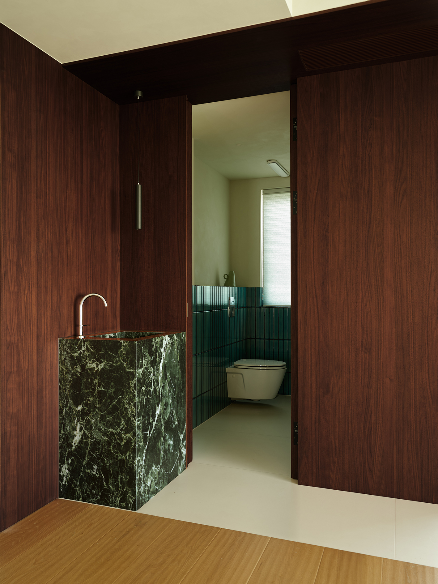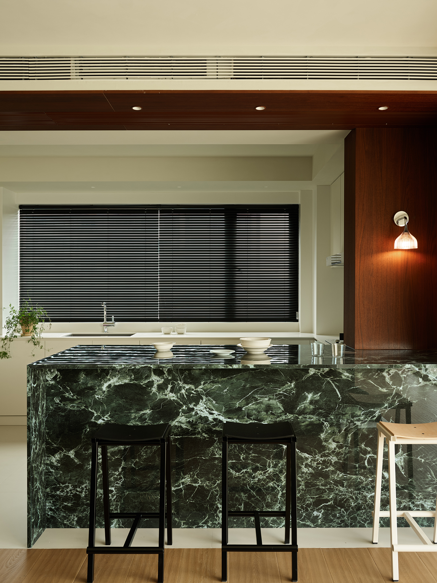 空间意境:在光的容器中,空间被解构为流动的隐喻。十帧切片拼合成一场无声的哲学叙事——厨房的浅色柜体是理性的秩序,墨绿大理石岛台却忽然坠入诗性的漩涡,如同被晨雾浸染的森林在金属与岩层中复活。百叶窗切割的光斑在深棕墙体上写下变形的密码,而壁灯以暖黄瞳孔凝视那些未被言说的沉默。