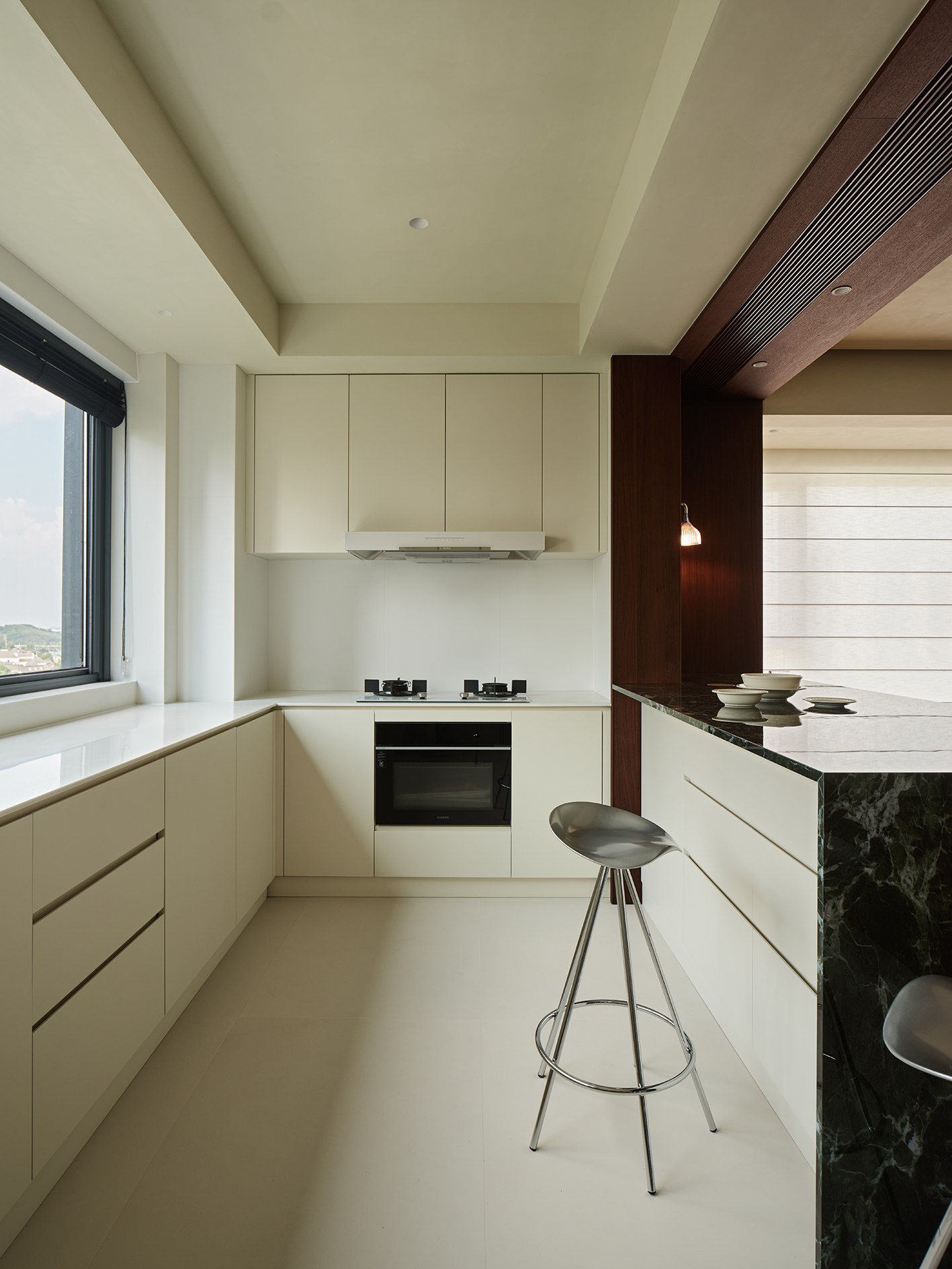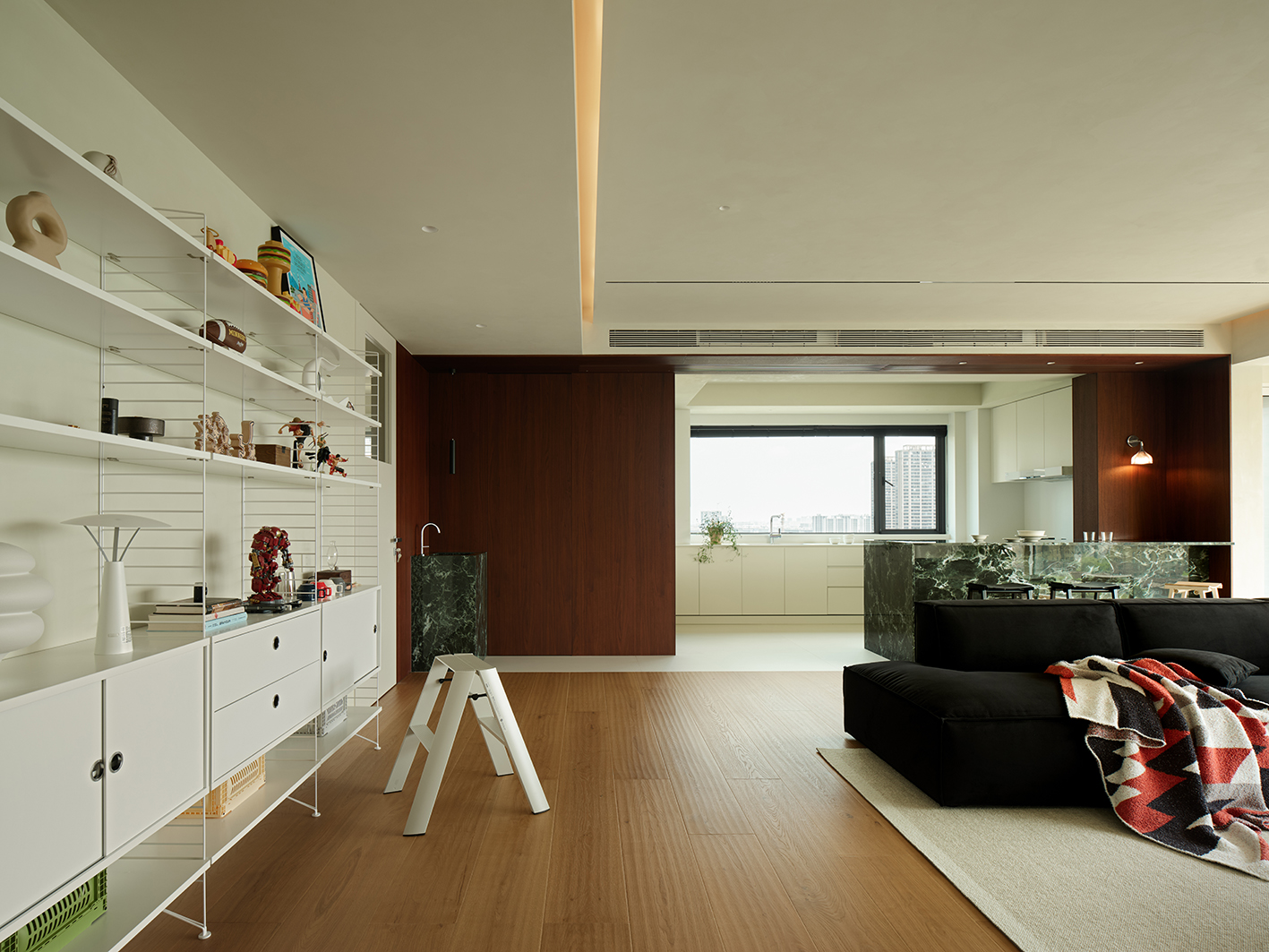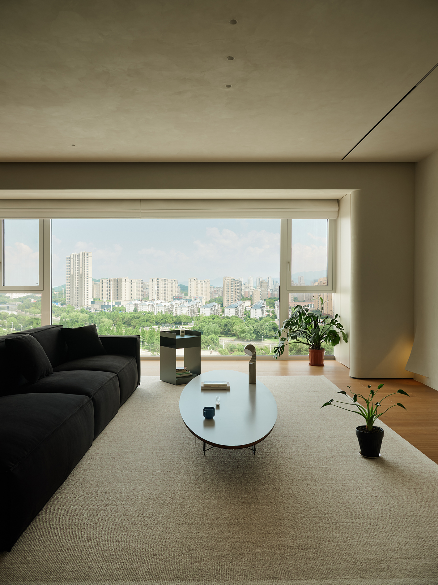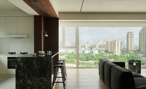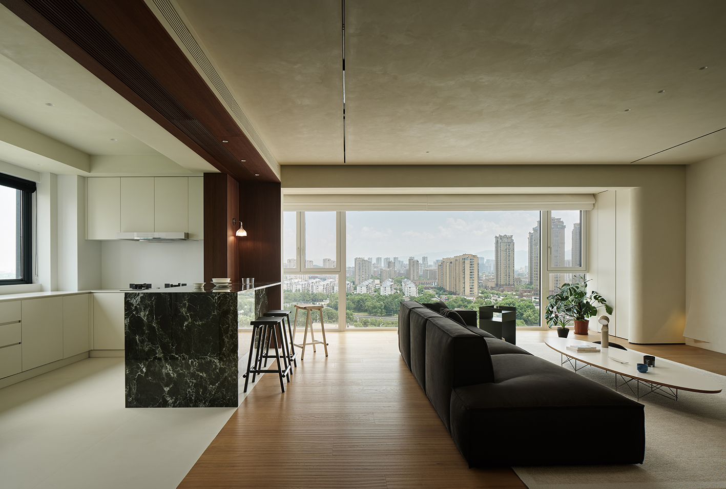 空间布局:落地窗是空间的终极修辞,将城市压缩为一幅动态壁画。高楼与绿树在玻璃的边界完成三次折射:既是景观,亦是镜鉴,最终成为心象的投射。木质地板从厨房流向客厅,如同温润的河床,承载着脚步的韵律与器具的星群。