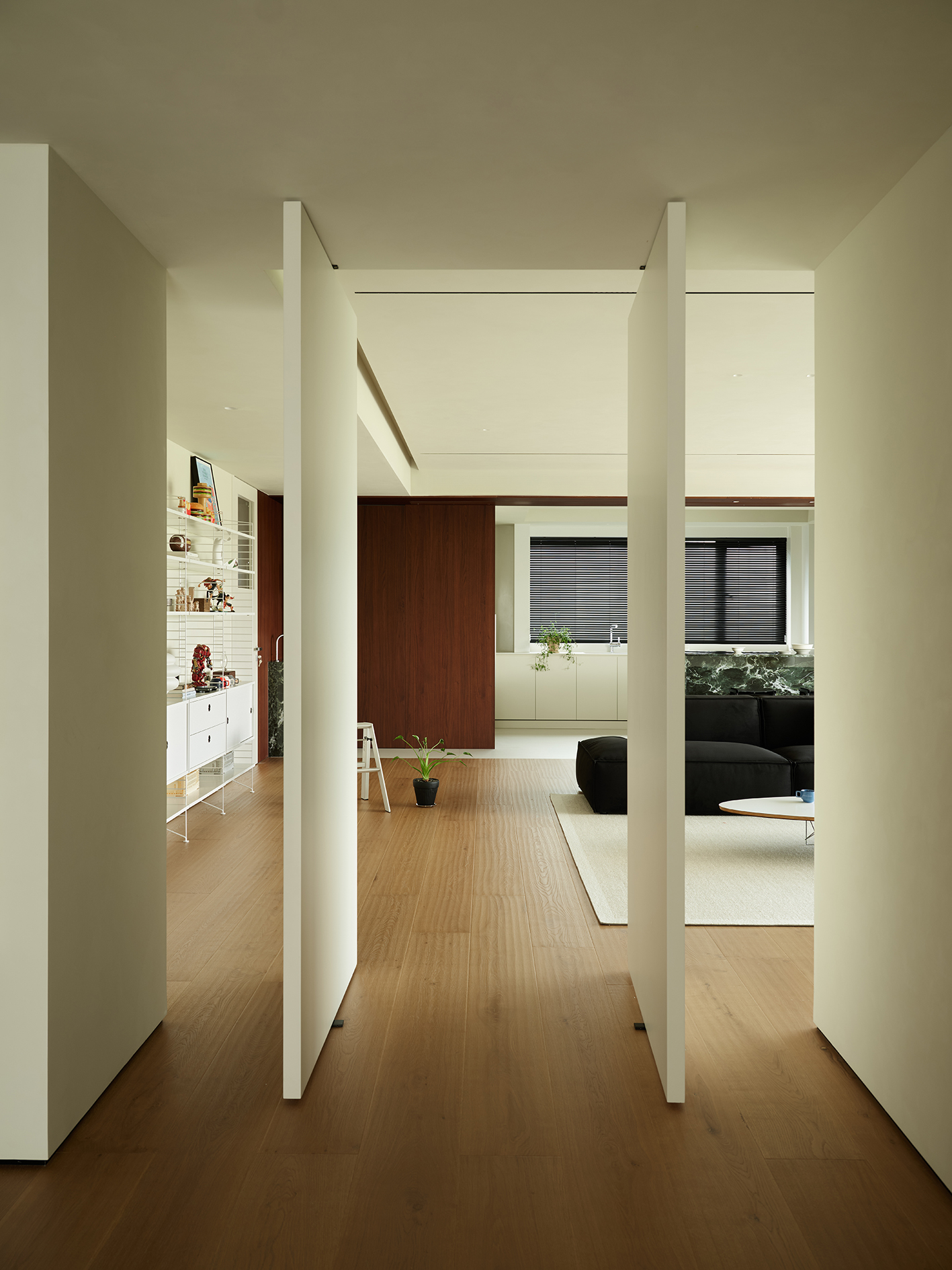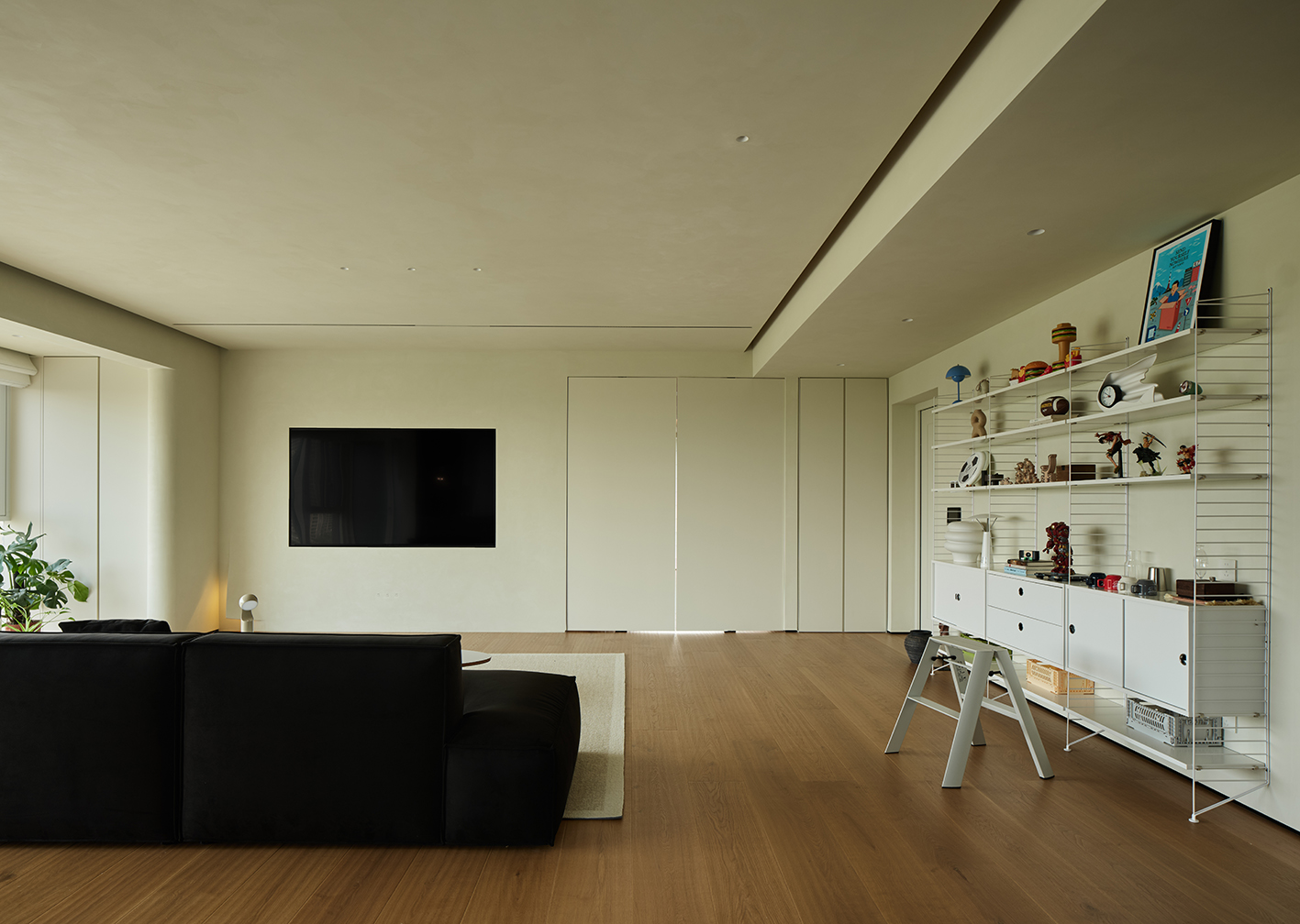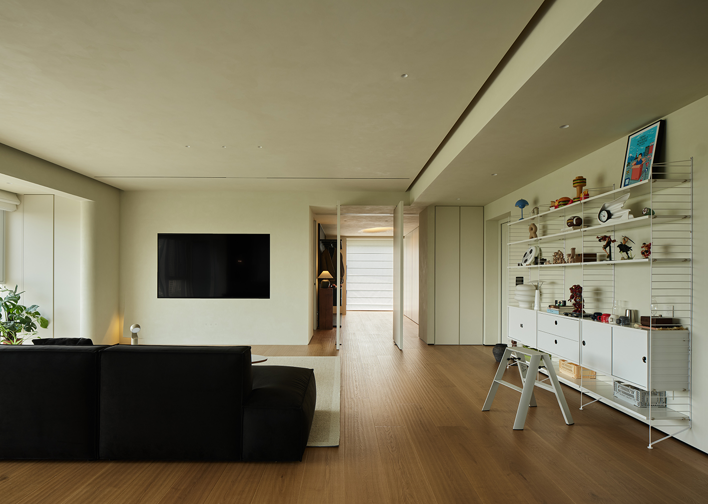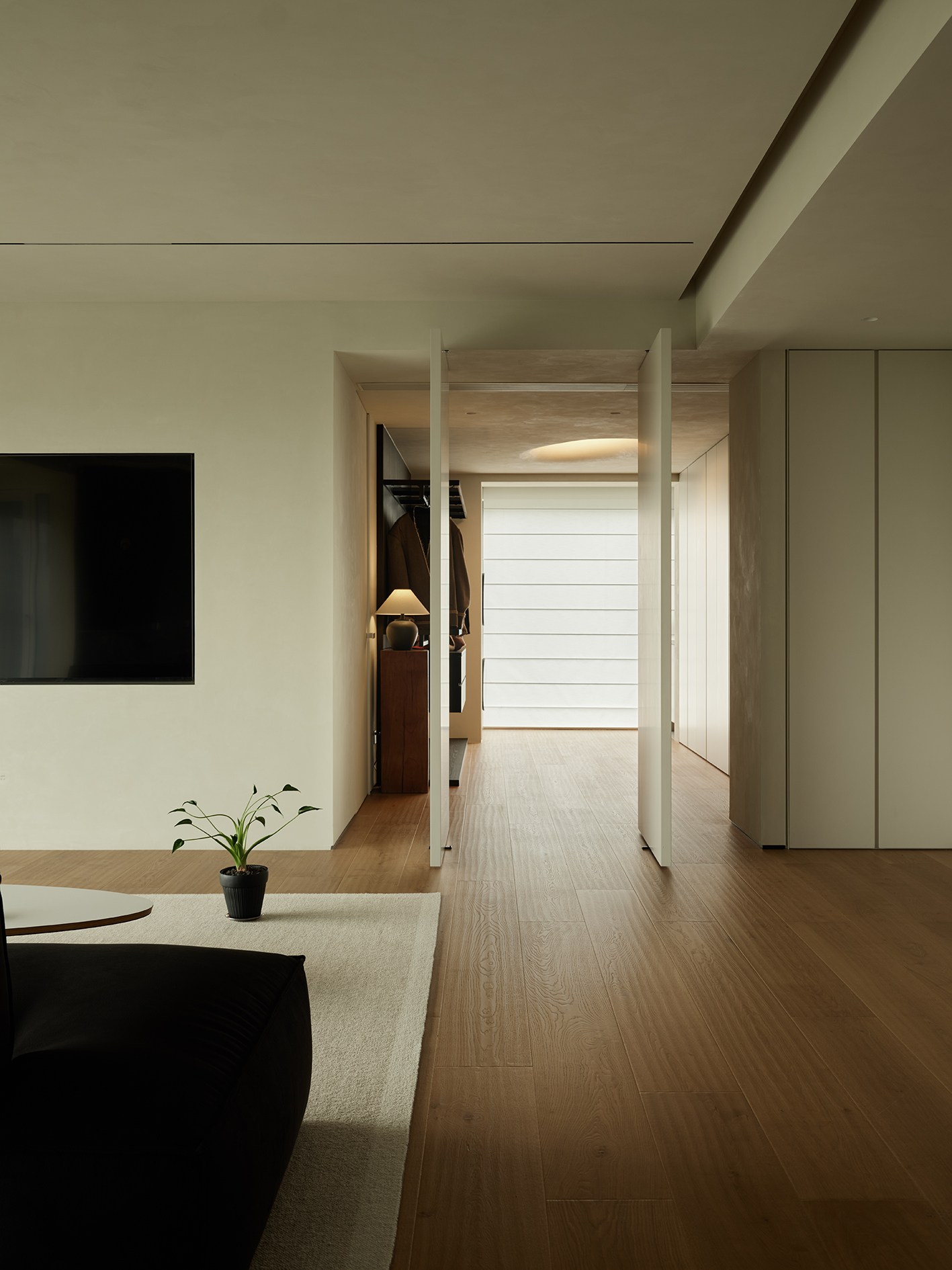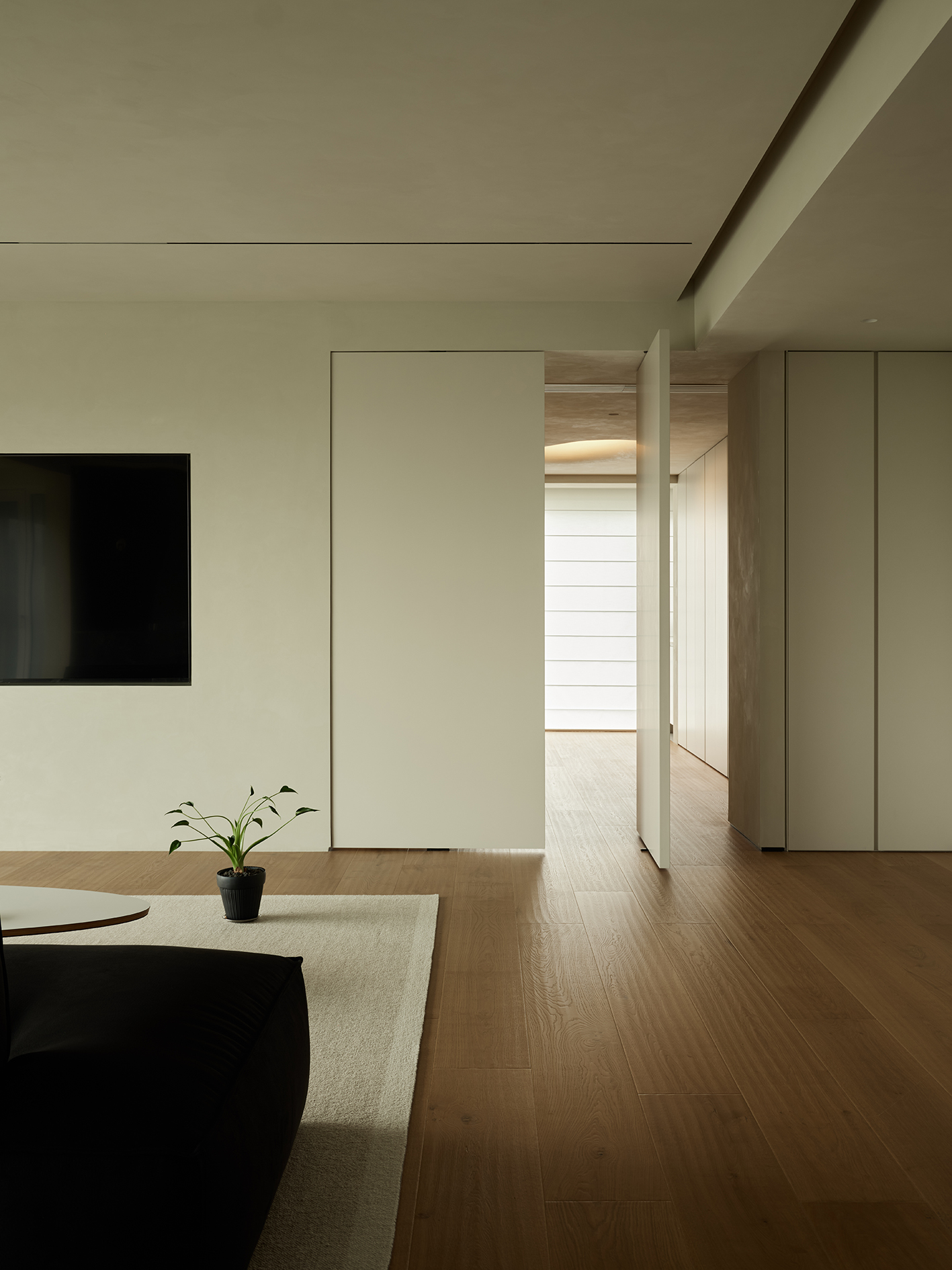 空间布局:落地窗是空间的终极修辞,将城市压缩为一幅动态壁画。高楼与绿树在玻璃的边界完成三次折射:既是景观,亦是镜鉴,最终成为心象的投射。木质地板从厨房流向客厅,如同温润的河床,承载着脚步的韵律与器具的星群。