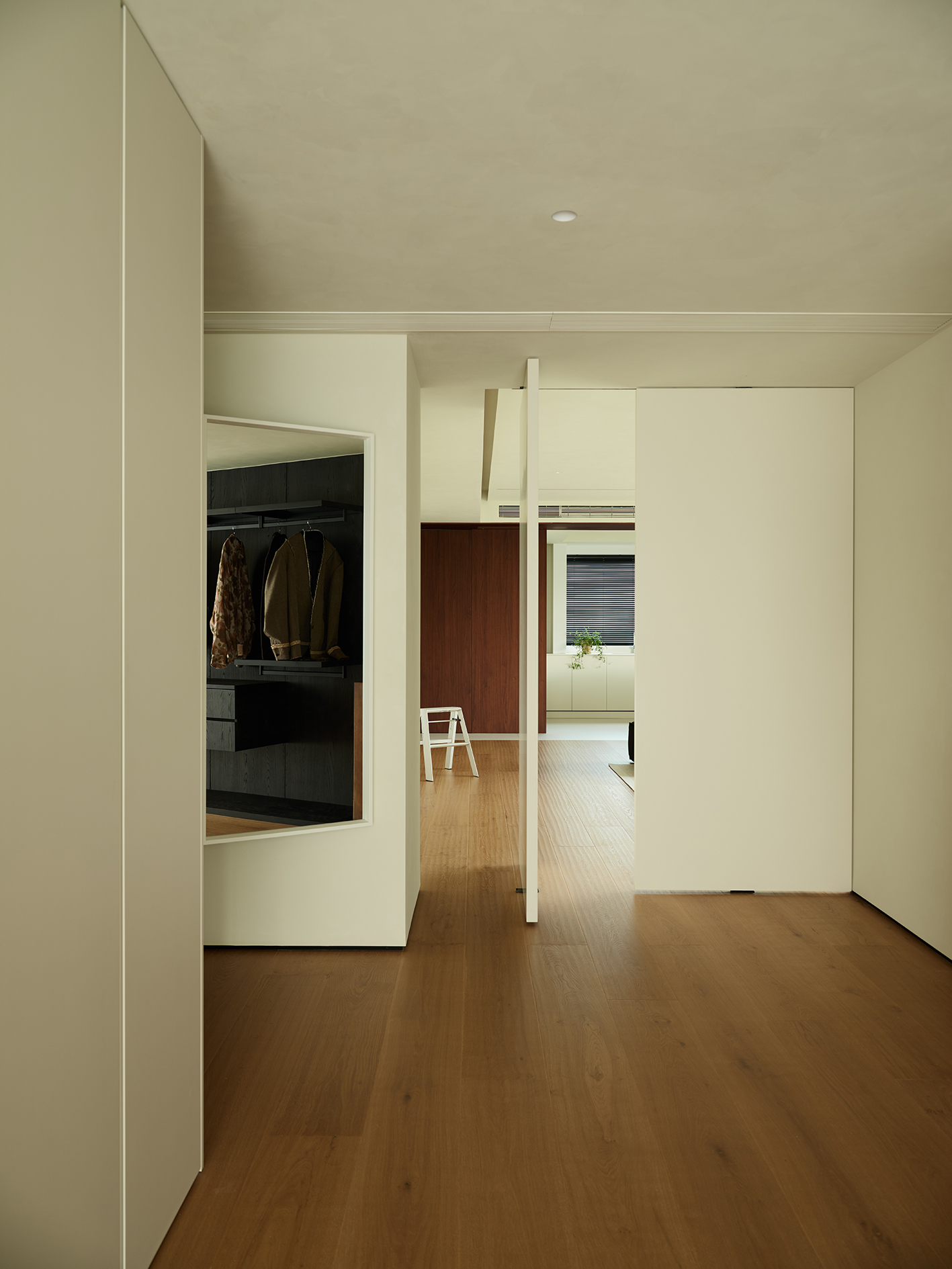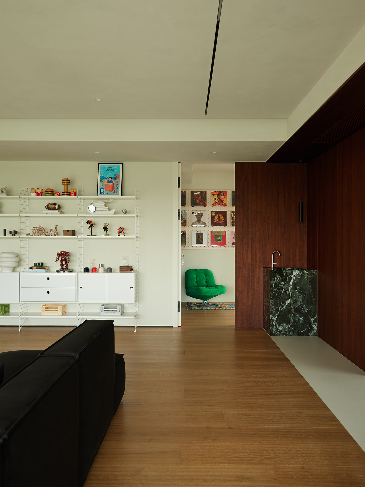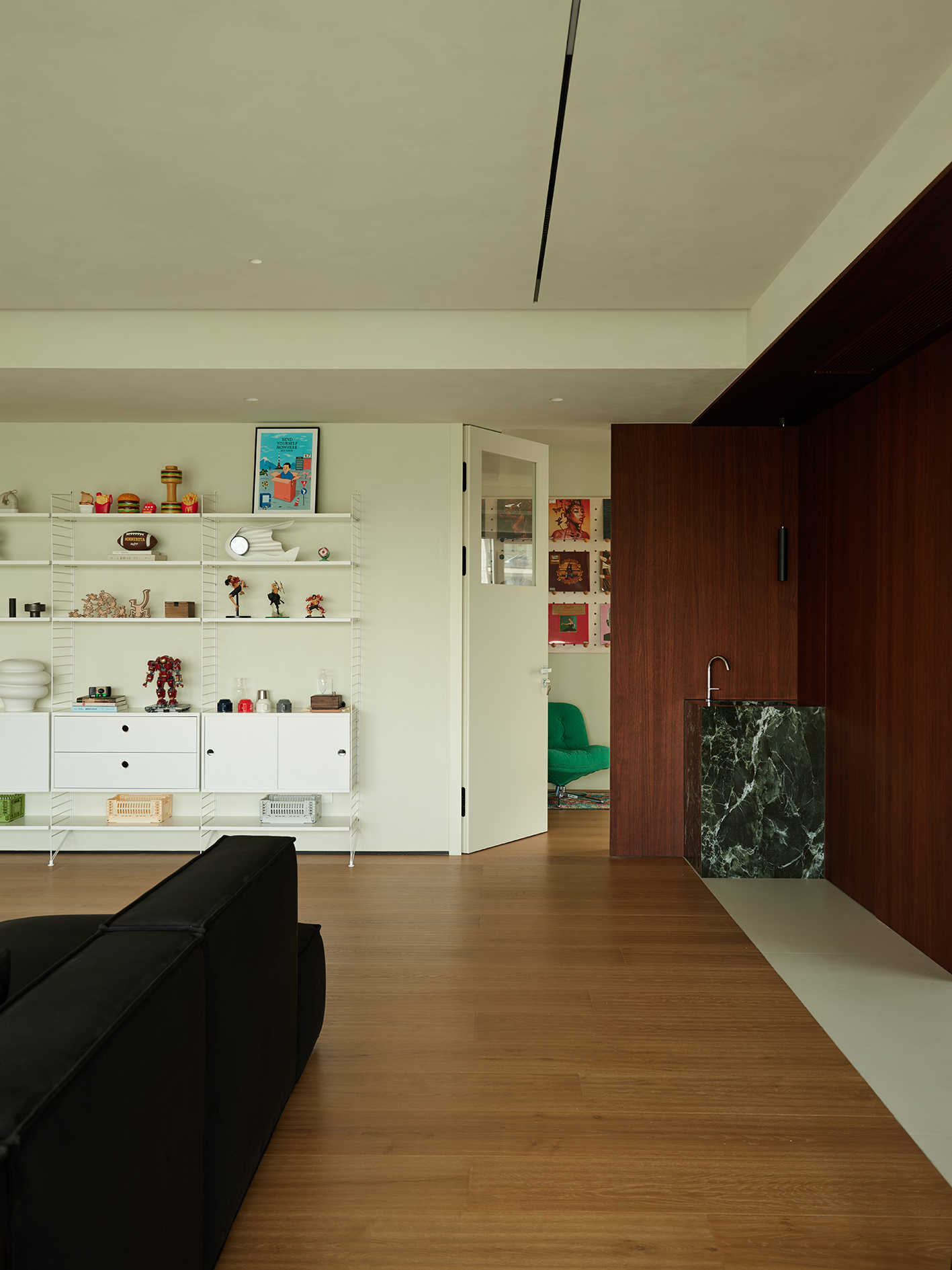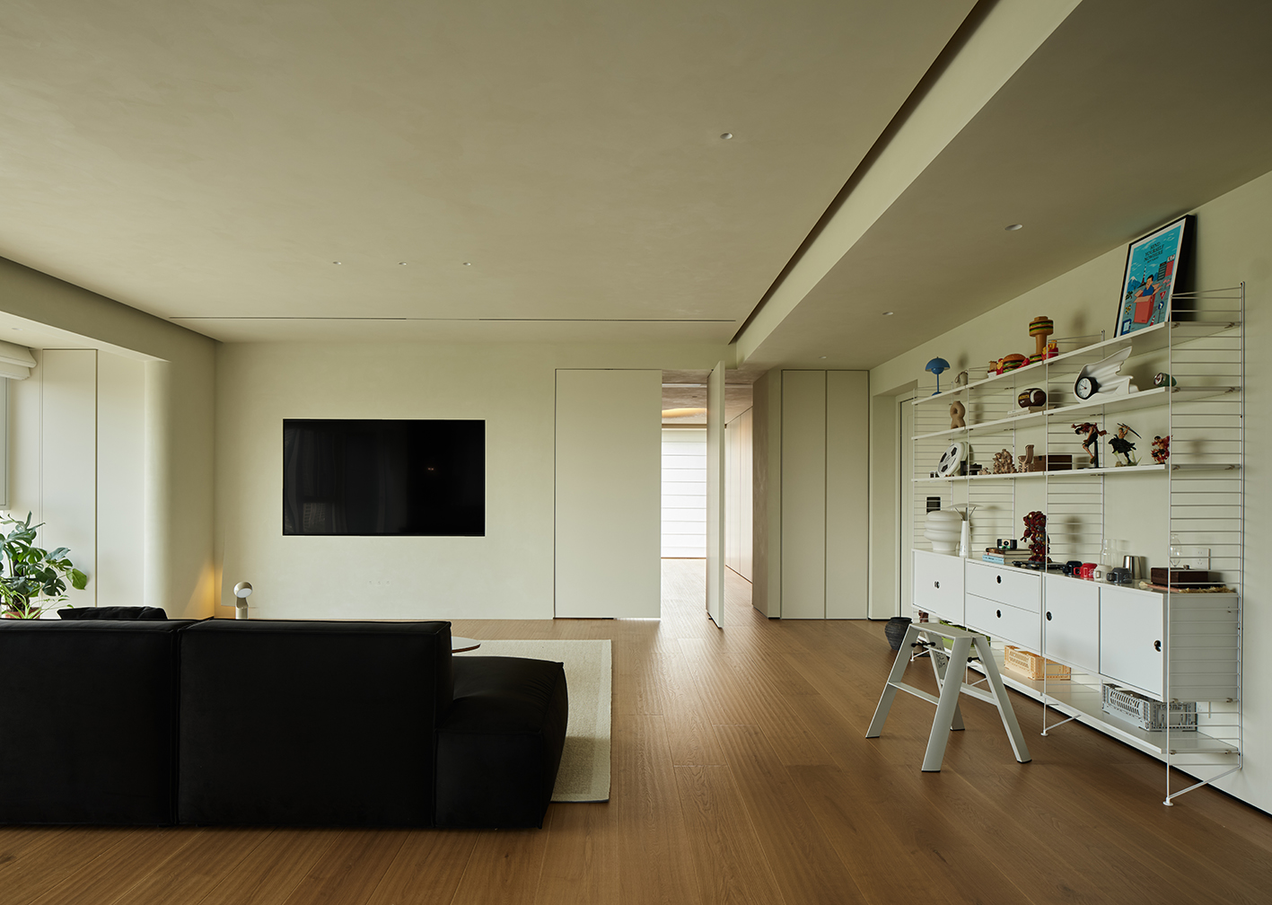 空间布局:落地窗是空间的终极修辞,将城市压缩为一幅动态壁画。高楼与绿树在玻璃的边界完成三次折射:既是景观,亦是镜鉴,最终成为心象的投射。木质地板从厨房流向客厅,如同温润的河床,承载着脚步的韵律与器具的星群。