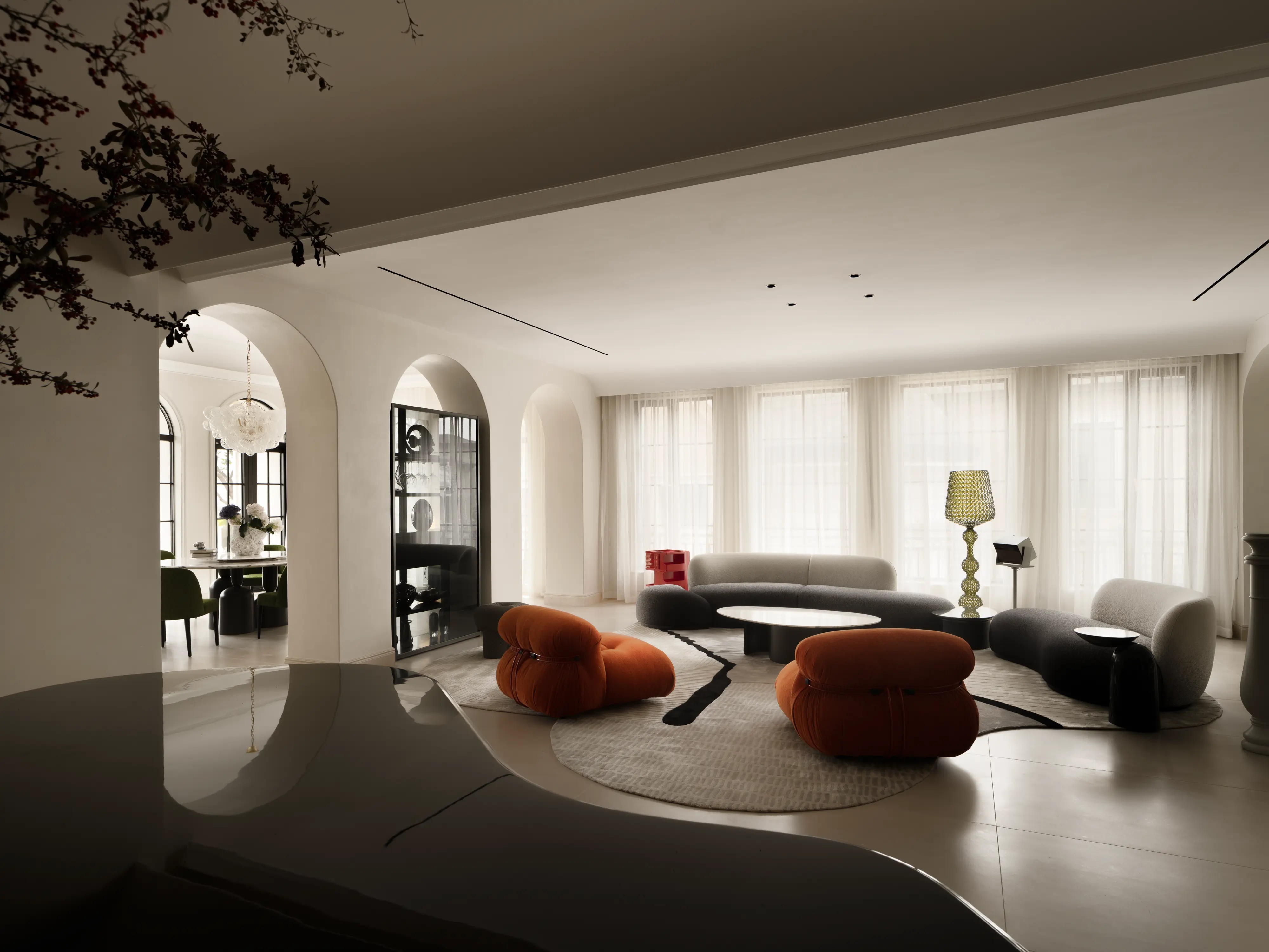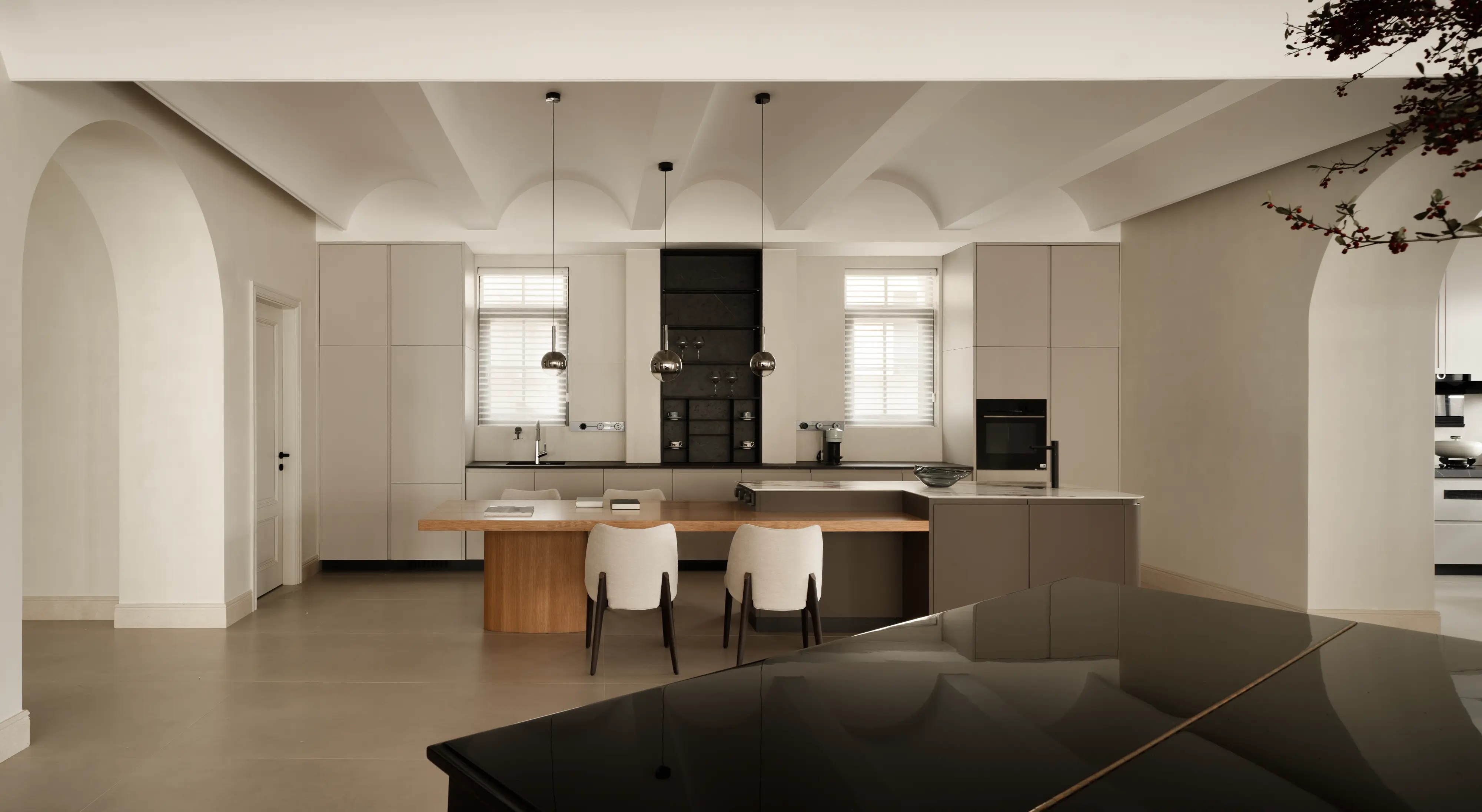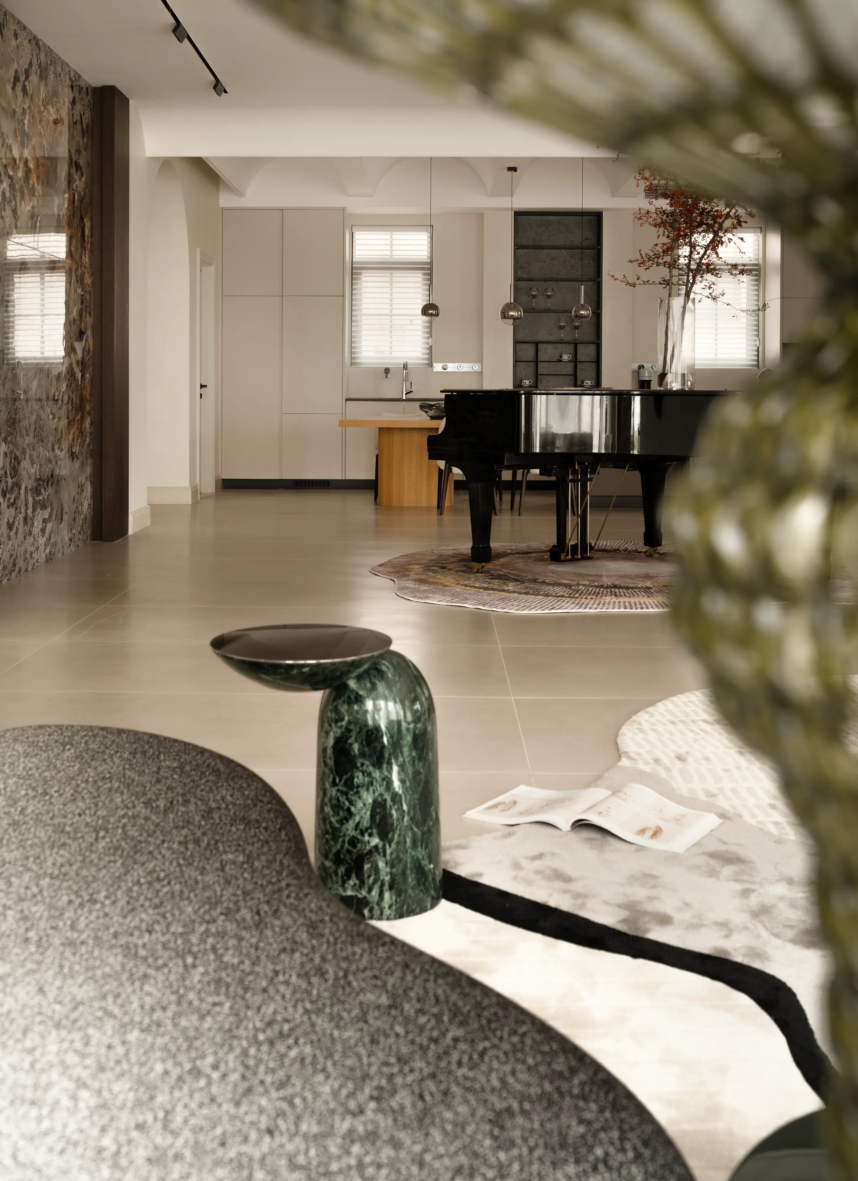 空间意境:从繁华都市中心的别墅搬离,高知夫妇希望给予孩子更纯粹、有效的成长陪伴。面对一家四口对空间的各自诉求,设计师在平衡个性与促进家人交流中,决定打造更多场景,给予家人间更多交流。