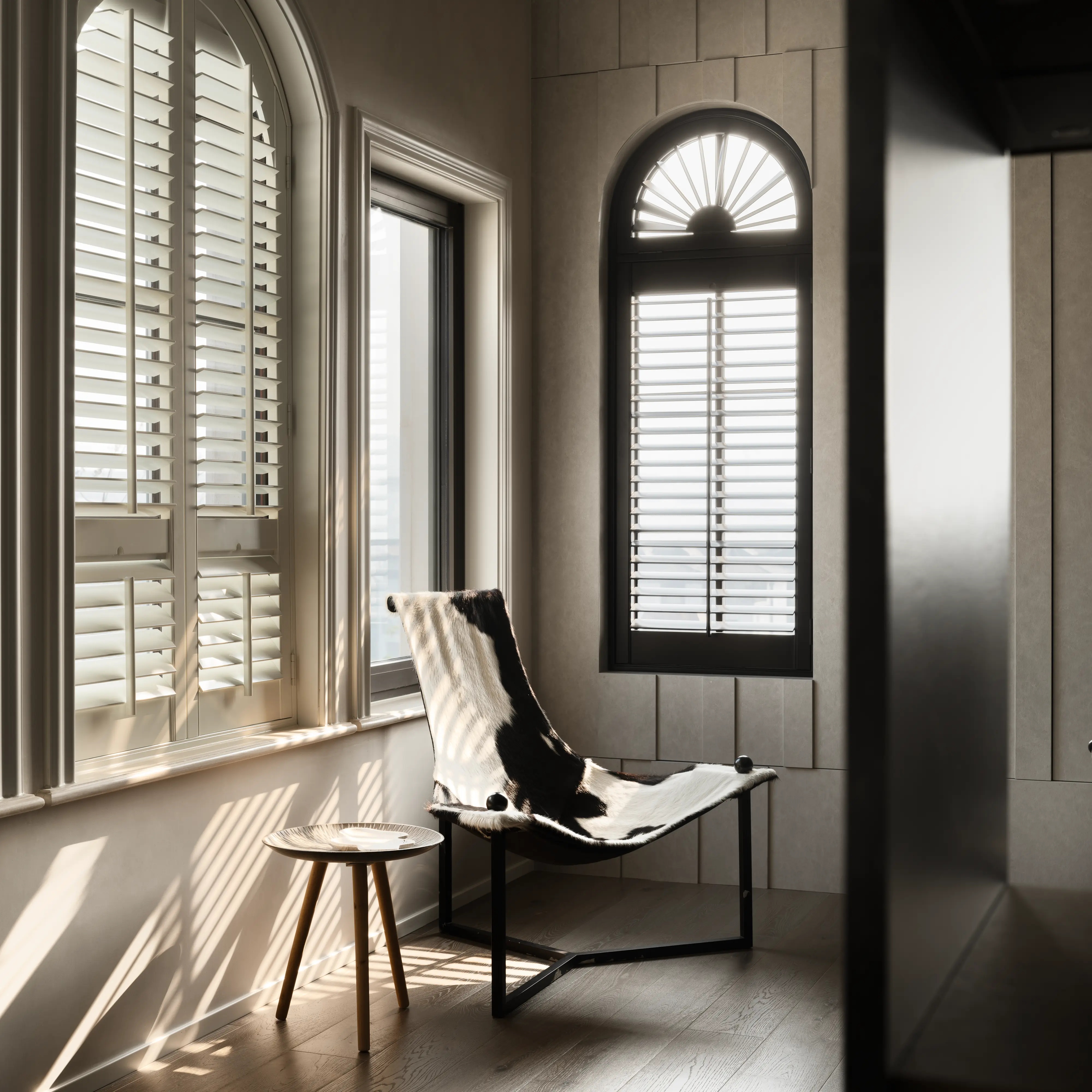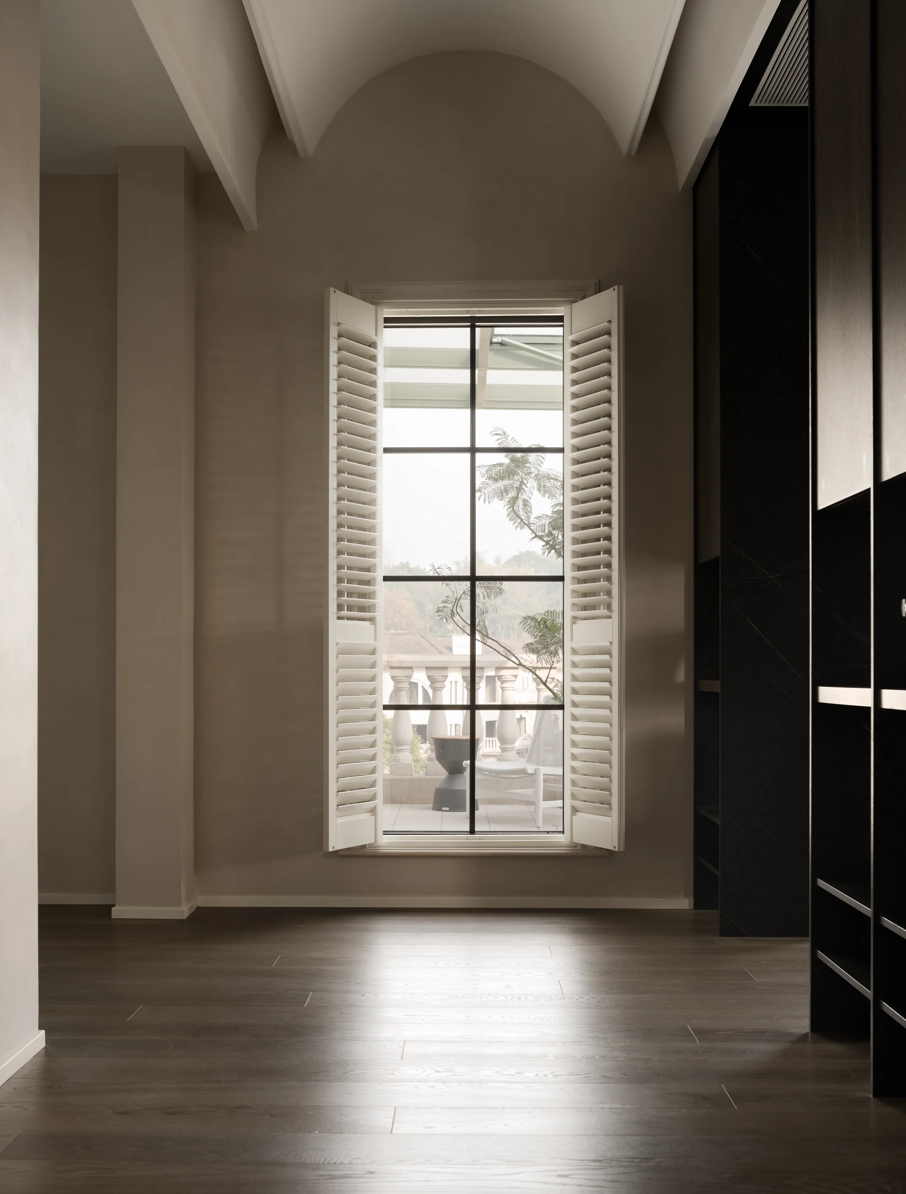 主卧内打造的独立书房,满足了男主人在家工作的需要,工作区与休憩区通过通高书架形成自然过渡,使工作与生活的界限在此悄然消隐。