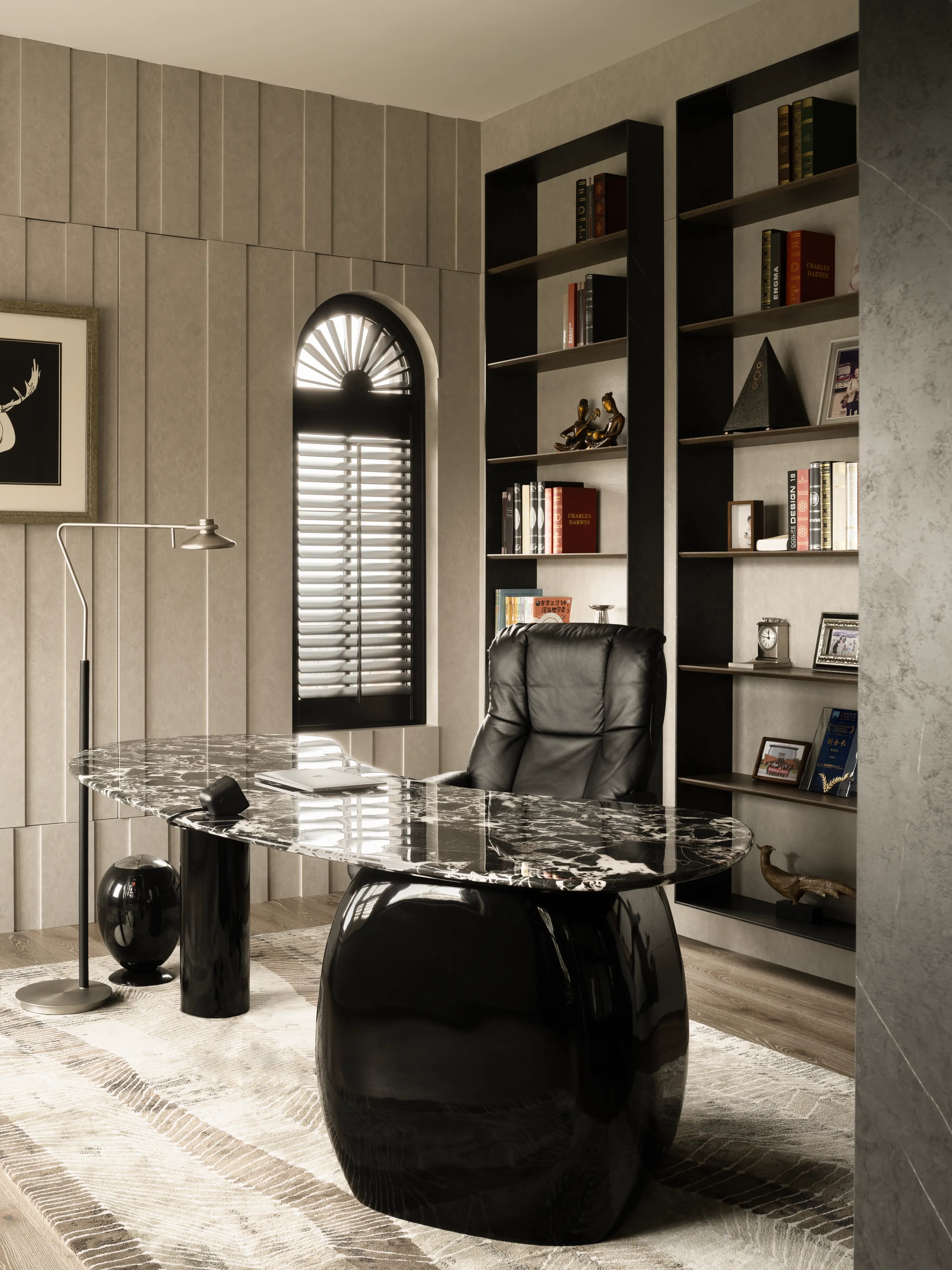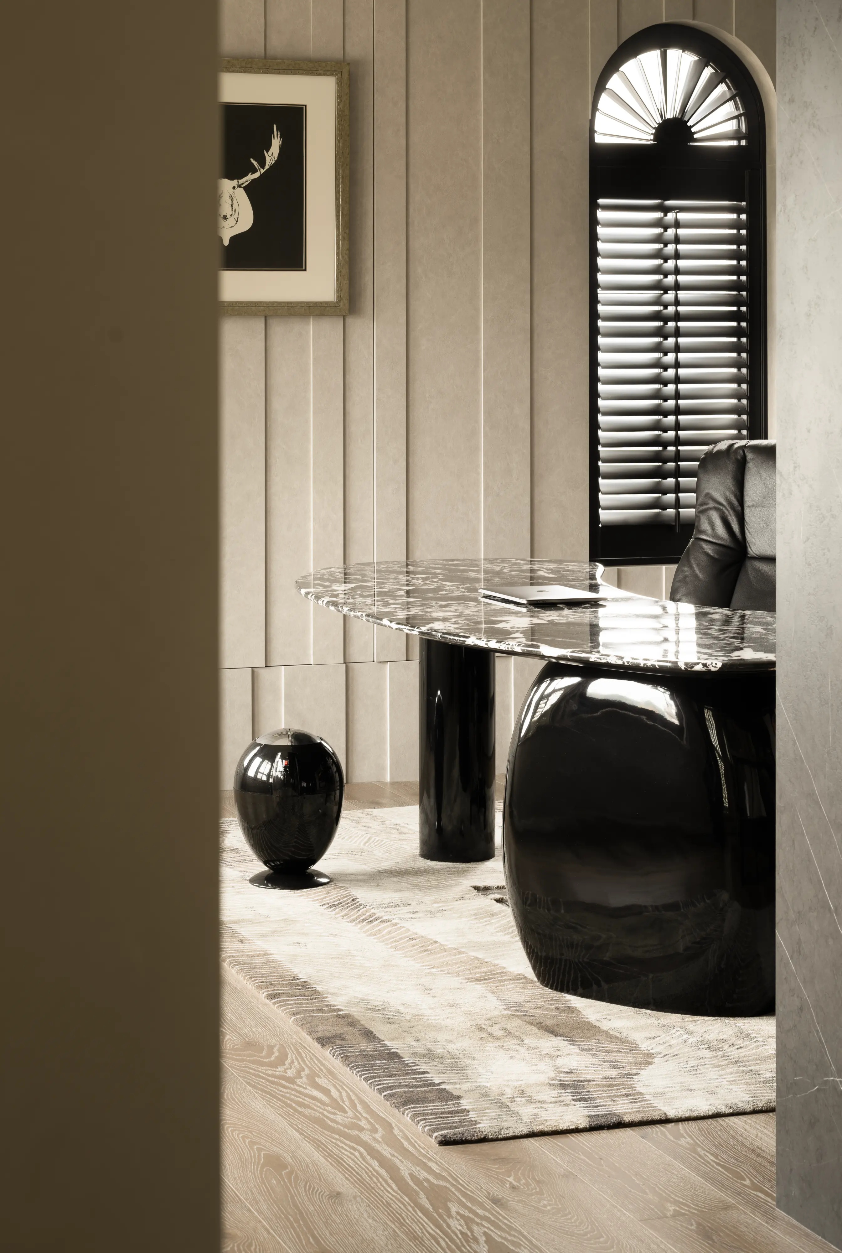 书房沉稳雅致的风格十分契合做事严谨的男主人气质,轩敞的格窗将高尔夫球场纳入视野,晨昏光影在室内流转,四季之景在室外变幻。 -