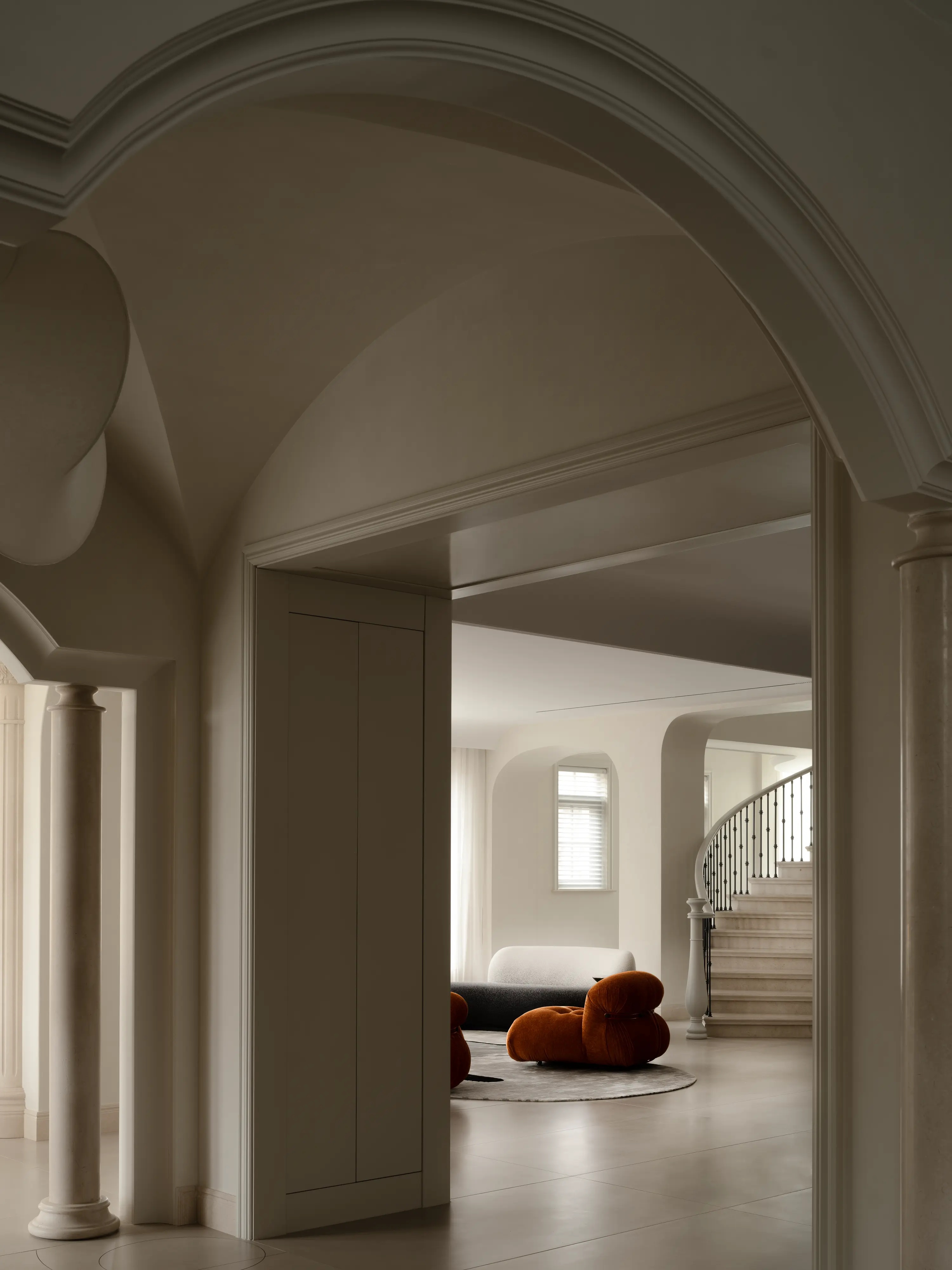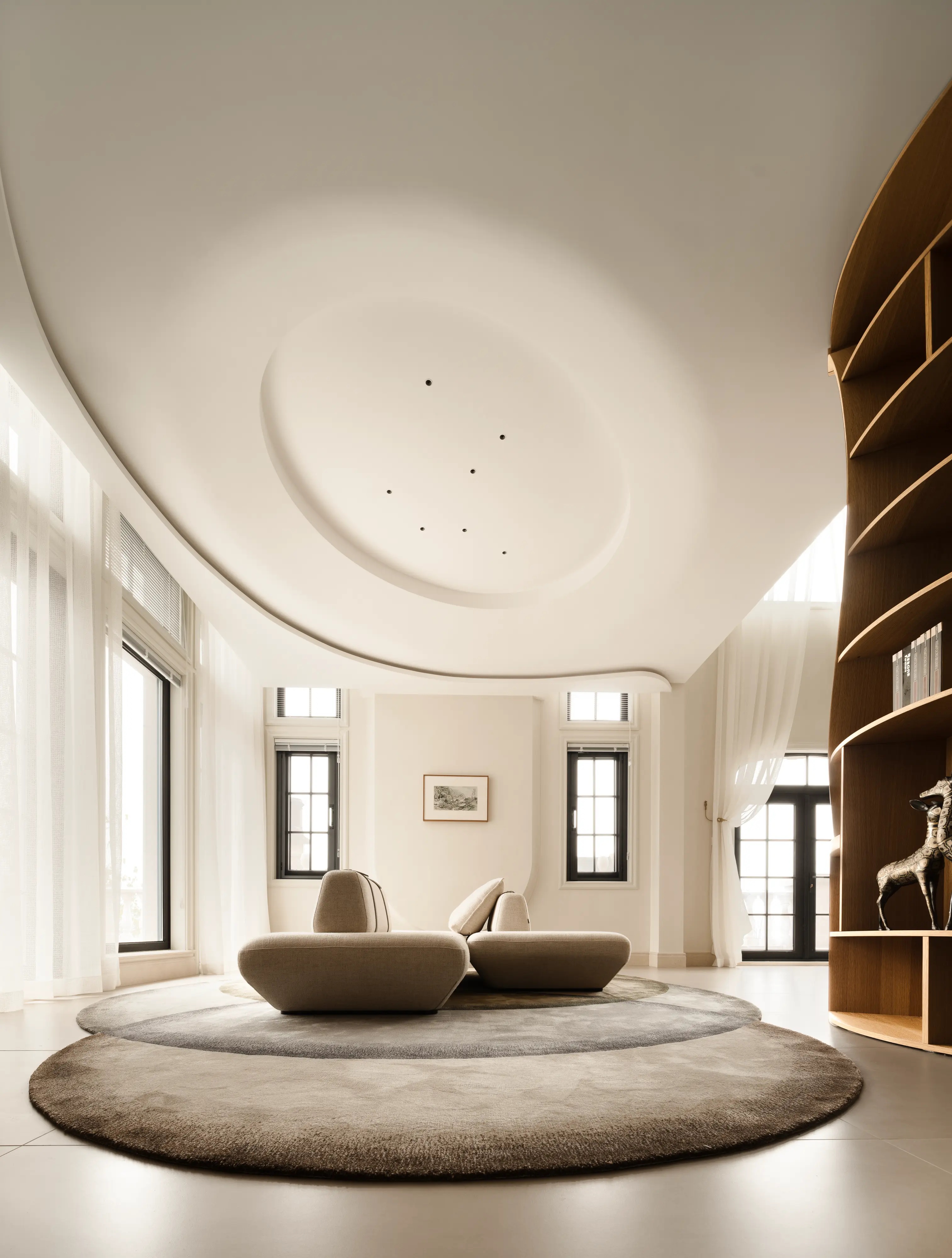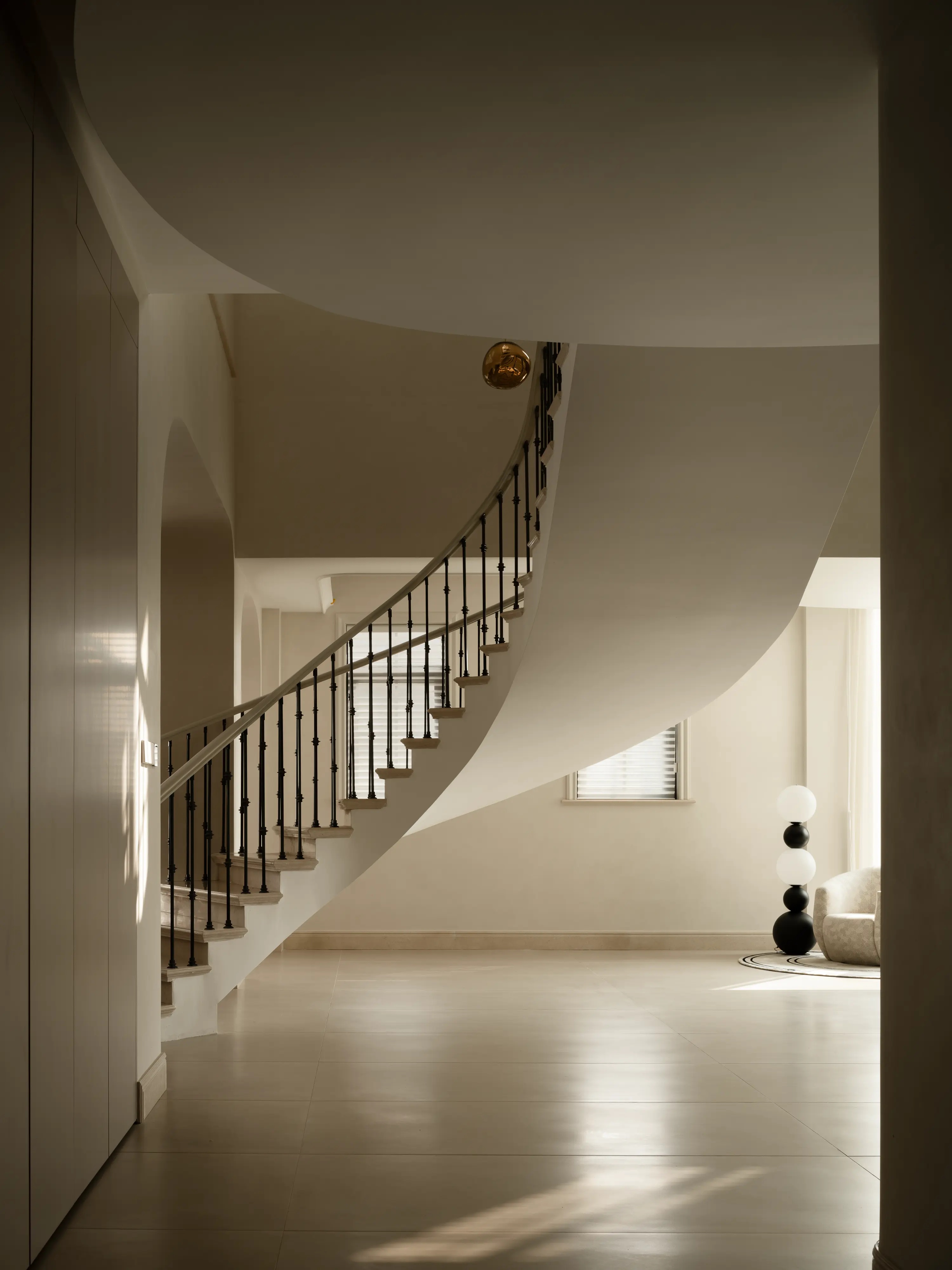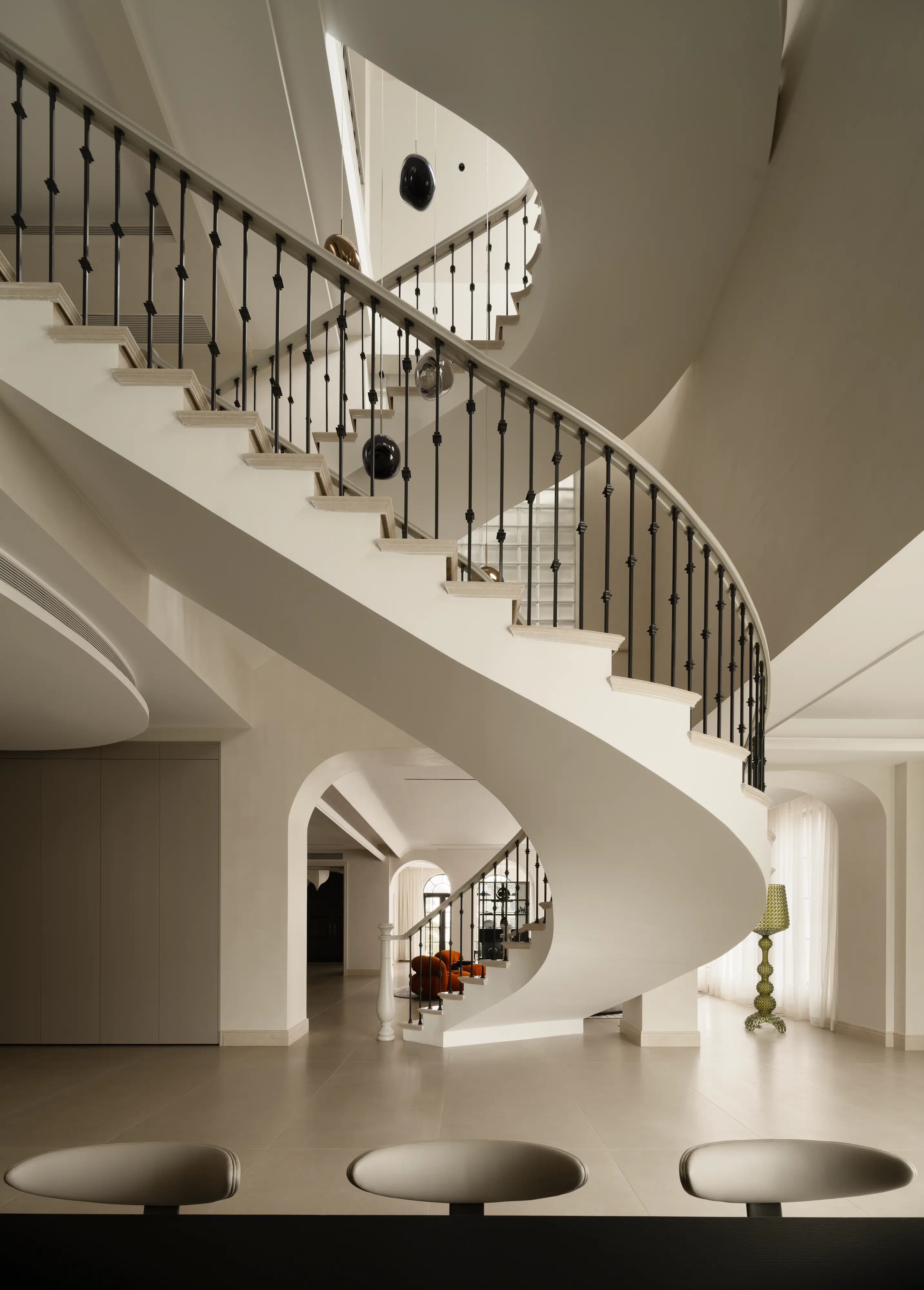 空间布局:轻盈的旋转楼梯盘旋向上,在家庭厅中转后直达二层卧室空间;不仅在视觉上给人以美的享受,更在功能上实现了空间的流畅过渡。