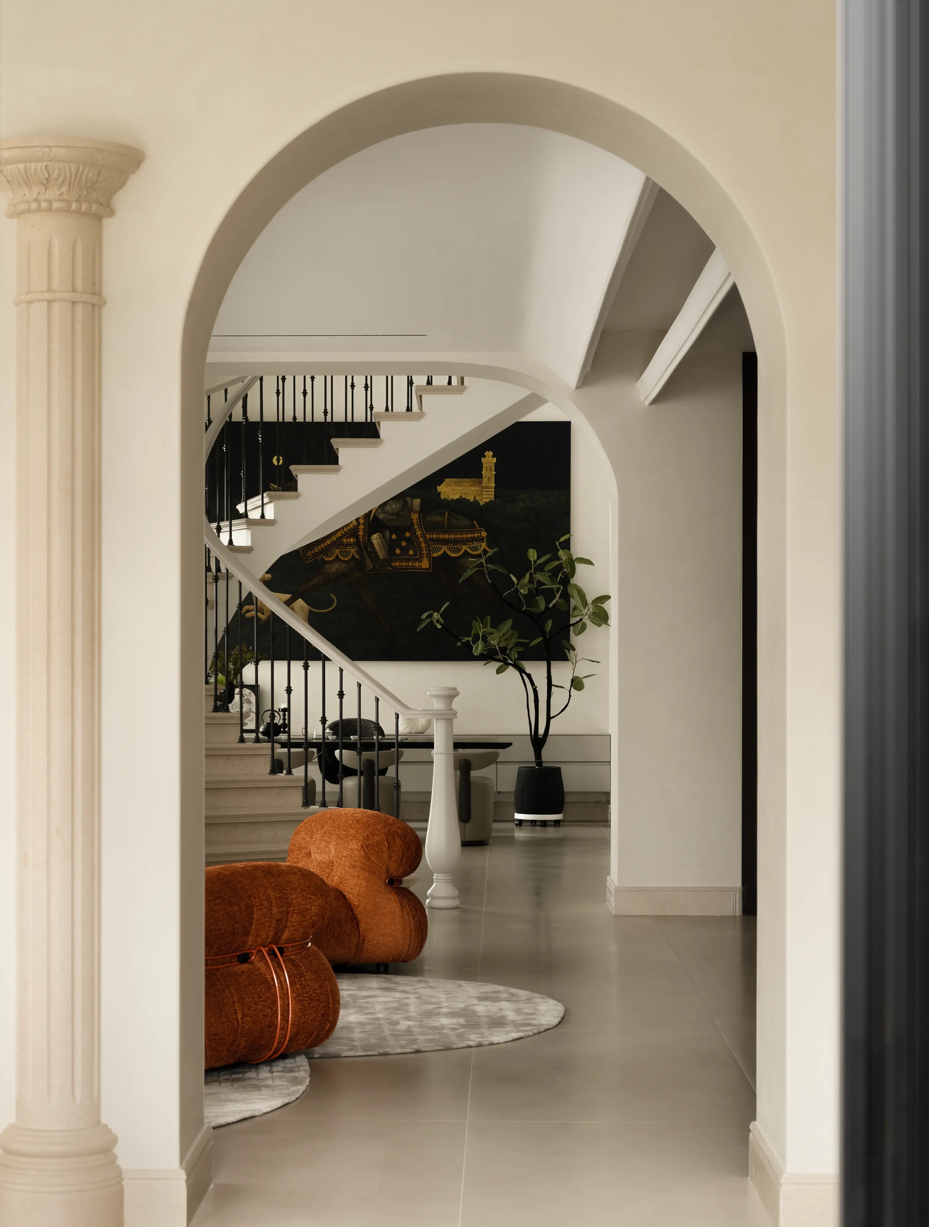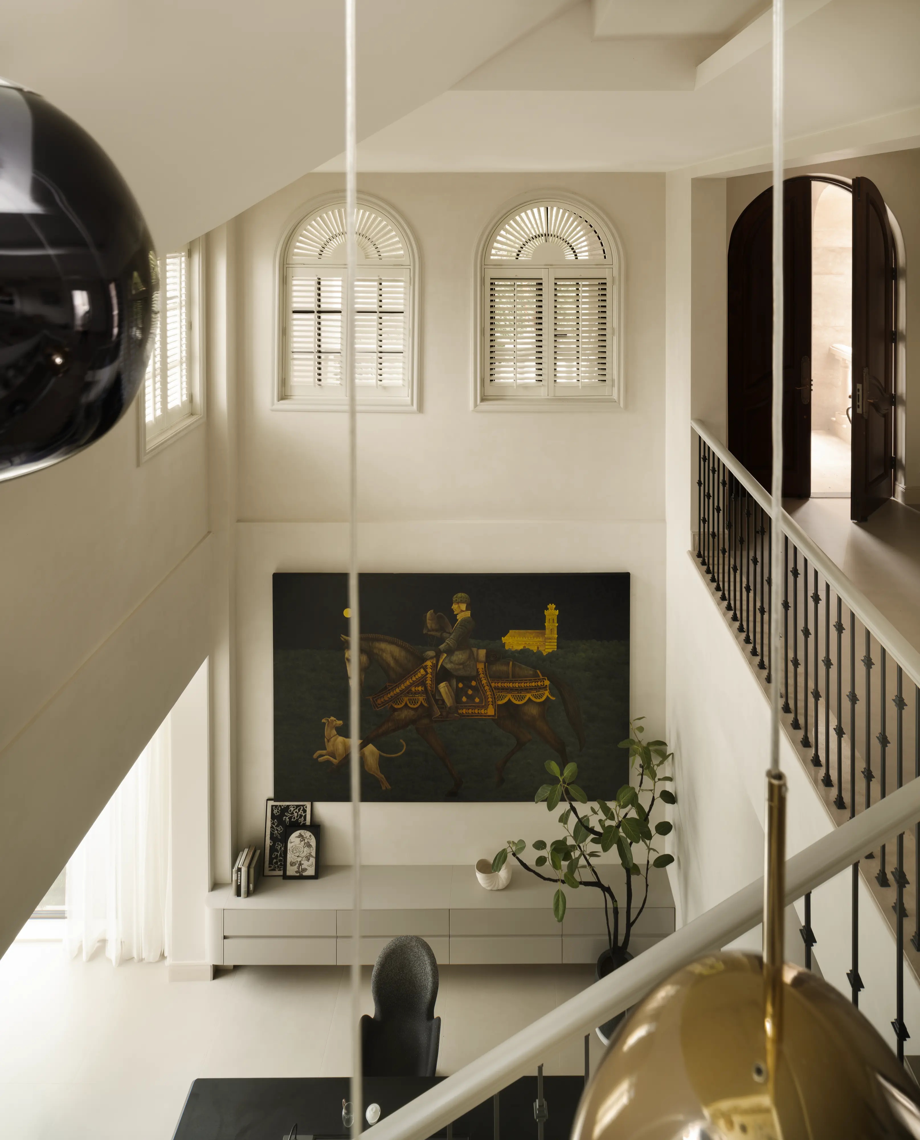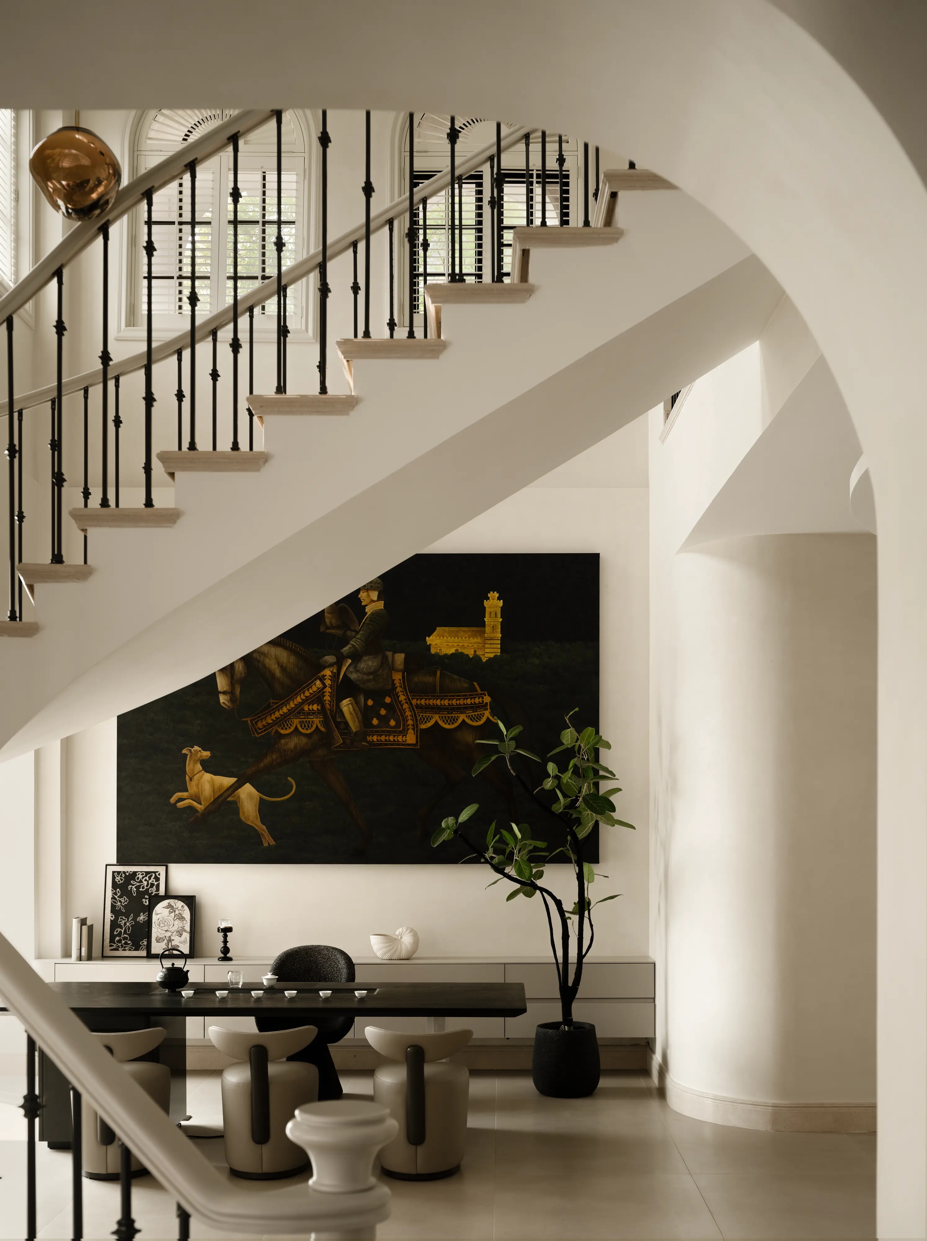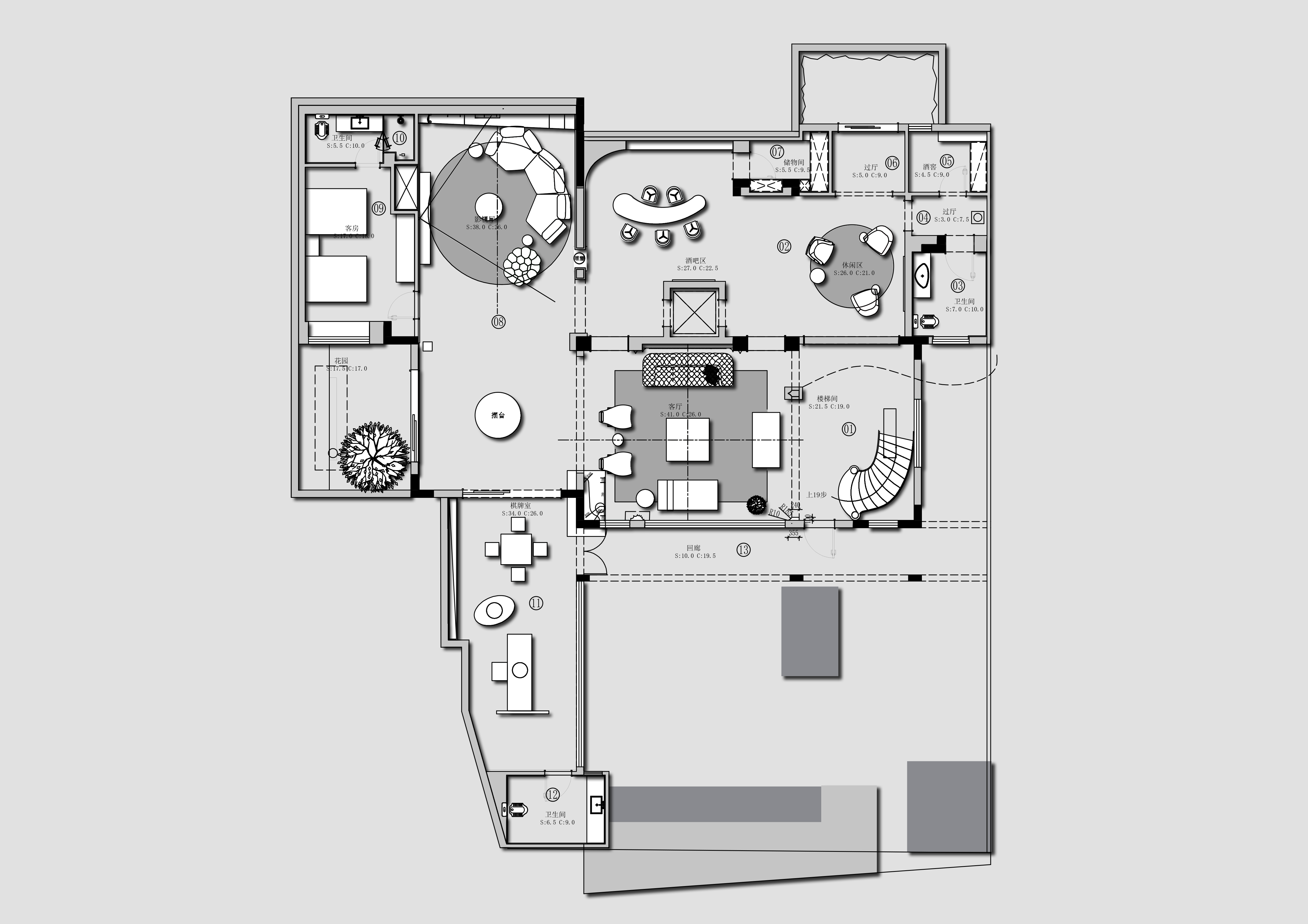 空间布局:轻盈的旋转楼梯盘旋向上,在家庭厅中转后直达二层卧室空间;不仅在视觉上给人以美的享受,更在功能上实现了空间的流畅过渡。