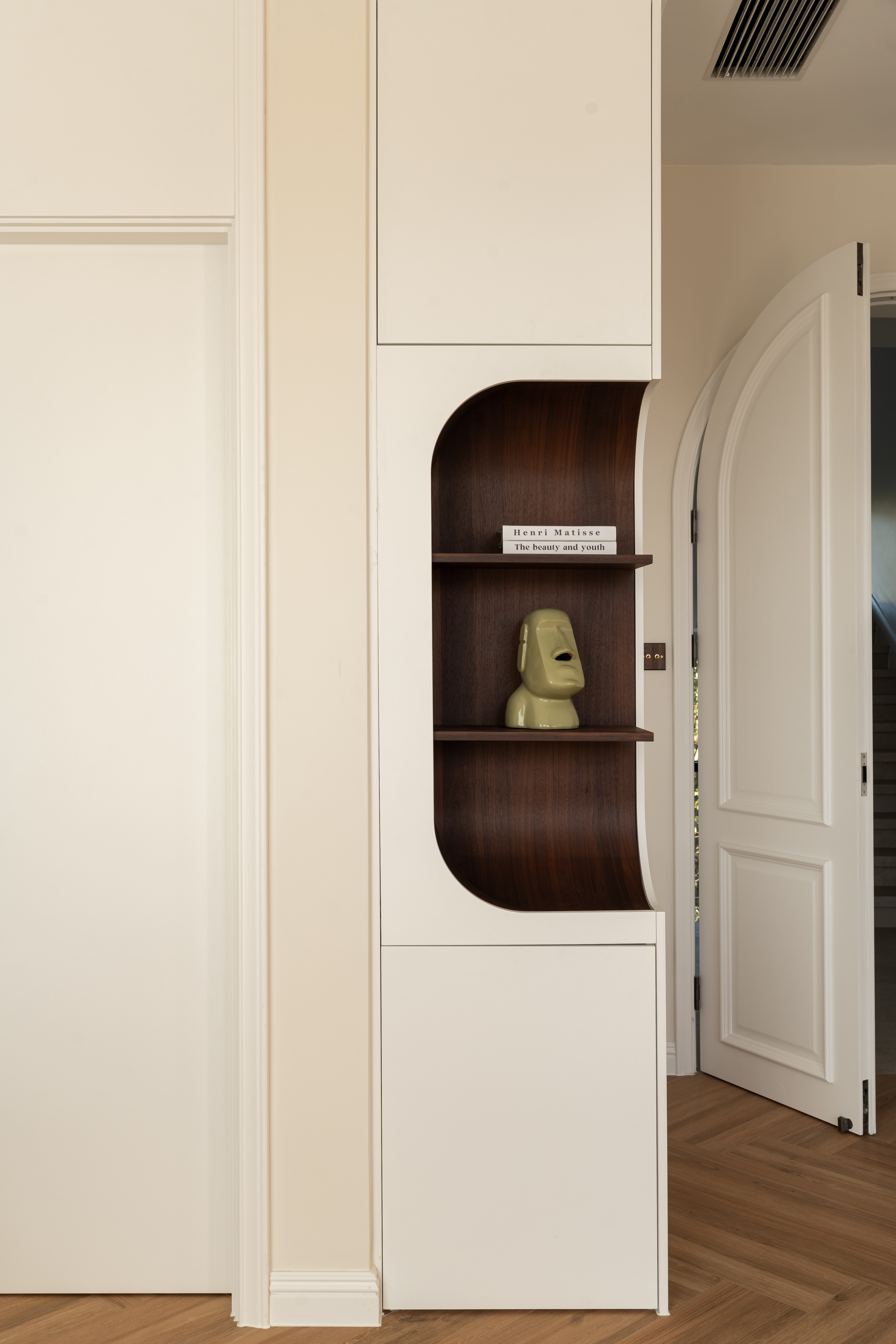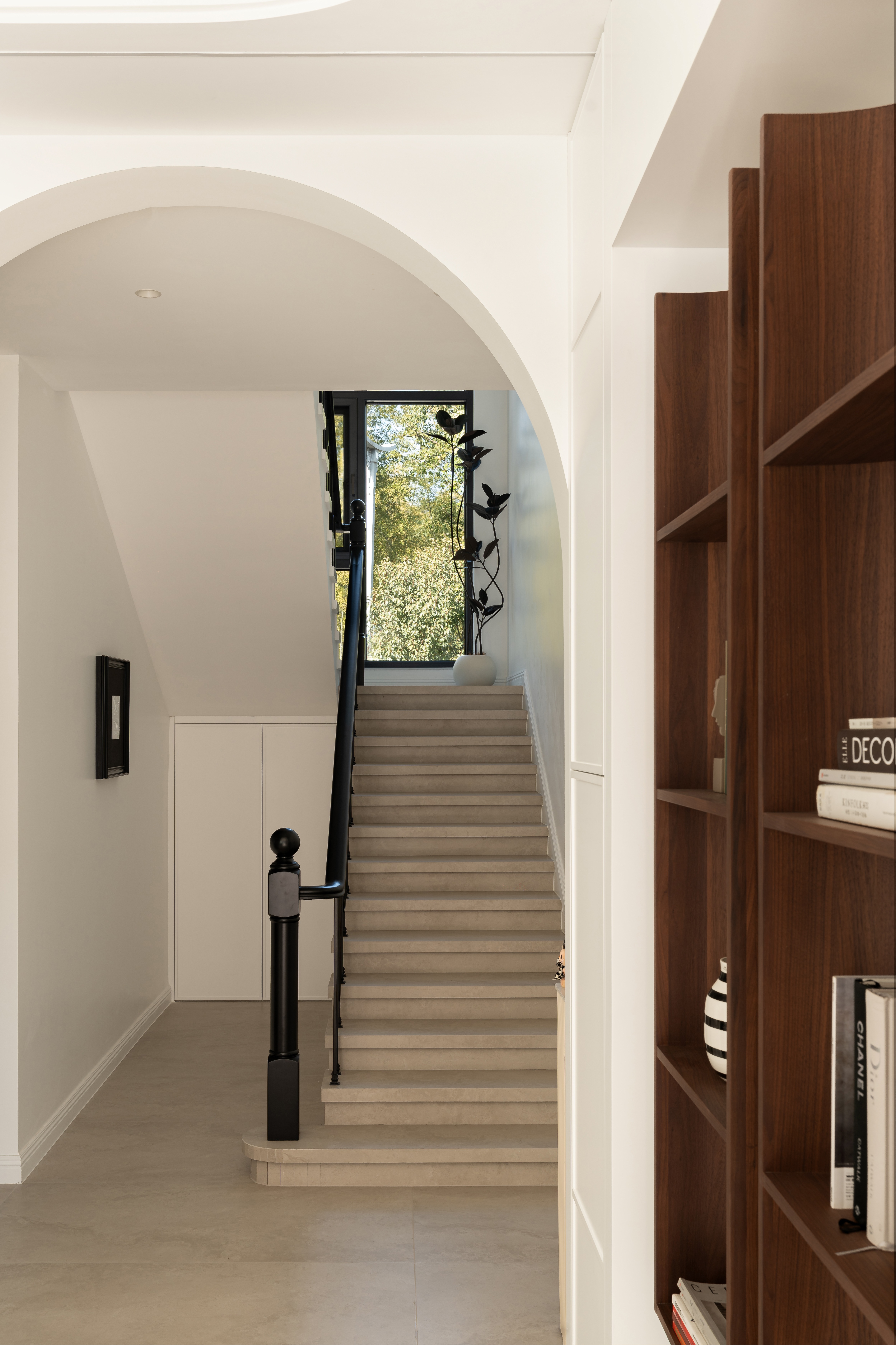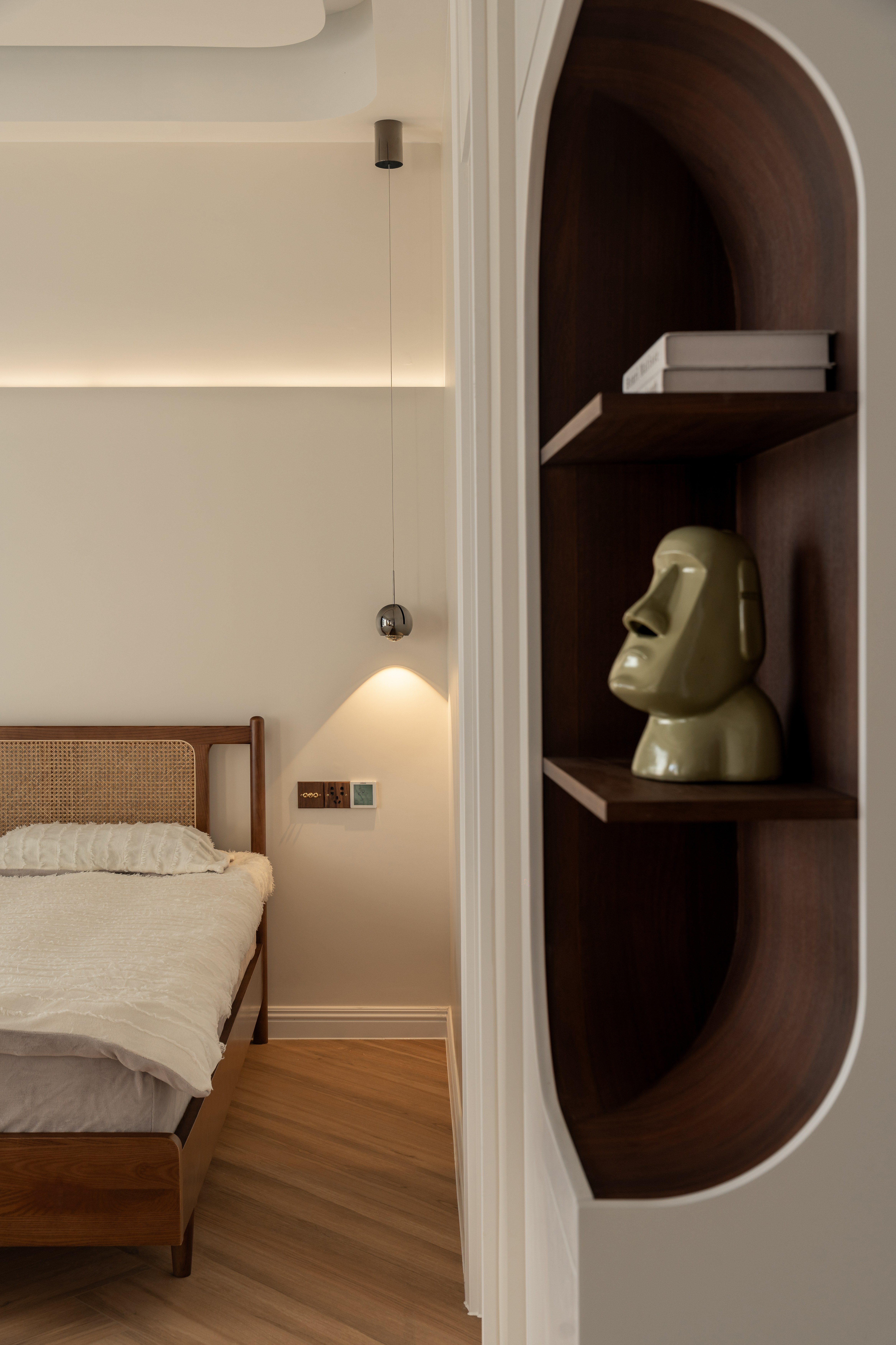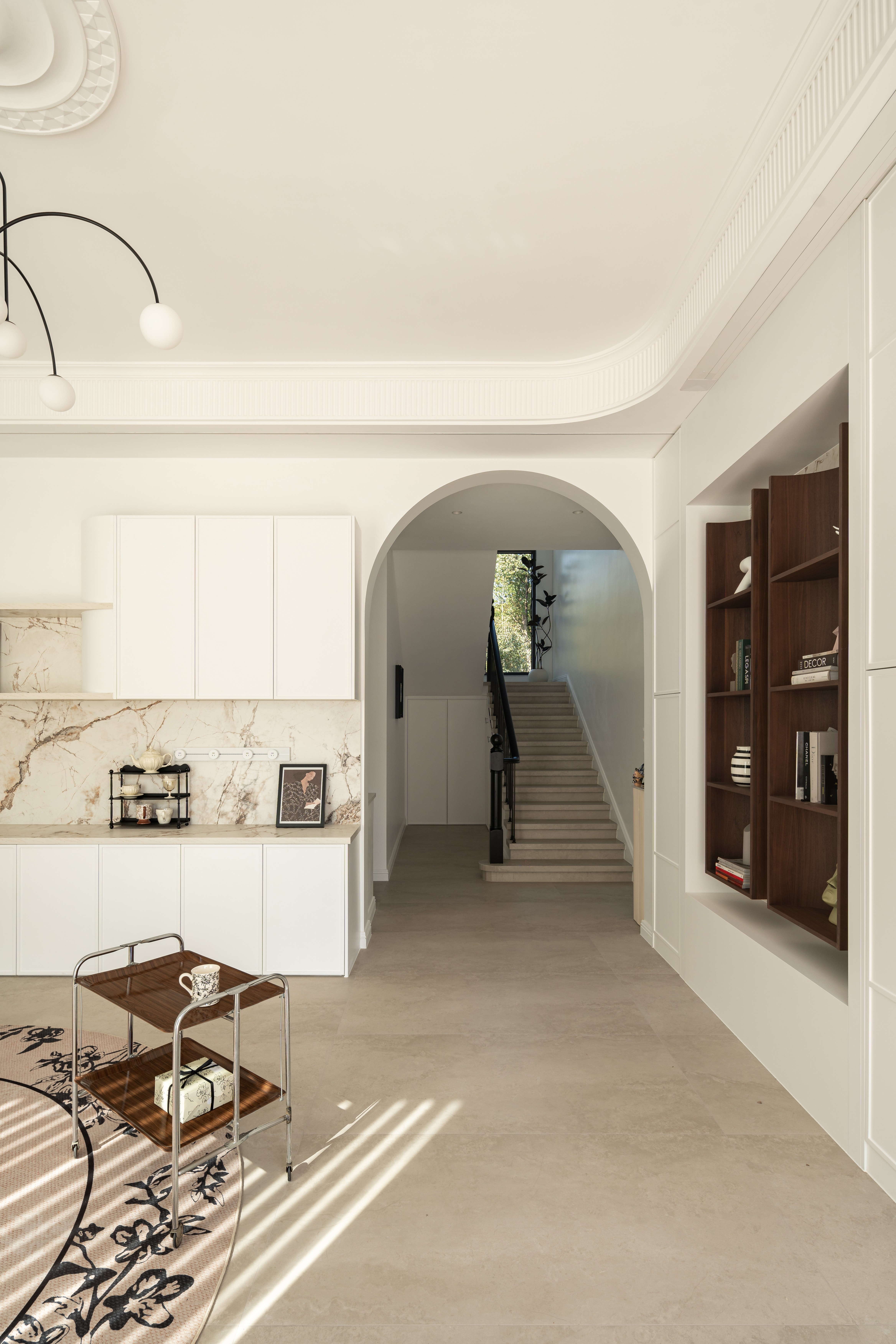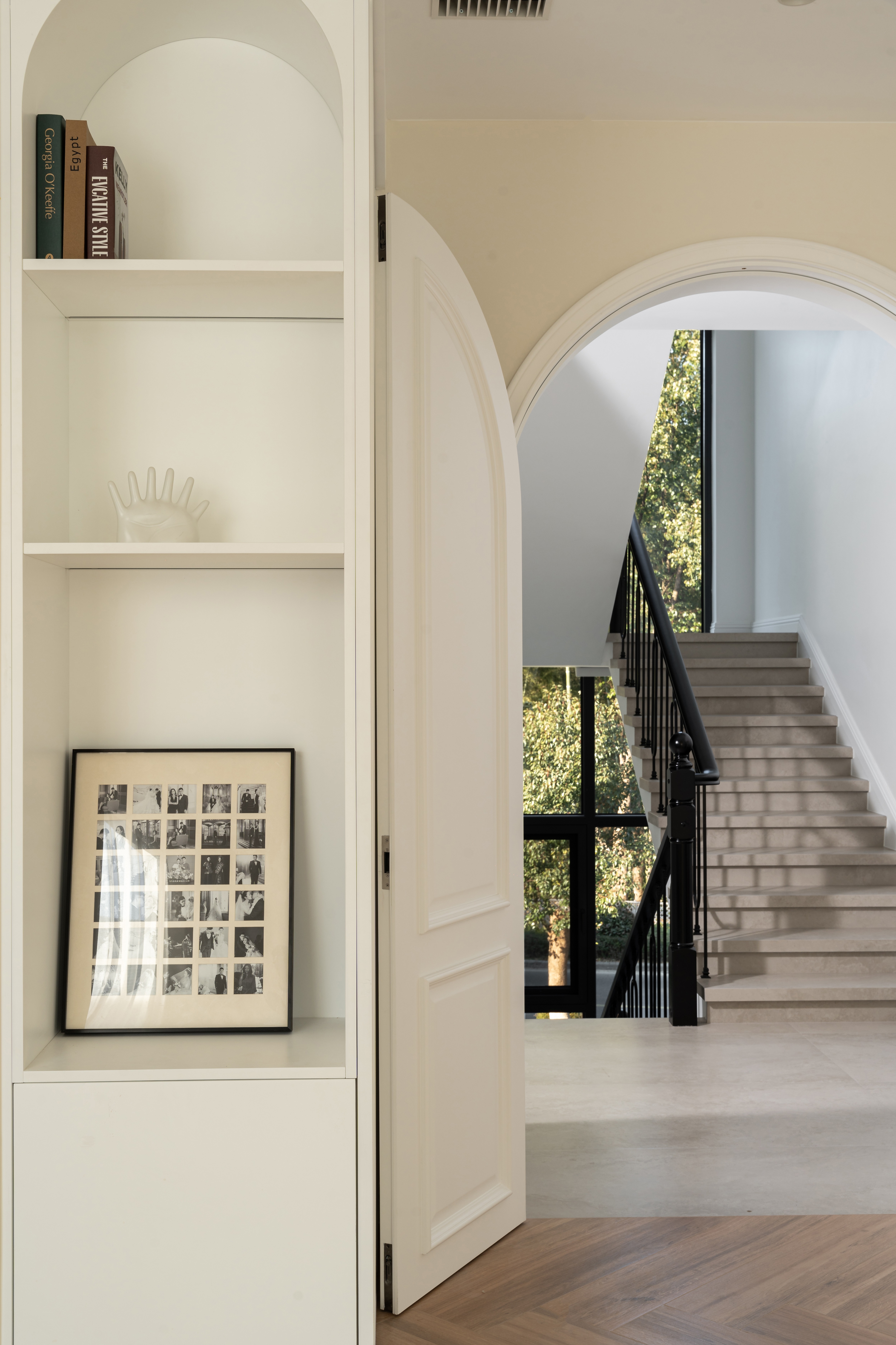 空间布局:楼梯巧设光影游戏,曲面柜体延展动线,兼顾美学与生活使用体验。