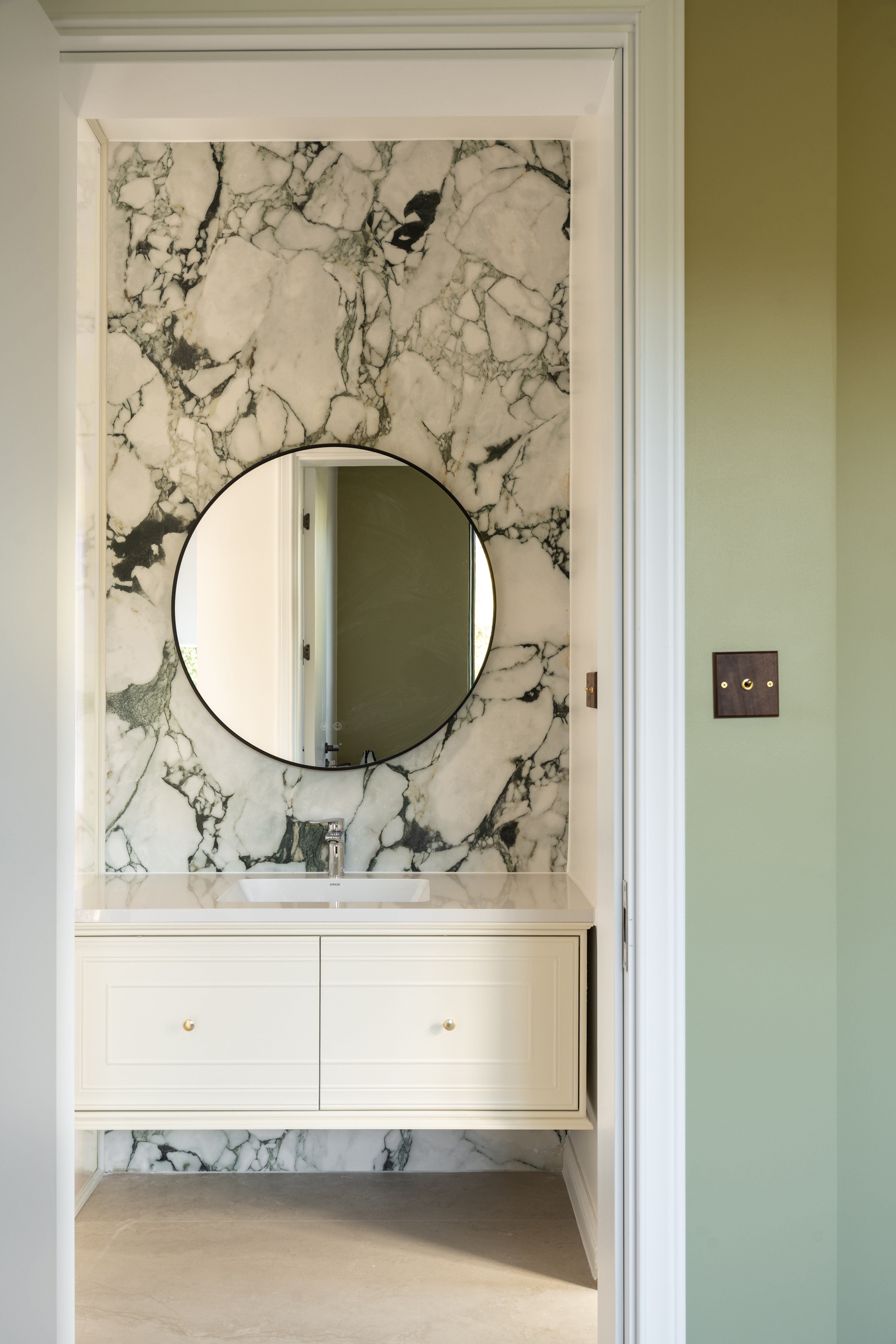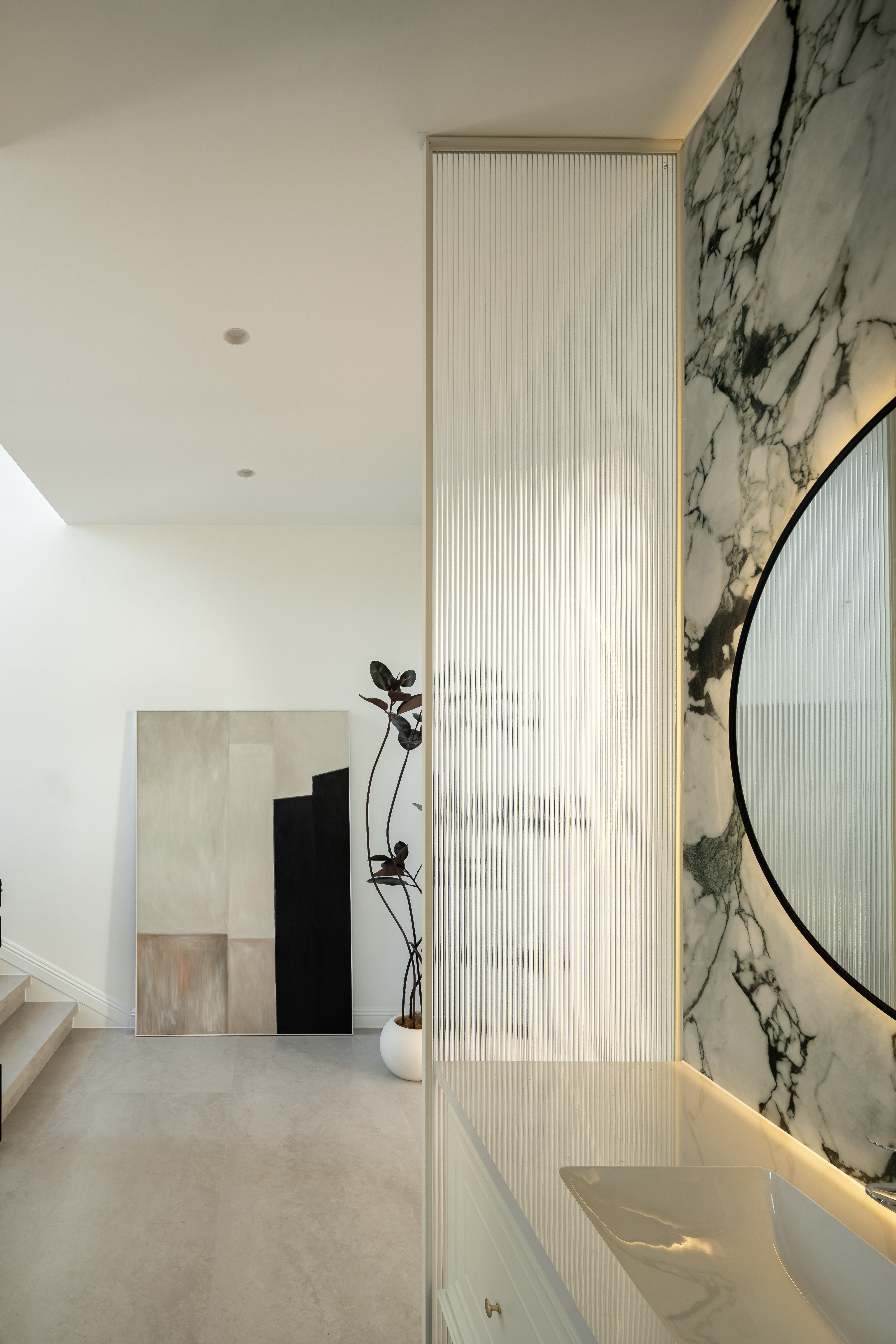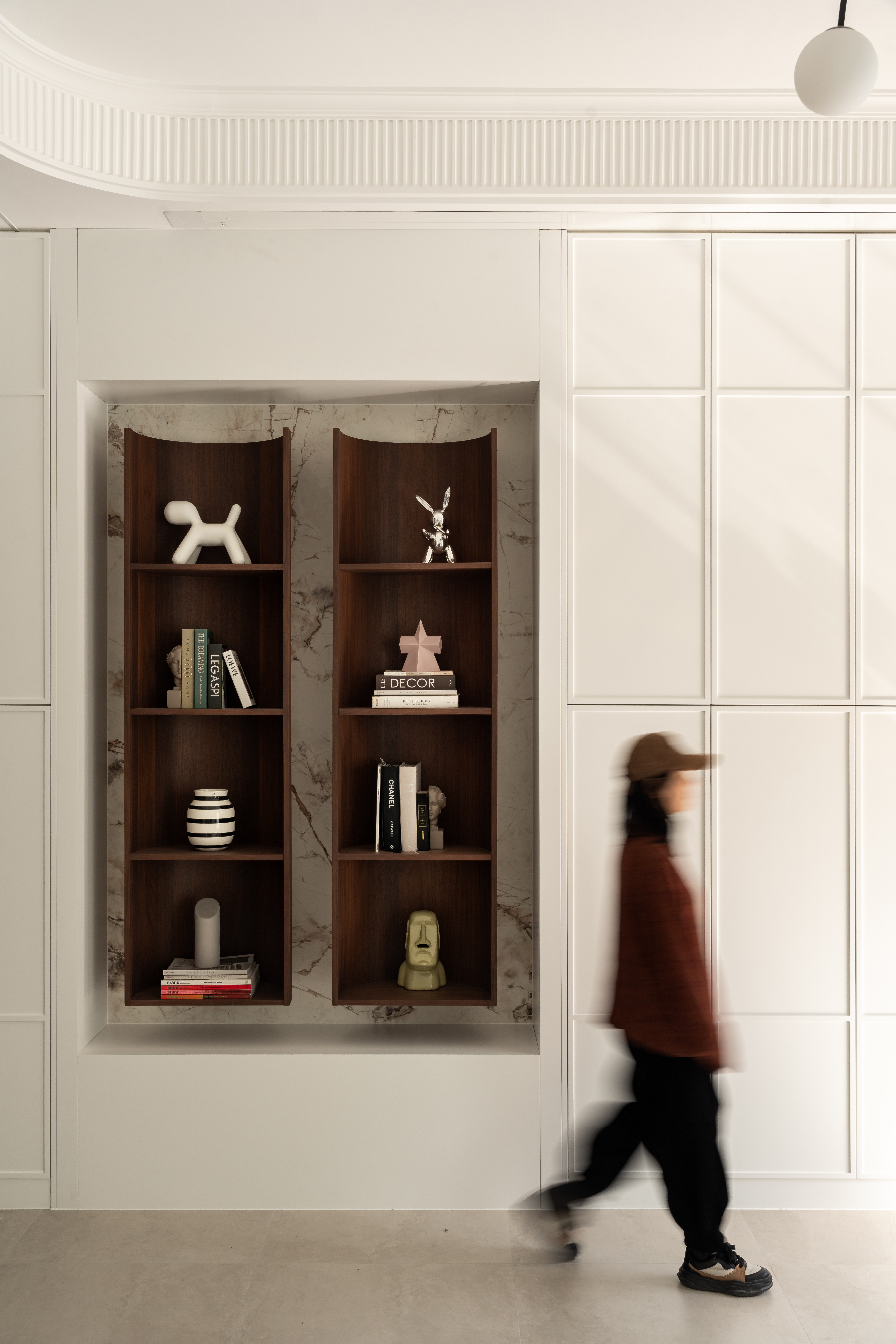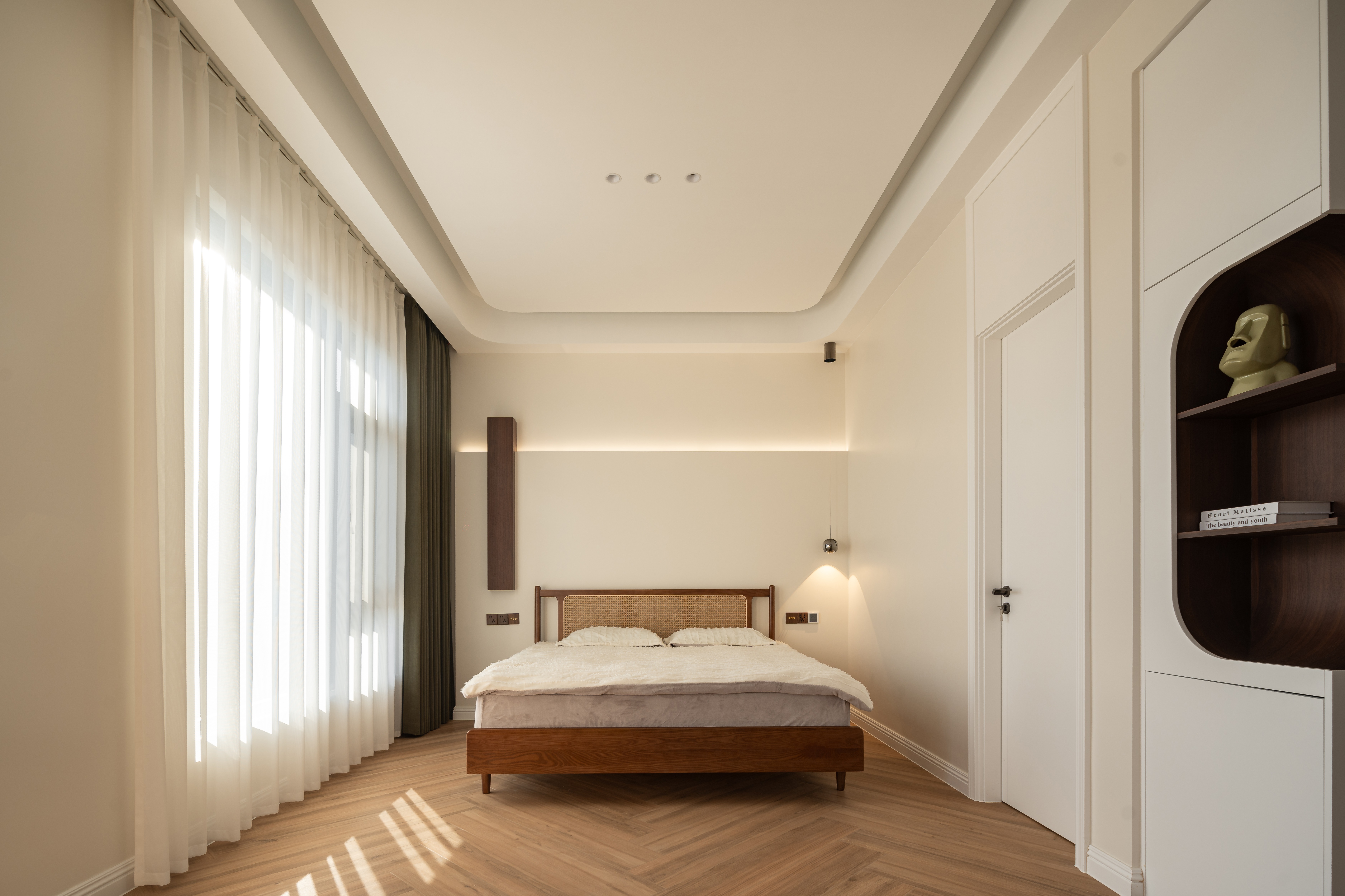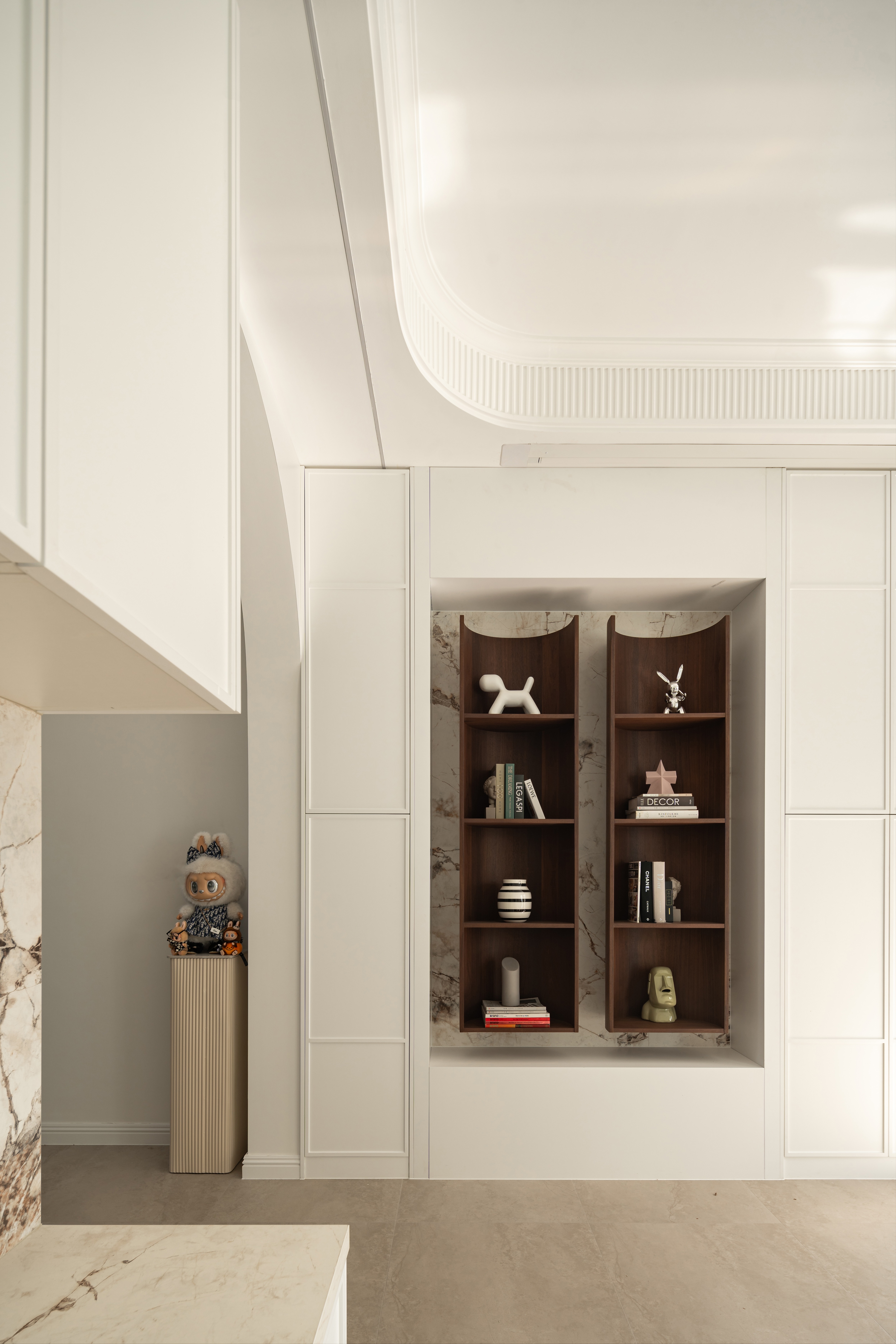 空间布局:楼梯巧设光影游戏,曲面柜体延展动线,兼顾美学与生活使用体验。